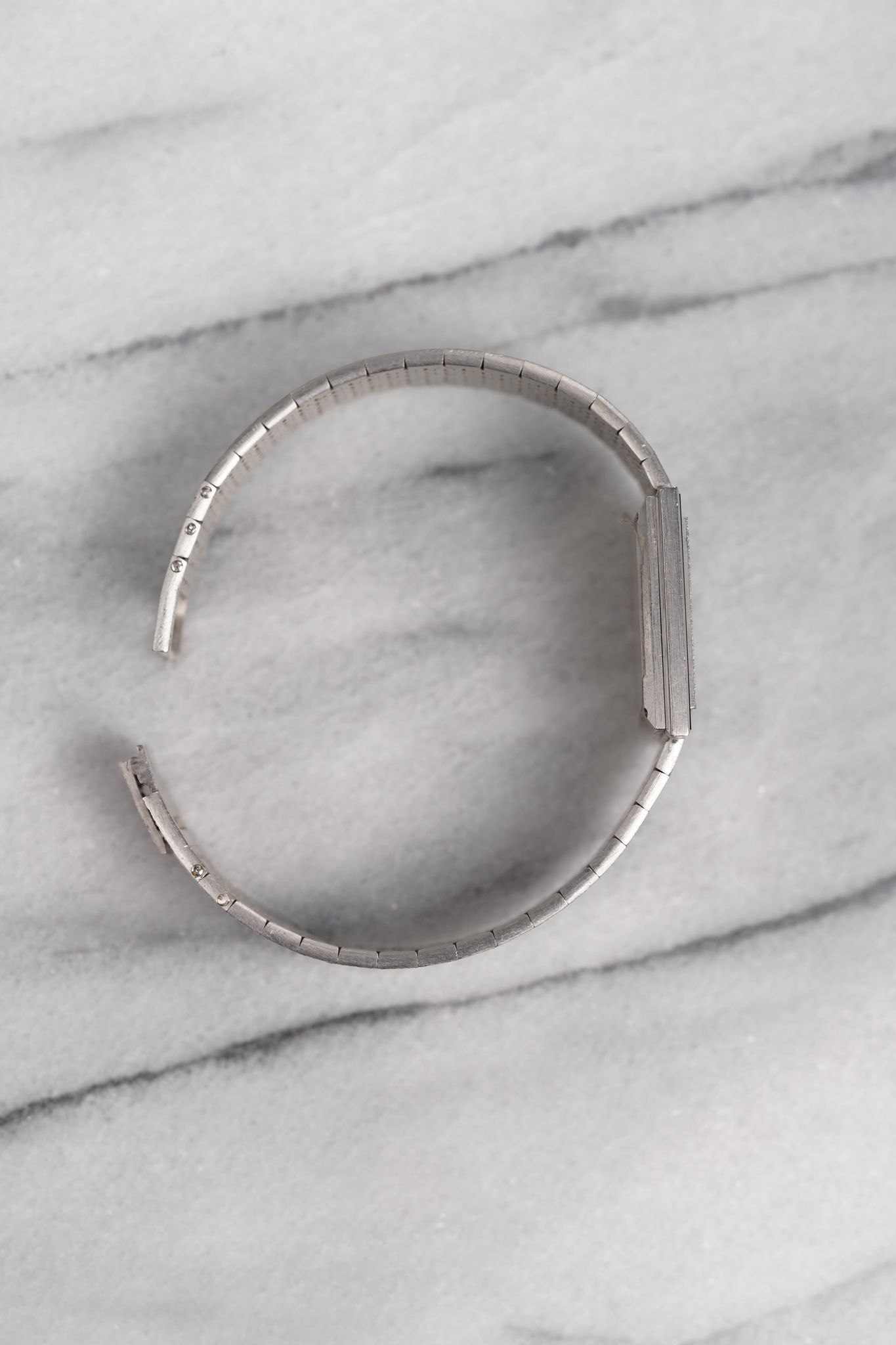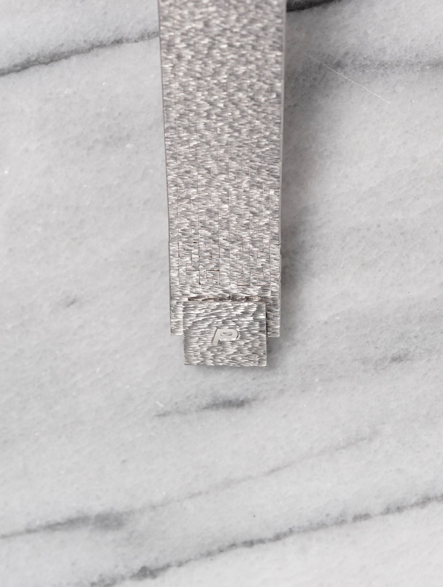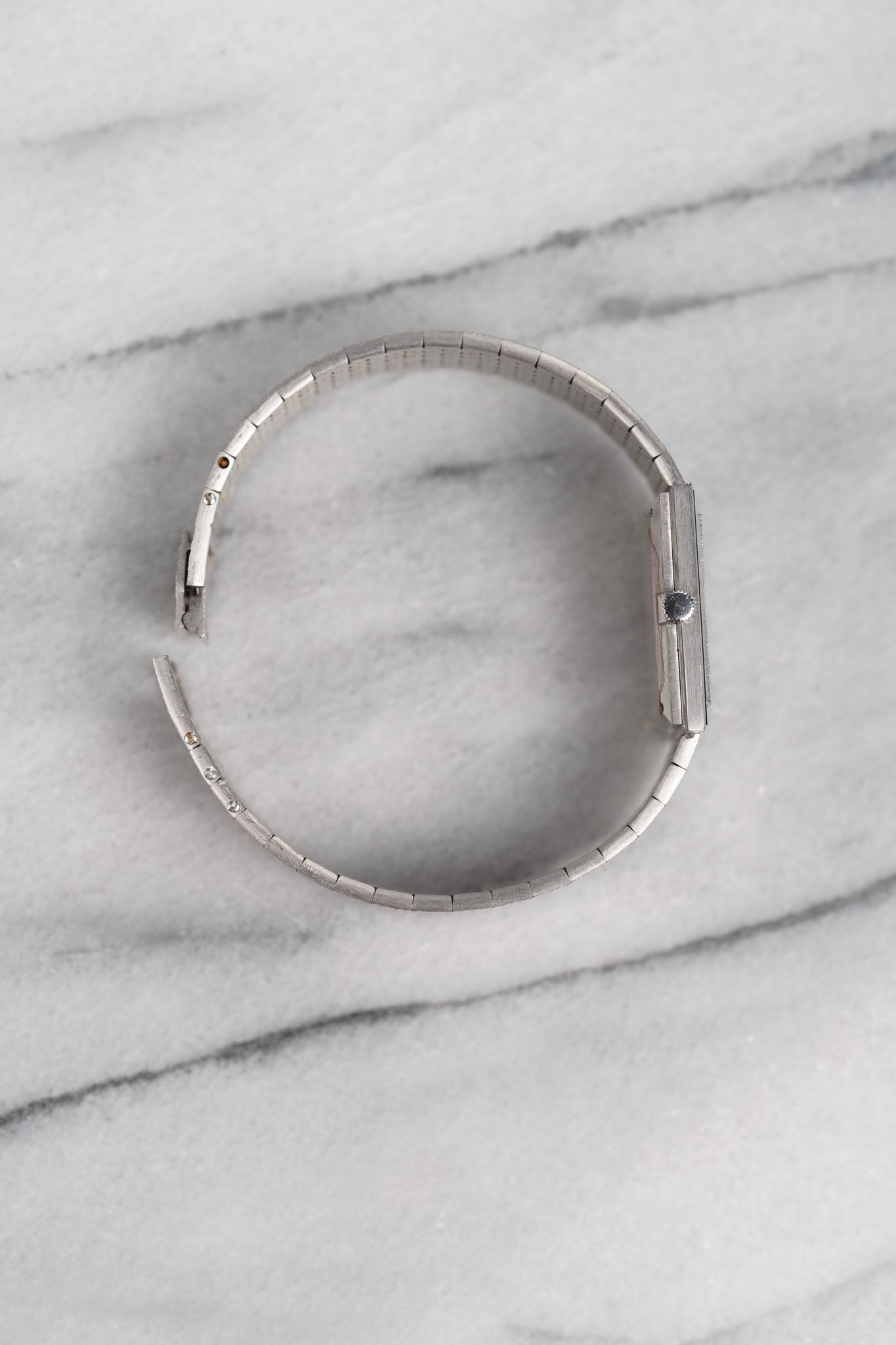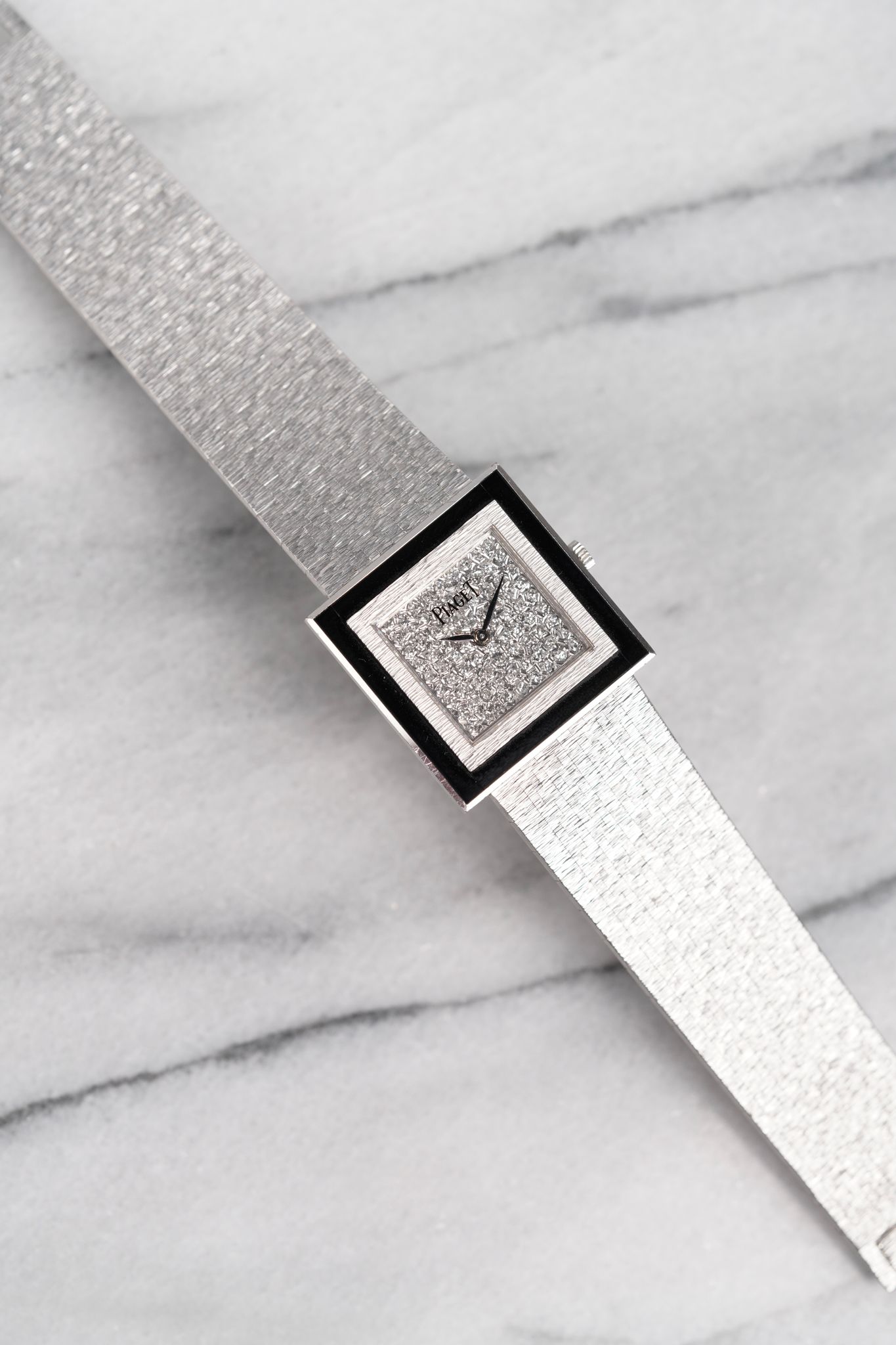 Here’s a Piaget reference 9200 manual wind in 18k white gold featuring a striking factory diamond pavé dial framed by an onyx bezel from the 1980s. Measurements include a 25mm and bracelet fits up to a 6.5 inch wrist. Classic Piaget elegance with a slim profile and signature dress watch appeal. Fitted on its original 18k white gold bracelet. Bark finishing on both the bezel and bracelet. Original case, dial, and movement. Fully functional and keeping time.