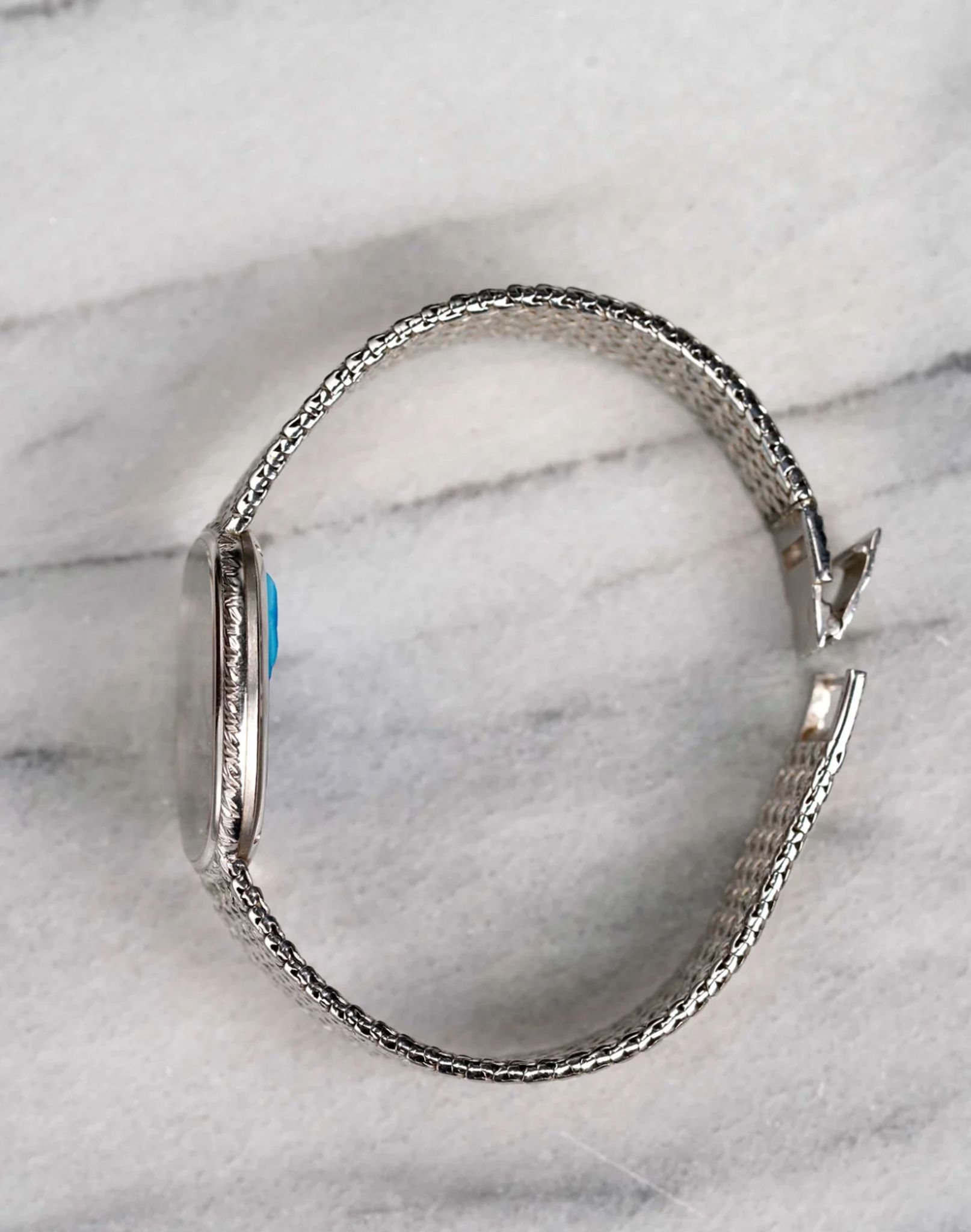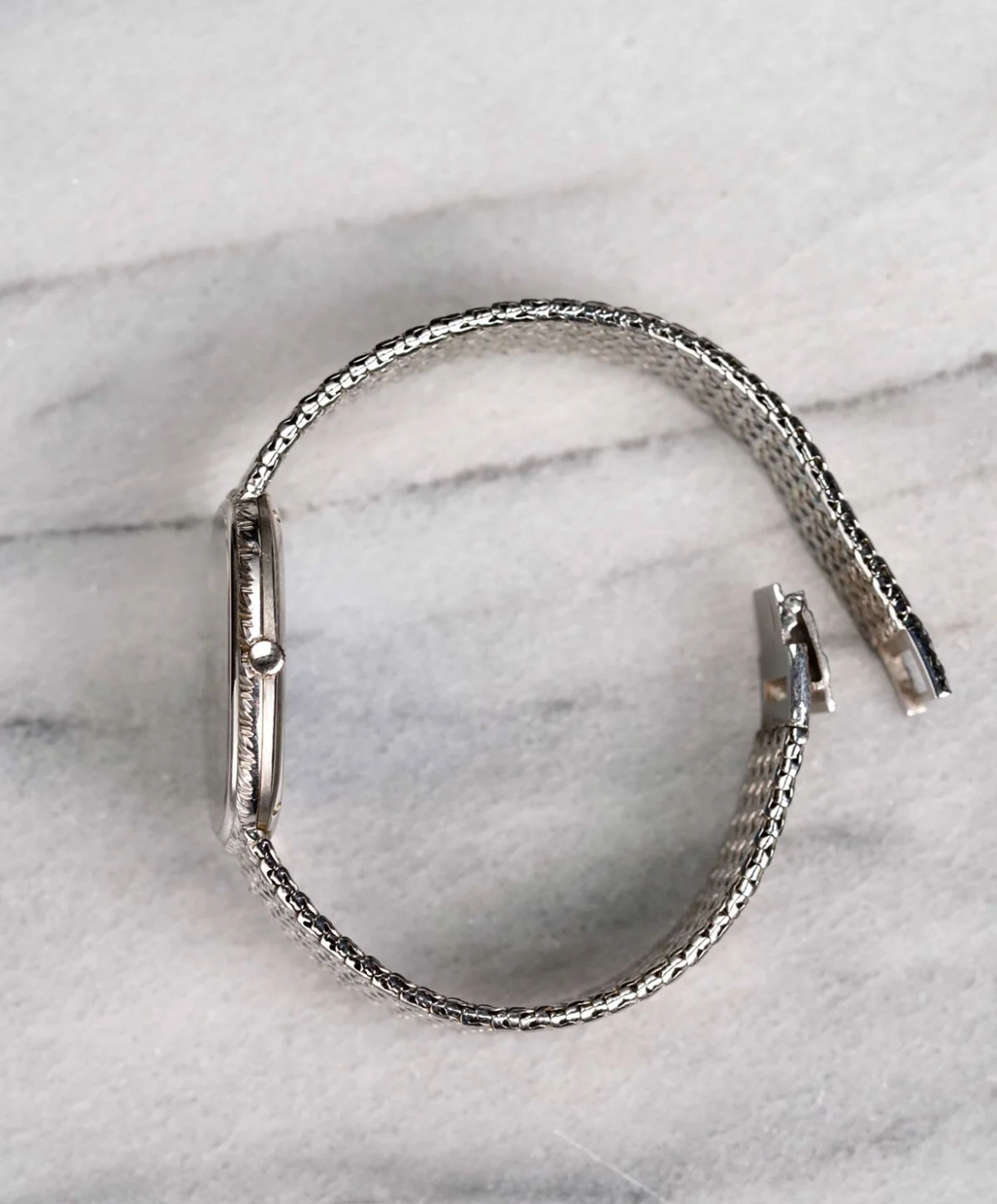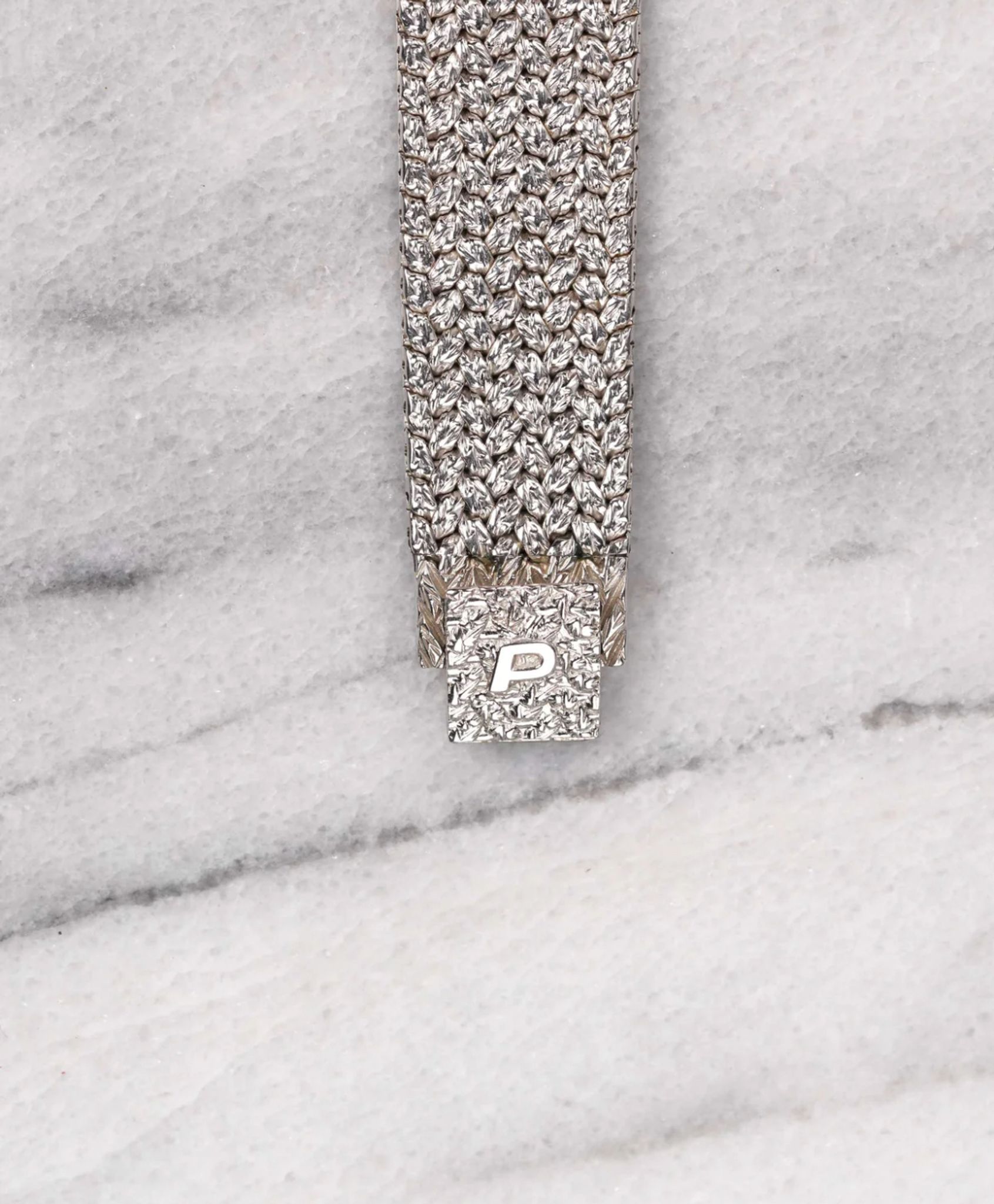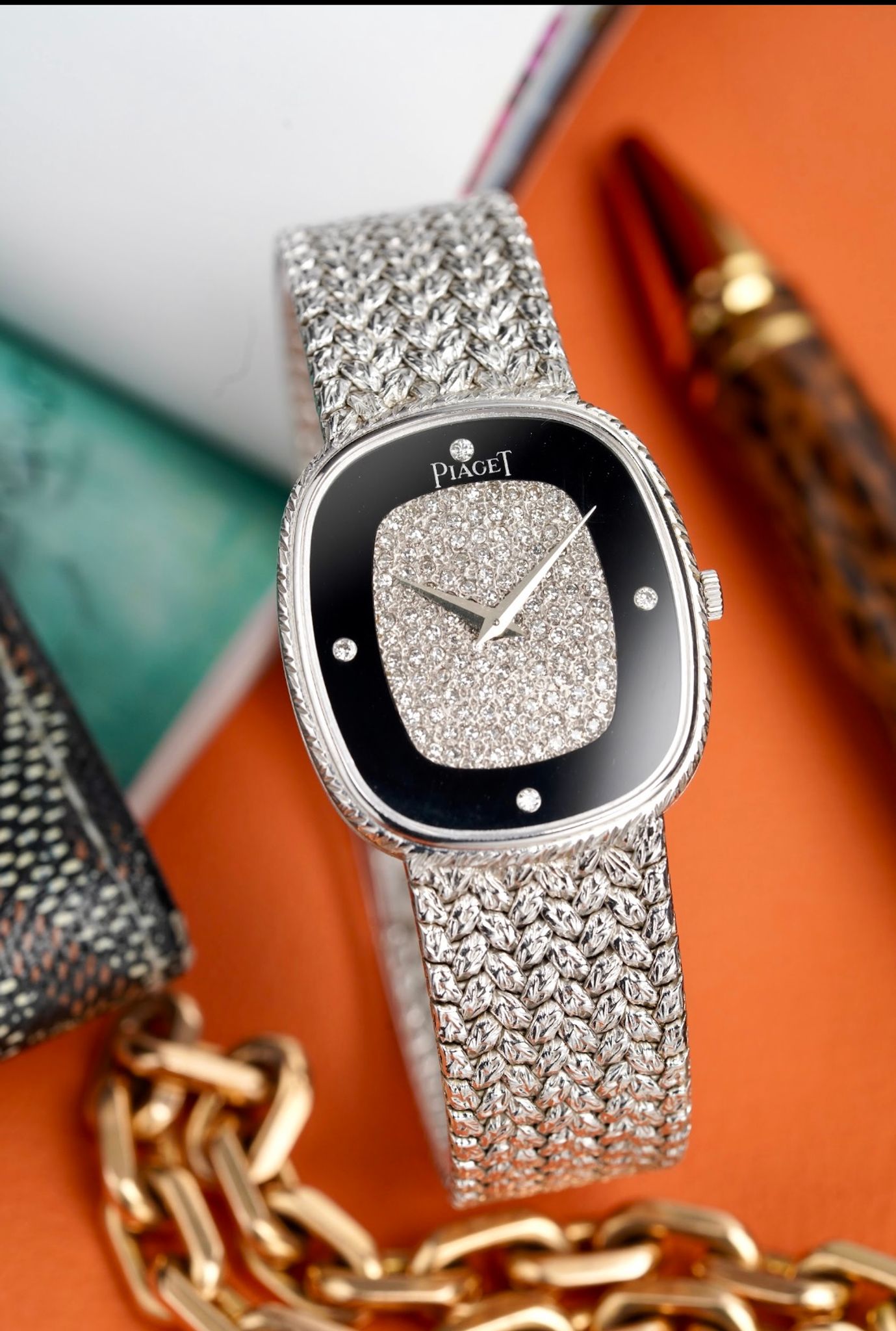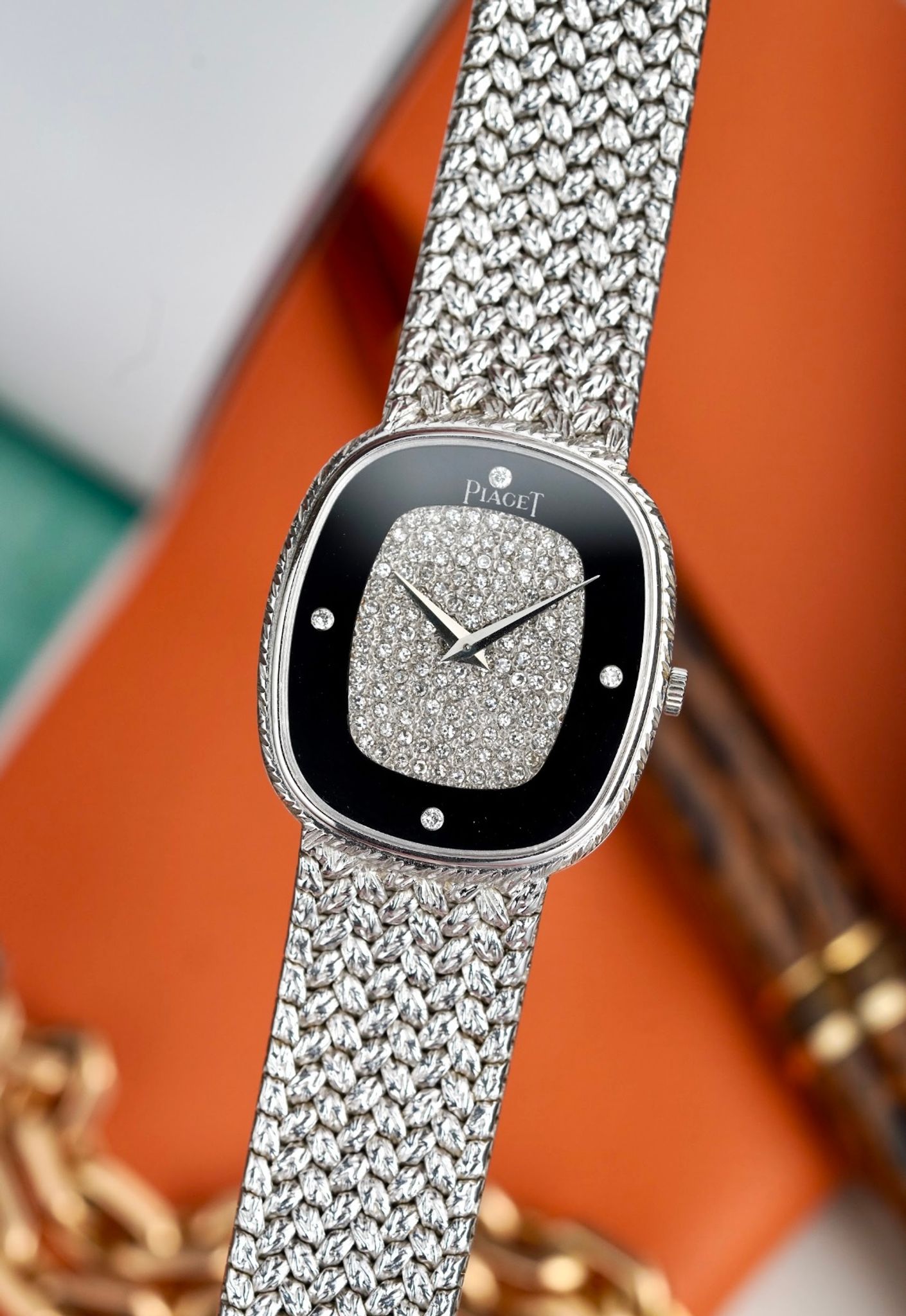 Here's a vintage Piaget reference 9443 with a factory onyx diamond pave dial manual wind in 18K white gold from the 1980s. Keeps great time and is fully functional. Factory diamond pave dial in the middle with the outer track being an onyx stone with diamond markers. Measurements include a 28mm case size across and an integrated bracelet that fits up to a 7 inch wrist (signed clasp) Matching braided texture in both the bezel and bracelet. Silver dauphine hands. White gold case and bracelet. The piece is unisex, it can be worn by both men and women. Screw back caseback. The dial has a unique configuration with the onyx stone and diamond setting. All parts are original including the dial, case, and movement. the dial and case are in great cosmetic, untouched condition