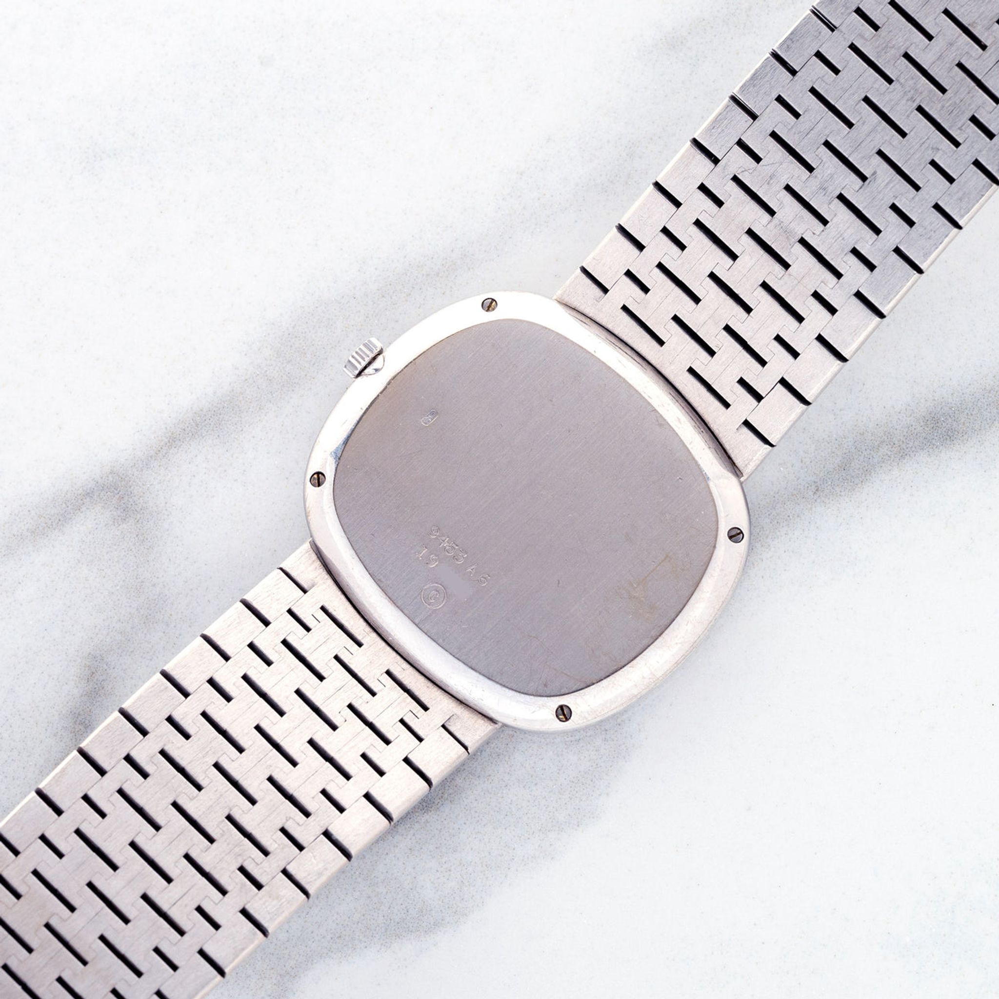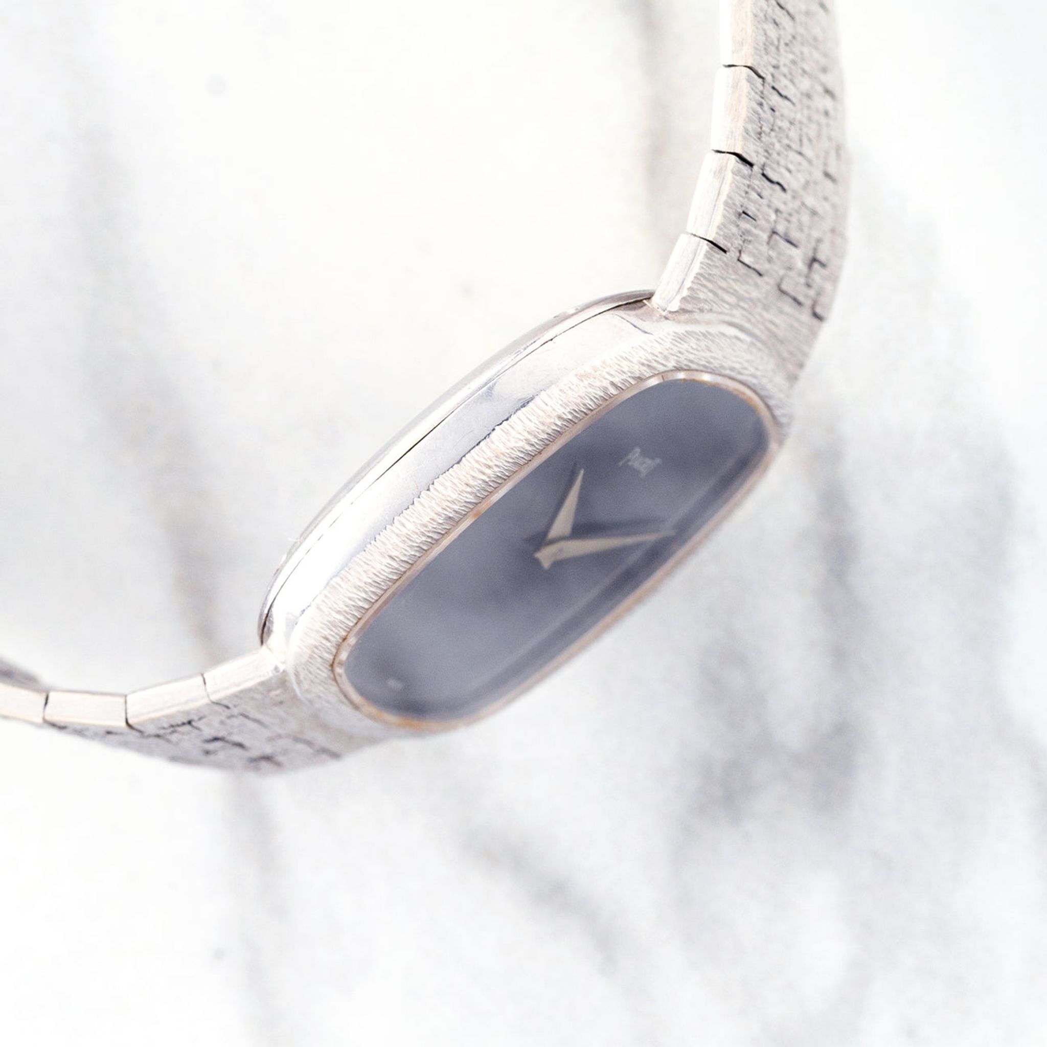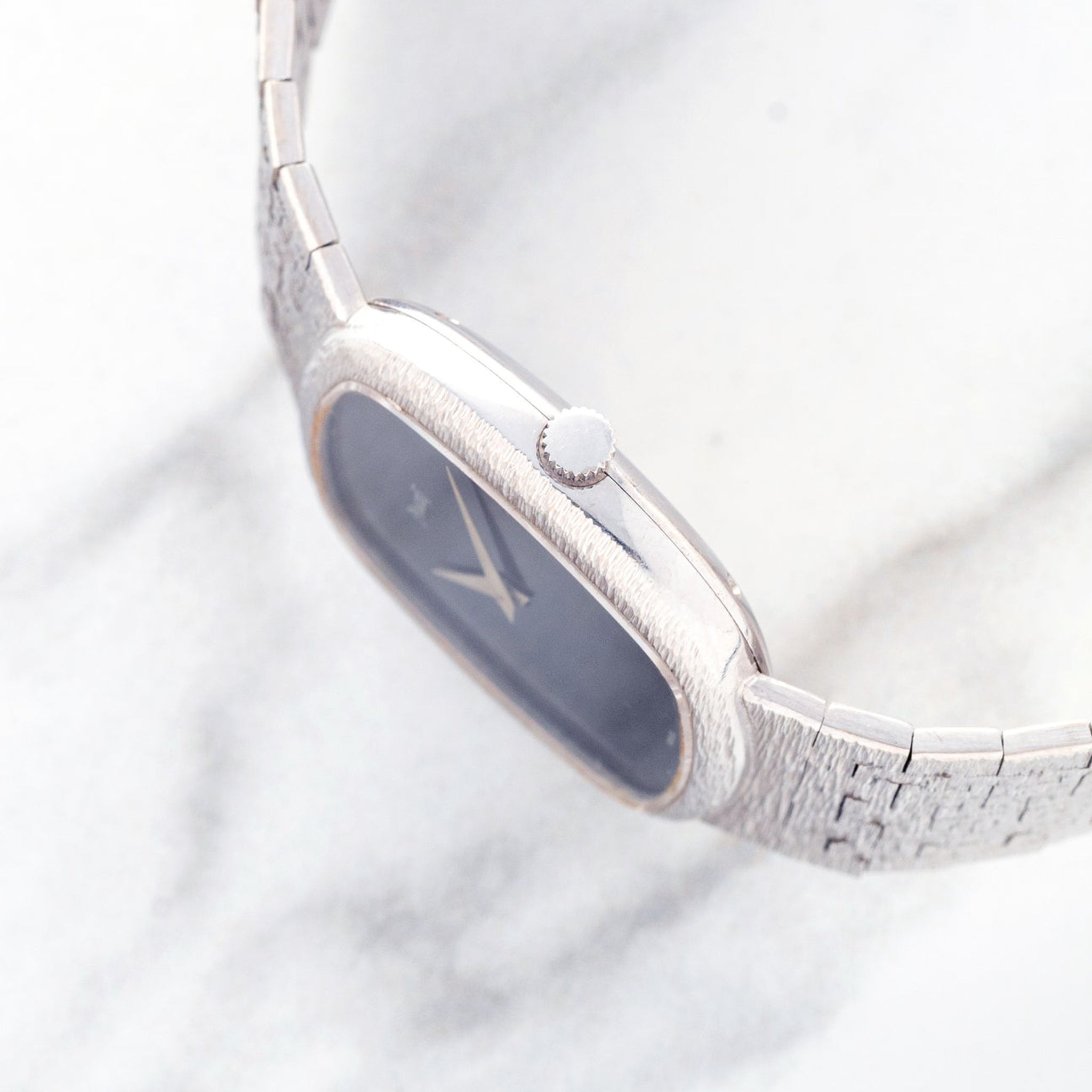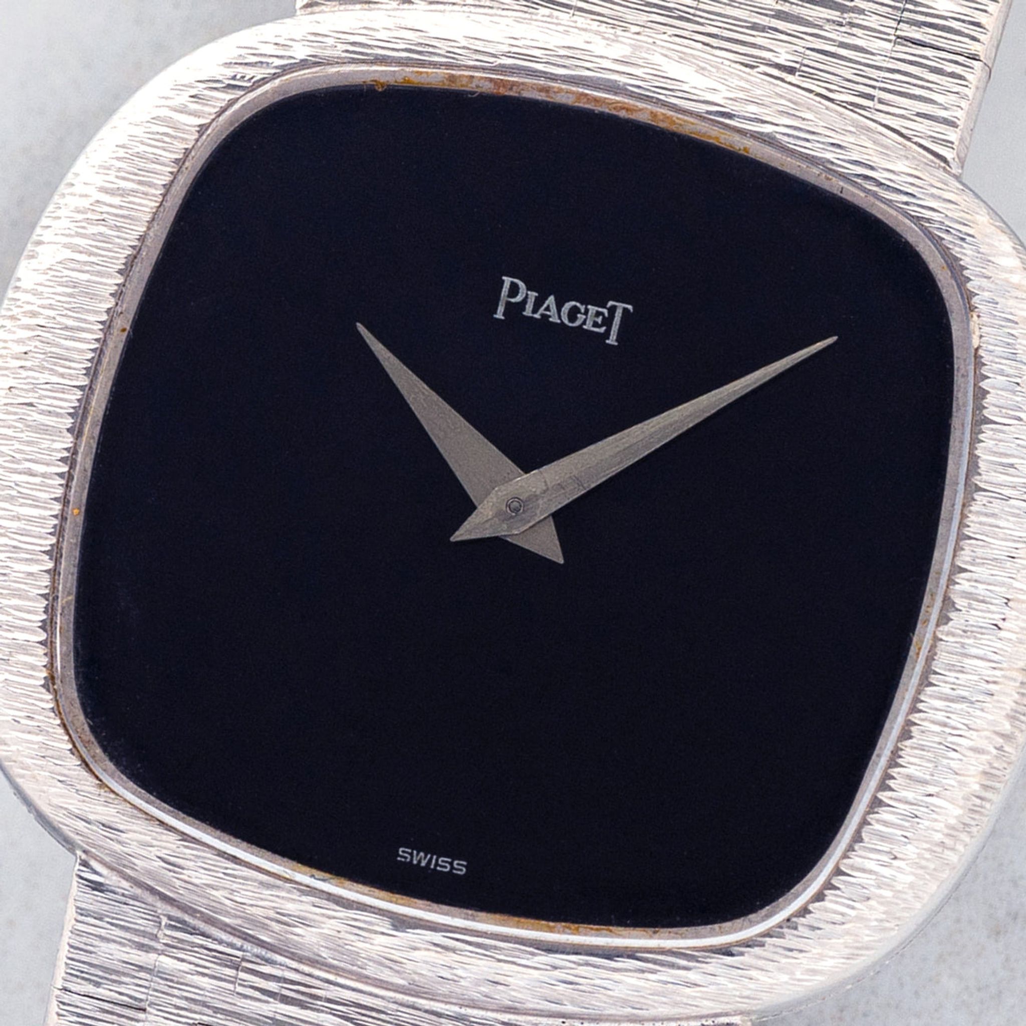 Here we have a gorgeous 18k white gold Piaget reference 9453 with circa 1980s. The case and bracelet have a "hammered" artisanal finish giving it a monochromatic appearance. The factory black onyx dial contrasts well against the case and has some light spotting but is devoid of any chips or cracks. At 33mm, we believe this piece is equally well suited for anyone, male or female. The case and bracelet are also in fantastic and untouched condition with only light signs of wear. This piece has just been overhauled and is ready for years of enjoyment to come.