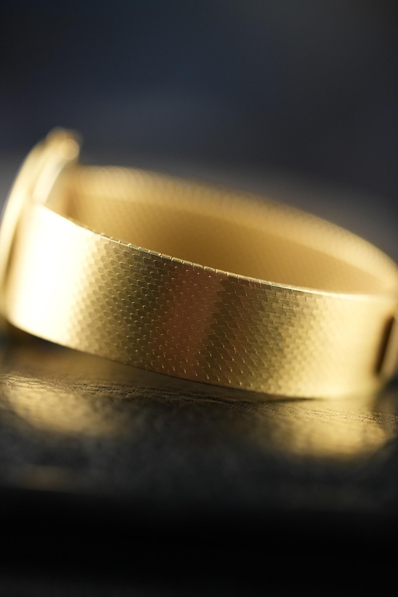 This midsize Piaget is a quintessential reflection of that time, when men wore their watches not as mere accessories, but as subtle statements of taste. Crafted entirely from solid 18K yellow gold weighing 72.5 grams, its handwoven bracelet mimics intricate fish scales while the ultra-slim case merges into it for an integrated look. With a profile so thin, it houses the revered 9P1 manual movement, a technical marvel of its time.