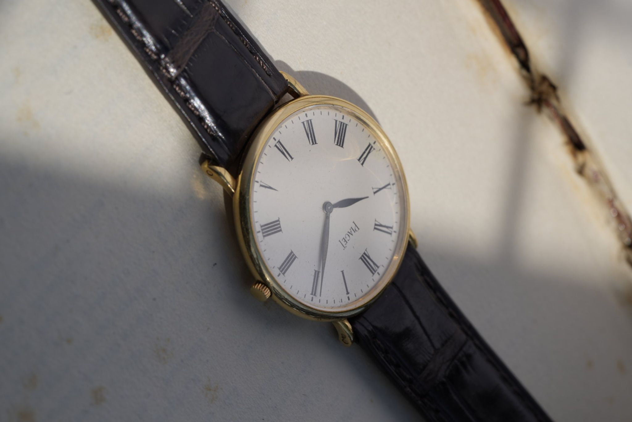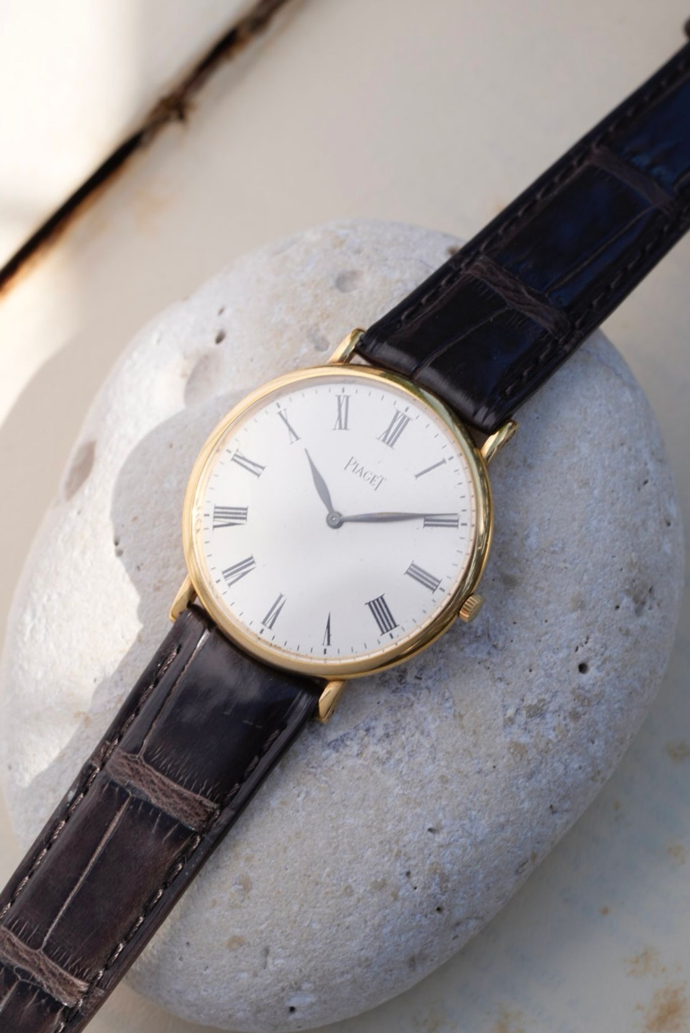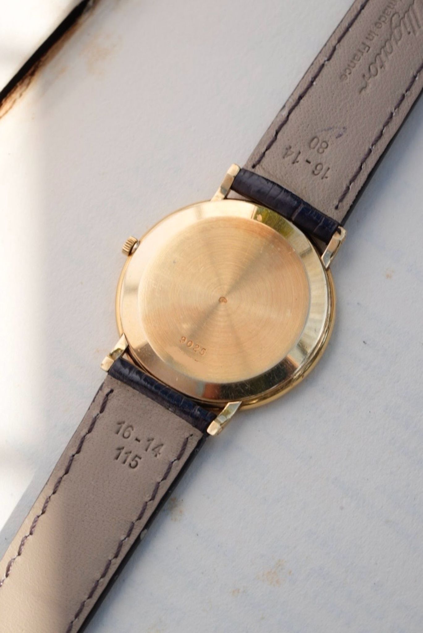 Piaget Altiplano reference 902‑5 from the early 1960s, featuring a 31 mm 18k yellow gold case, a silver sunburst dial with Roman numerals, and dauphine hands. It is powered by the ultra-thin hand‑wound Piaget Calibre 9P (2 mm). The watch retains its original Piaget buckle.