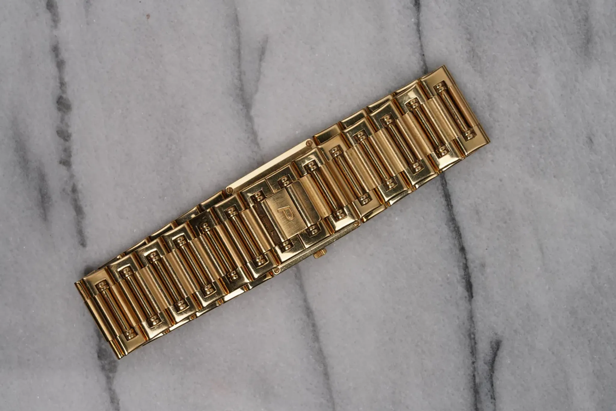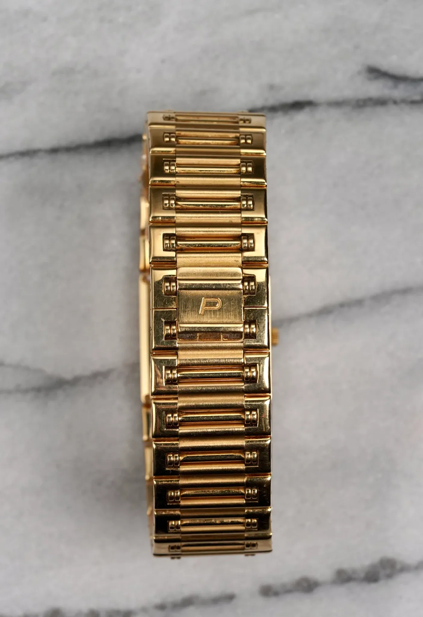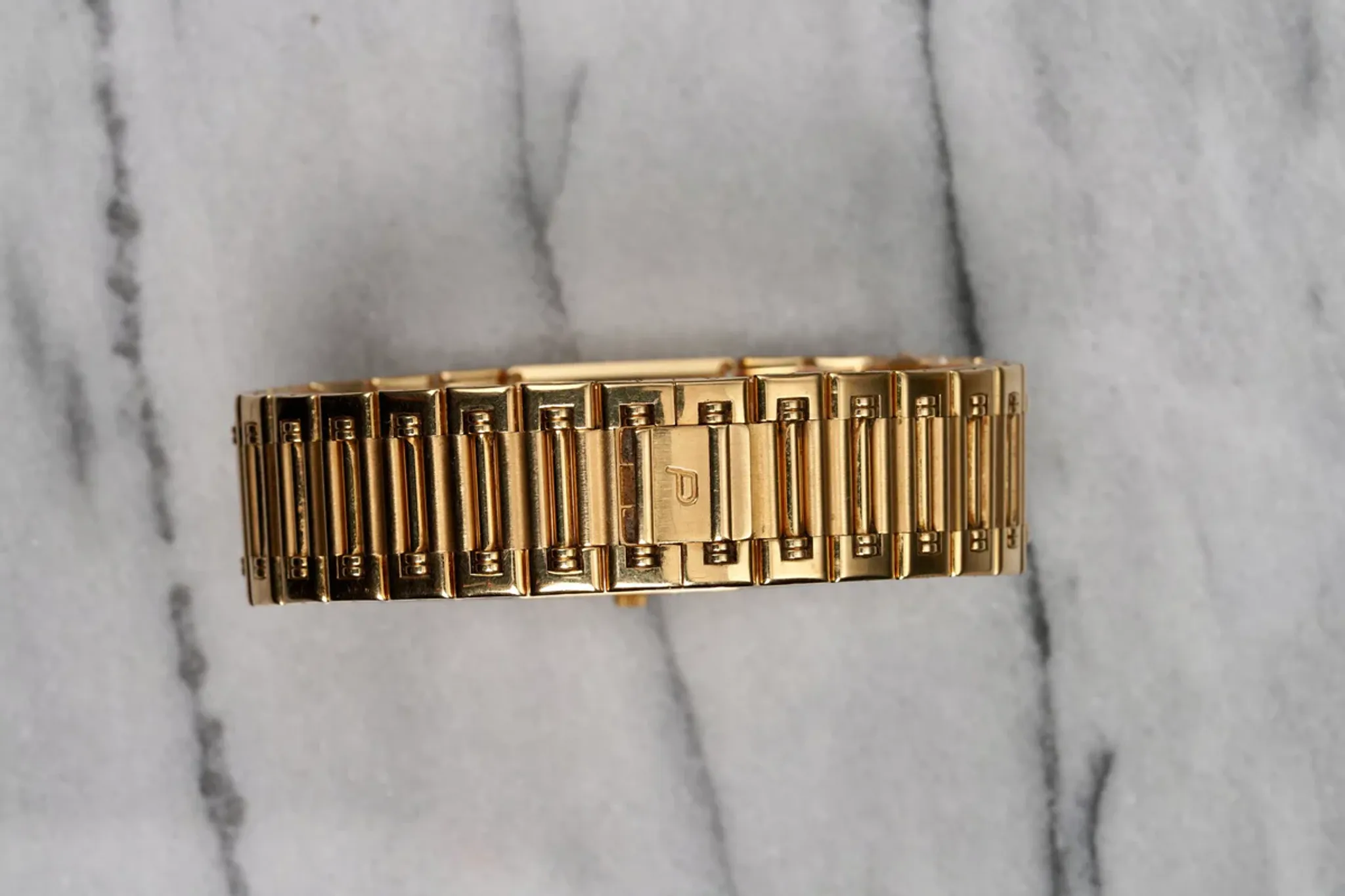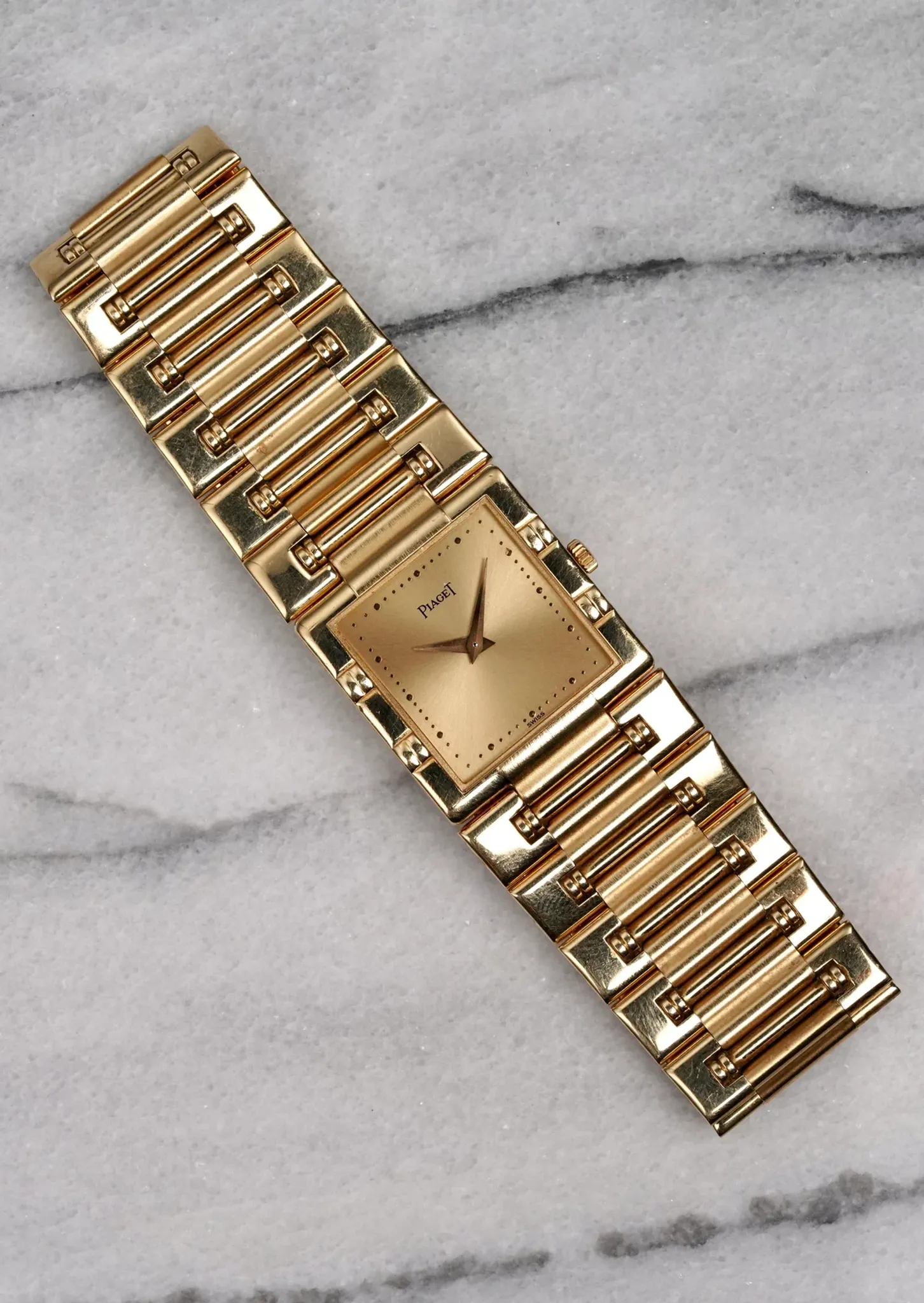 Here's a vintage Piaget Dancer Quartz 18K yellow gold from the 1980s. Keeps great time and is fully functional. Bracelet fits up to a 7.25 inch wrist. Time only. Gold dauphins hands. 18K gold case, bracelet, and caseback. Integrated bracelet. Case size across is around 25mm. Matching texture/ design on both the bracelet and bezel. Both the dial and crystal are free from any scratches or marks. Completely unpolished example which are quite hard to find (it has its scratches throughout the bracelet, but untouched!) All parts are original including the signed Rolex crown, dial, movement, and caseback. Both the dial and case are in great cosmetic, untouched condition.