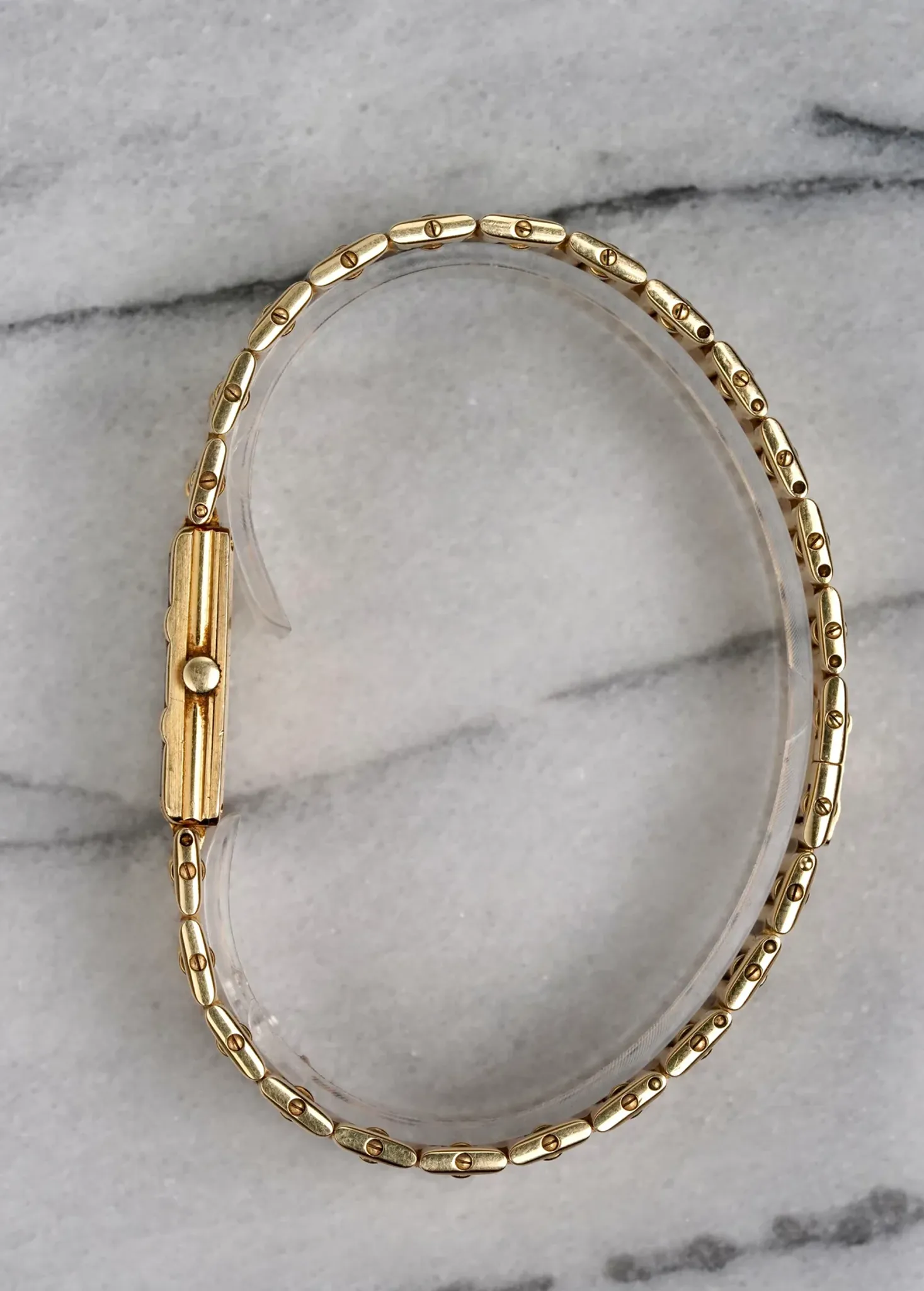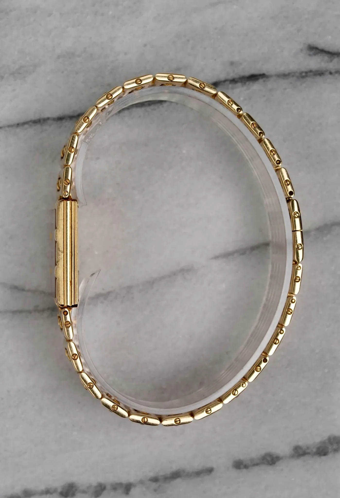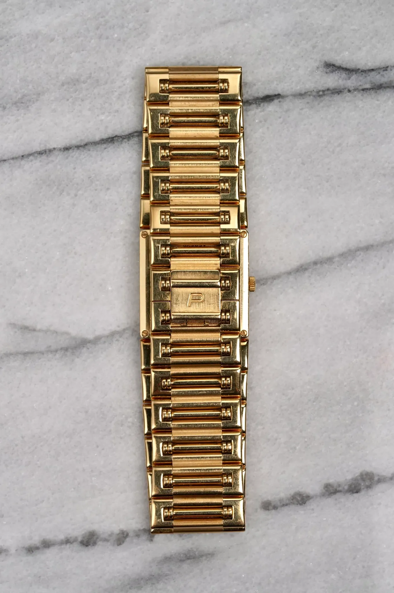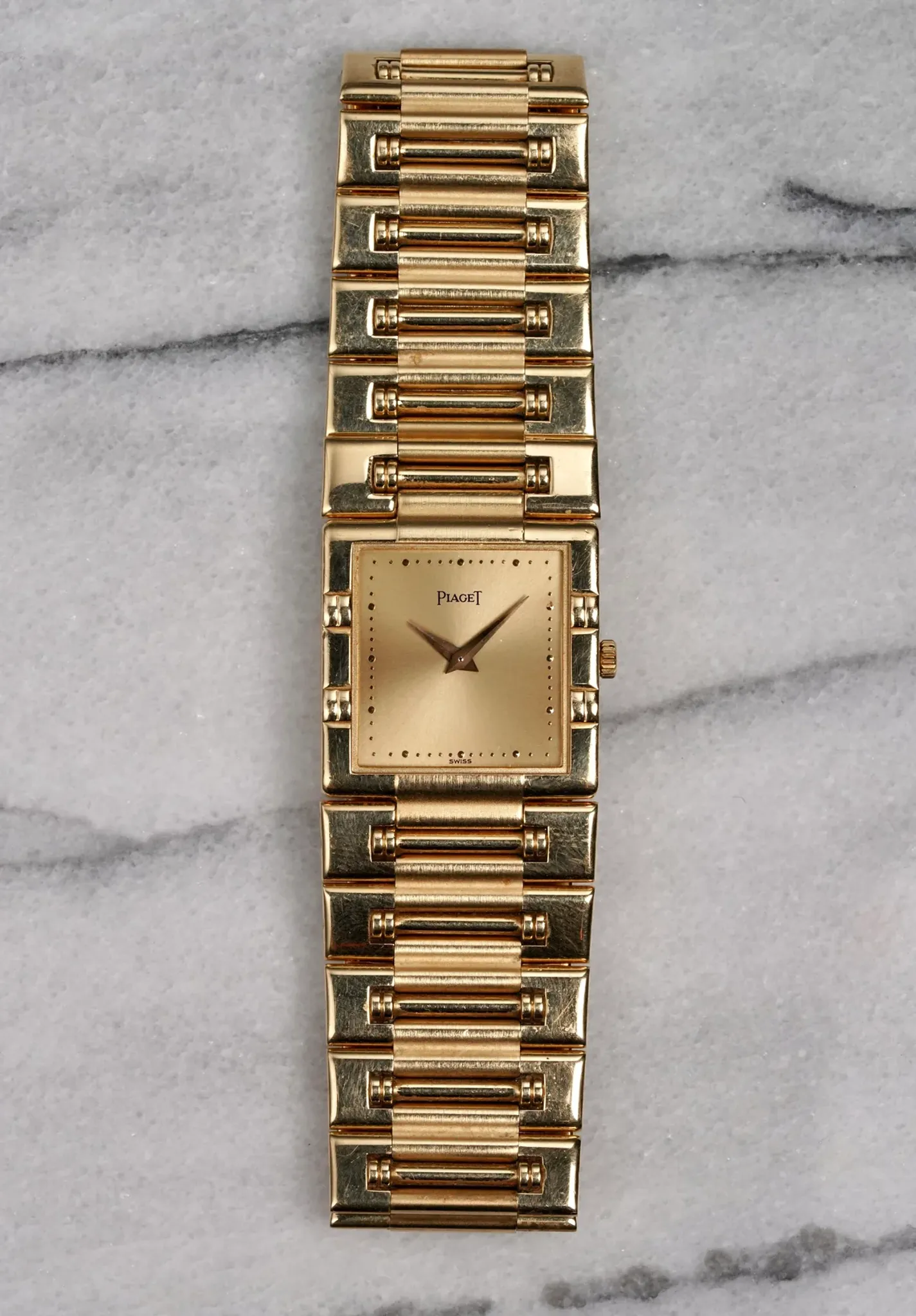 Here's a vintage Piaget Dancer Quartz 18K yellow gold from the 1980s. Keeps great time and is fully functional. Bracelet fits up to a 7.25 inch wrist. Time only. Gold dauphins hands. 18K gold case, bracelet, and caseback. Integrated bracelet. Case size across is around 25mm. Matching texture/ design on both the bracelet and bezel. Both the dial and crystal are free from any scratches or marks. Completely unpolished example which are quite hard to find (it has its scratches throughout the bracelet, but untouched!) All parts are original including the signed Rolex crown, dial, movement, and caseback. Both the dial and case are in great cosmetic, untouched condition.