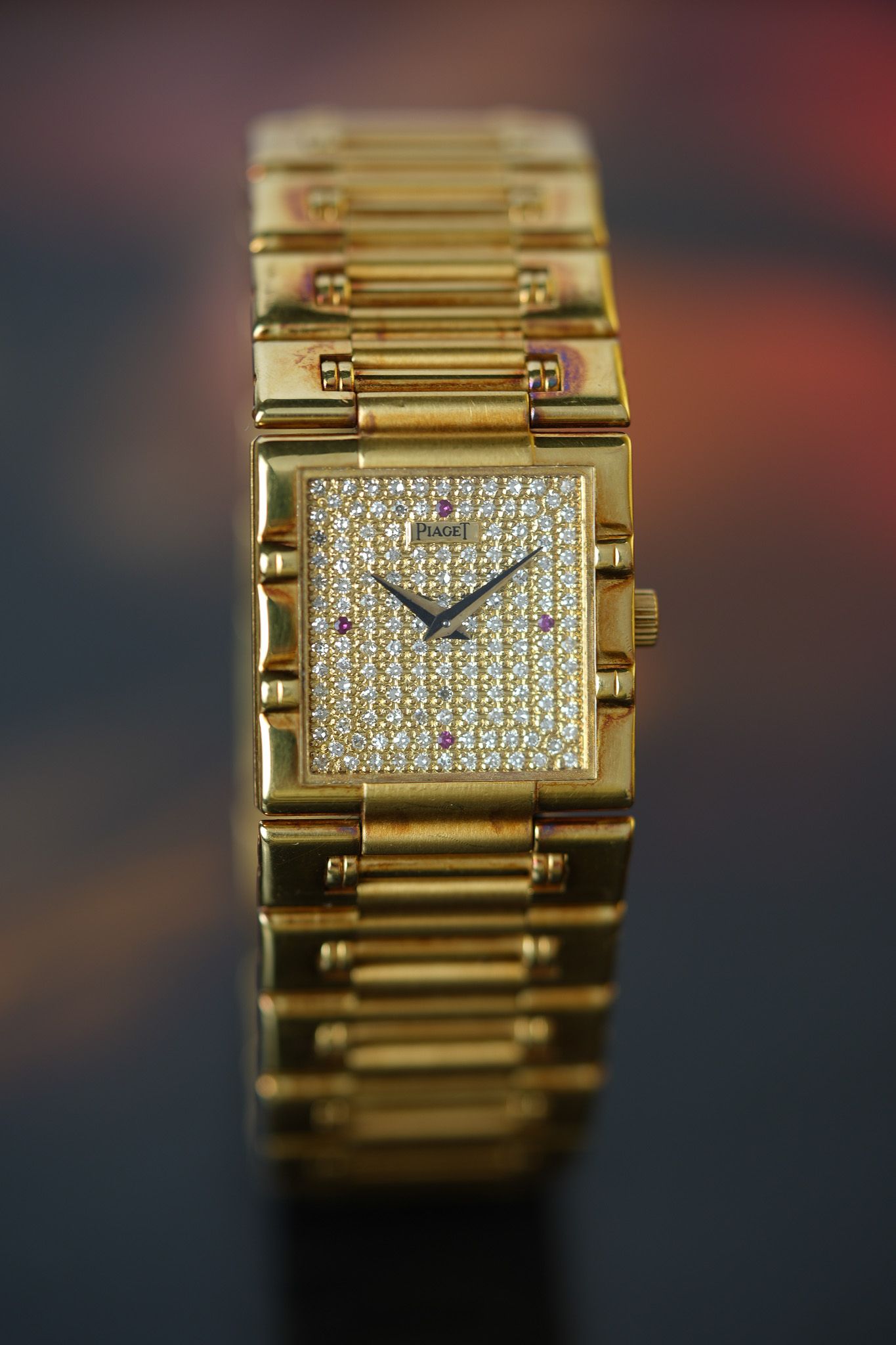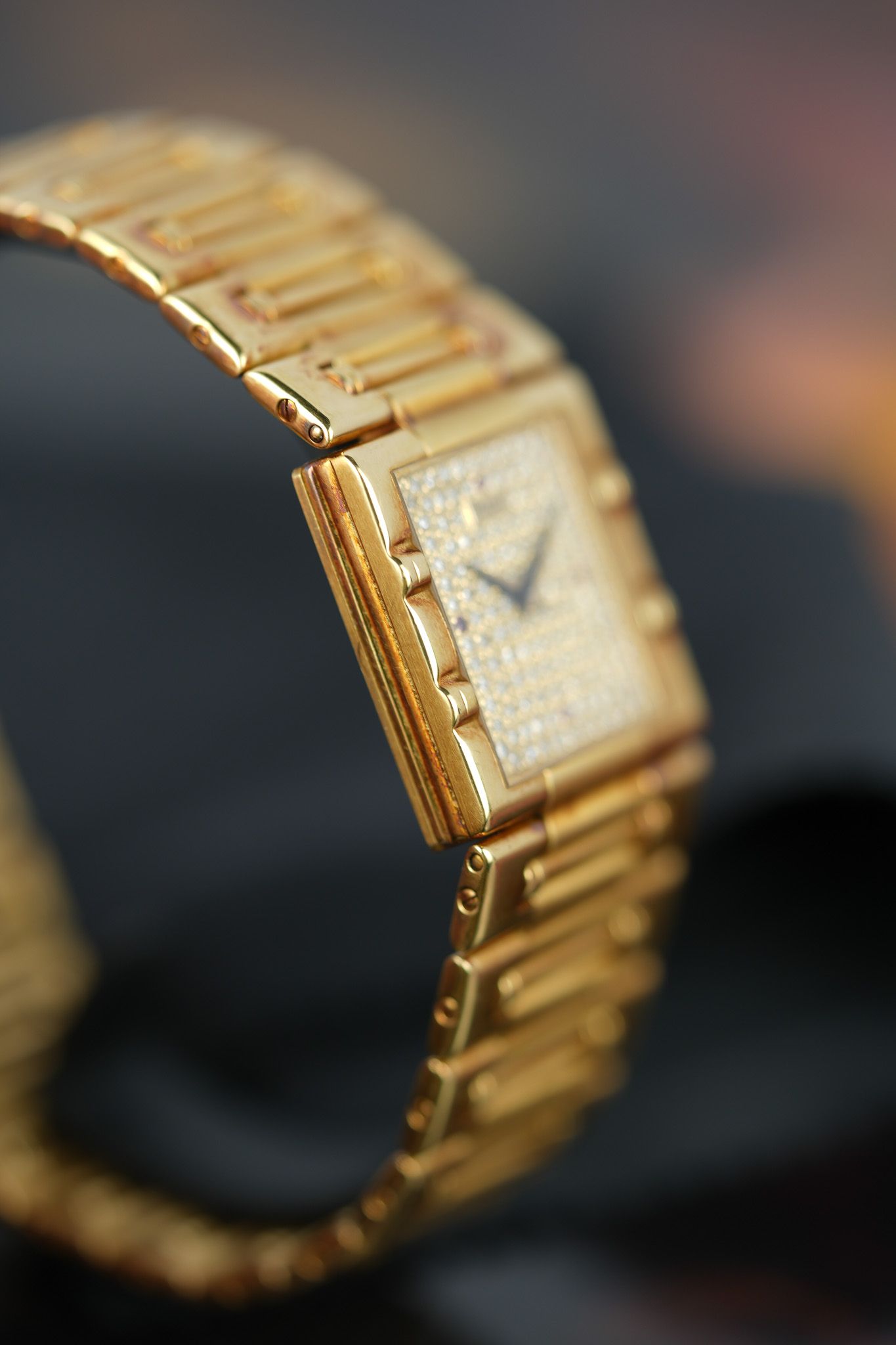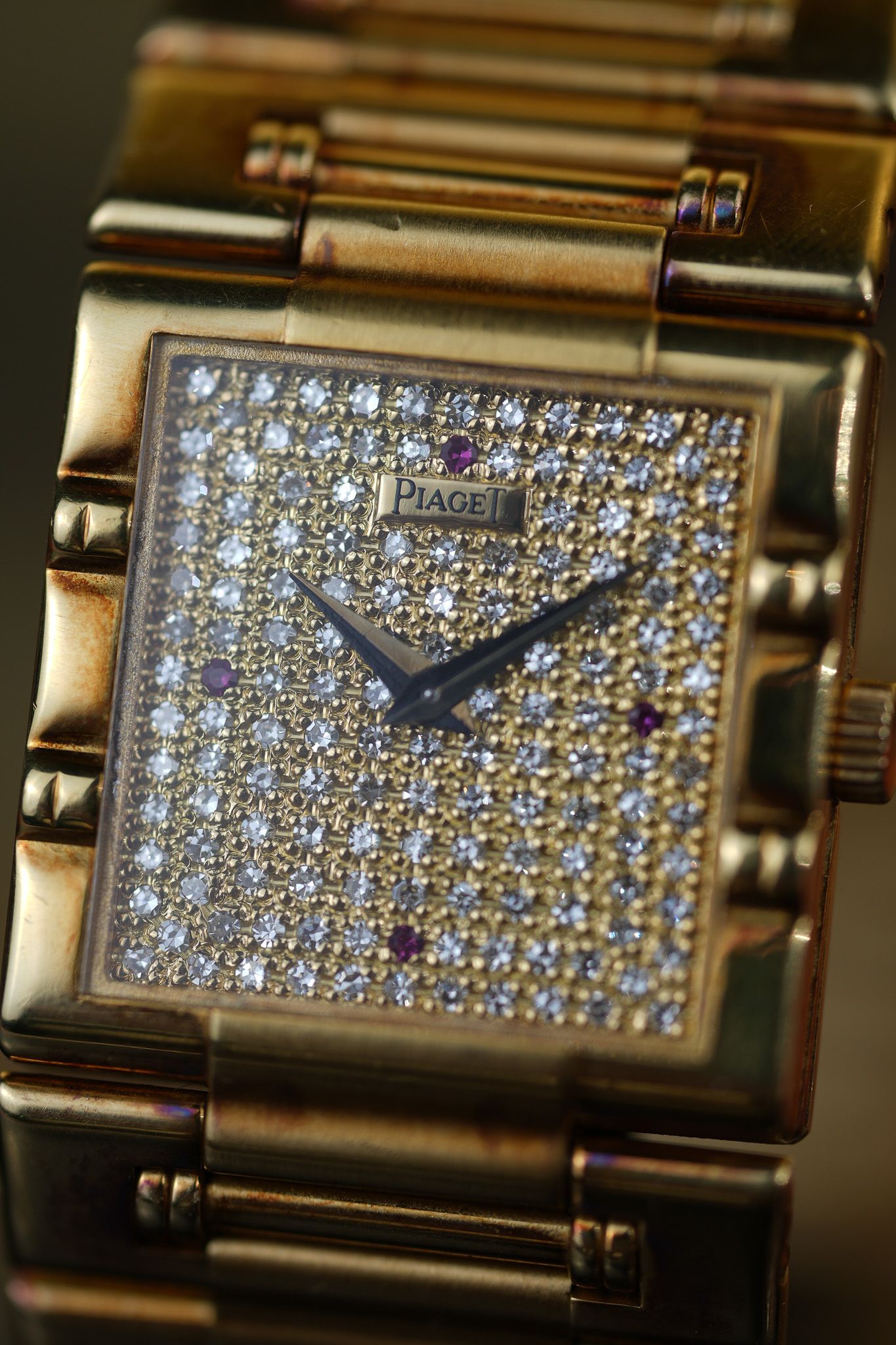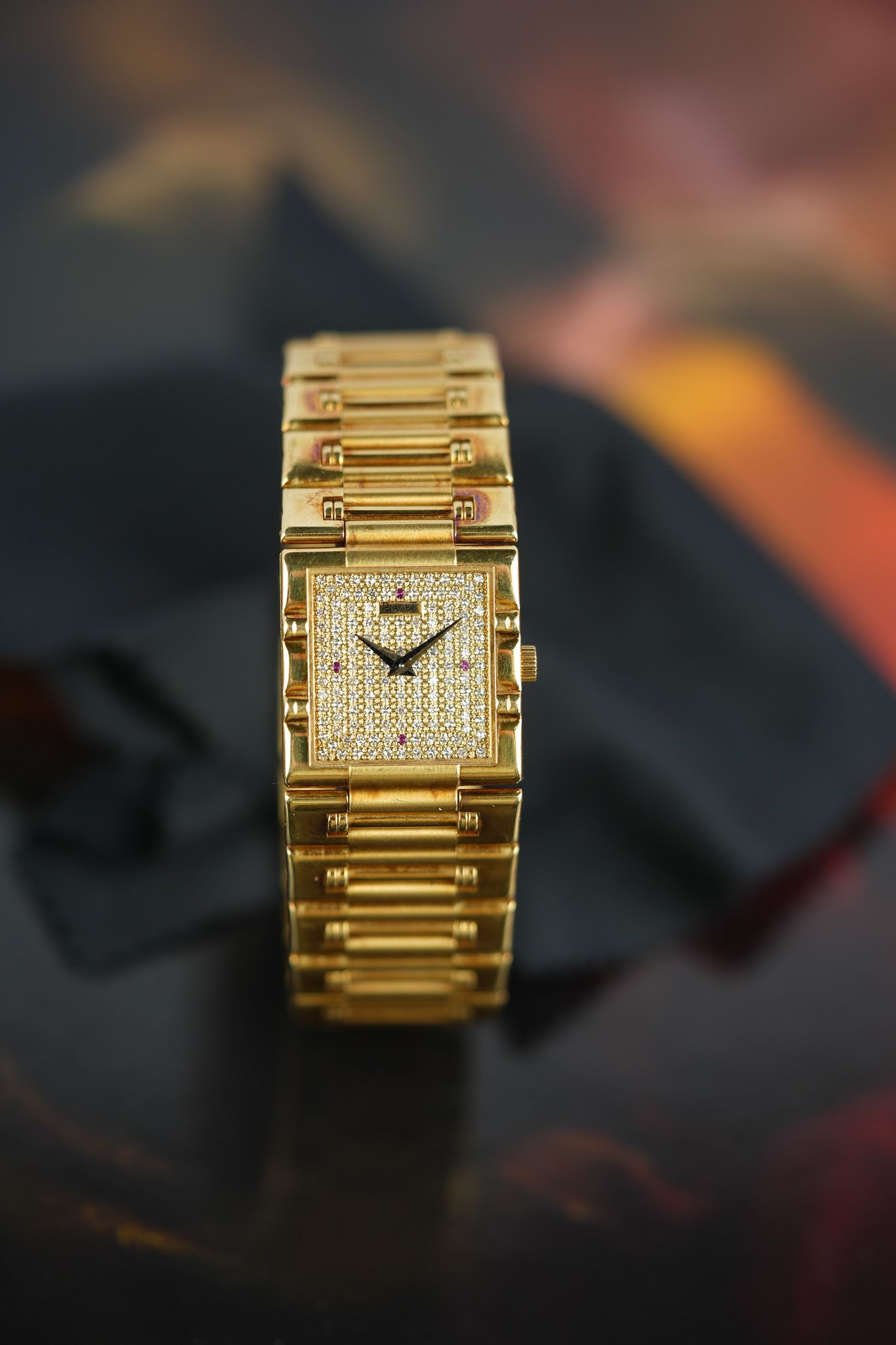 This particular example is a striking expression of that ethos. Crafted entirely in 18k yellow gold, the square case flows seamlessly into an integrated bracelet—one of Piaget’s signatures—ensuring continuity in design. The weight is substantial at 97 grams, giving it the kind of presence you can actually feel on the wrist.