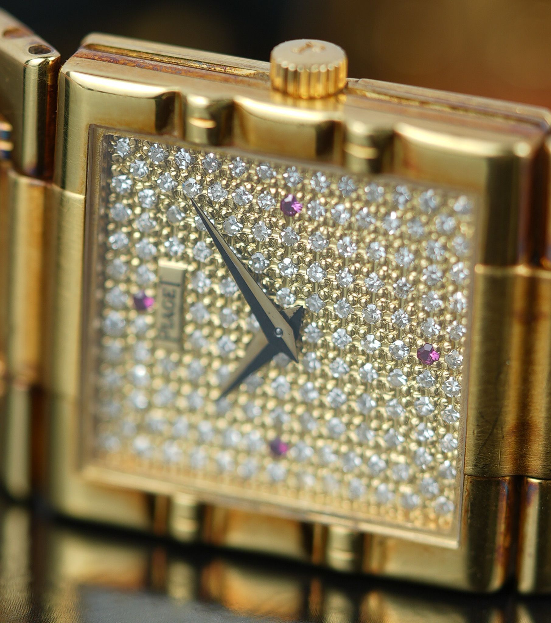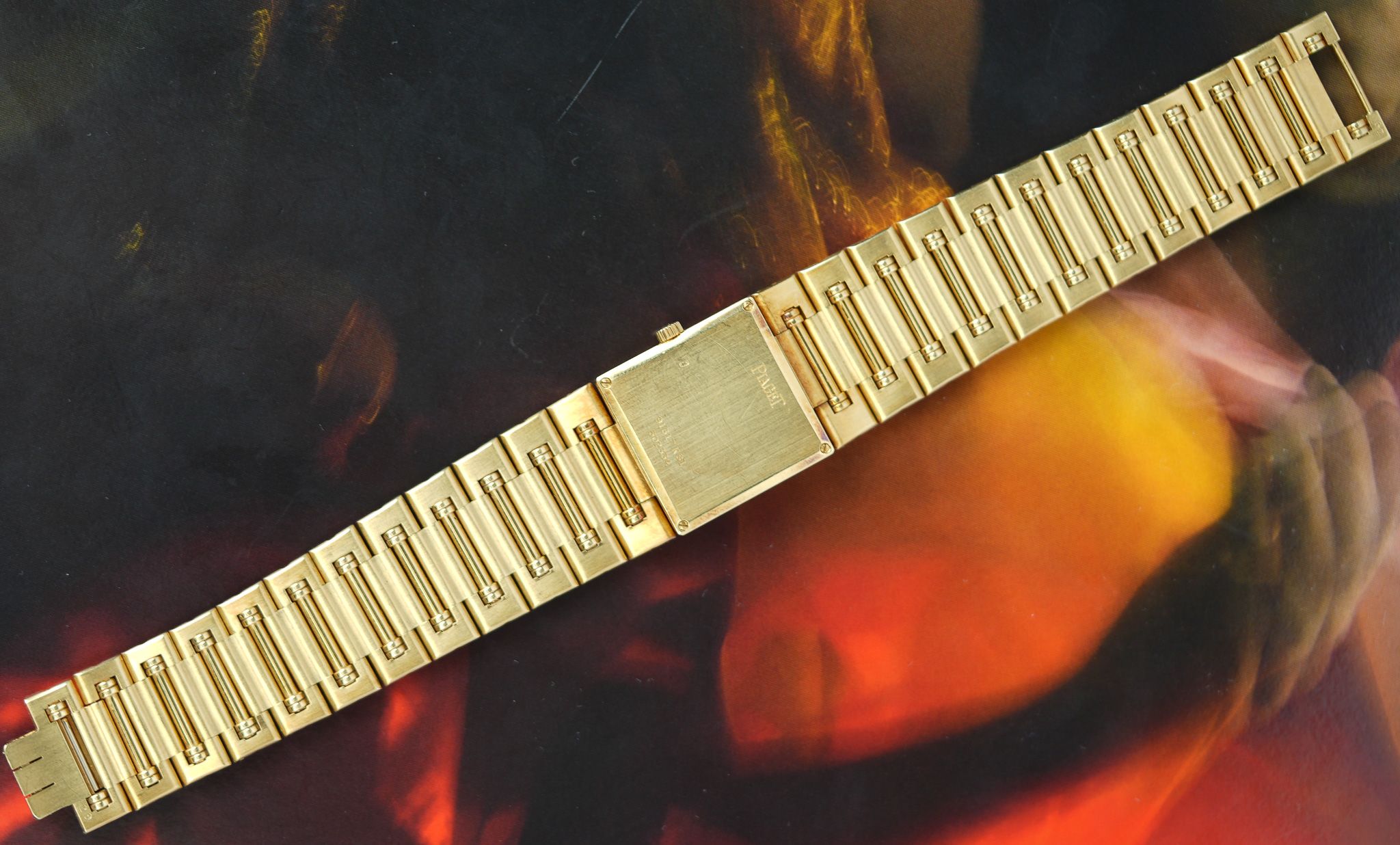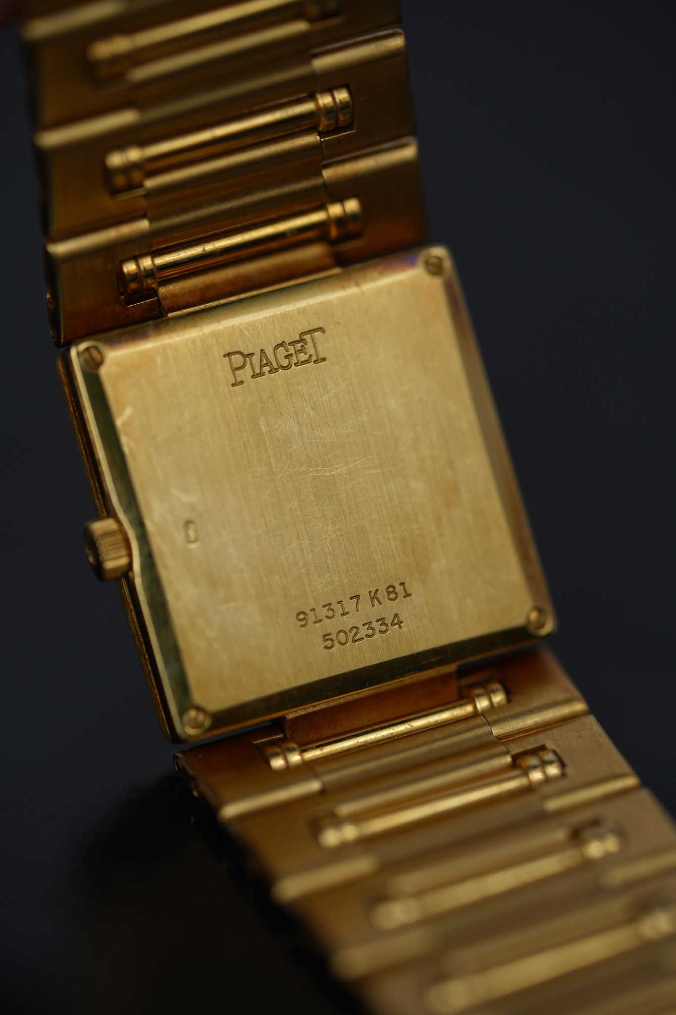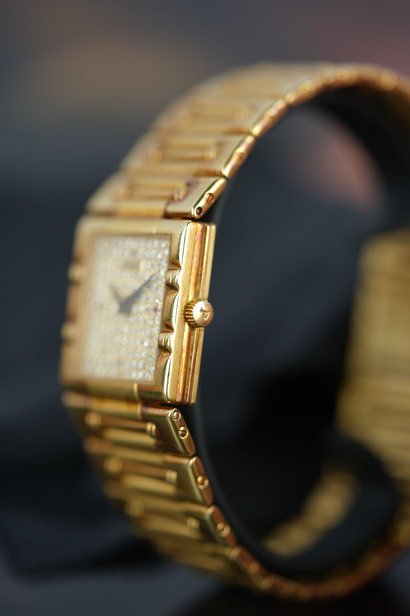 This particular example is a striking expression of that ethos. Crafted entirely in 18k yellow gold, the square case flows seamlessly into an integrated bracelet—one of Piaget’s signatures—ensuring continuity in design. The weight is substantial at 97 grams, giving it the kind of presence you can actually feel on the wrist.