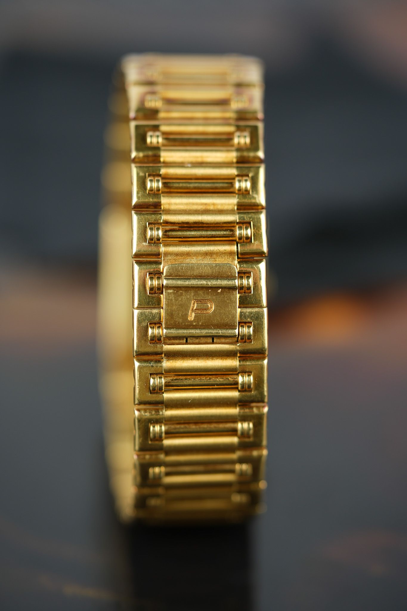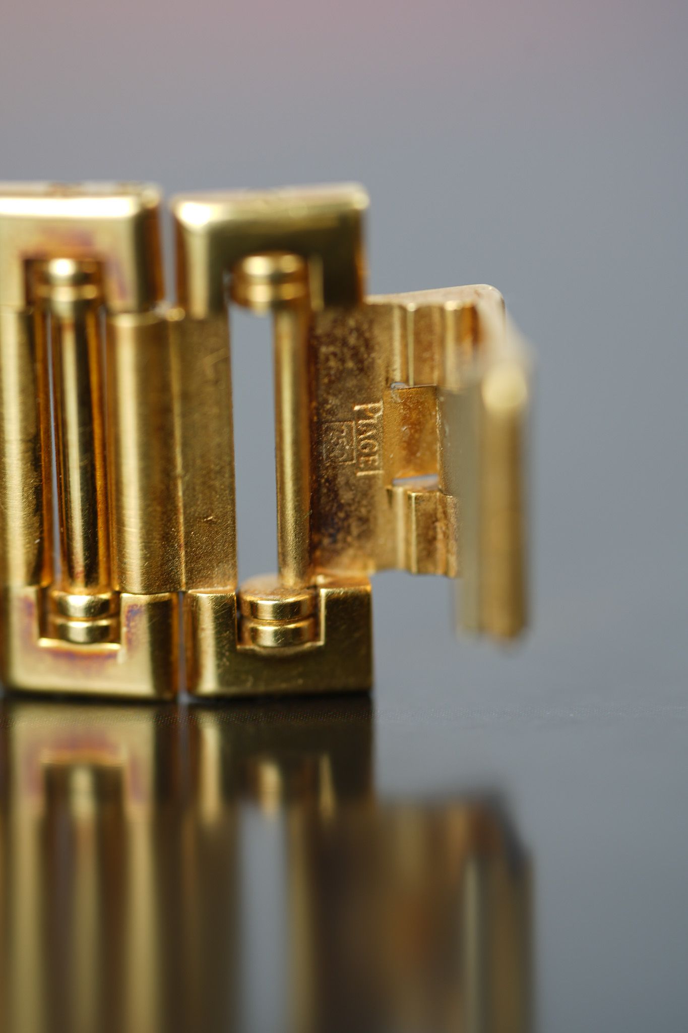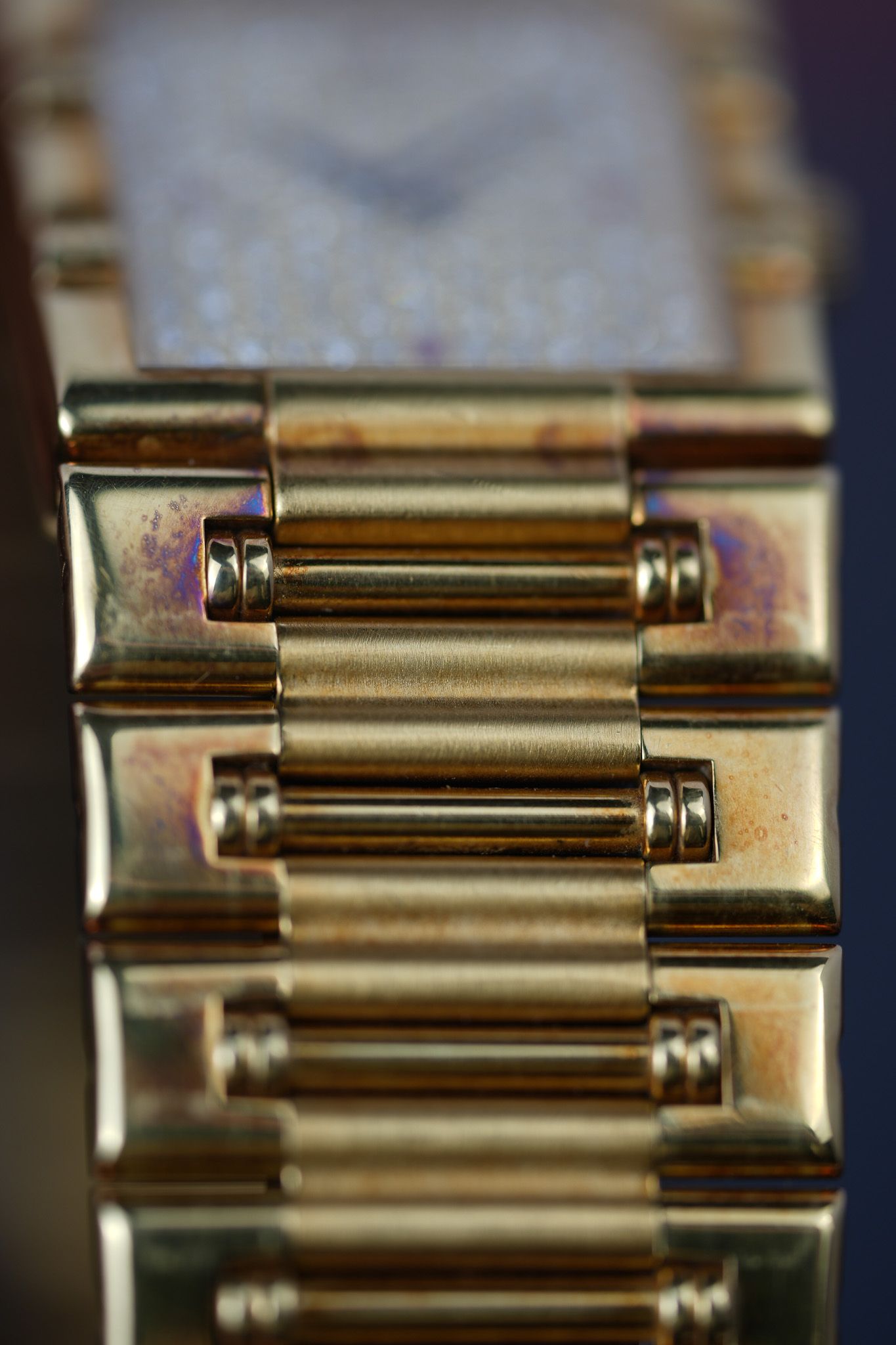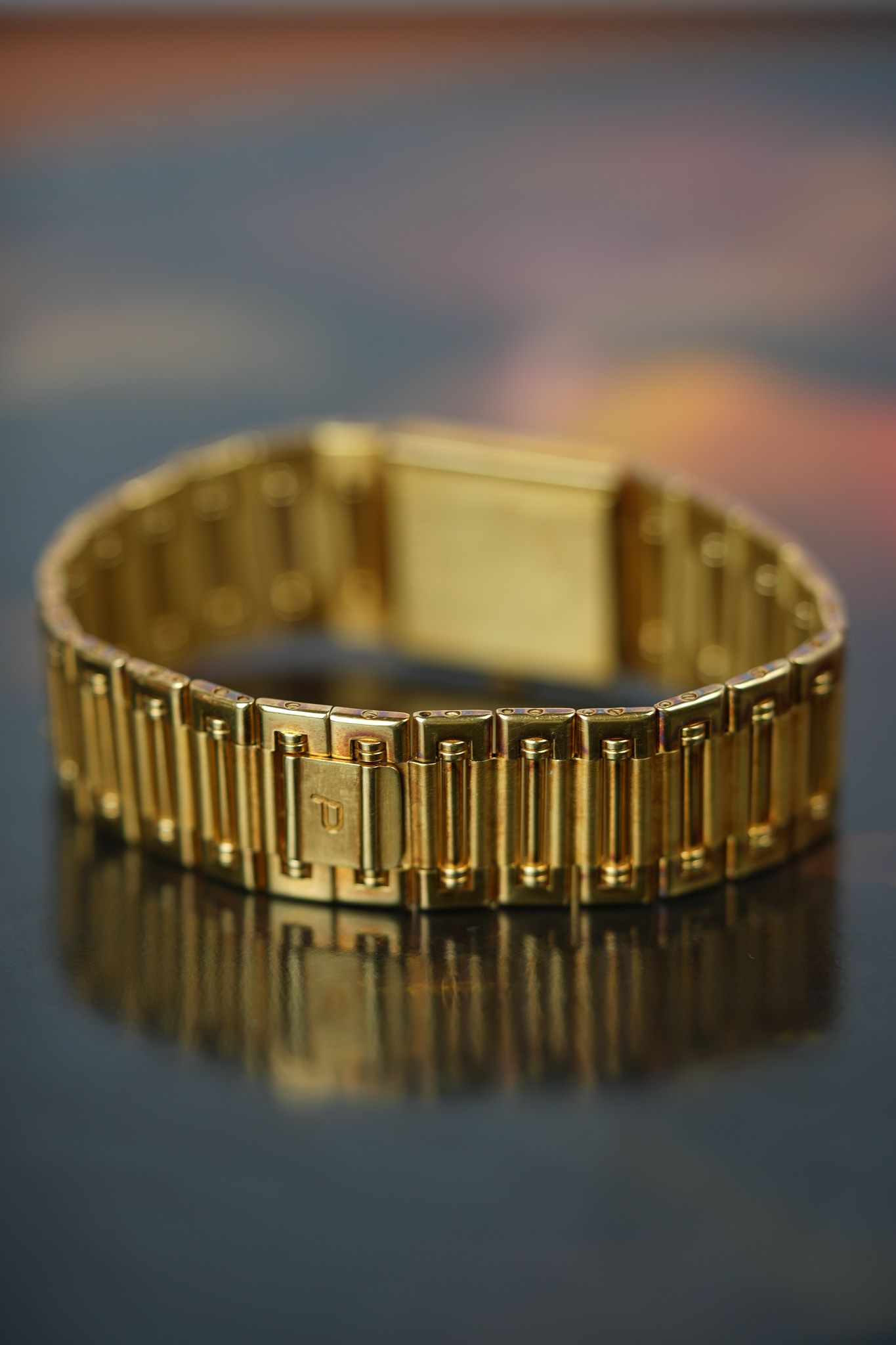 This particular example is a striking expression of that ethos. Crafted entirely in 18k yellow gold, the square case flows seamlessly into an integrated bracelet—one of Piaget’s signatures—ensuring continuity in design. The weight is substantial at 97 grams, giving it the kind of presence you can actually feel on the wrist.