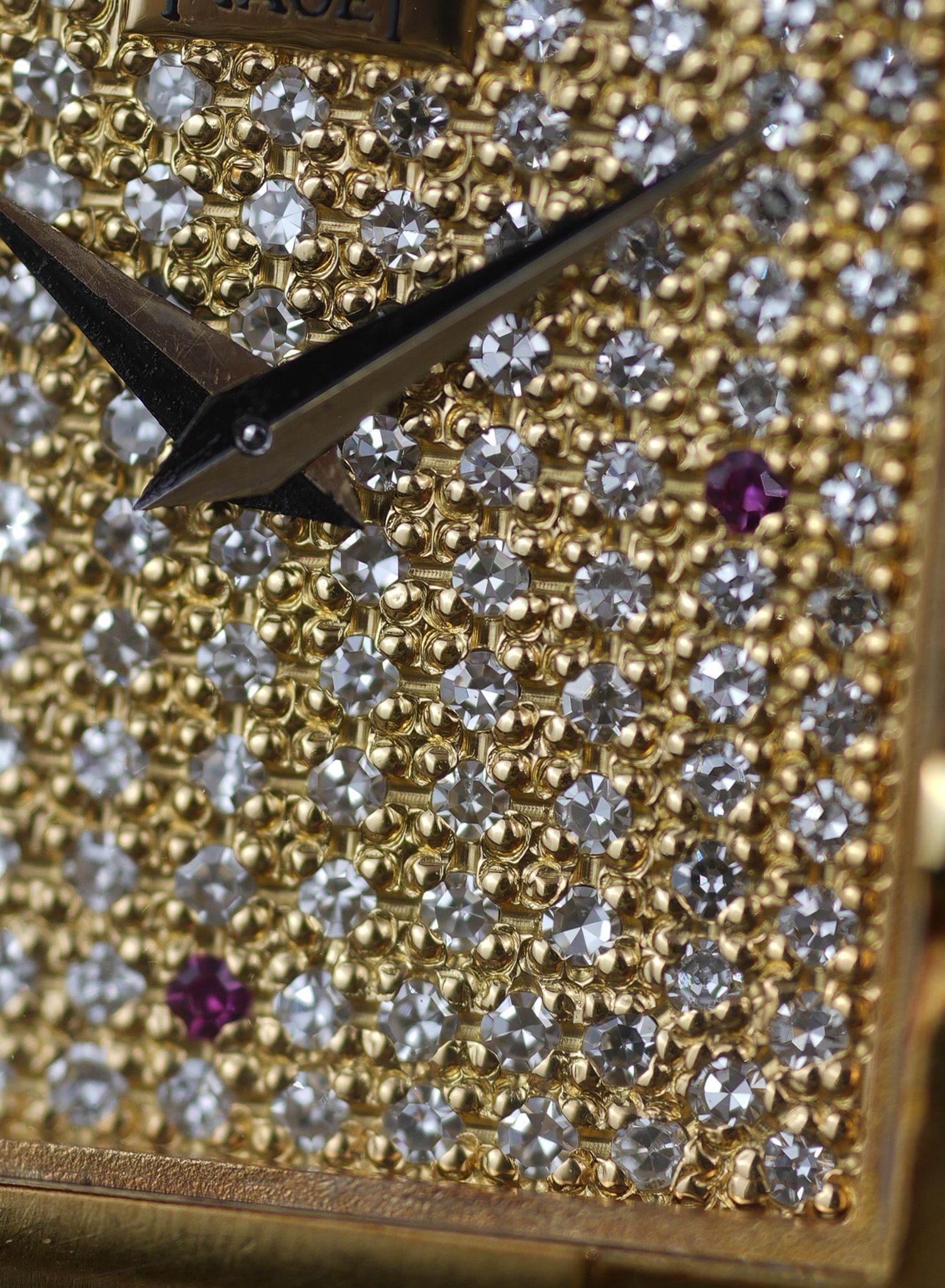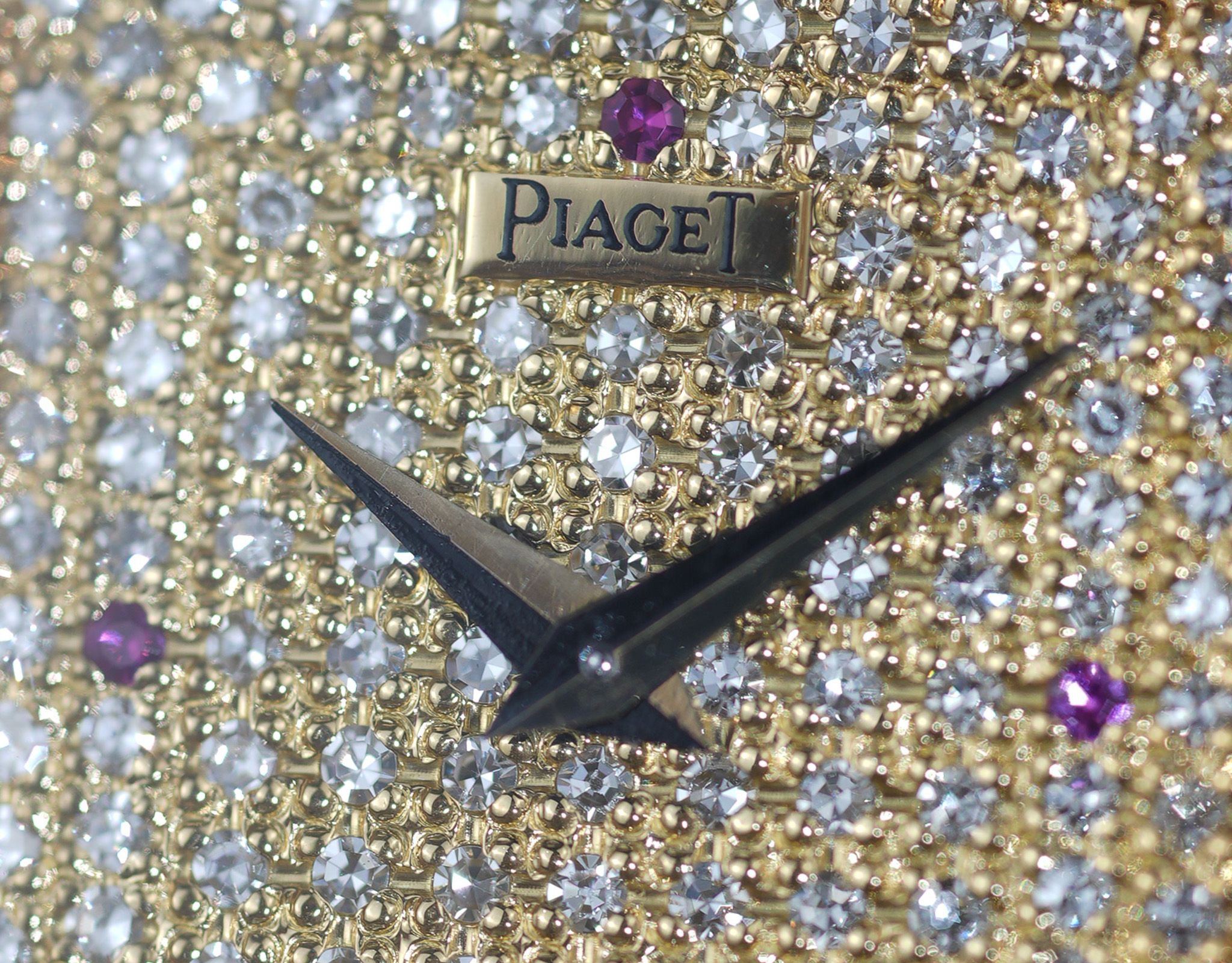 But the real showstopper here is the pavé diamond dial. Piaget didn’t just dabble in gem-setting; they set the standard. Under a loupe, the execution is flawless—each prong is equal in size, spacing is perfect, and the surface of the dial gleams under the light like a sheet of gold-dusted ice. The four ruby markers at 12, 3, 6, and 9 add a sharp contrast, not just for visual intrigue but also for practical timekeeping.