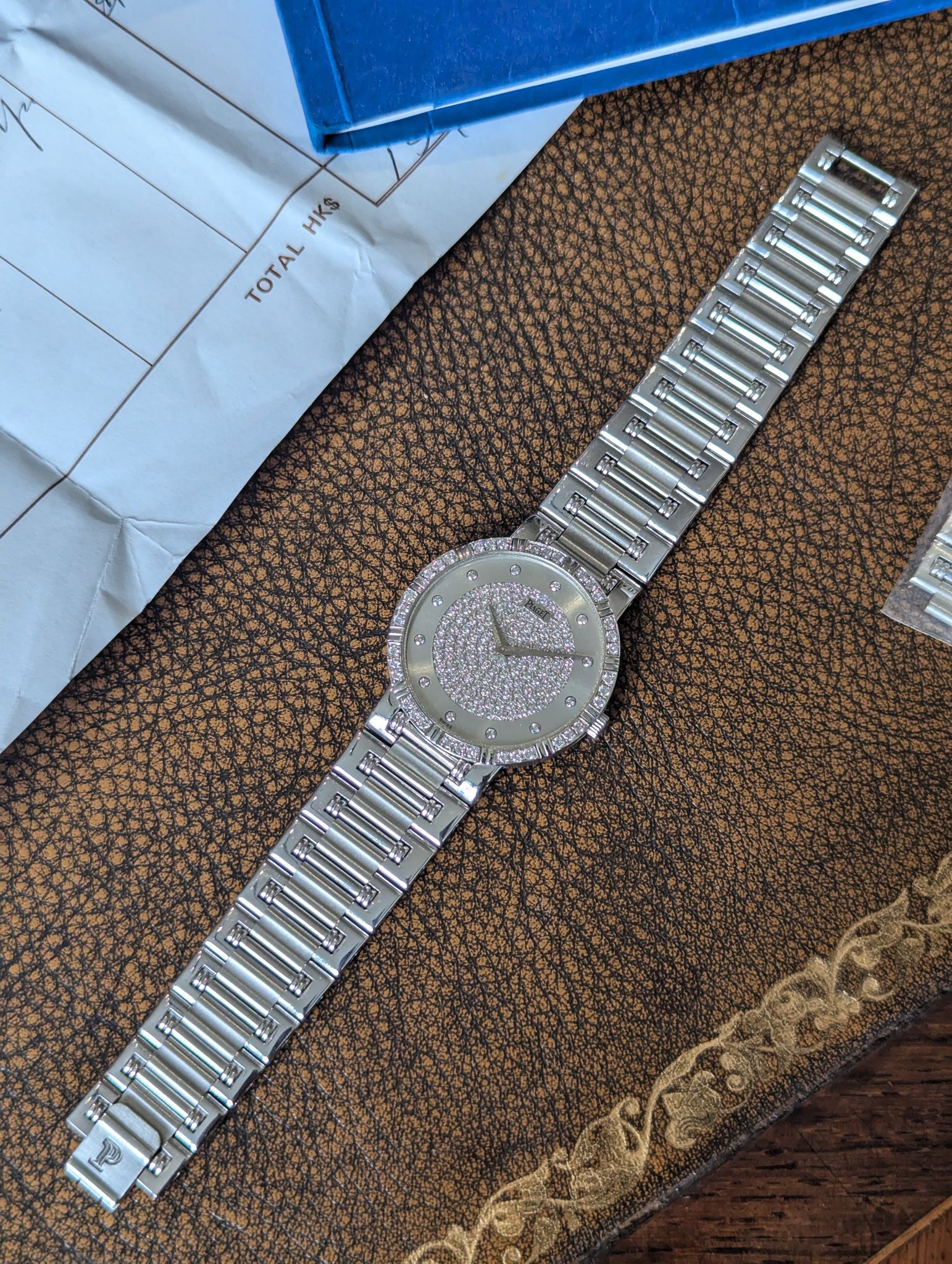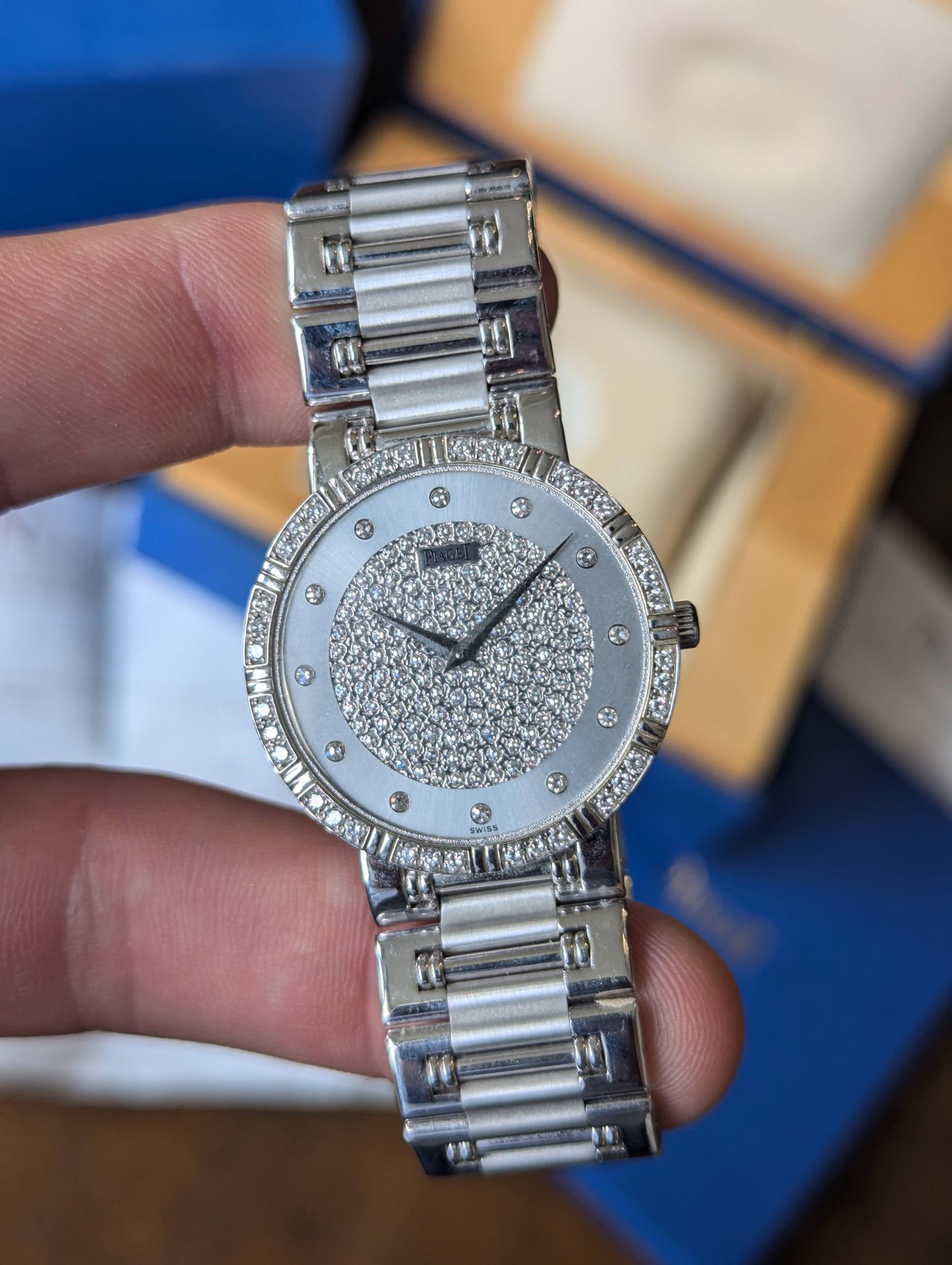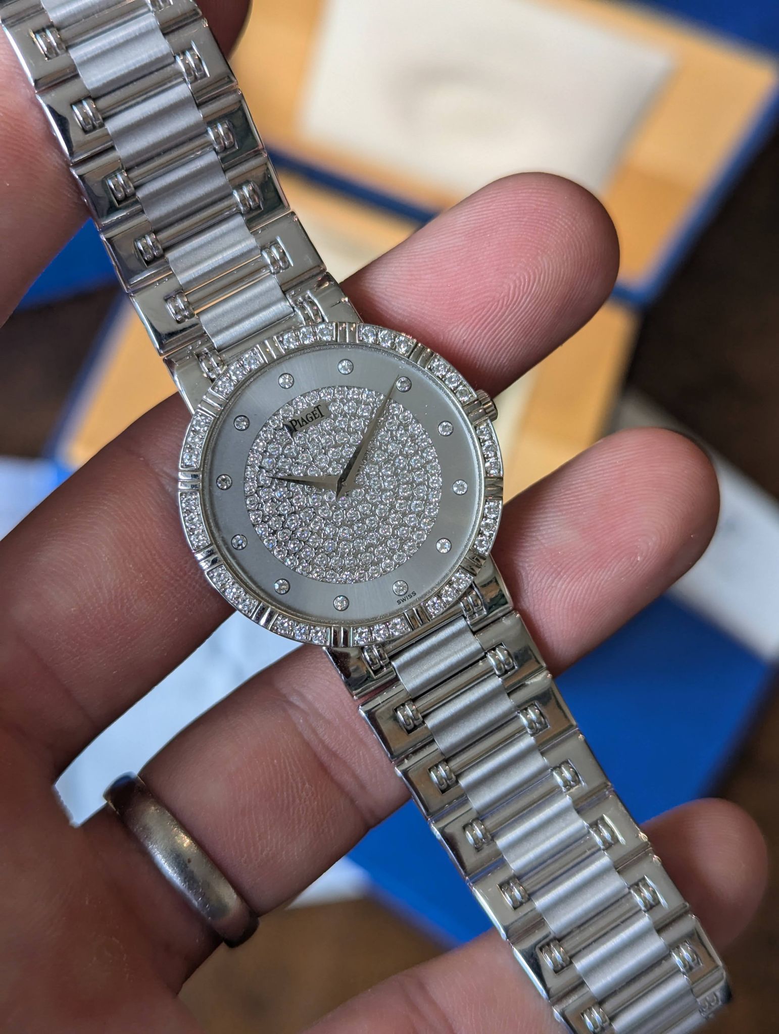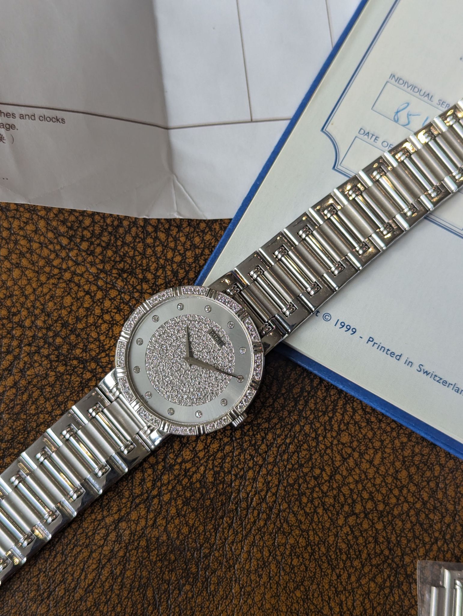This Piaget Dancer in white gold (98 grams in total) bears the reference 94024. Featuring the mythical articulated bracelet of the Dancer line, it comes with a 2-tone pavé dial and pavé bezel. Its very slim profile makes it sit nicely on the wrist. Piaget is famous for flat movements and this is perfectly visible here, with a watch as thin as a quartz model, while being mechanically wound.