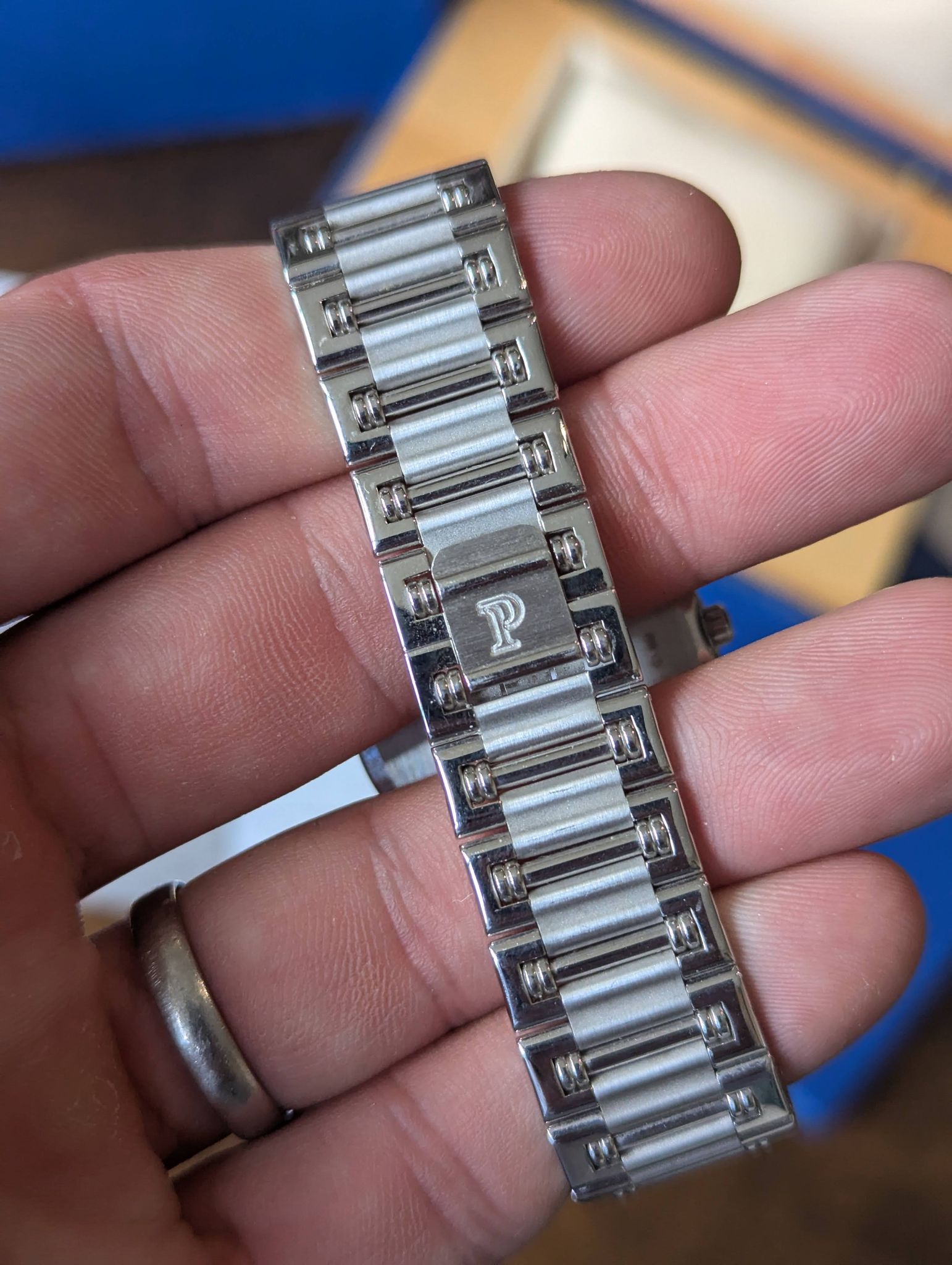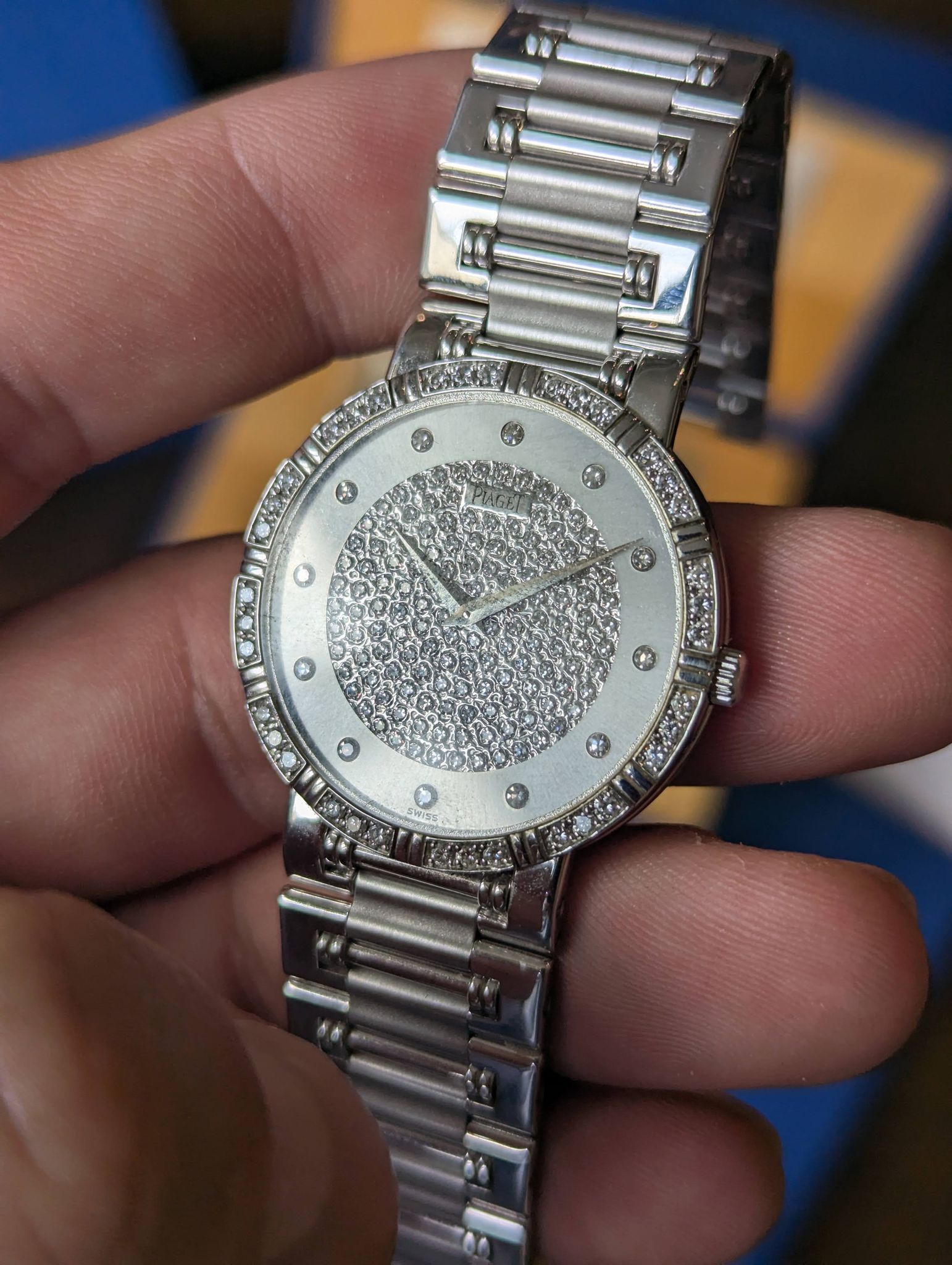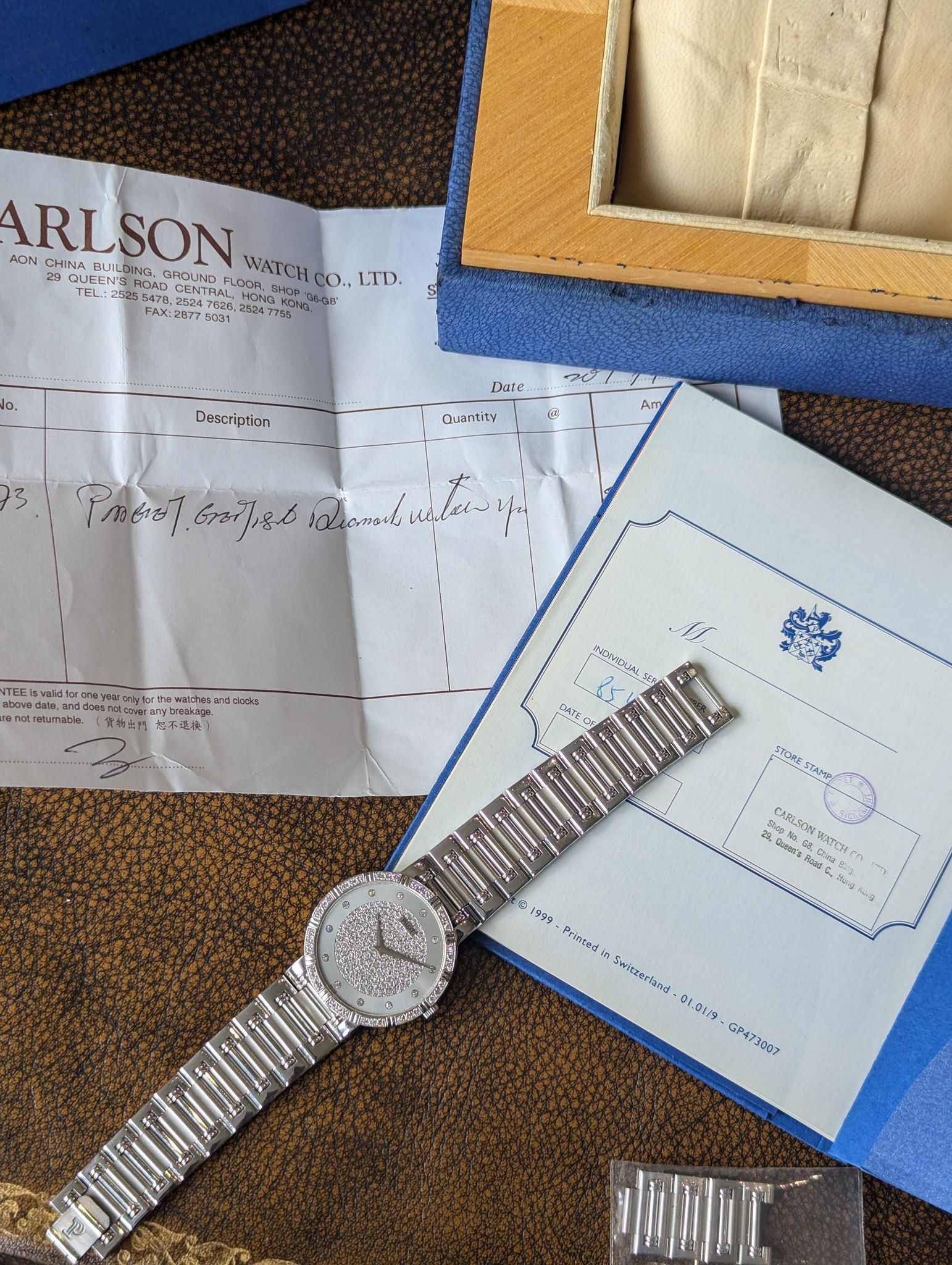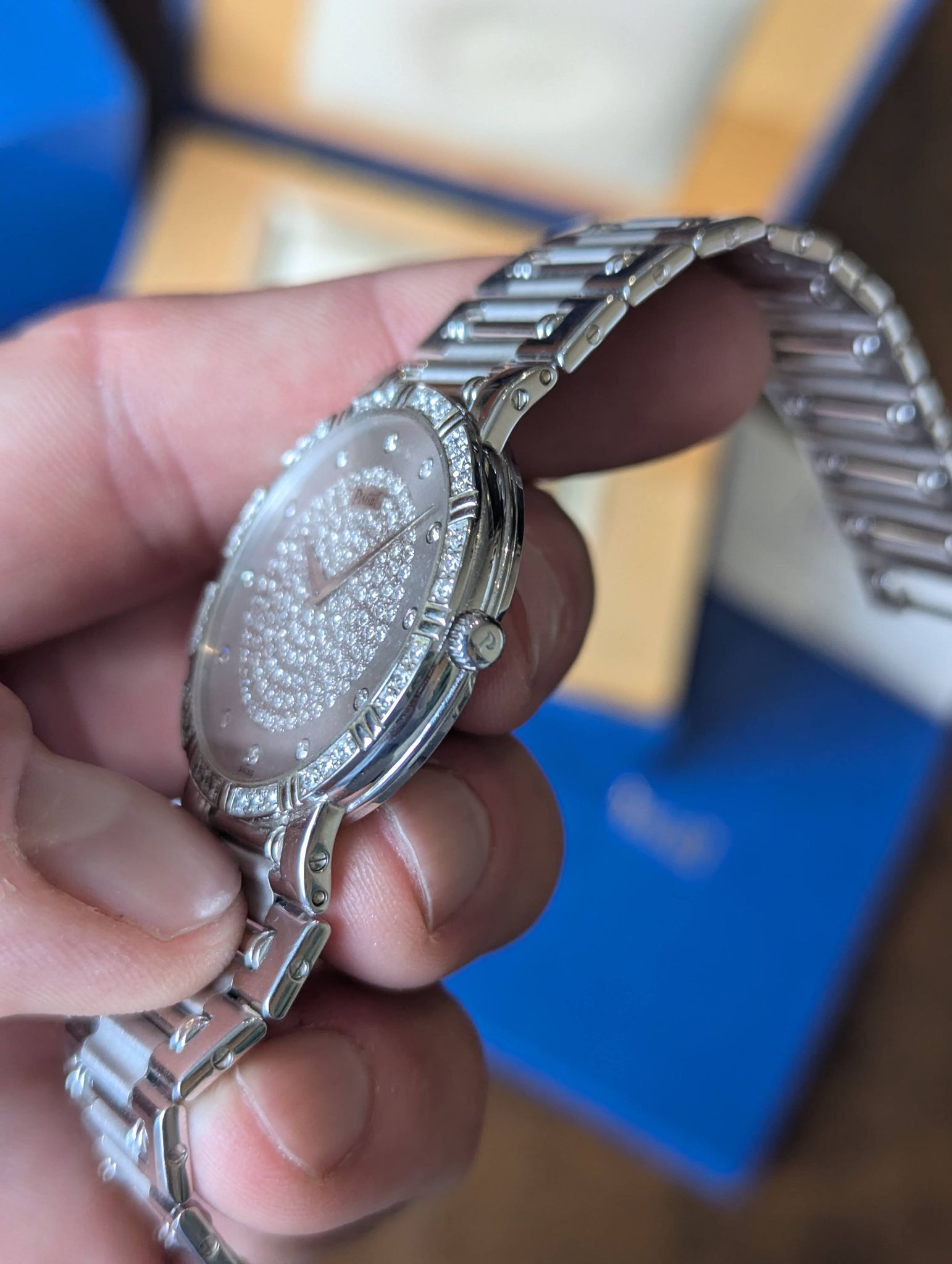 This Piaget Dancer in white gold (98 grams in total) bears the reference 94024. Featuring the mythical articulated bracelet of the Dancer line, it comes with a 2-tone pavé dial and pavé bezel. Its very slim profile makes it sit nicely on the wrist. Piaget is famous for flat movements and this is perfectly visible here, with a watch as thin as a quartz model, while being mechanically wound.