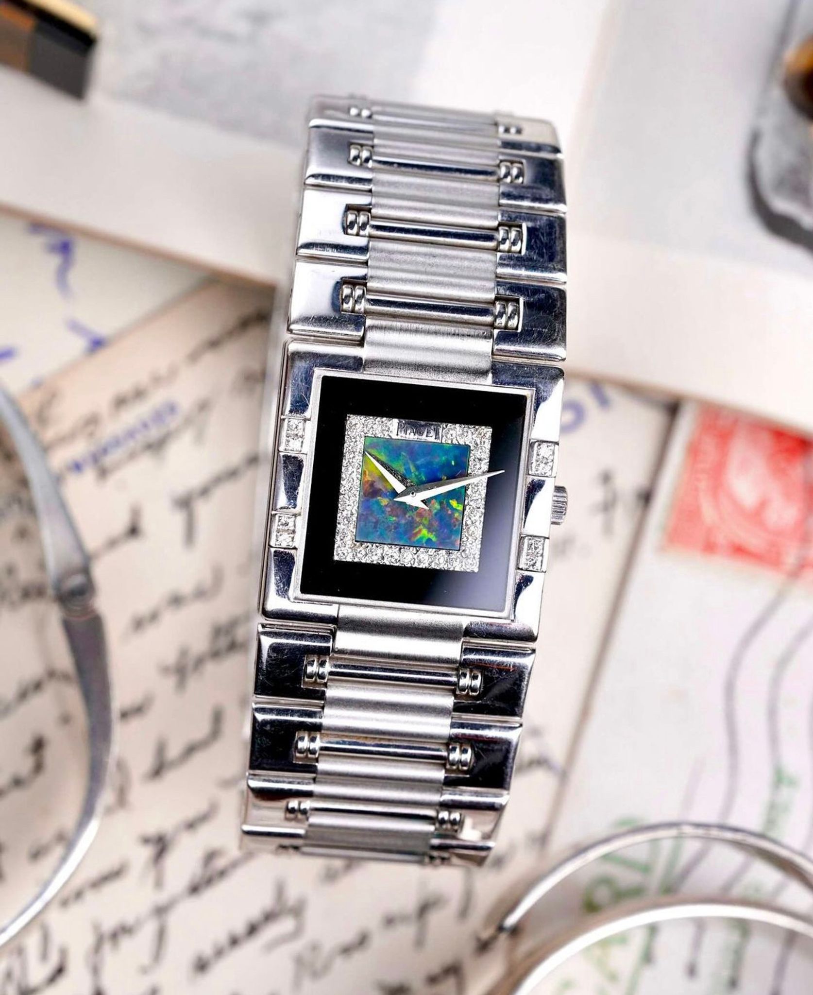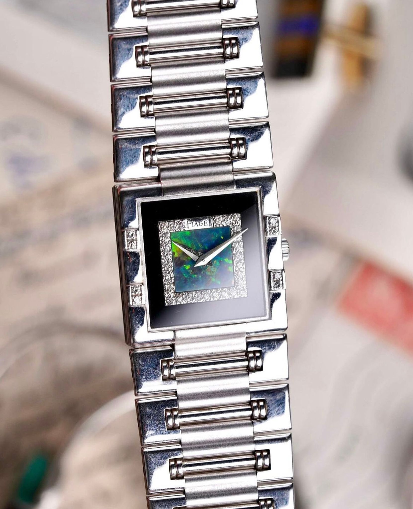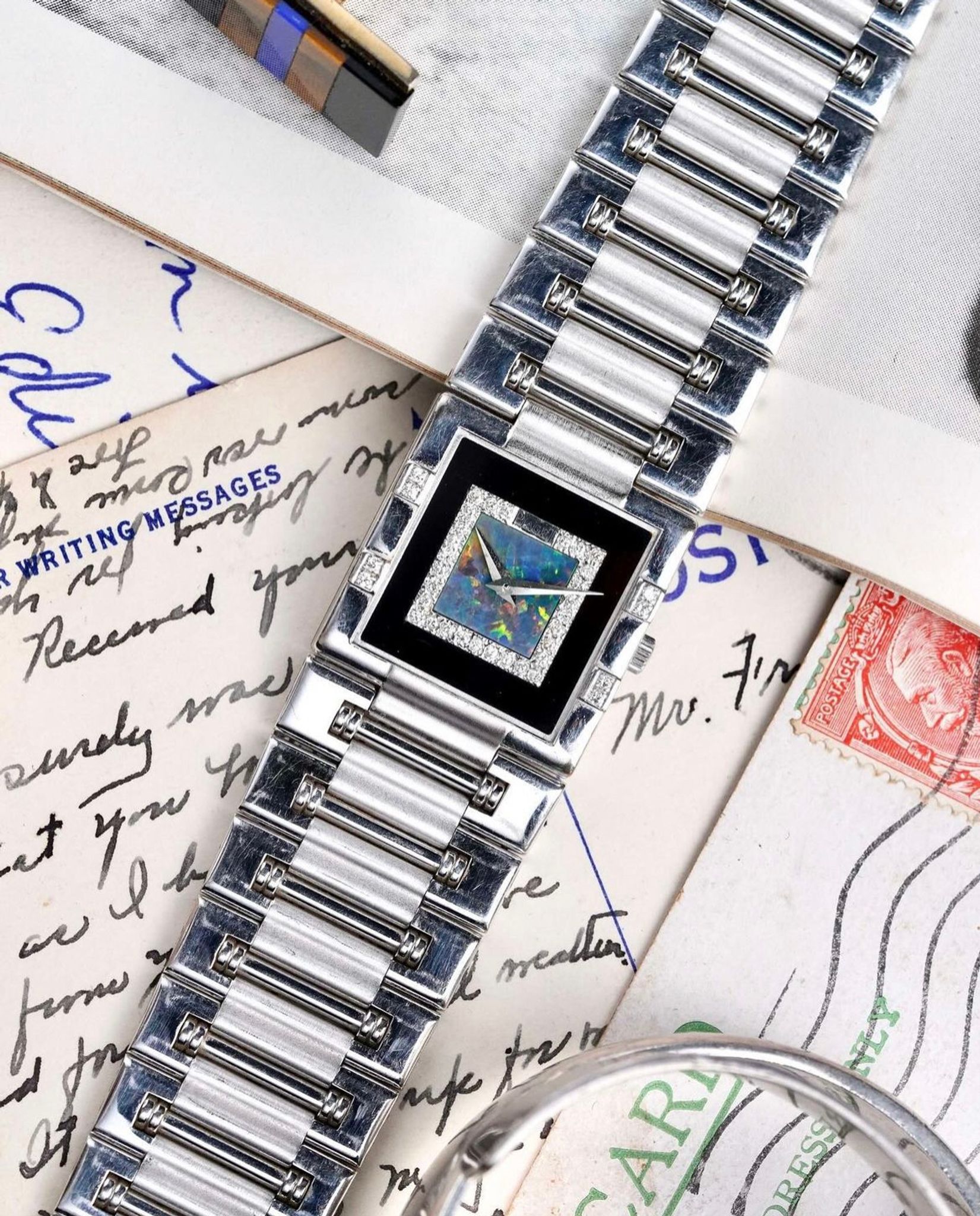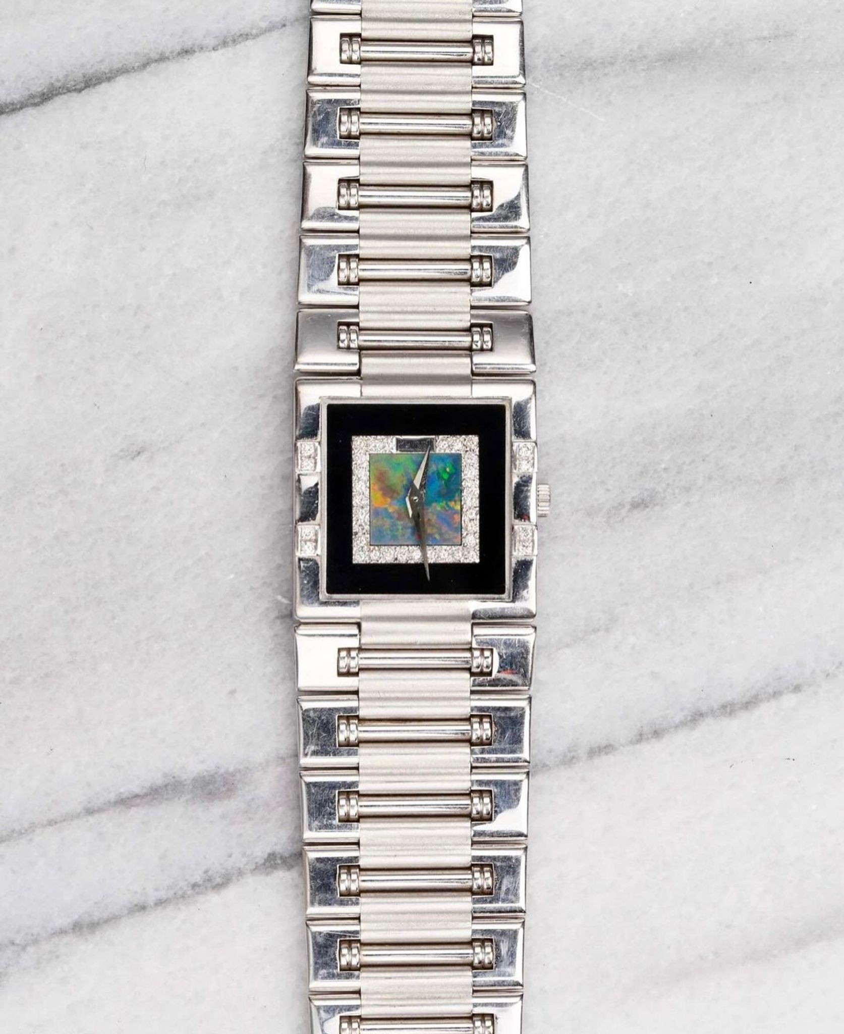 Here's a vintage Piaget Dancer reference 90327 with an uncommon onyx & opal diamond dial which is a unique combo, to say the least. The dancer in white gold was known to be produced in lesser quantities especially housing a beautiful opal dial. It is powered by a quartz movement and paired with its integrated 18K white gold bracelet from the 1980s. Keeps great time and is fully functional. The bracelet fits up to a 7 inch wrist. (The links have screws so they can be removed). White gold dauphine hands. 18K gold case, bracelet, and caseback. Integrated bracelet. 25mm case. Matching texture/ design on both the case and bracelet. All parts are original including dial, movement, and caseback. Both the dial and case are in great cosmetic, untouched condition.