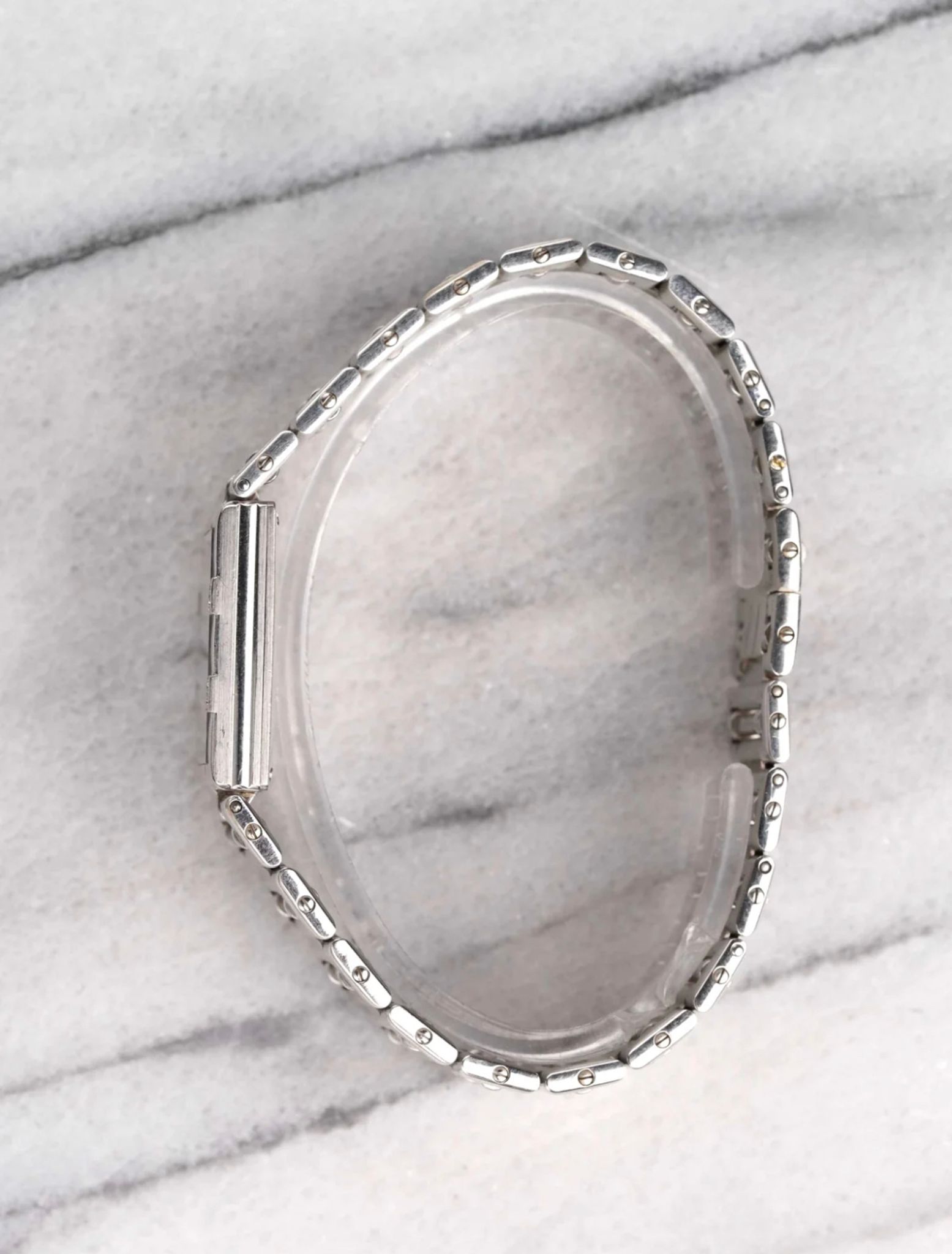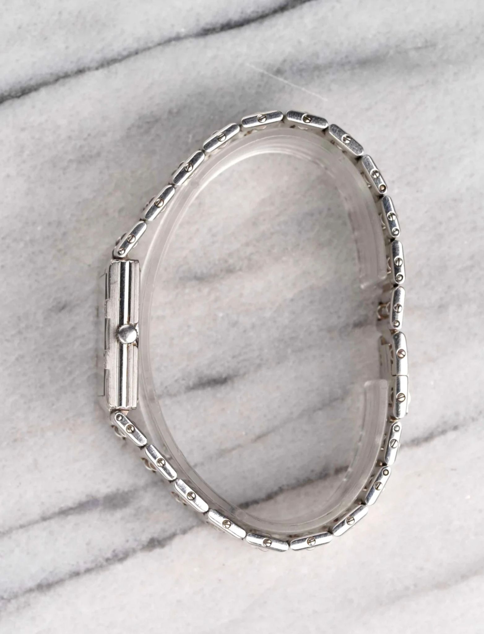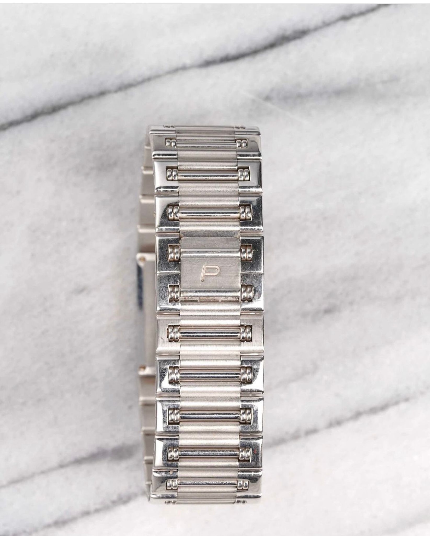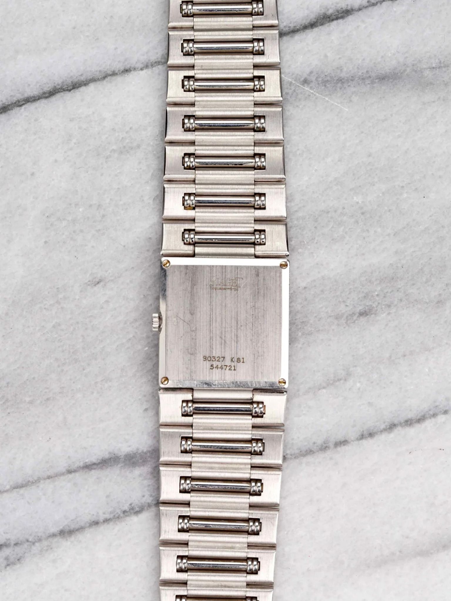 Here's a vintage Piaget Dancer reference 90327 with an uncommon onyx & opal diamond dial which is a unique combo, to say the least. The dancer in white gold was known to be produced in lesser quantities especially housing a beautiful opal dial. It is powered by a quartz movement and paired with its integrated 18K white gold bracelet from the 1980s. Keeps great time and is fully functional. The bracelet fits up to a 7 inch wrist. (The links have screws so they can be removed). White gold dauphine hands. 18K gold case, bracelet, and caseback. Integrated bracelet. 25mm case. Matching texture/ design on both the case and bracelet. All parts are original including dial, movement, and caseback. Both the dial and case are in great cosmetic, untouched condition.