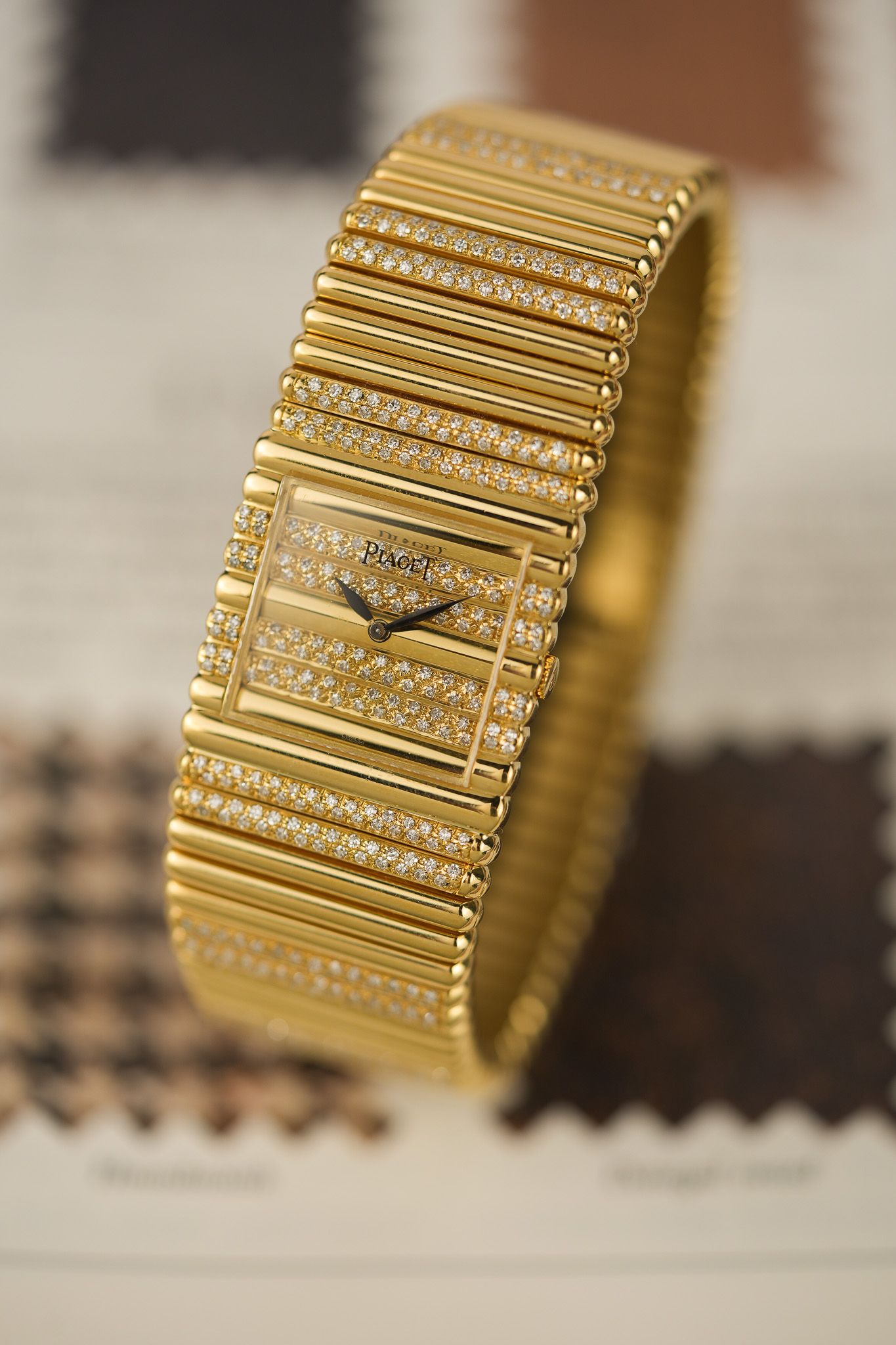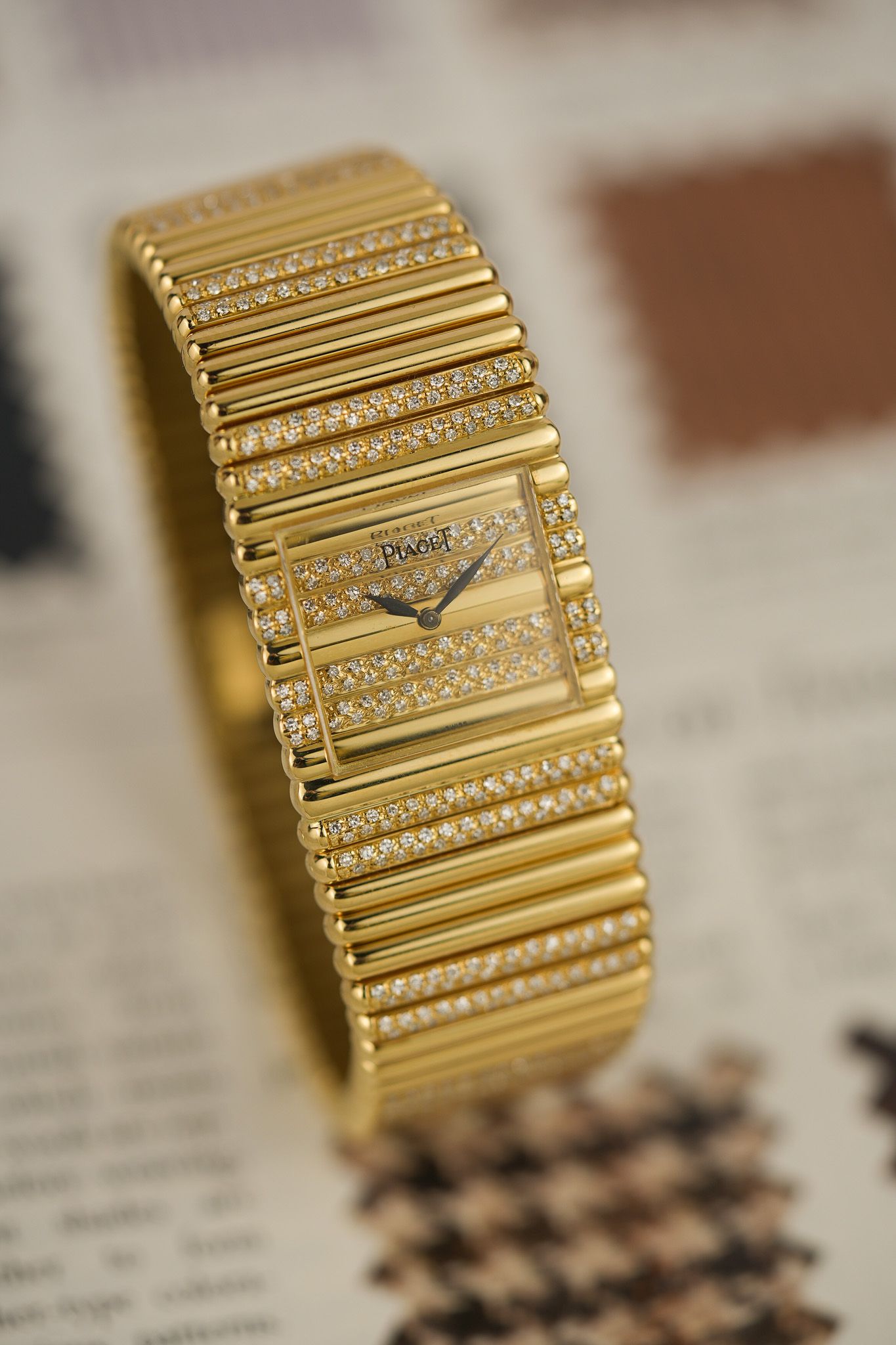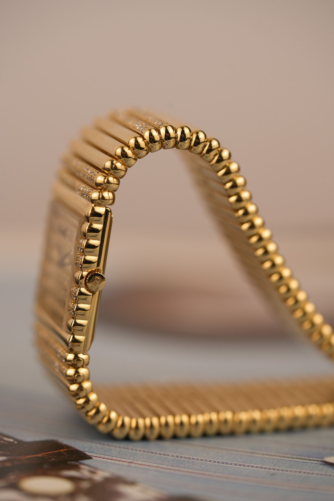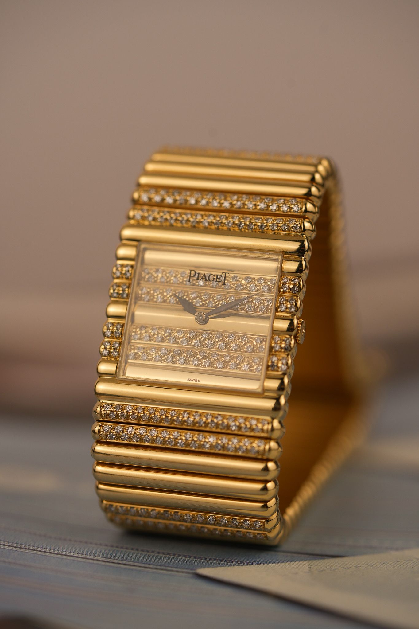 The black hands and black Piaget logo are printed on the crystal itself, floating over the dial like they’re too cool to touch the gold. Under the hood is the manual-wound 9P2 movement, once the thinnest mechanical calibre on the planet. It's discreetly nestled in there, doing the hard work while the diamonds soak up the credit. That’s okay—it’s used to it.