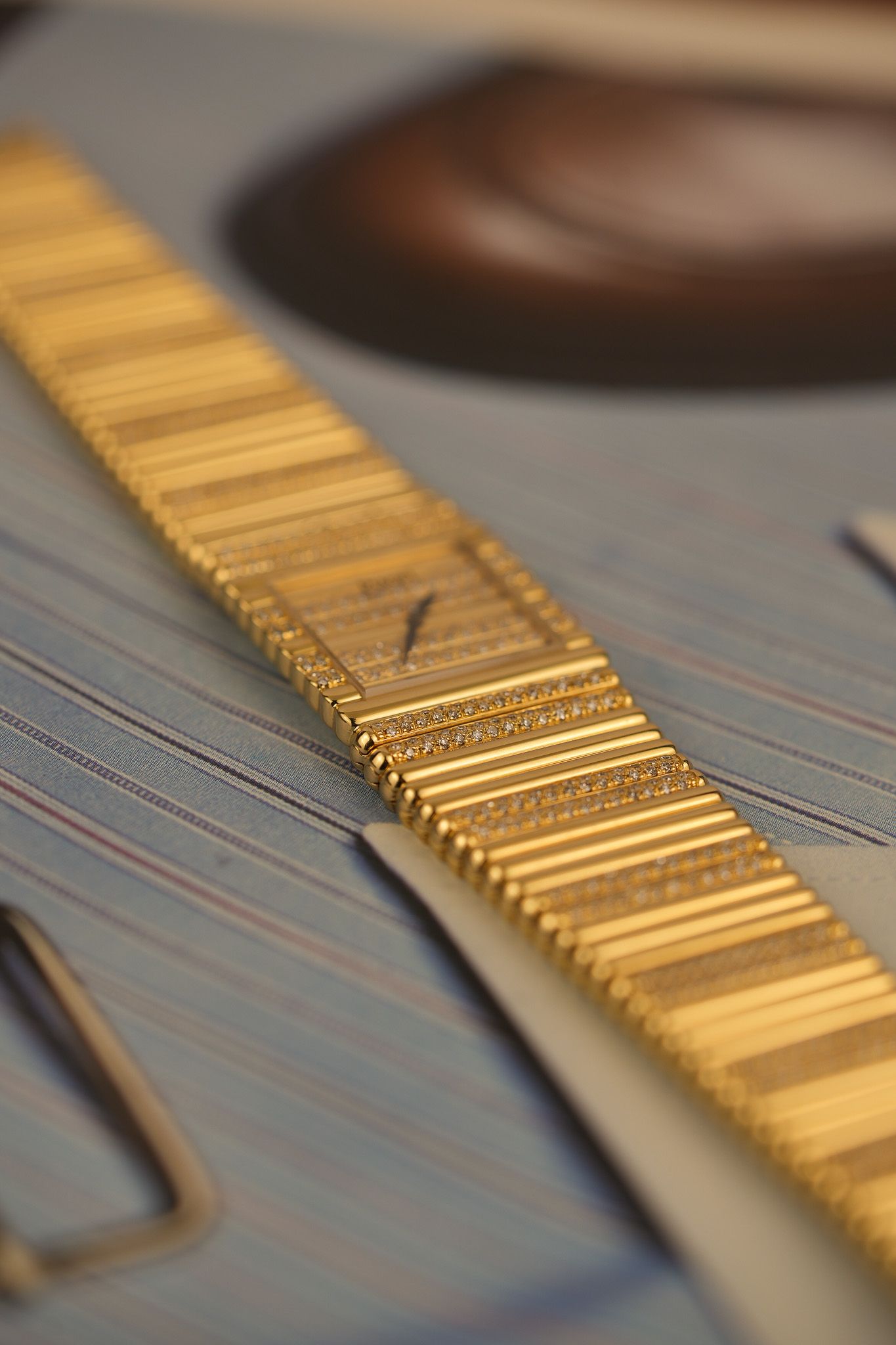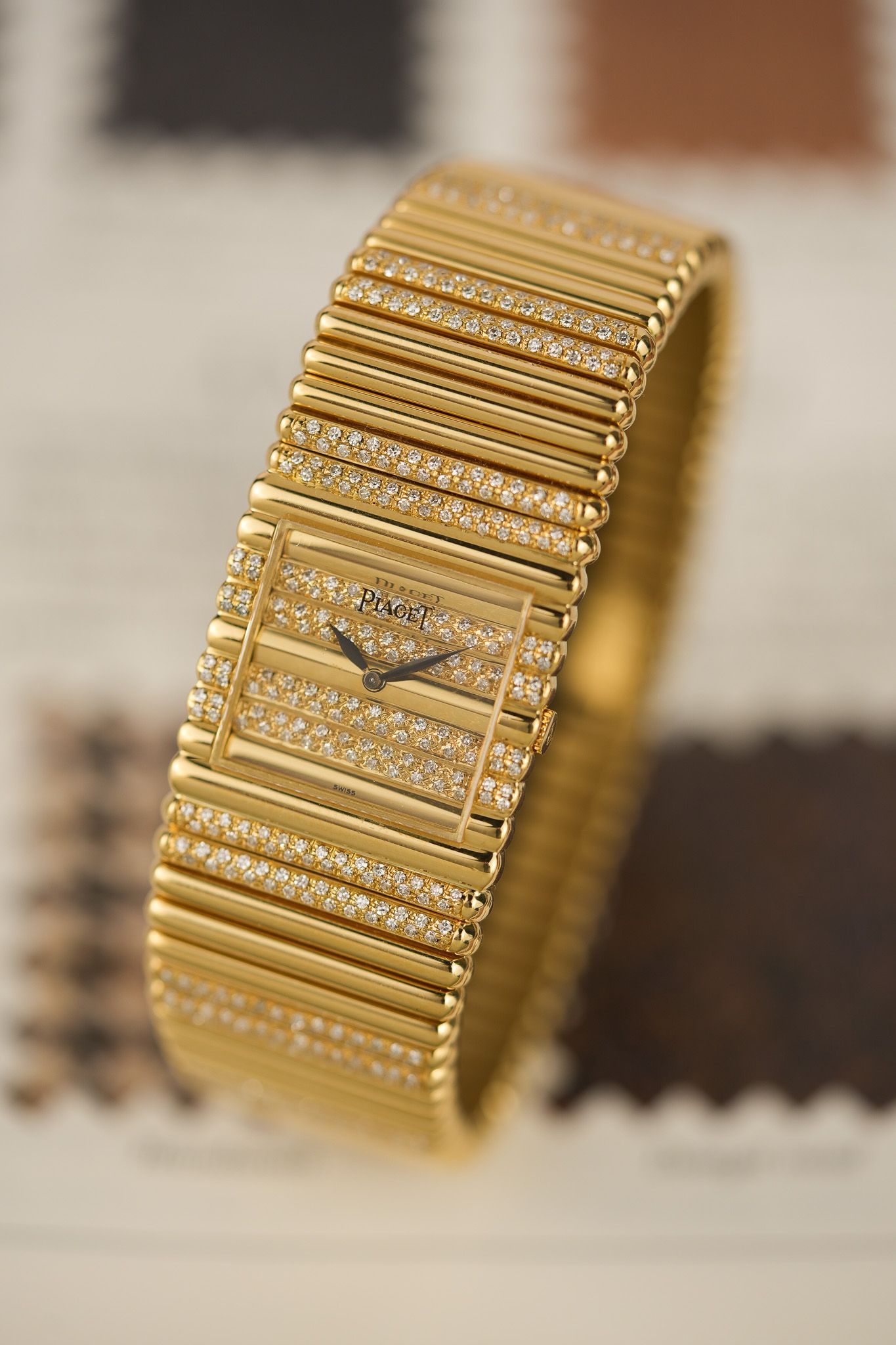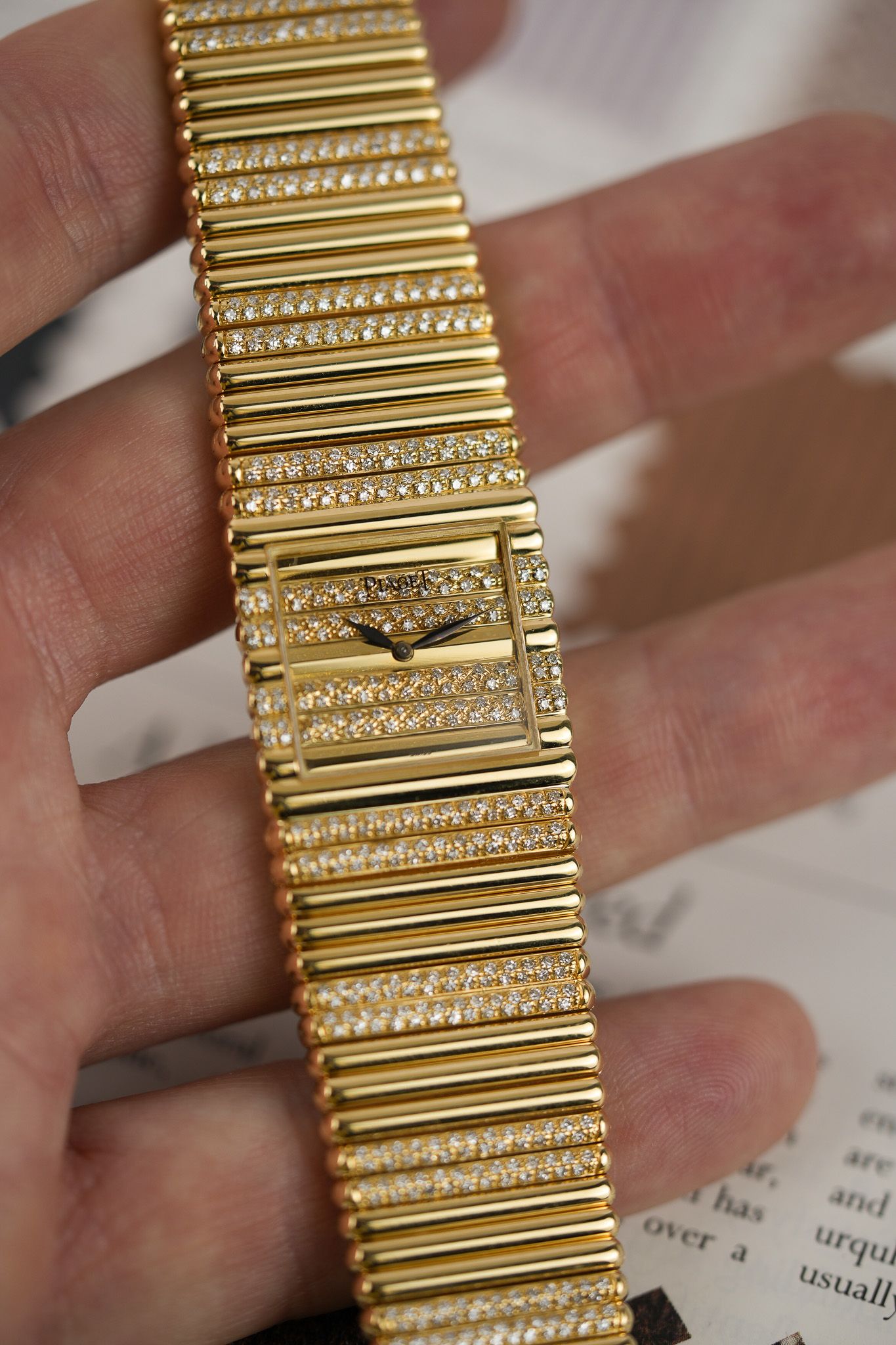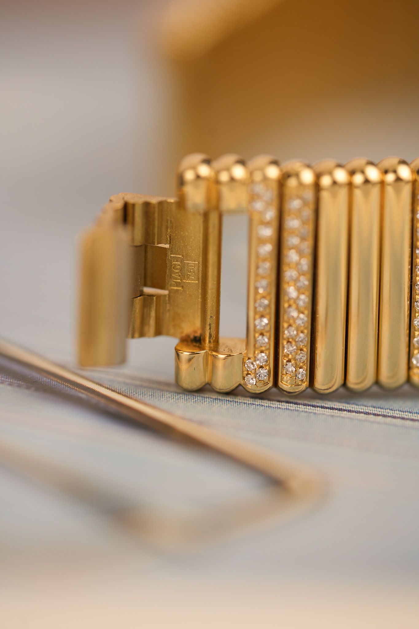 The black hands and black Piaget logo are printed on the crystal itself, floating over the dial like they’re too cool to touch the gold. Under the hood is the manual-wound 9P2 movement, once the thinnest mechanical calibre on the planet. It's discreetly nestled in there, doing the hard work while the diamonds soak up the credit. That’s okay—it’s used to it.