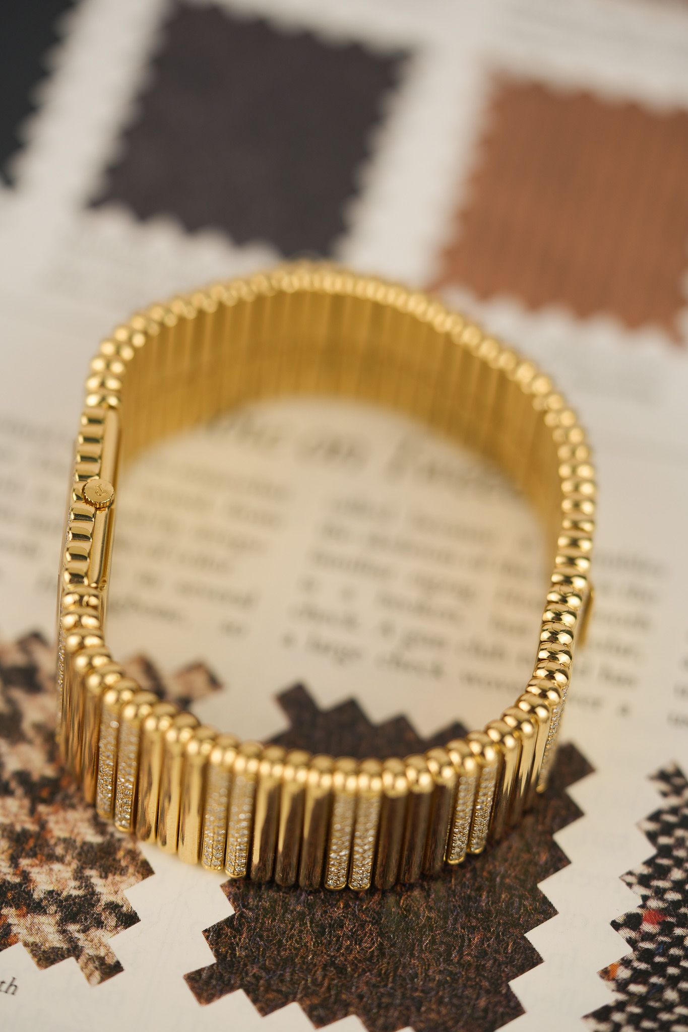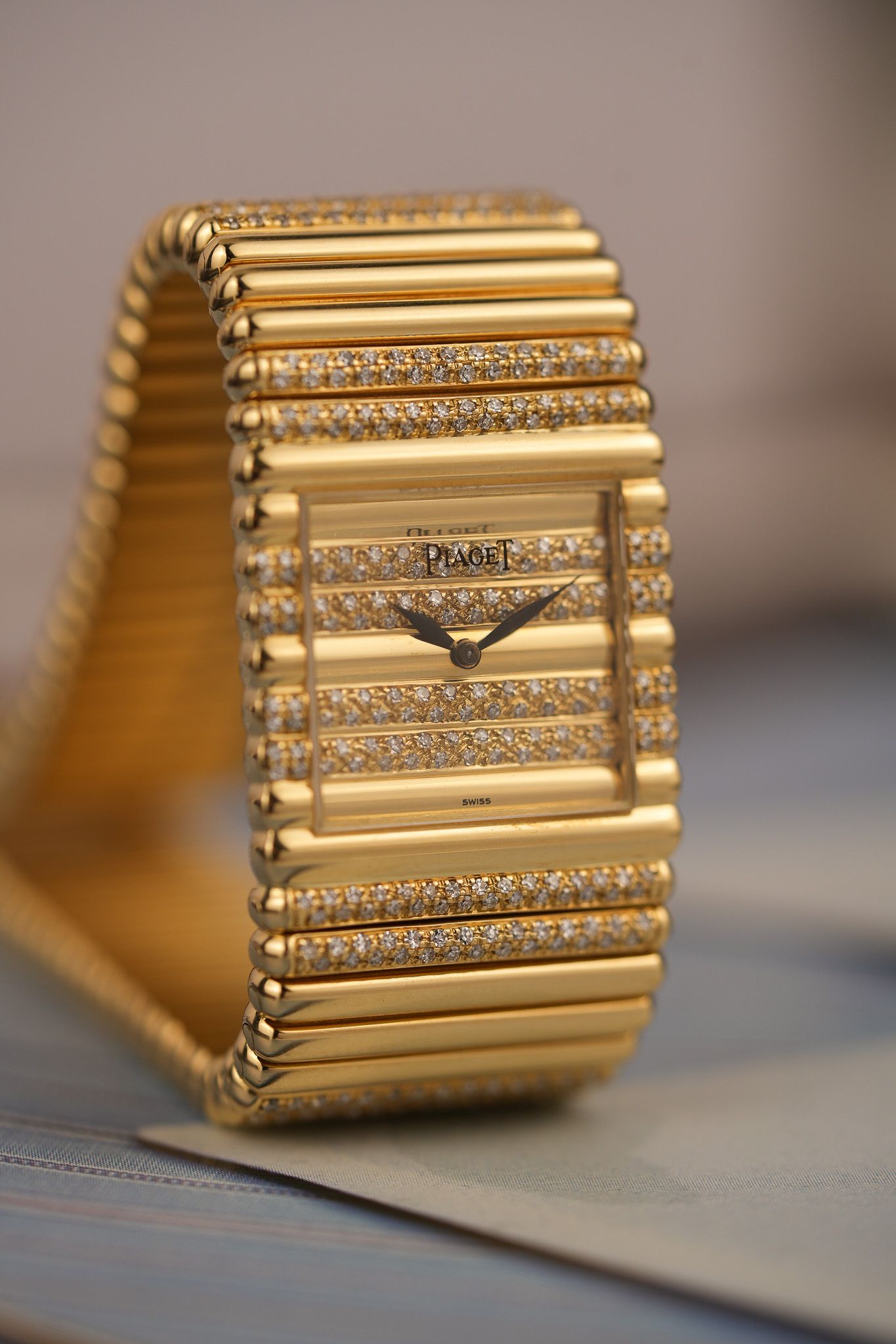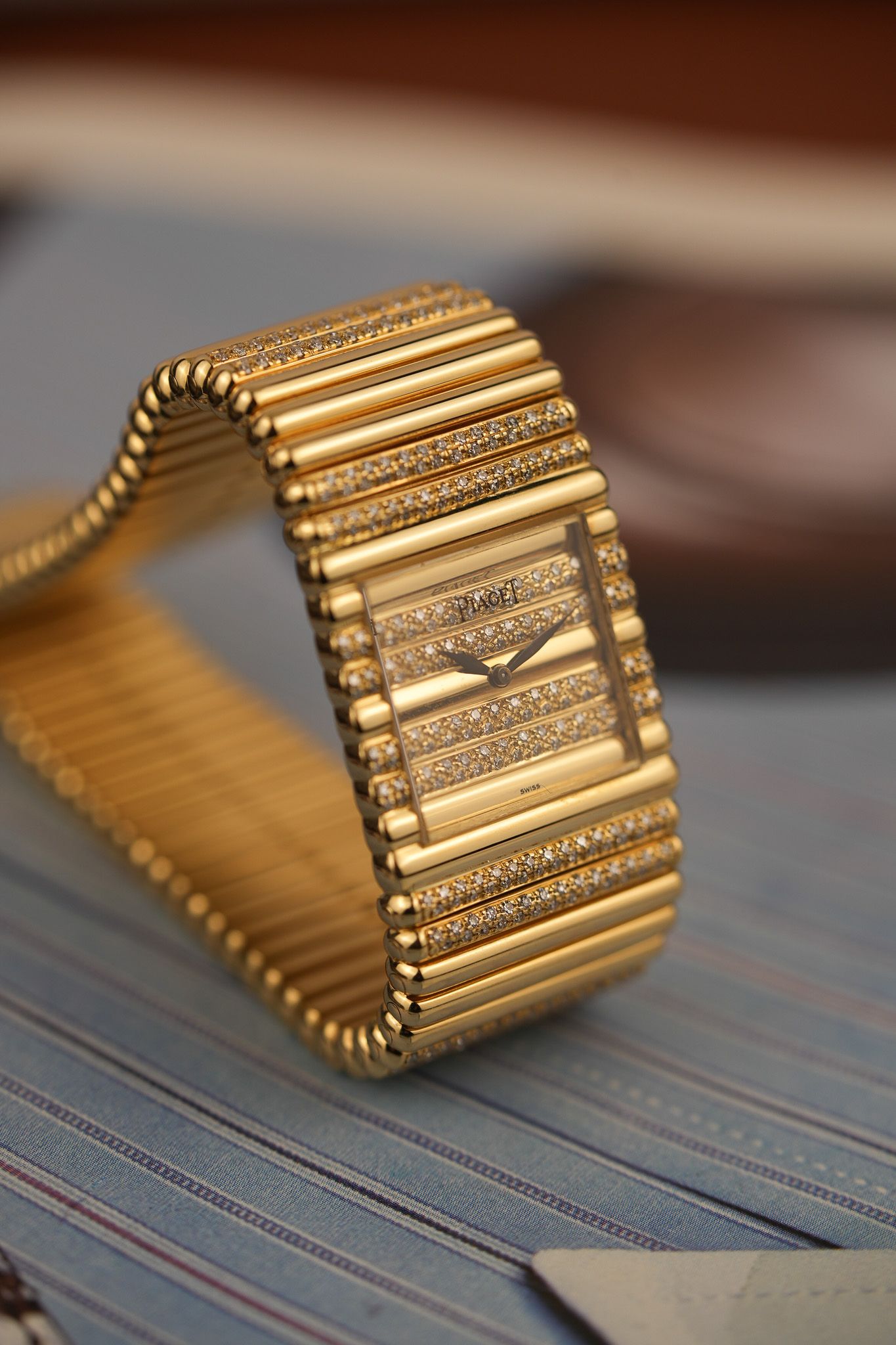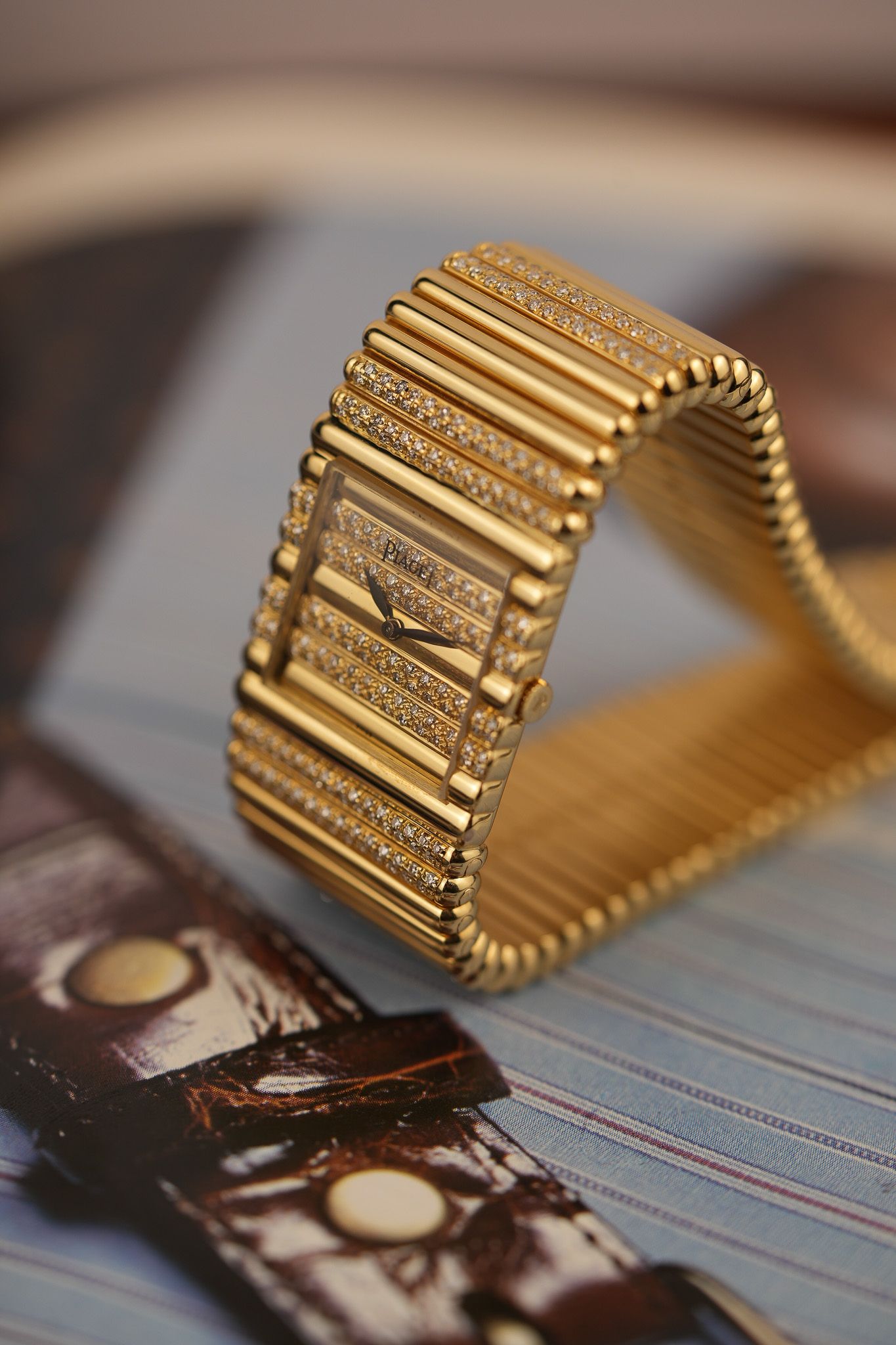 The black hands and black Piaget logo are printed on the crystal itself, floating over the dial like they’re too cool to touch the gold. Under the hood is the manual-wound 9P2 movement, once the thinnest mechanical calibre on the planet. It's discreetly nestled in there, doing the hard work while the diamonds soak up the credit. That’s okay—it’s used to it.