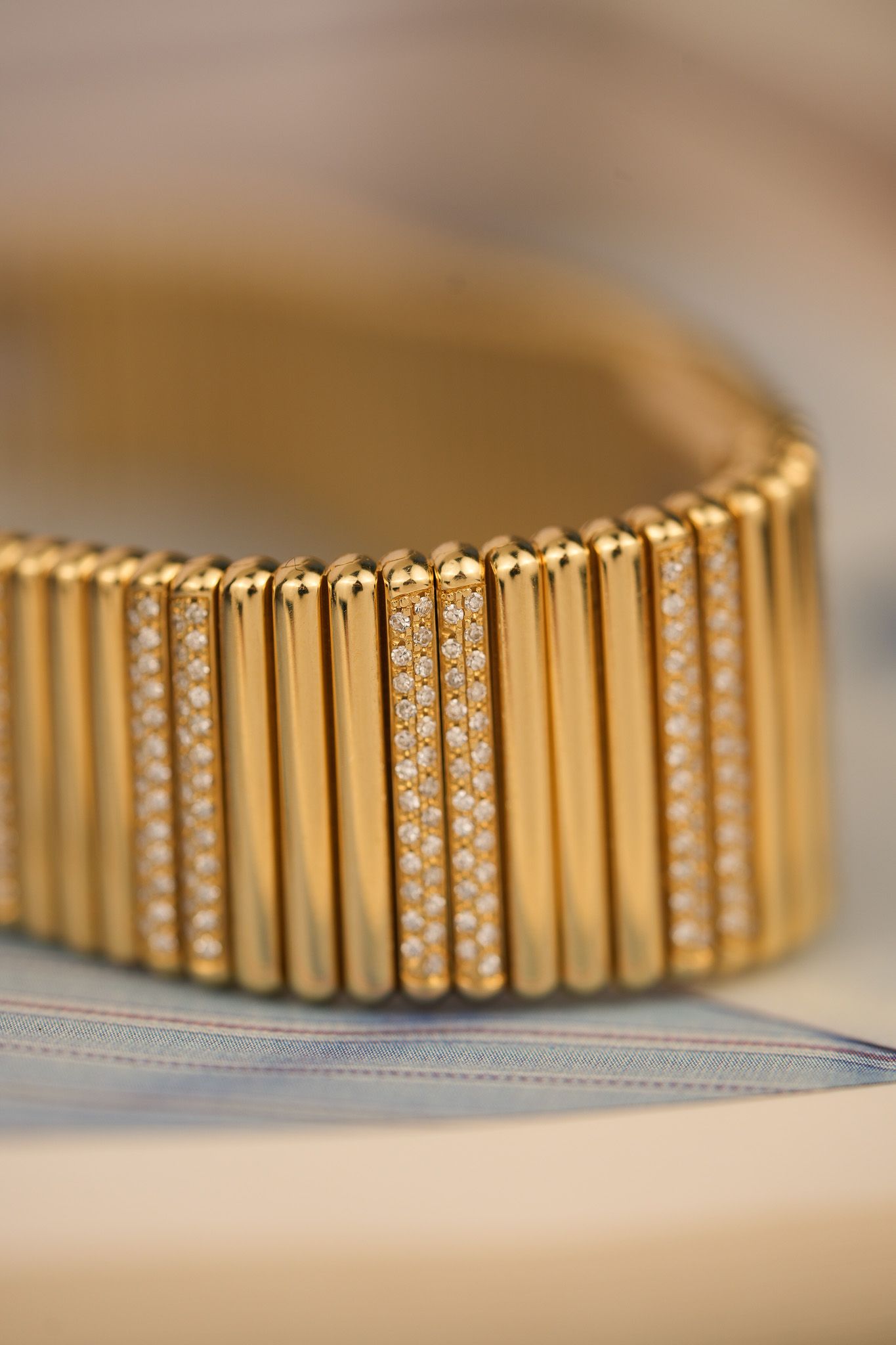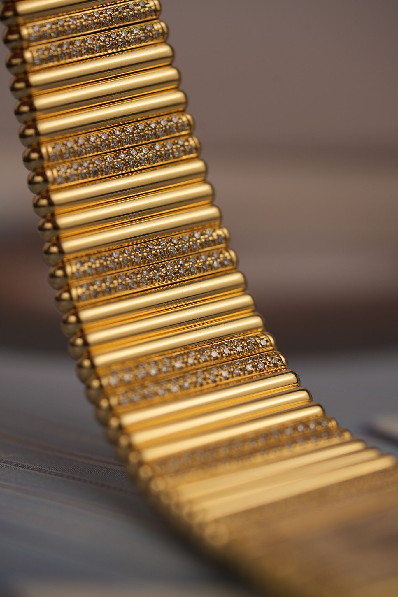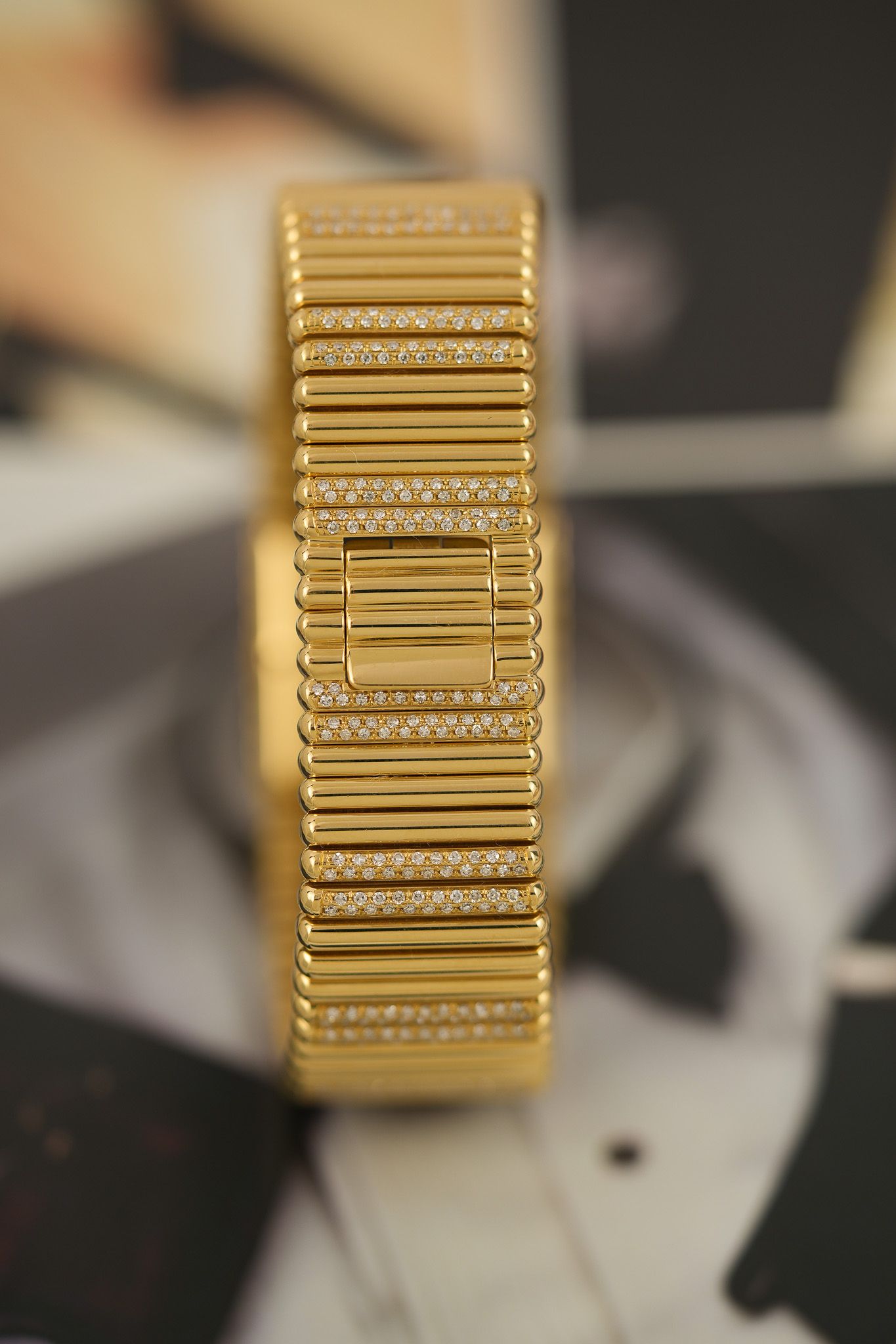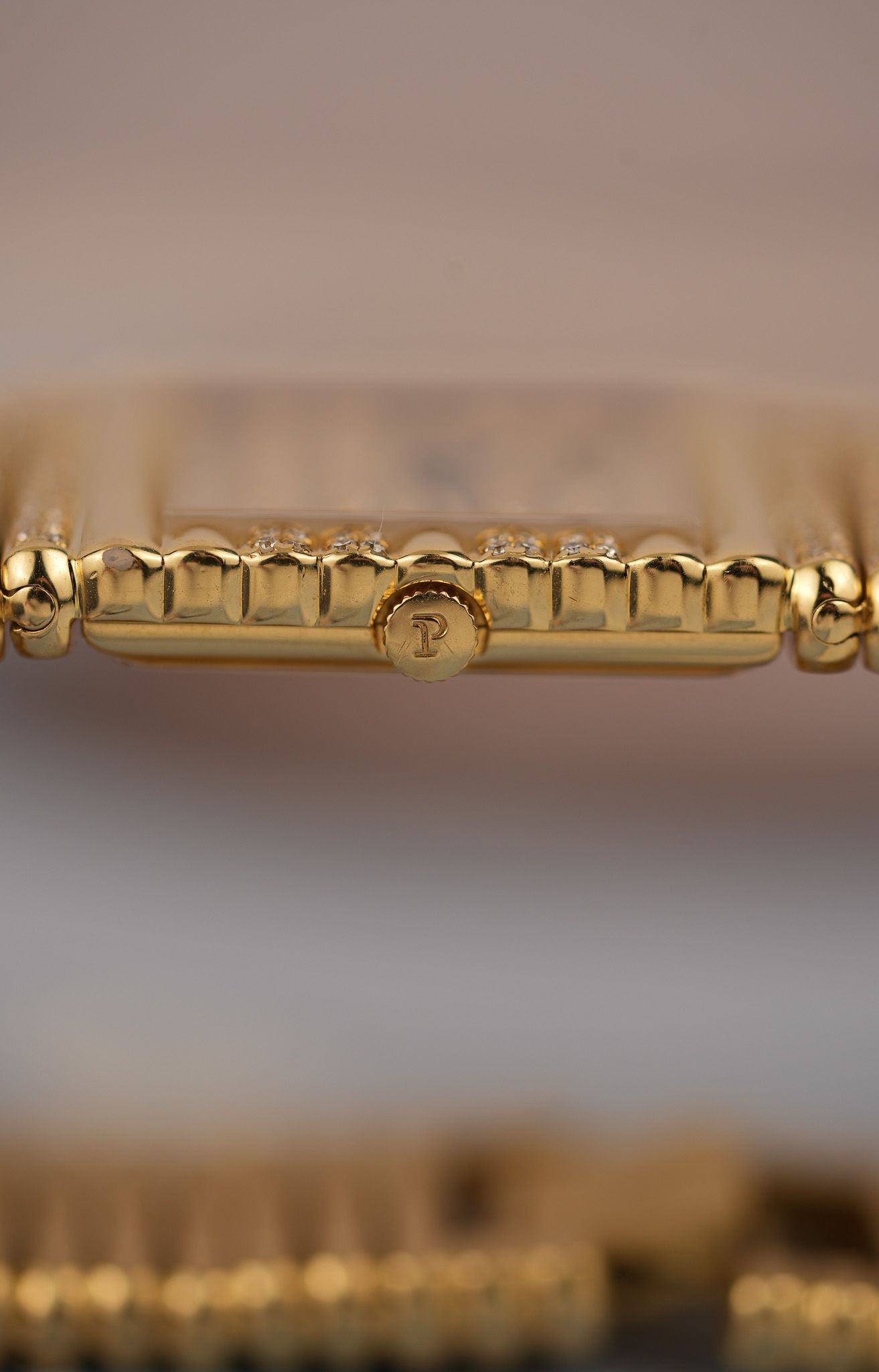 The black hands and black Piaget logo are printed on the crystal itself, floating over the dial like they’re too cool to touch the gold. Under the hood is the manual-wound 9P2 movement, once the thinnest mechanical calibre on the planet. It's discreetly nestled in there, doing the hard work while the diamonds soak up the credit. That’s okay—it’s used to it.