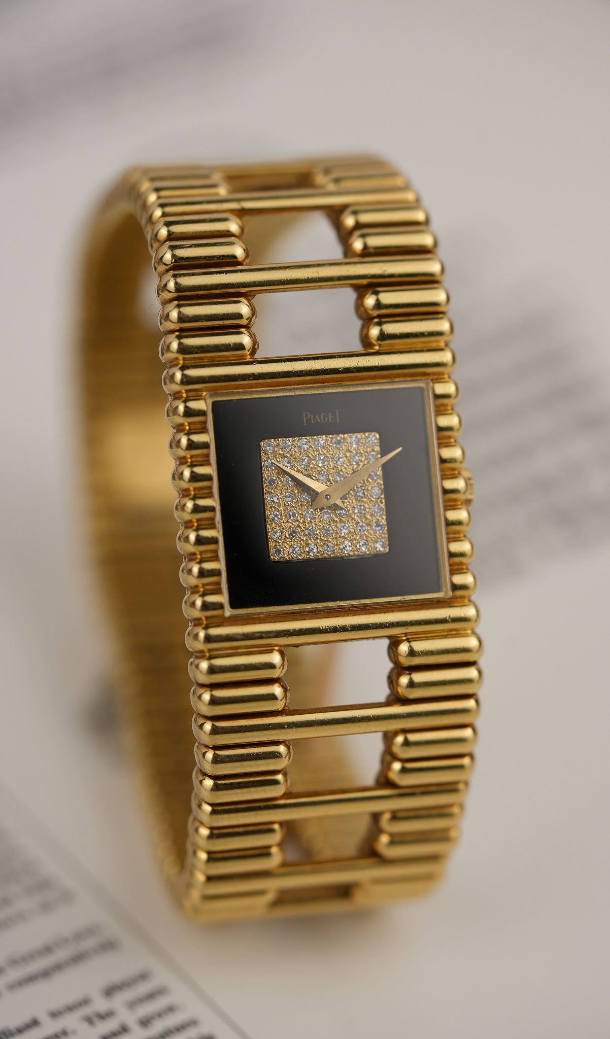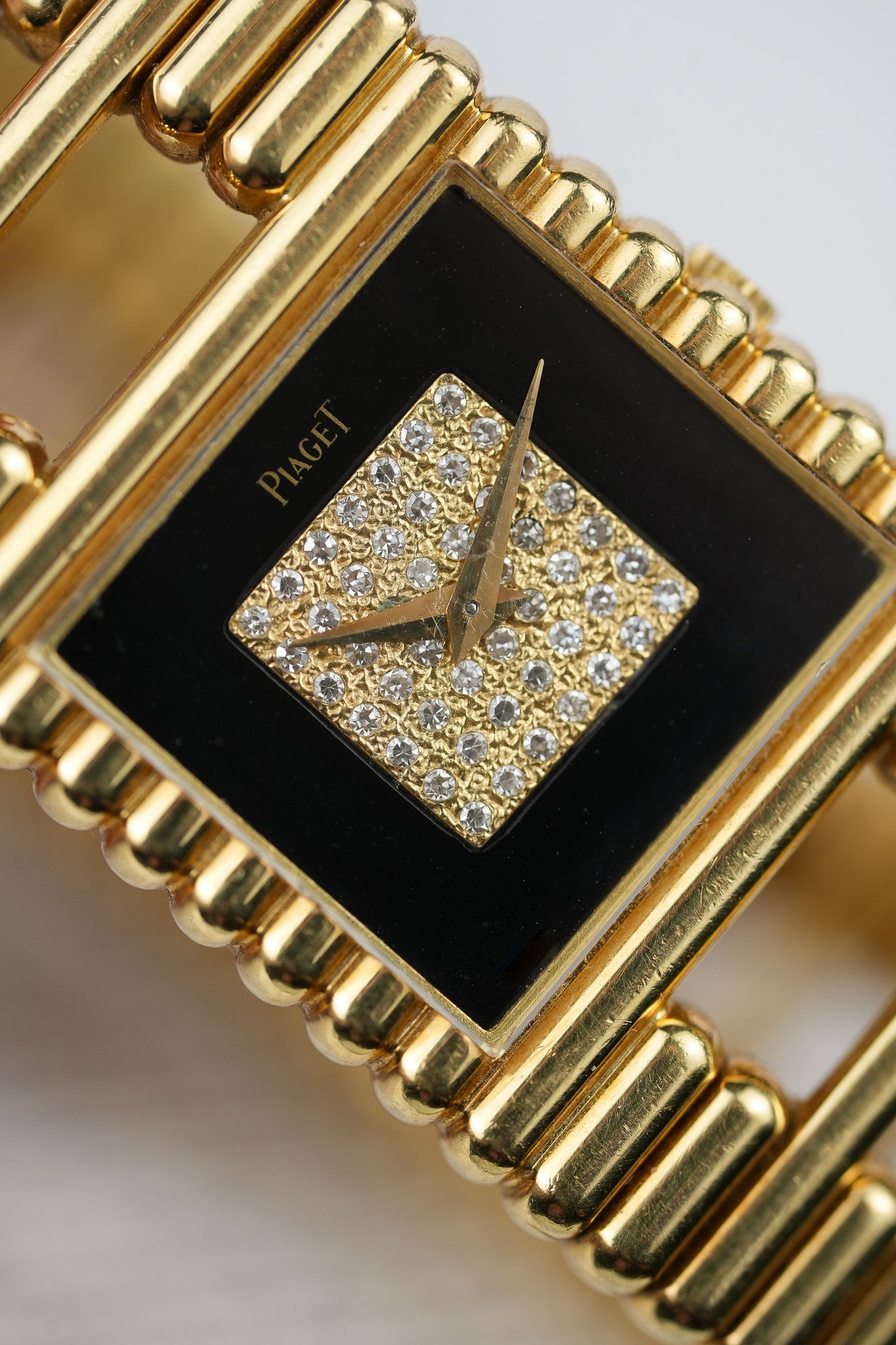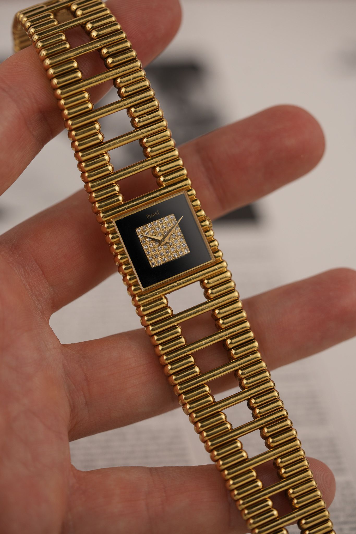 Powering it all is the manual-wound 9P2, a razor-thin movement descended from Piaget’s legendary 9P caliber. It’s tucked discreetly behind that diamond window, housed within a 25mm wide case that still manages to feel like an exclamation mark on the wrist. The bracelet is sized generously for a 7.2-inch fit, offering that rare full-gold presence without compromise.