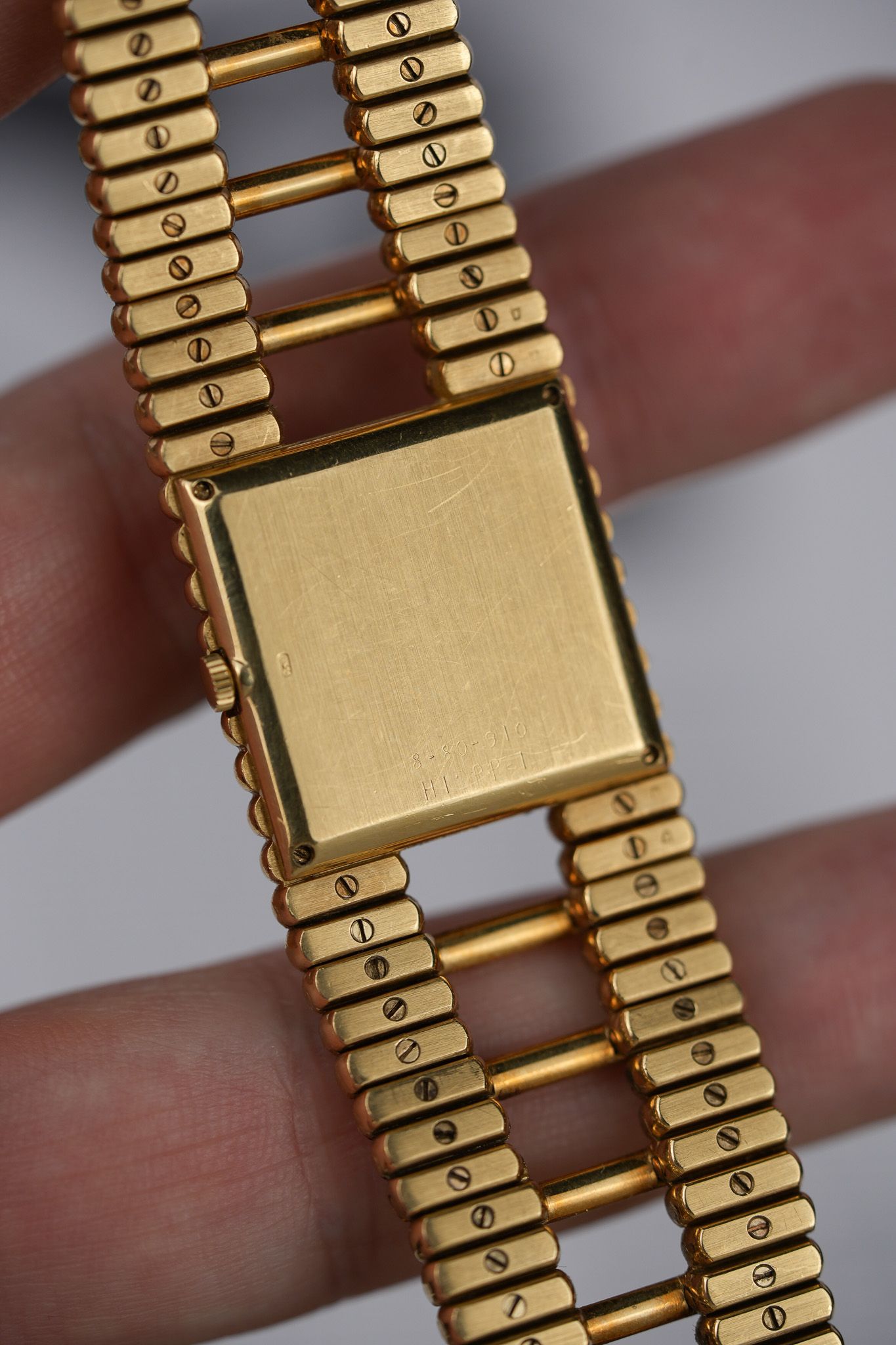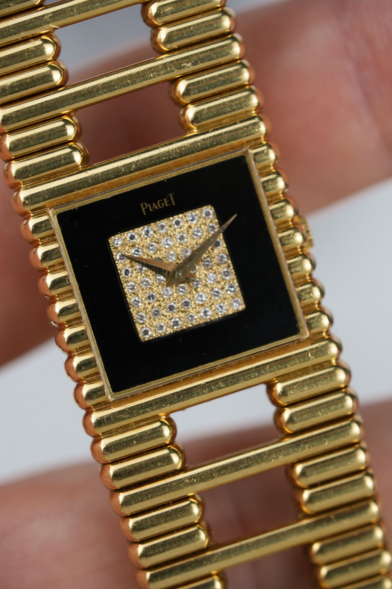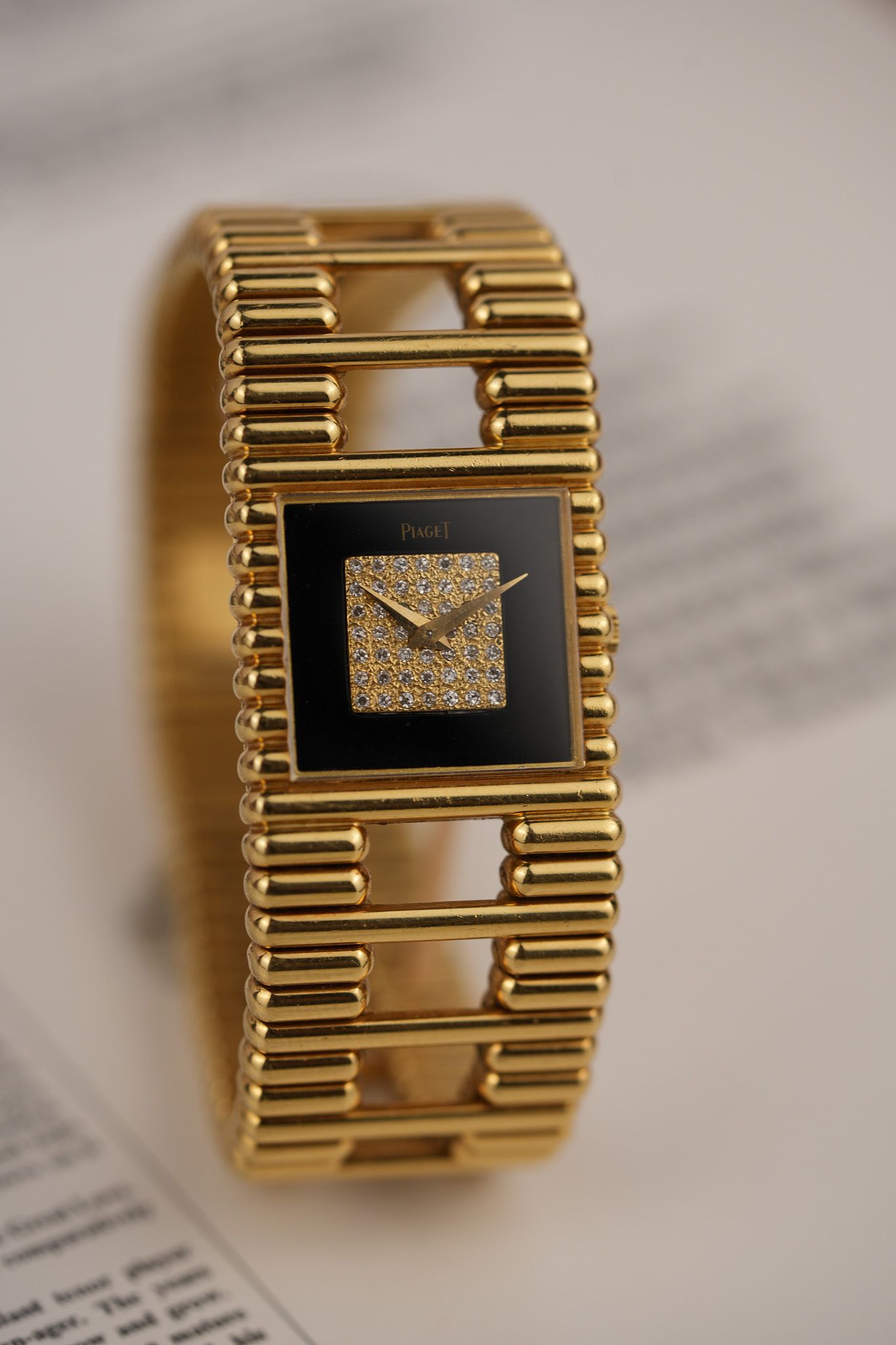 Powering it all is the manual-wound 9P2, a razor-thin movement descended from Piaget’s legendary 9P caliber. It’s tucked discreetly behind that diamond window, housed within a 25mm wide case that still manages to feel like an exclamation mark on the wrist. The bracelet is sized generously for a 7.2-inch fit, offering that rare full-gold presence without compromise.