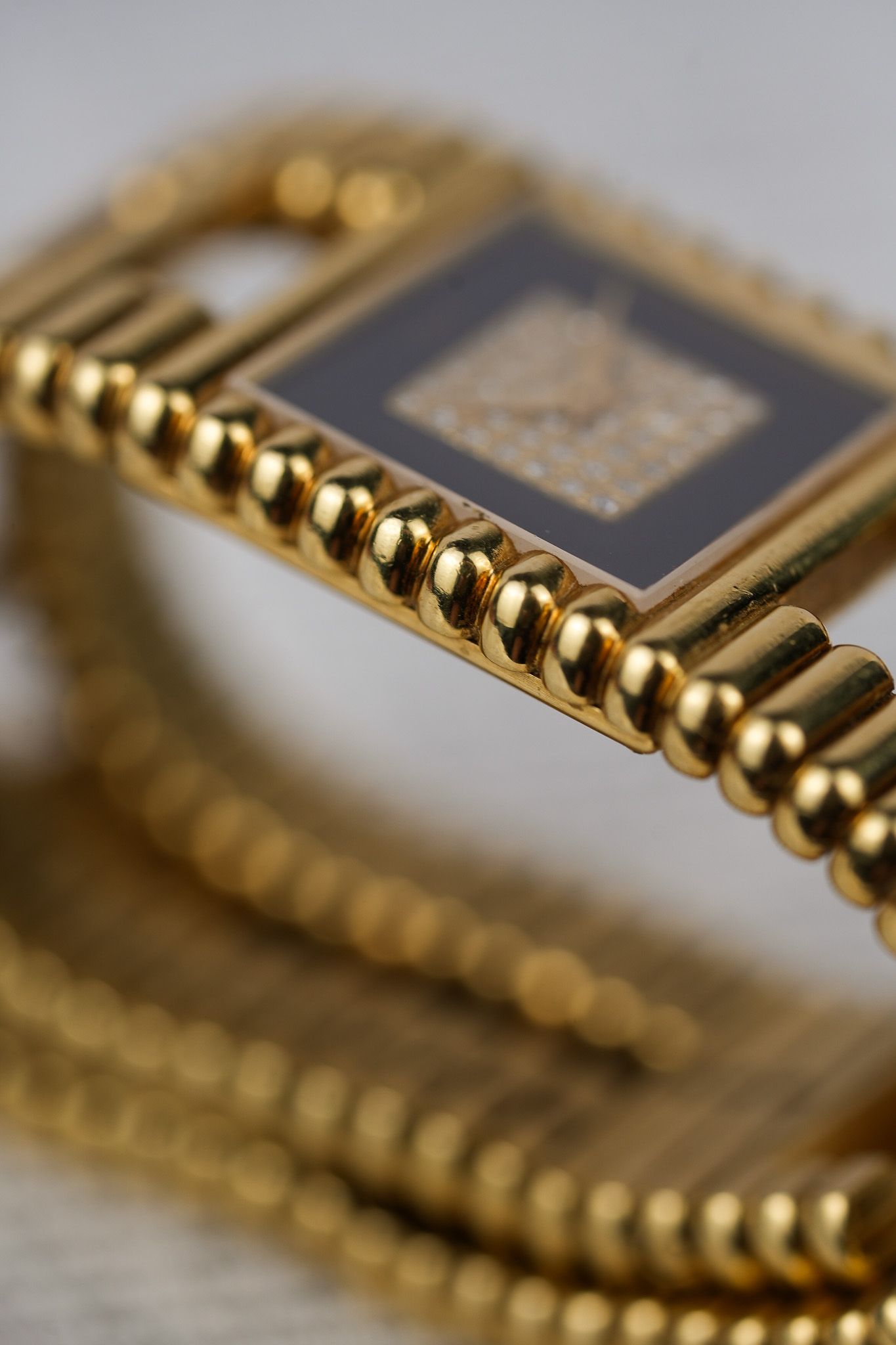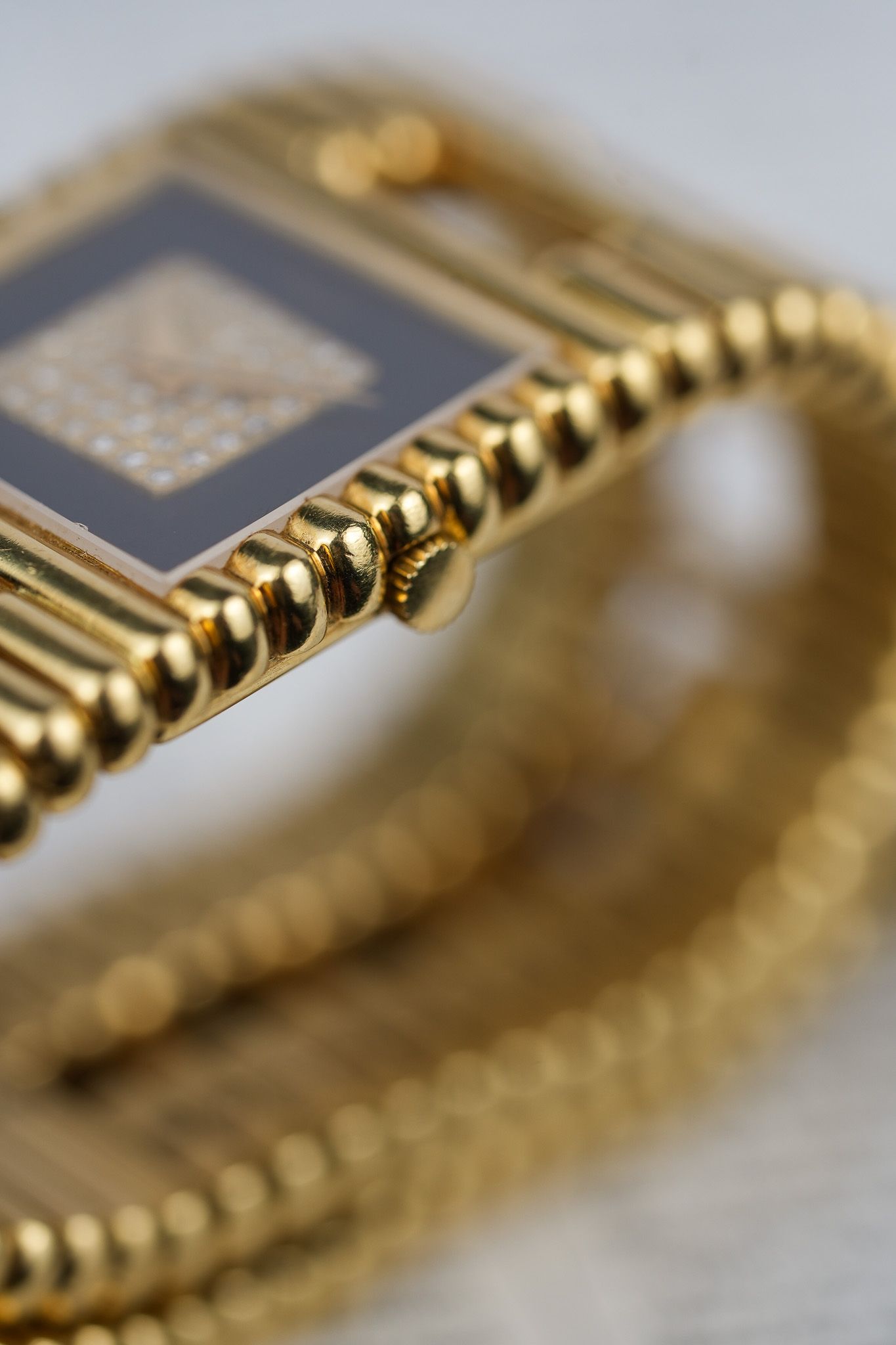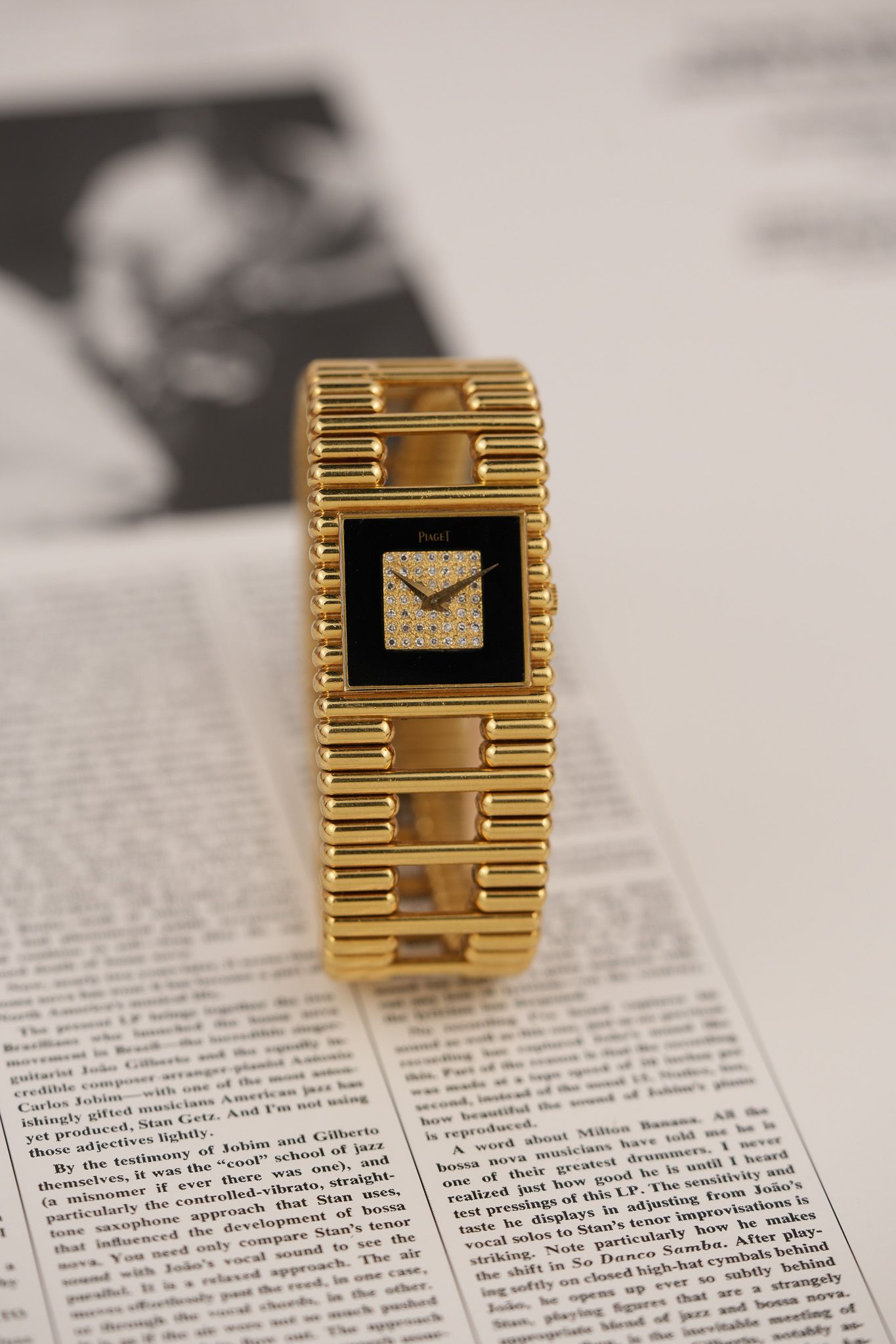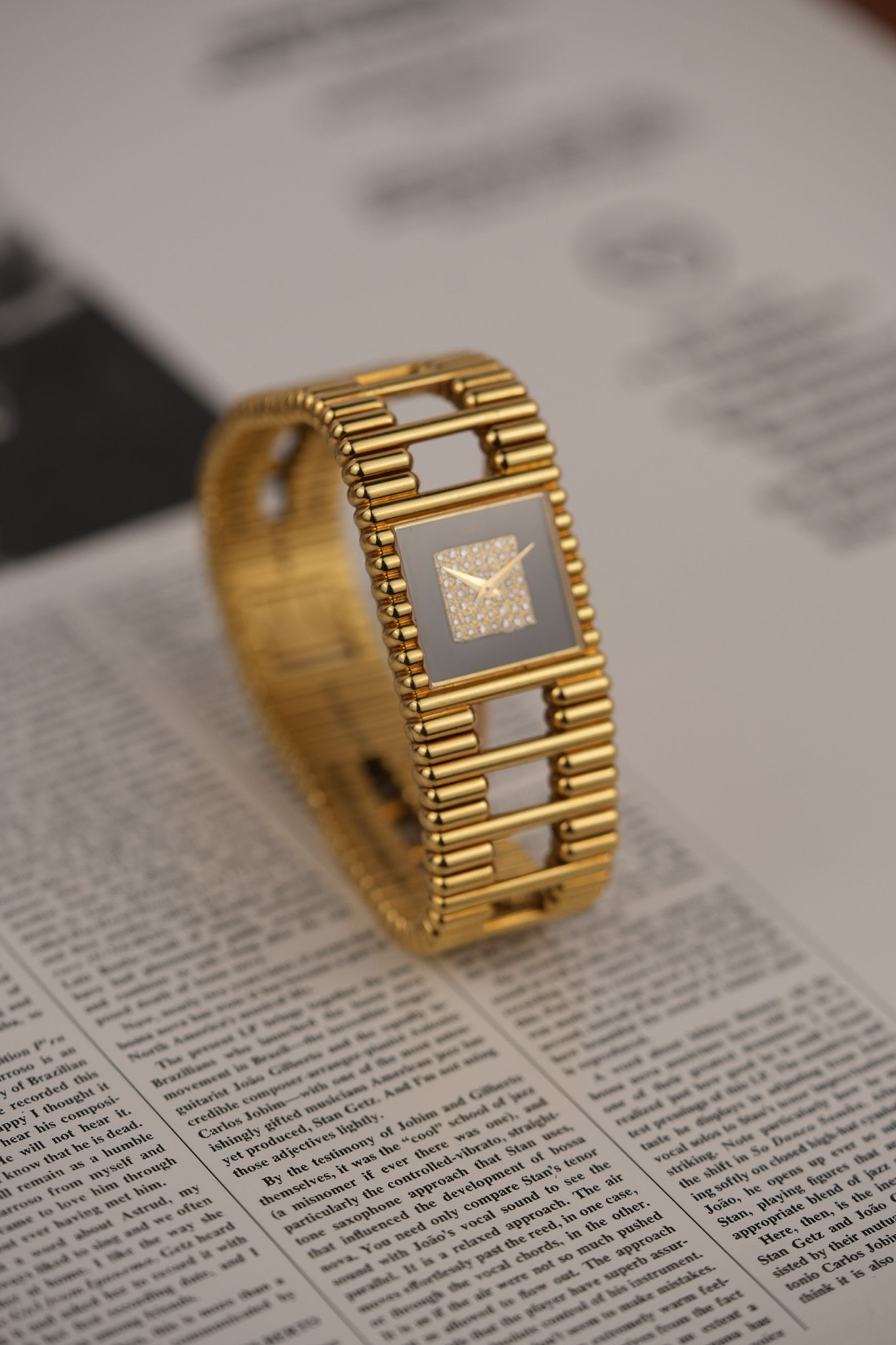 At the center, Piaget places a square dial within a square dial. A seamless expanse of black onyx—crack-free, solid, and impossibly cut—frames a pavé of diamonds set into a sunken core. Here lies the real feat: most gem-set stone dials with cut-outs are built in segments, but Piaget chose the harder route—carving out the center of a single slab of onyx to nestle that diamond field inside. No glue lines. No seams. Just precision and confidence.