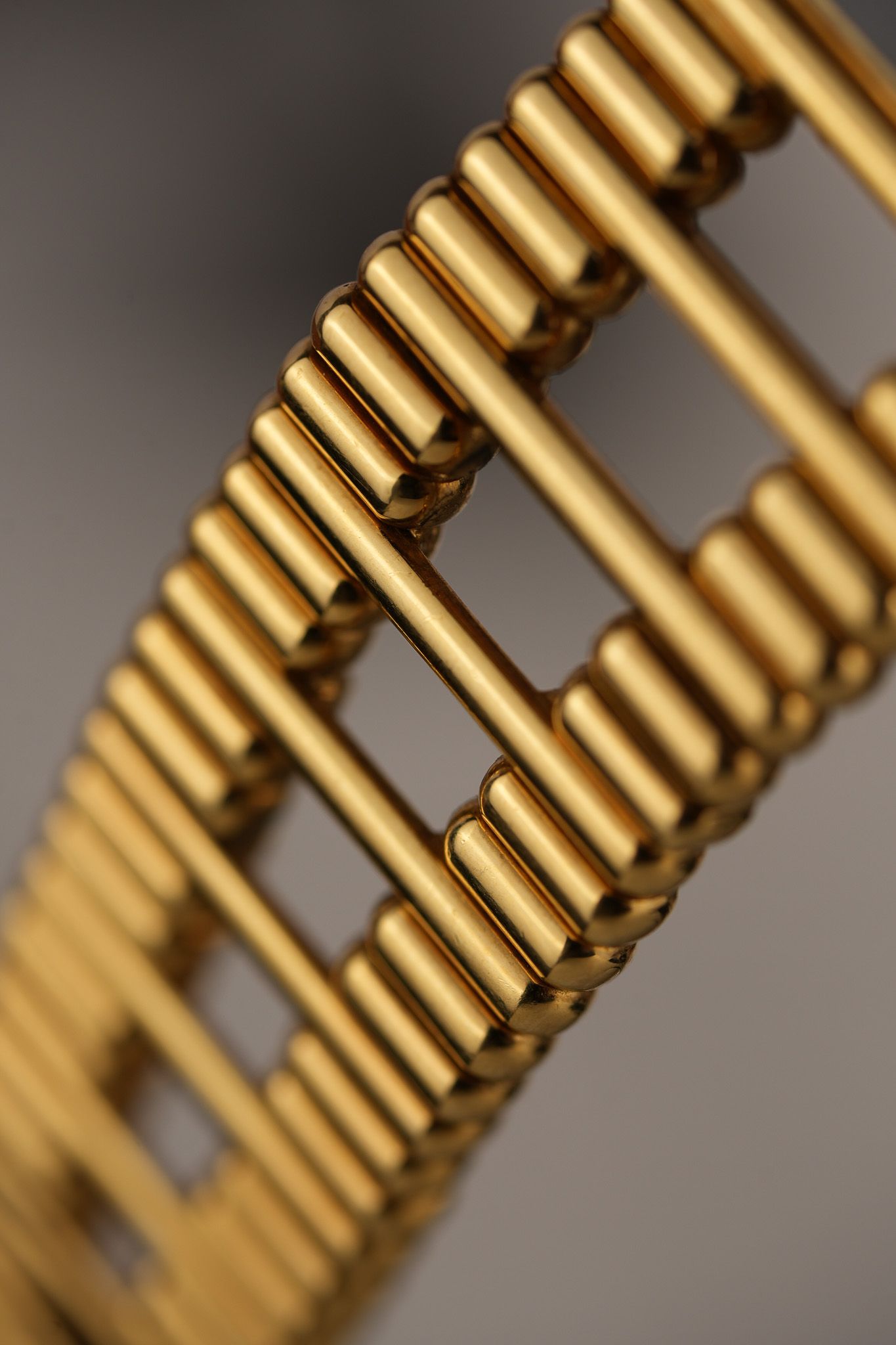 But weight alone doesn’t make a masterpiece. What sets this piece apart is its sheer architectural ingenuity. The bracelet, often relegated to afterthought status in most watches, is elevated here to the realm of sculpture. Each link—slender, rounded, and precisely spaced—is individually screwed and removable. The design mimics a golden ladder, but one that tapers ever so subtly, as though it were sculpted by wind rather than tools. You don’t wear it. It drapes, it grips, it moves—with fluid geometry and princely authority.