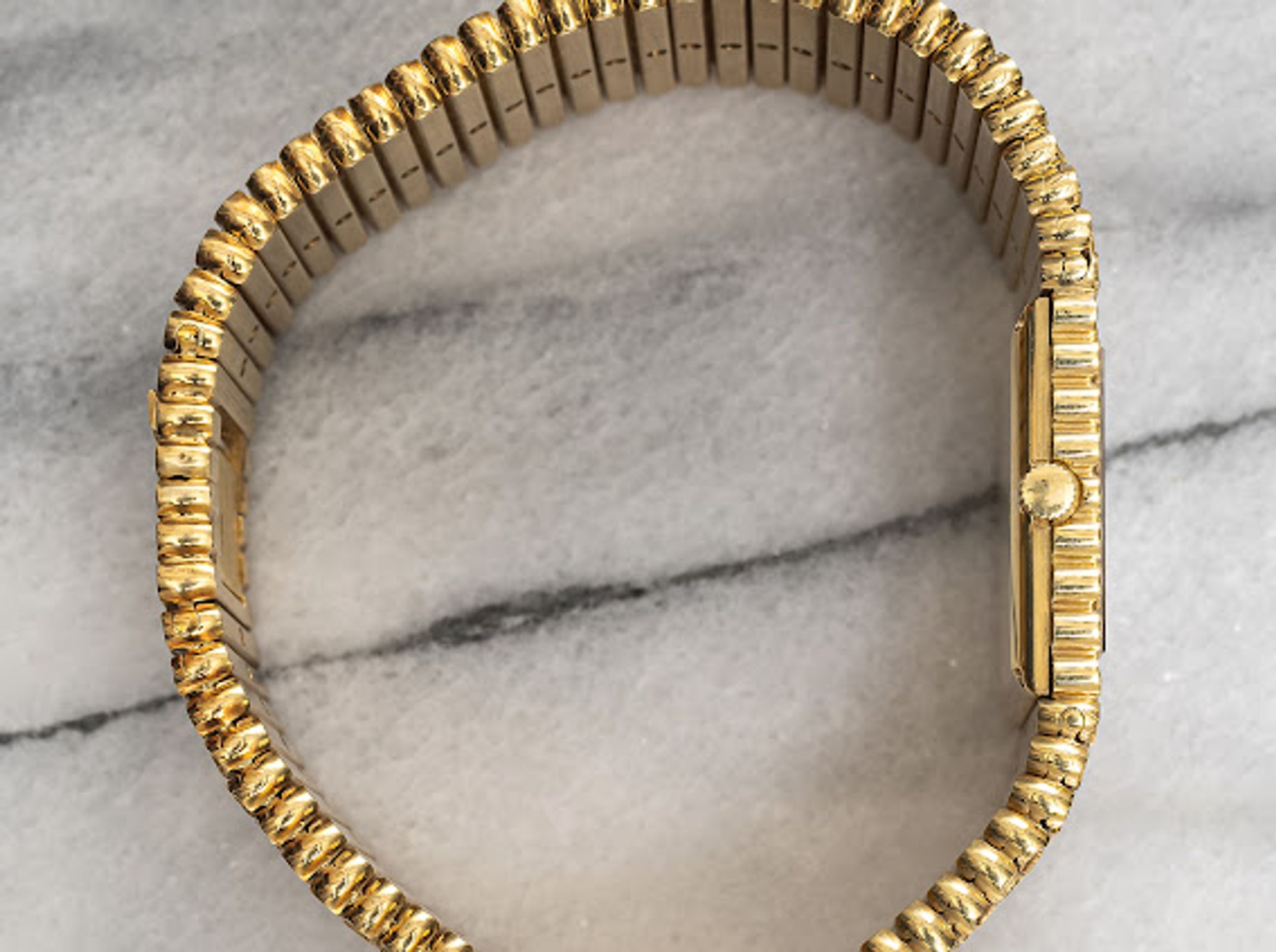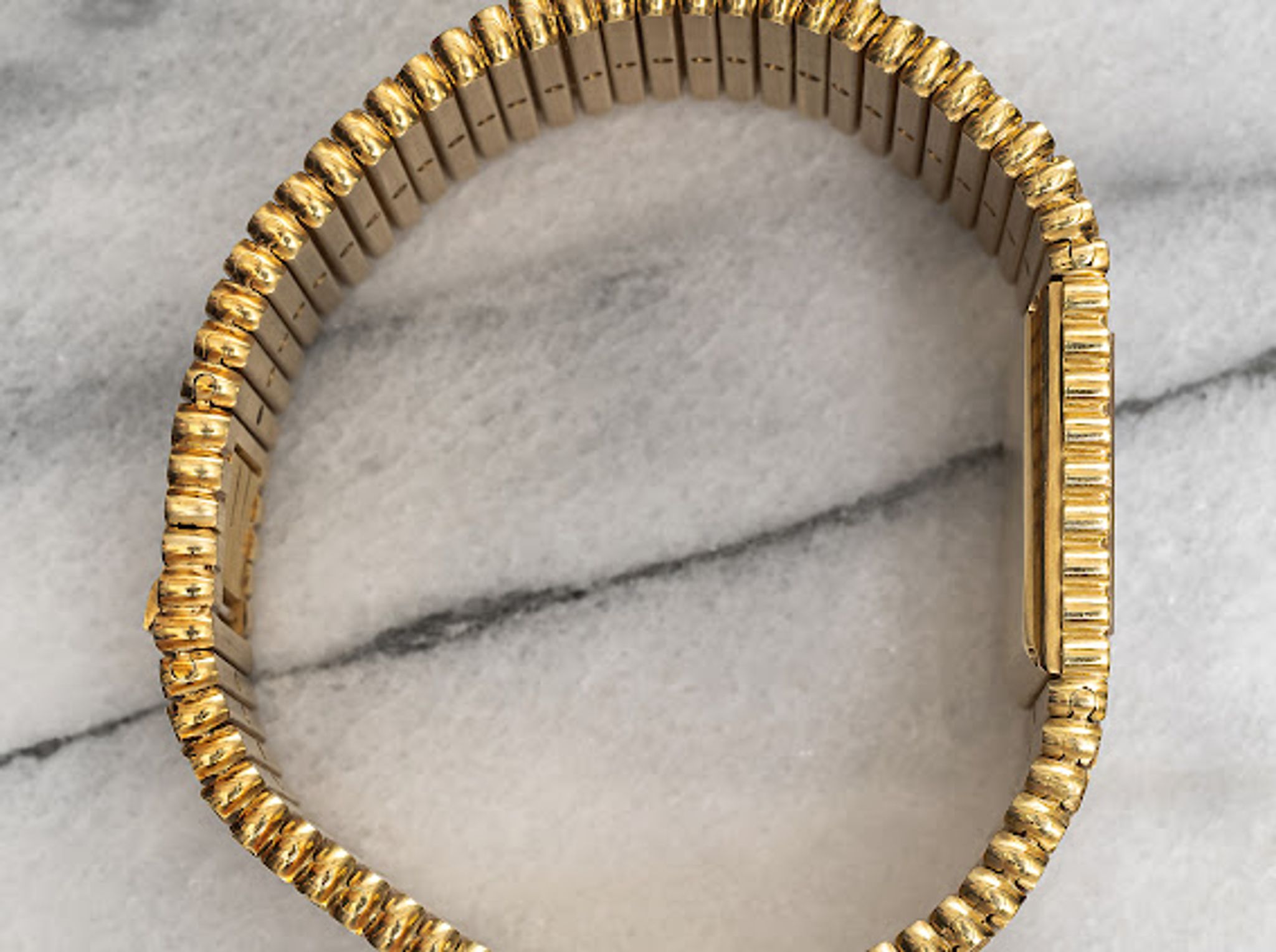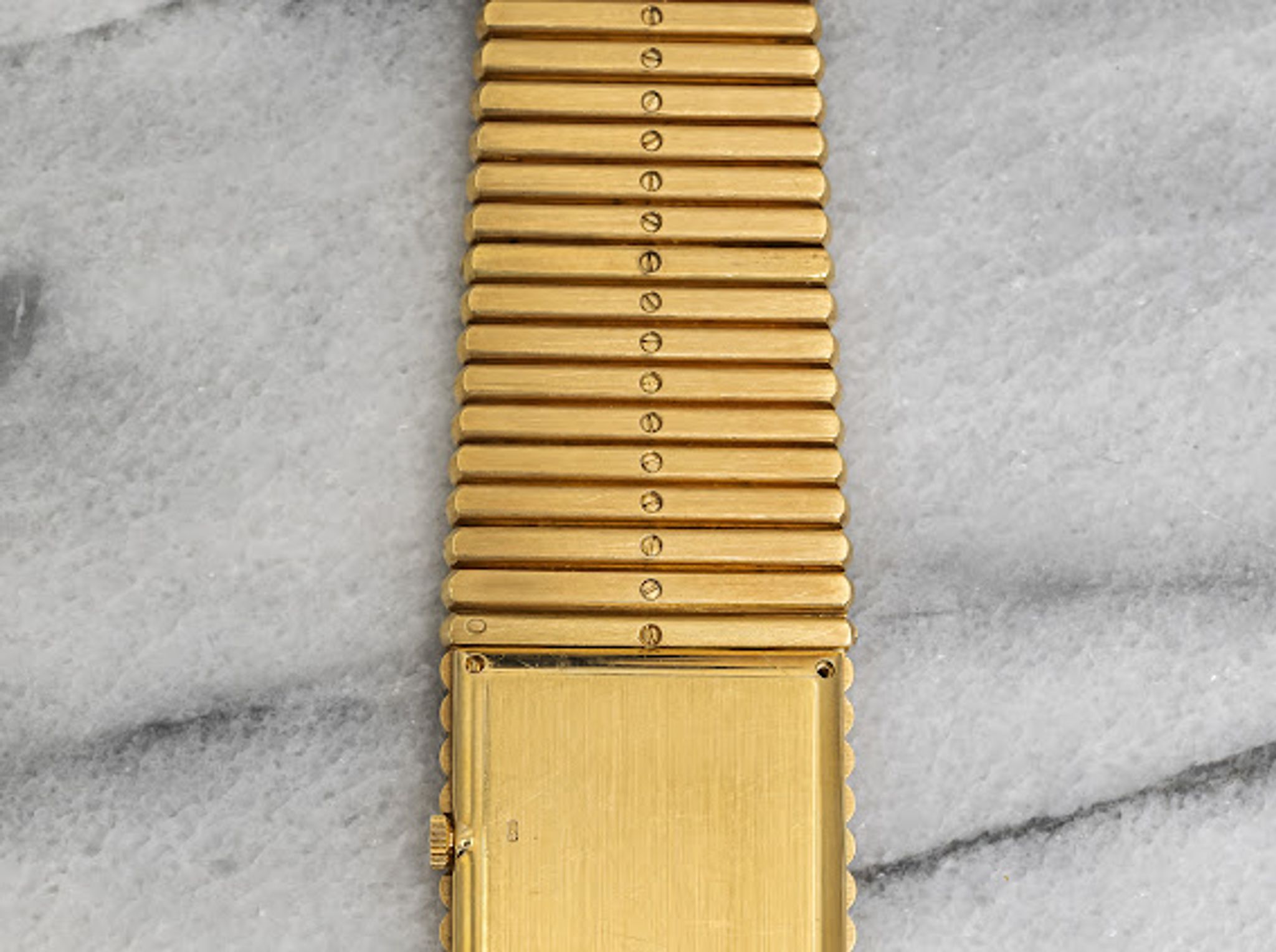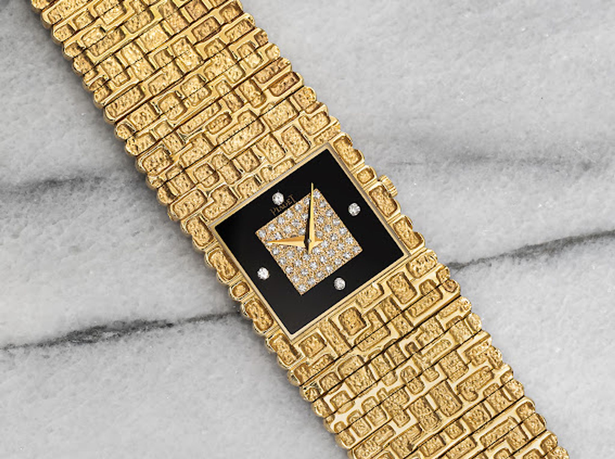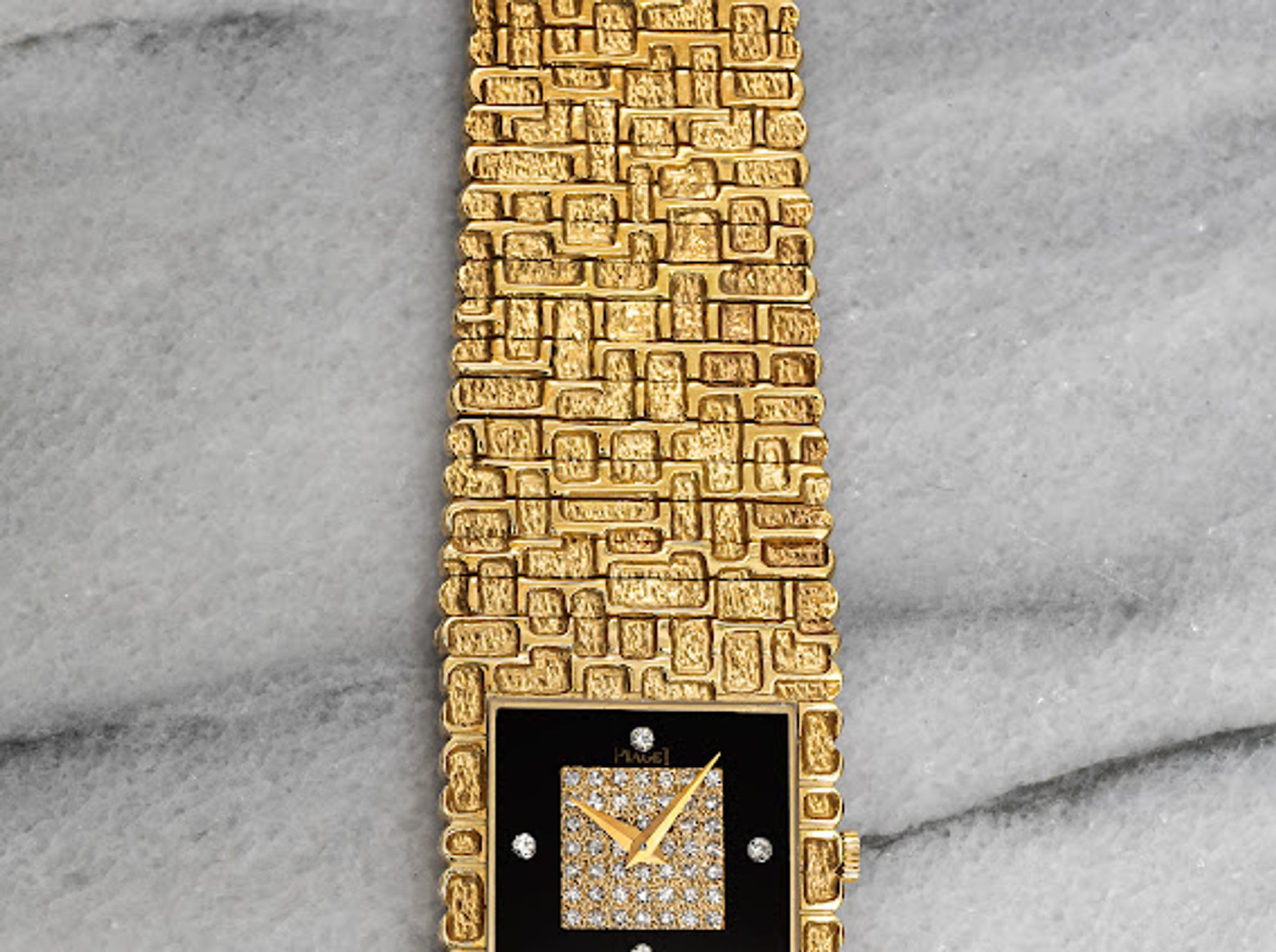 Here's a vintage Piaget in 18K yellow gold with a clean black onyx and diamond pave dial manual wind from the 1980s. Keeps great time and is fully functional. Measurements include a 25mm size across and the bracelet fits up to a 7 inch wrist. Gold dauphine hands. Both the dial and crystal are free from any scratches or marks. 18k yellow gold case and caseback. It weighs 177.2 grams! The piece is quite heavy. Unique finishing on the bezel and bracelet. All the parts are original including the crown, dial, movement, and caseback. Both the dial and case are in great cosmetic, untouched condition.