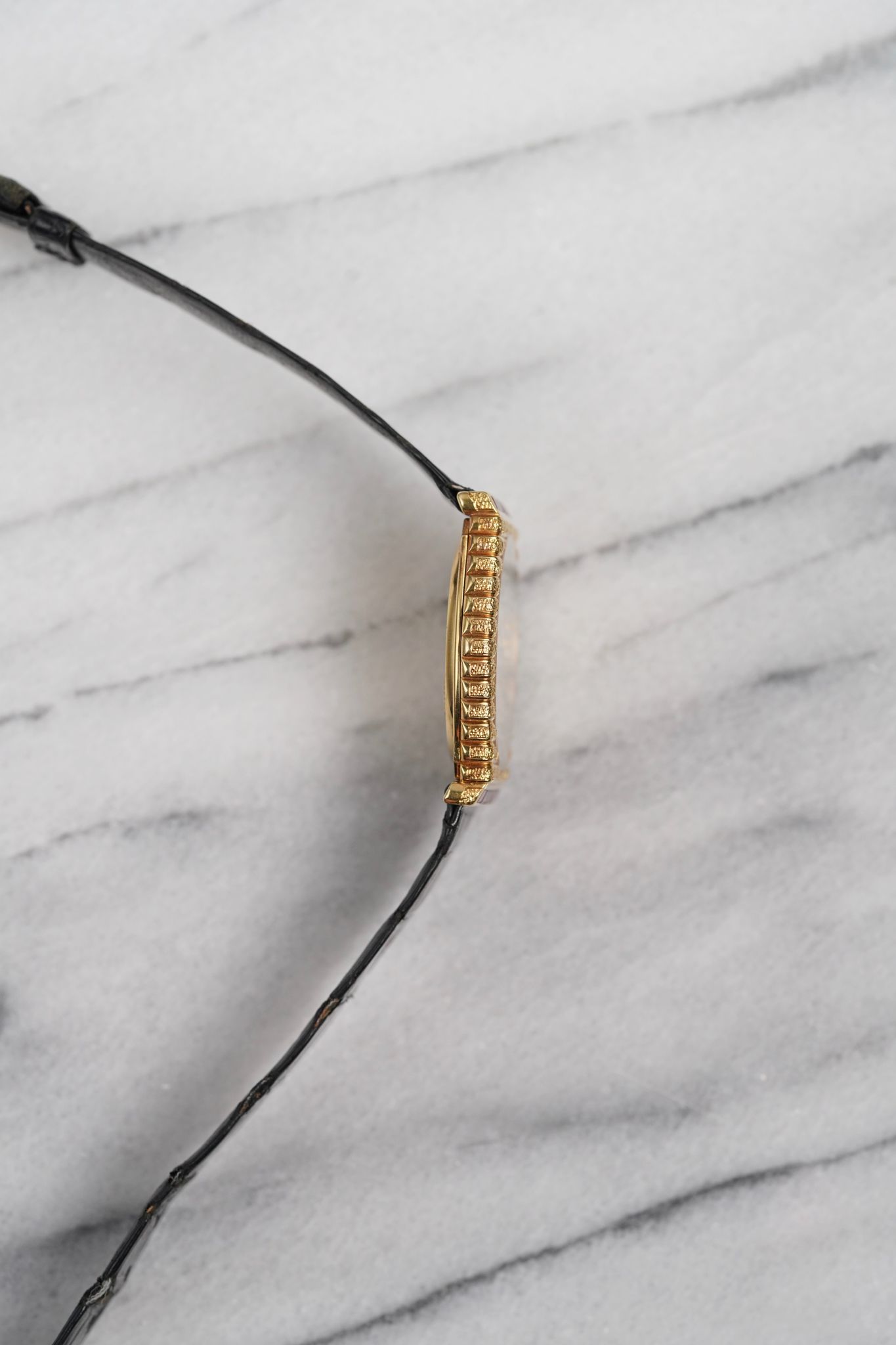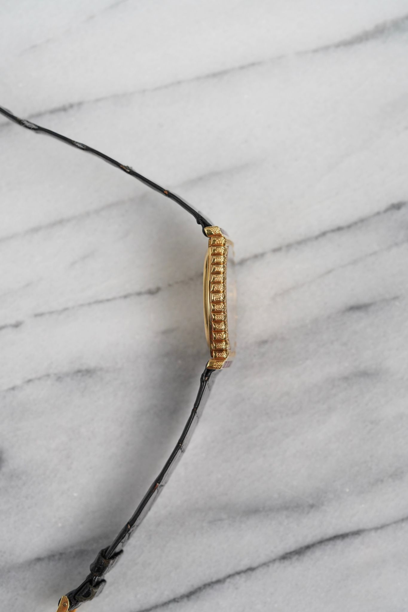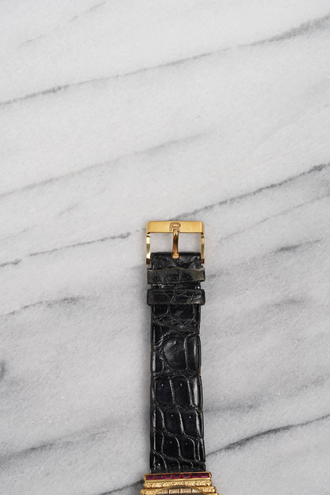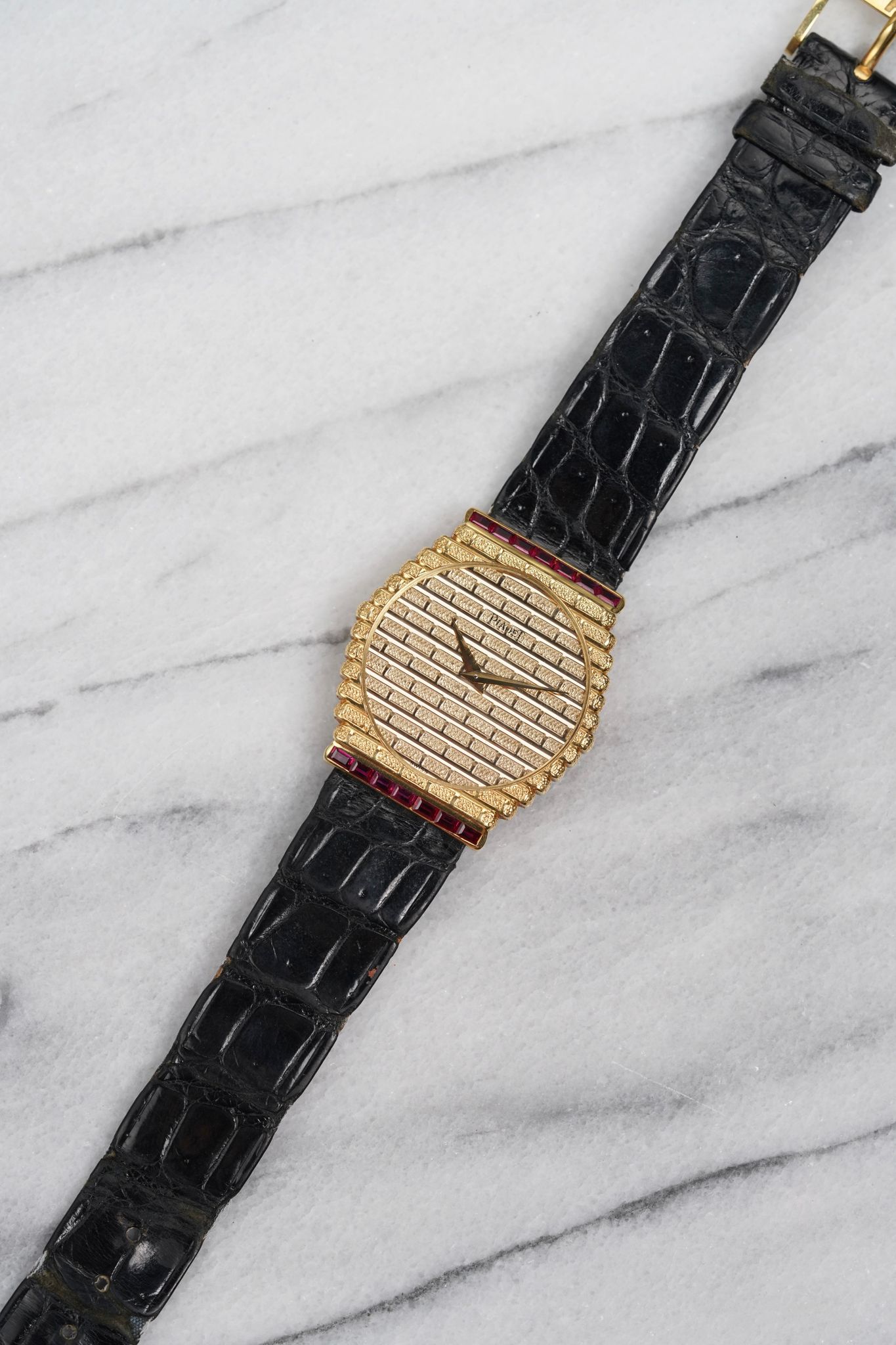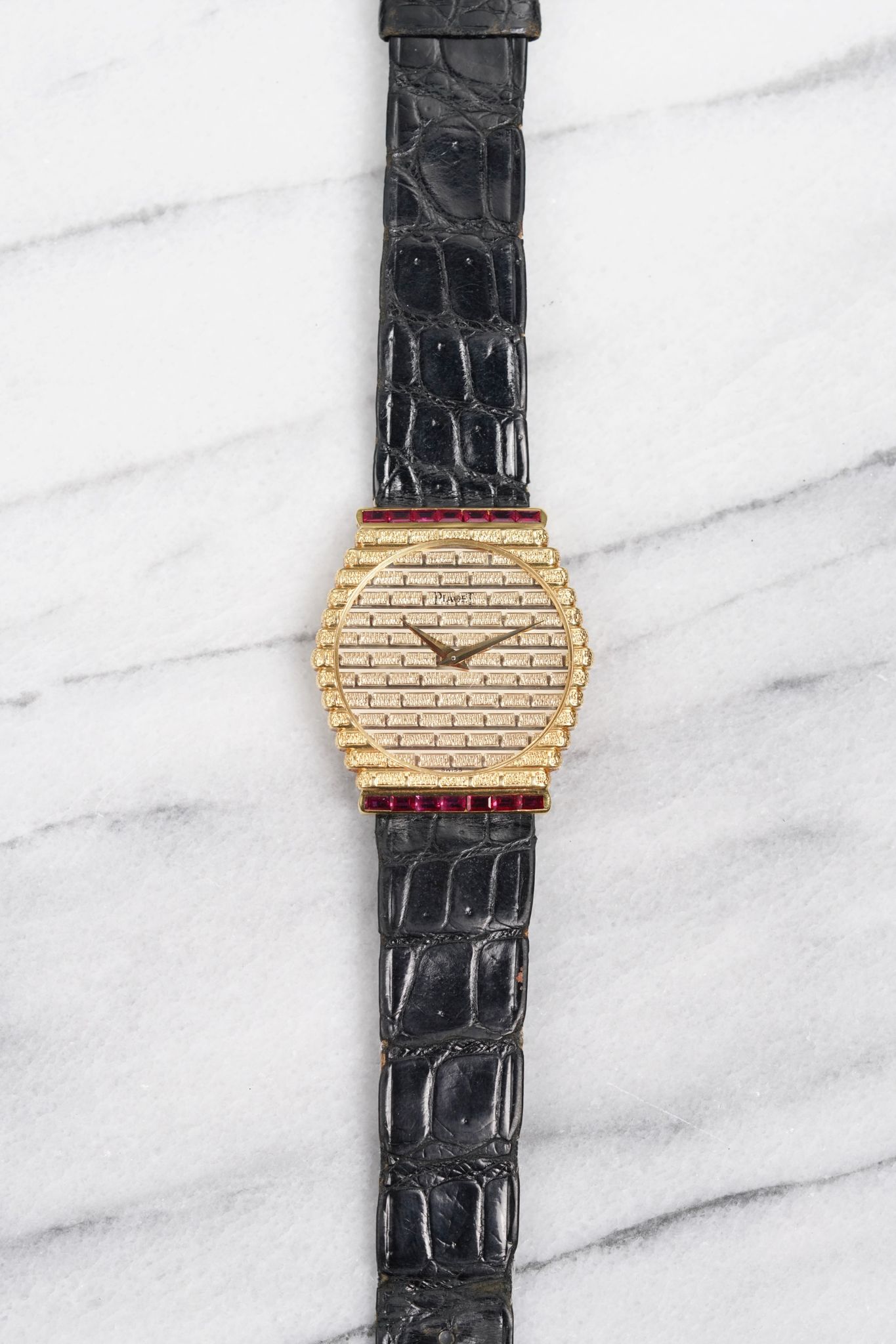 Here’s a Piaget Emperador reference 75743 in 18k yellow gold quartz champagne dial with factory red rubies on the lugs from the 1980s. Measurements include a 34mm case and 18mm lug width. On its original black alligator leather strap and signed gold buckle. Dauphine hands. Very similar shape to the polo. We have never seen this example with a factory ruby set. Original case, dial, and movement.