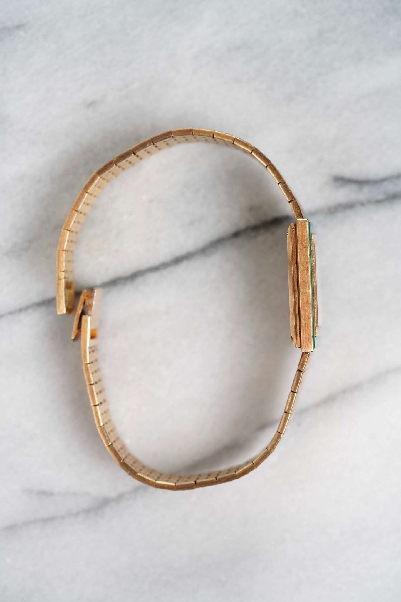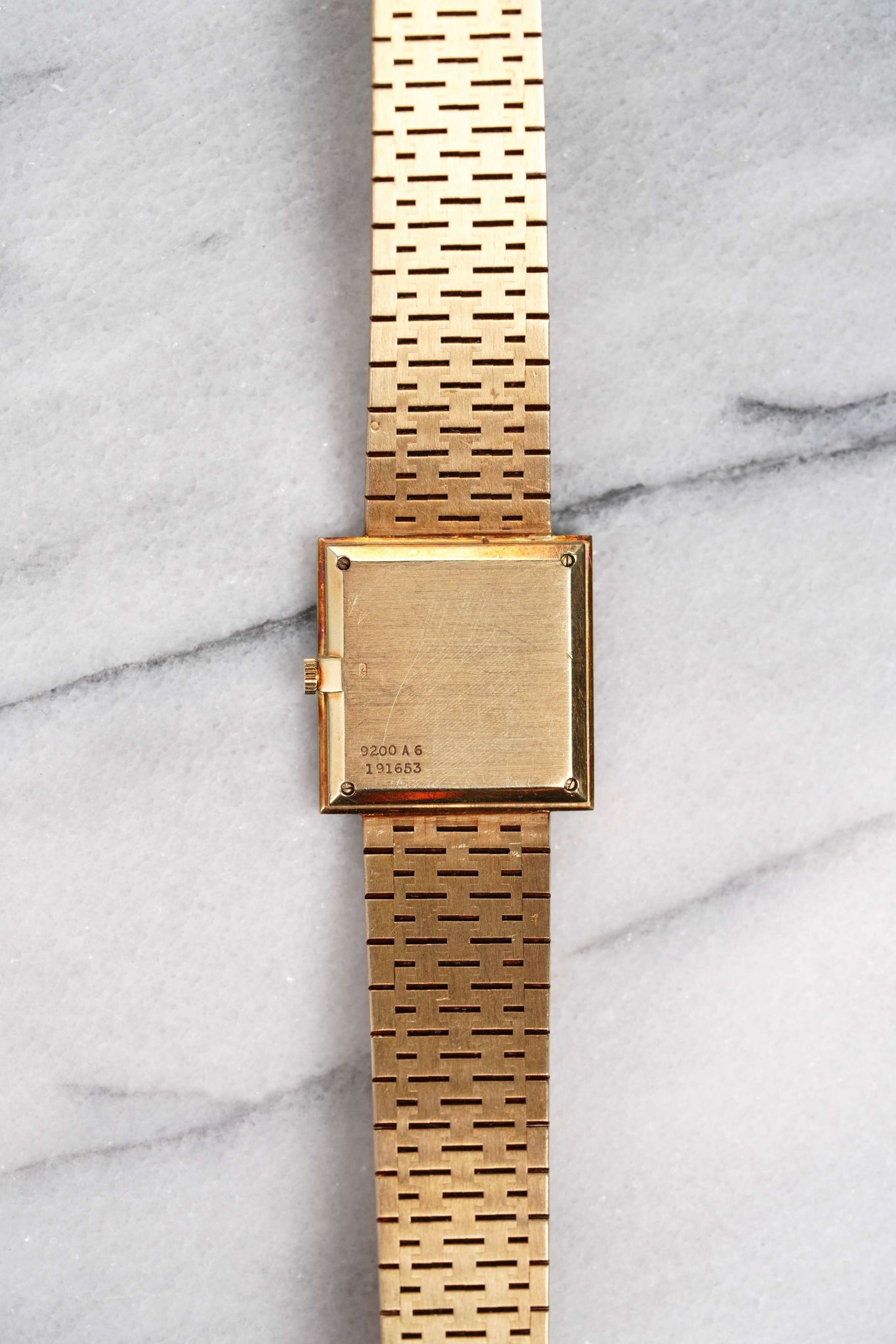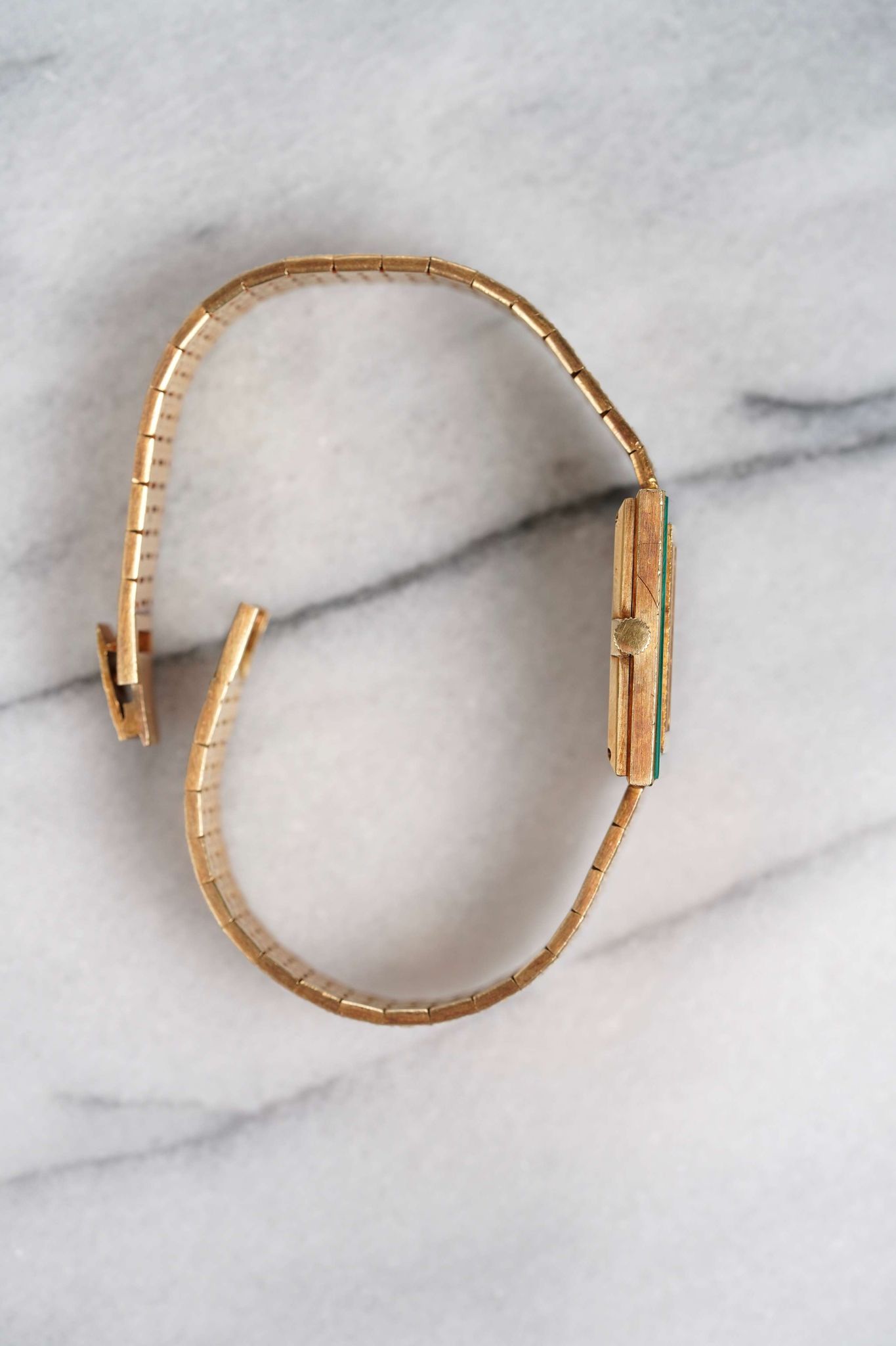 Here's a vintage Piaget reference 9200 with a factory green malachite dial and bezel manual wind in 18K yellow gold from the late 70s, early 80s. Keeps great time and is fully functional. Measurements include a 25mm case size across and an 18mm lug width (signed clasp) (fits up to a 7.25 inch wrist). Bark like finish on the bracelet. Yellow gold case and bracelet. A rare option within the reference 9200 category as most of the mare in tiger eye, onyx, lapis, and diamond dial. The piece is unisex , it can be worn by both men and women. All parts are original including the dial, case, and movement. the dial and case are in great cosmetic, untouched condition