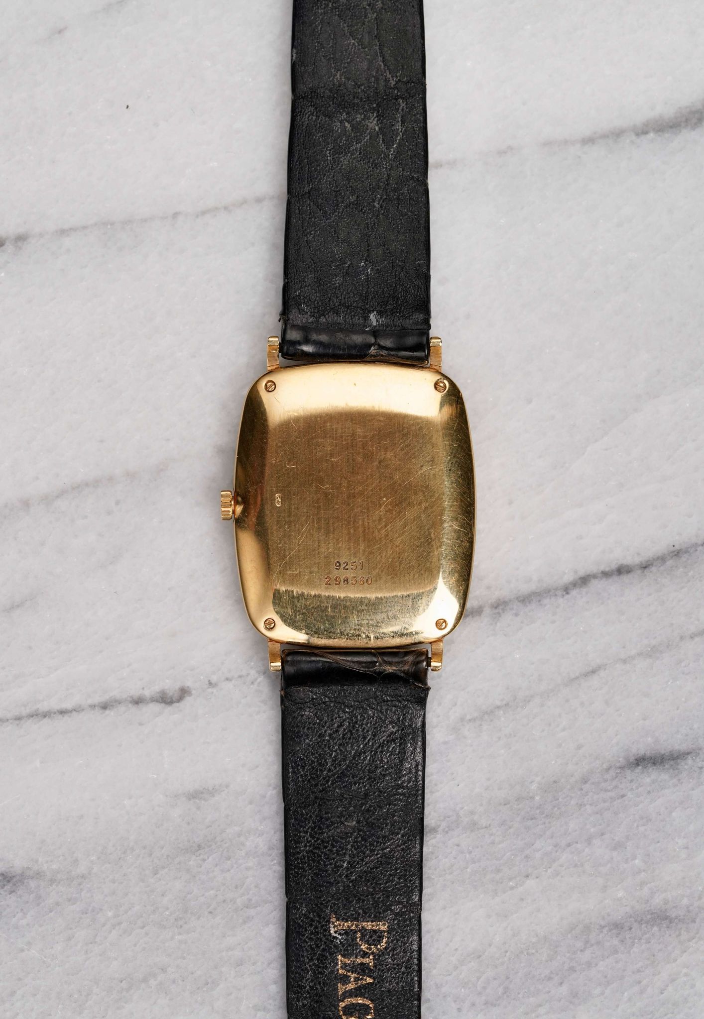 Here's a vintage Piaget tank manual wind reference 9251 in 18K yellow gold with a black onyx stone dial from the 1970s. Keeps great time and is fully functional. Measurements include 25mm tank case size and 16mm lug width. It's on its original black leather strap and signed gold buckle. Time only. Time only. Smooth bezel. Gold case and screw down caseback. The dial and crystal is free from any scratches or marks. All parts are original including the dial, crown, movement, and caseback. Both the dial and case are in great cosmetic, untouched condition.
