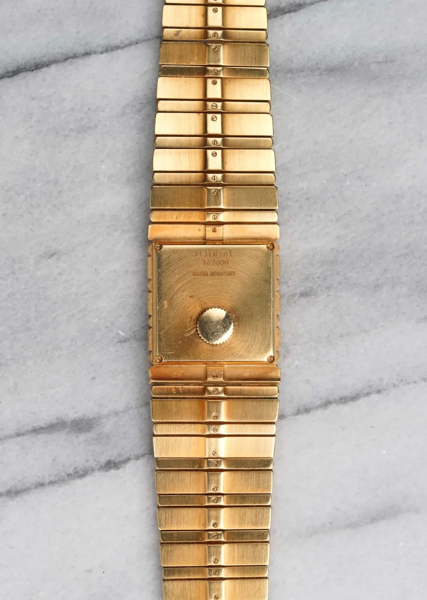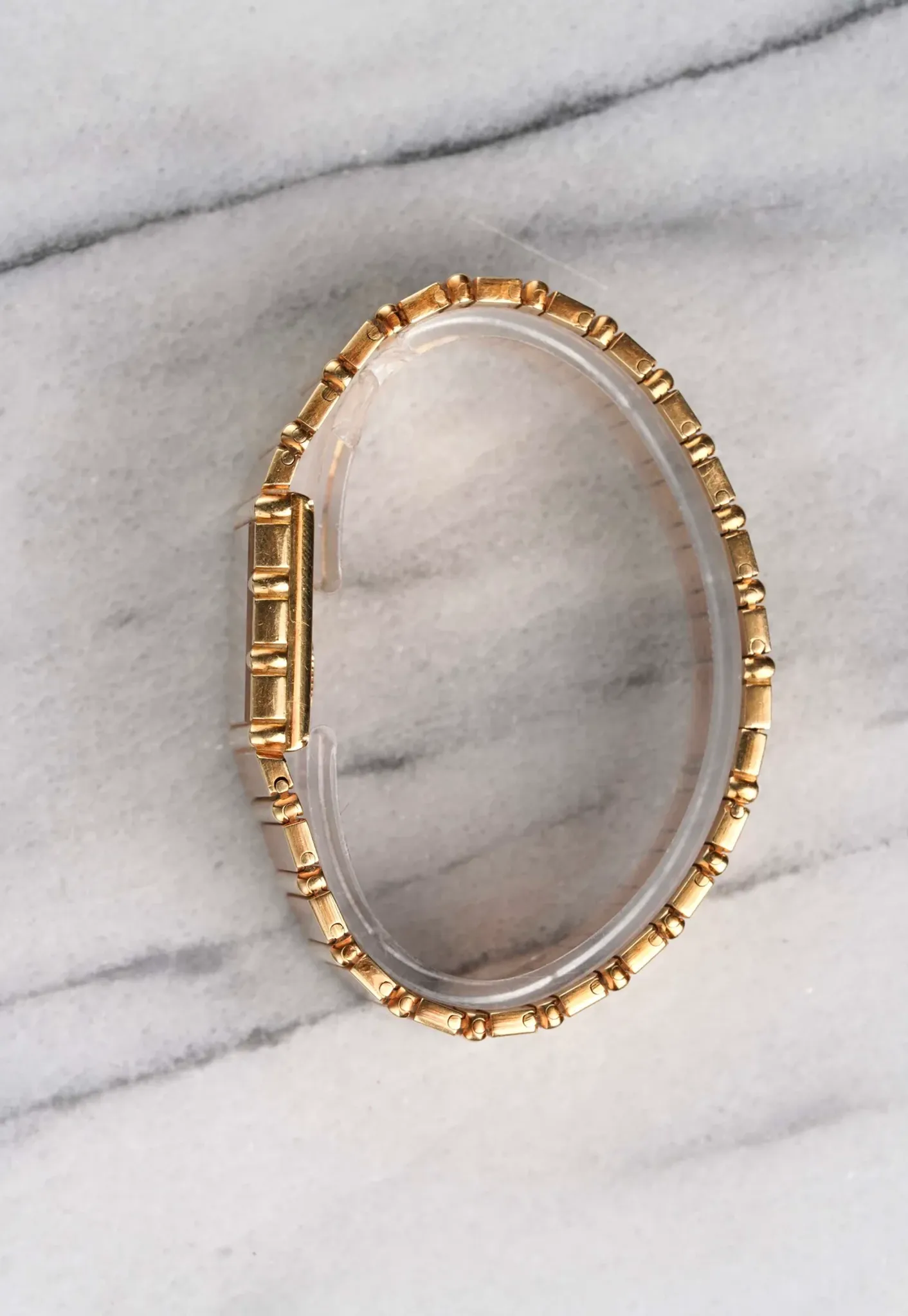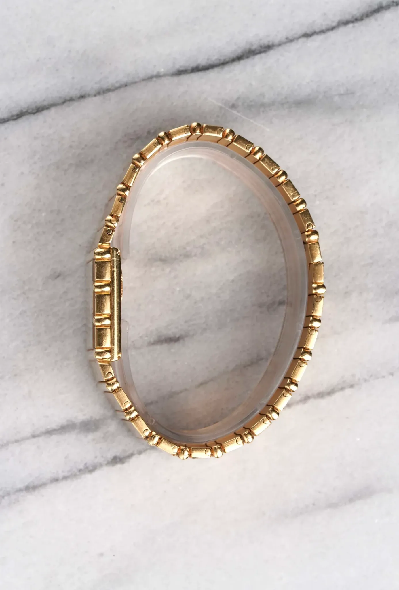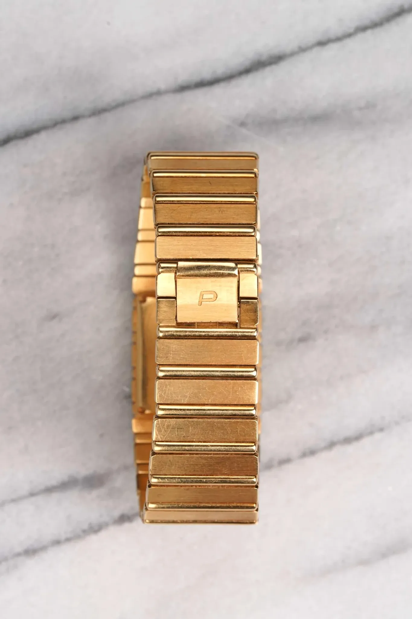 Here's a vintage Piaget Polo Cuff reference 7131 Quartz in 18K yellow gold from the 1980s. Keeps great time and is fully functional. Bracelet fits up to a 7 inch wrist. (The links have screws so they can be removed). Gold dauphins hands. 18K gold case, bracelet, and caseback. Integrated bracelet. 25mm case. Quickset date function at 3 clock. Matching texture/ design on both the bracelet and bezel. The case, bezel, and bracelet have its far share of scratches, but it’s honest shape. Both the dial and crystal are free from any scratches or marks. Unpolished example which are quite hard to find. All parts are original including dial, movement, and caseback. Both the dial and case are in great cosmetic, untouched condition.