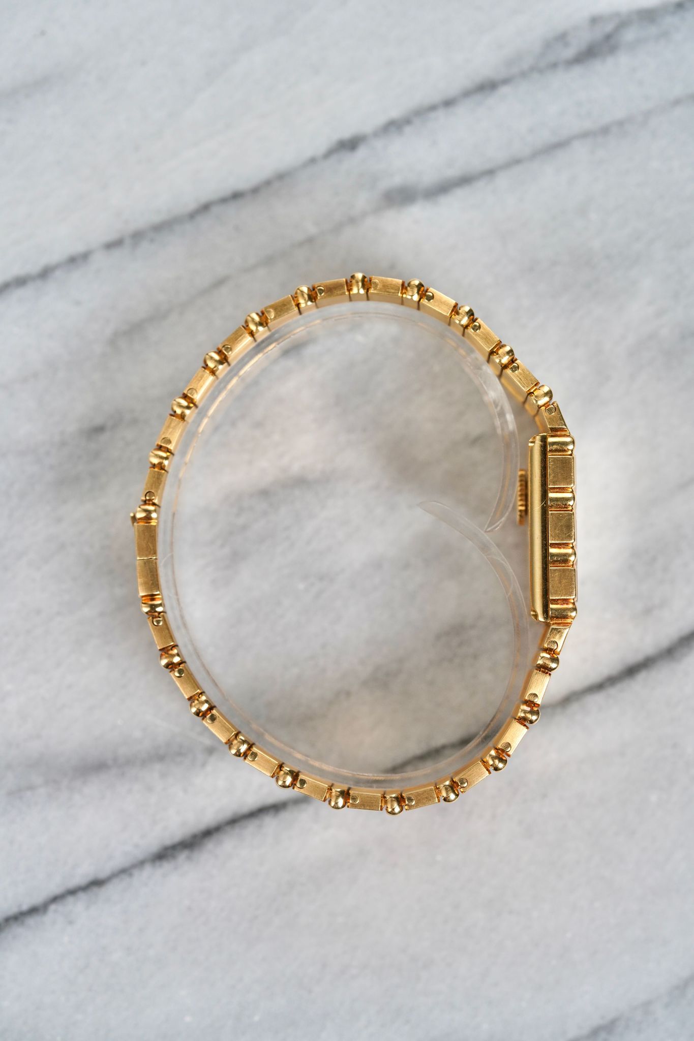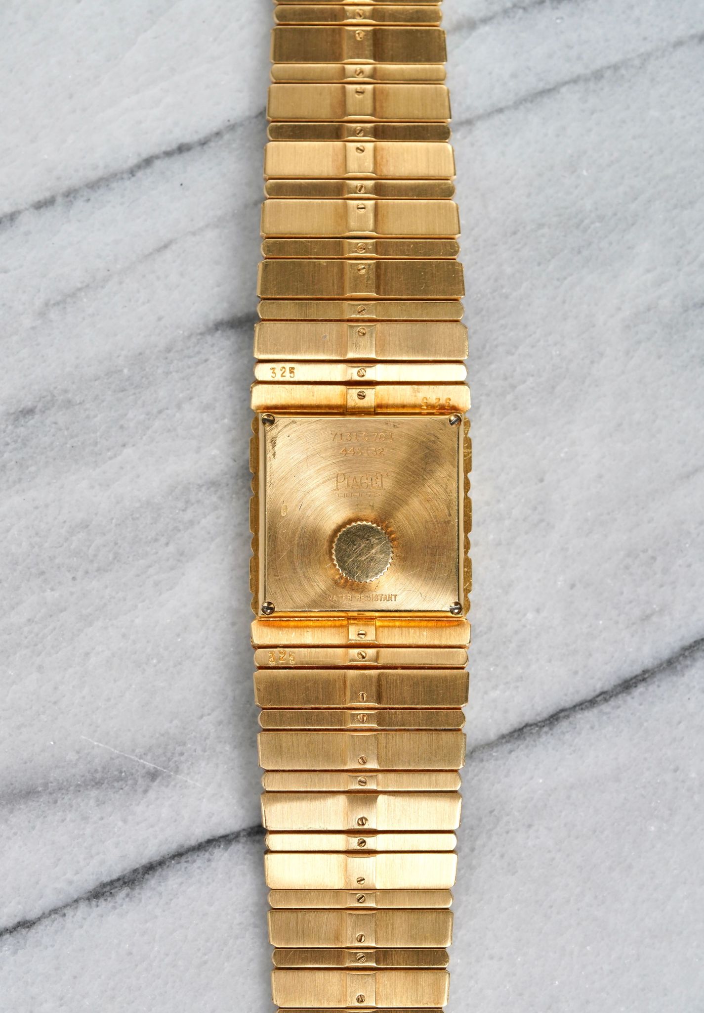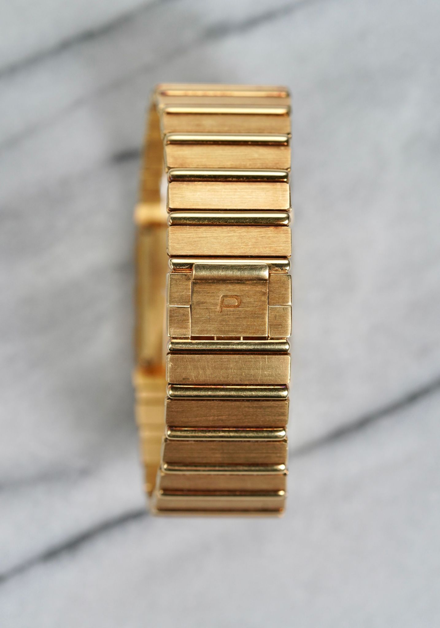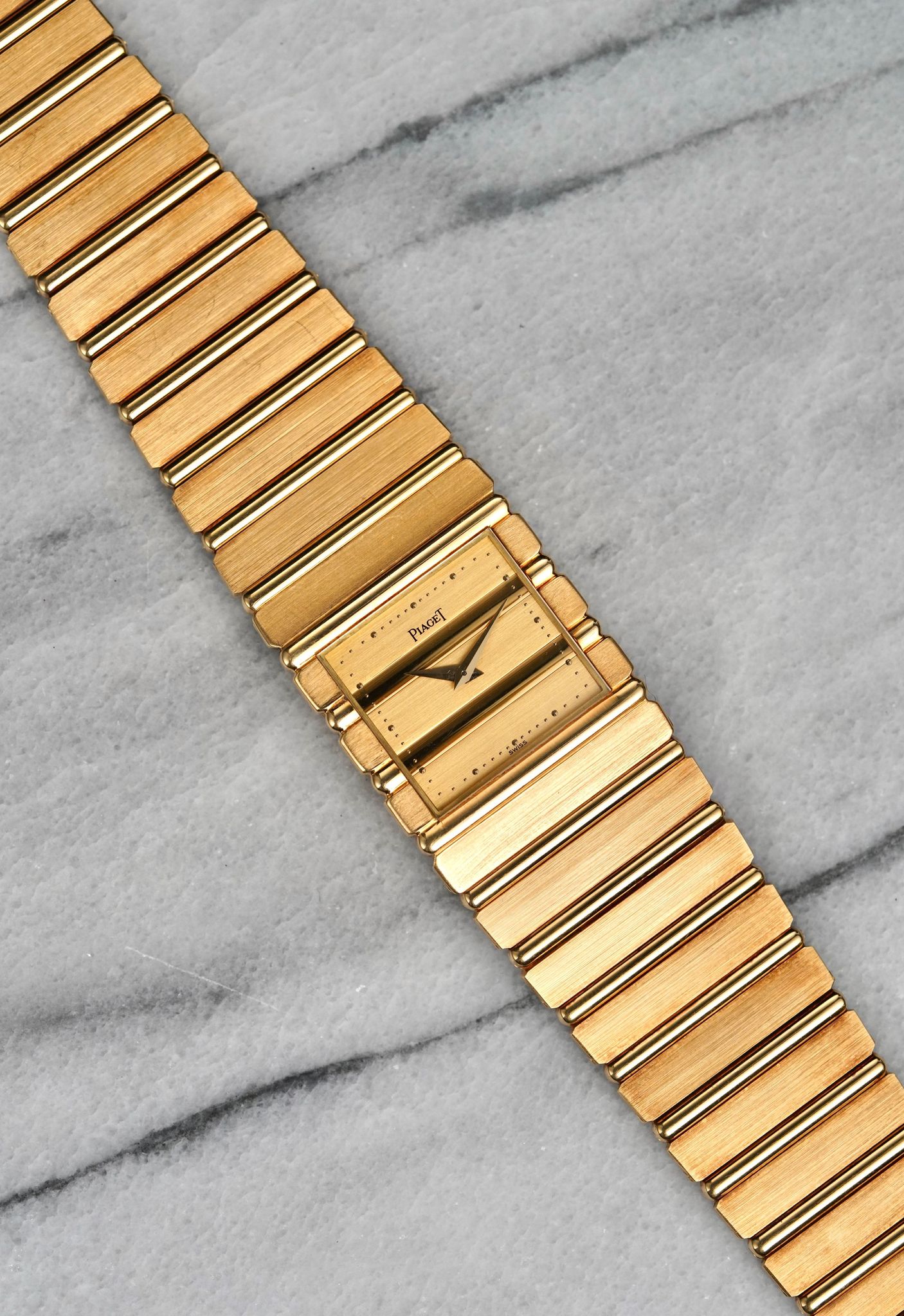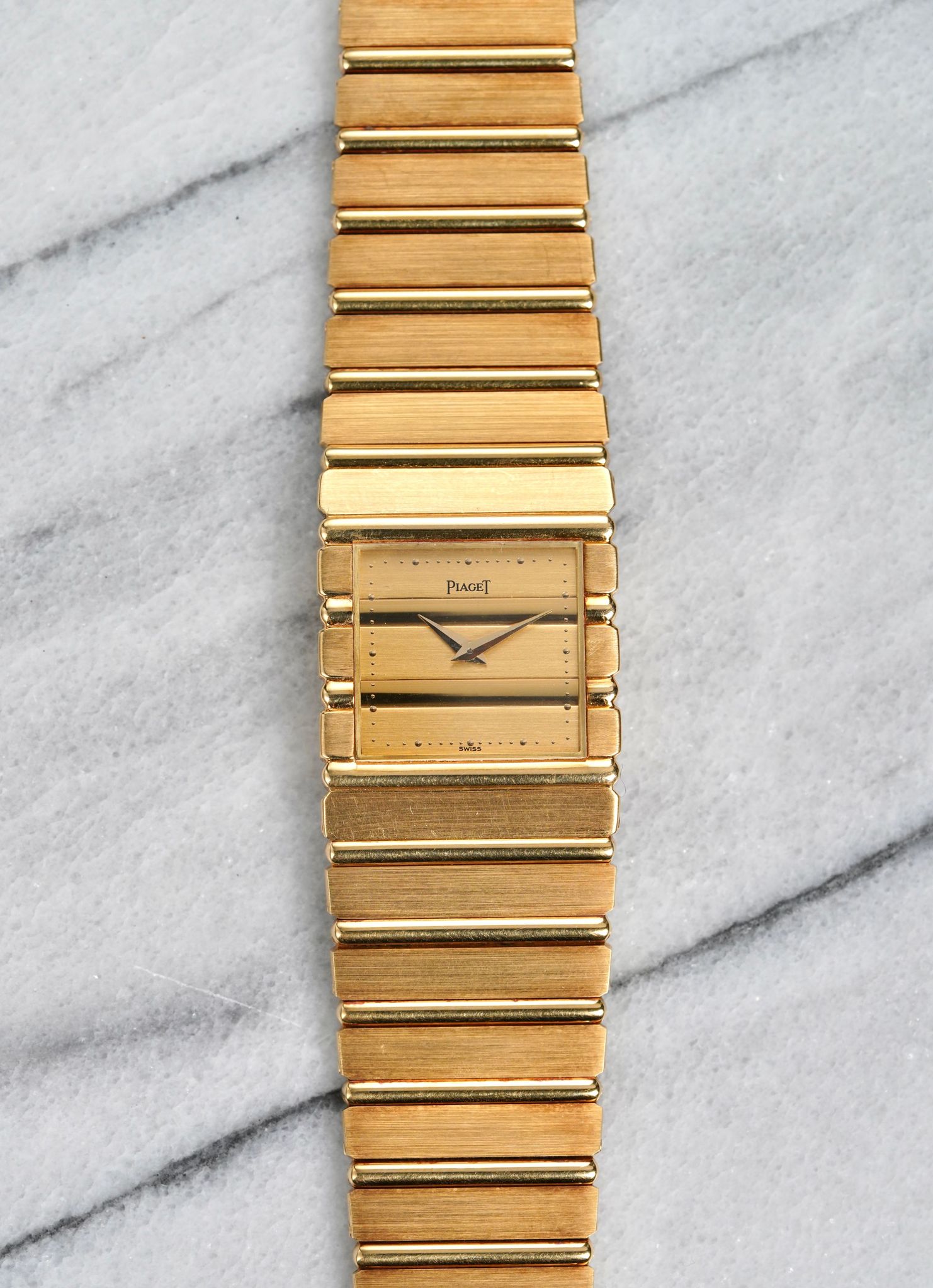 Here's a vintage Piaget Polo Cuff reference 7131 Quartz in 18K yellow gold from the 1980s. Keeps great time and is fully functional. Bracelet fits up to a 7 inch wrist. (The links have screws so they can be removed). Gold dauphine hands. 18K gold case, bracelet, and caseback. Integrated bracelet. 25mm case. Quickset date function at 3 clock. Matching texture/ design on both the bracelet and bezel. The case, bezel, and bracelet have its far share of scratches, but it’s honest shape. Both the dial and crystal are free from any scratches or marks. Unpolished example which are quite hard to find. All parts are original including dial, movement, and caseback. Both the dial and case are in great cosmetic, untouched condition.