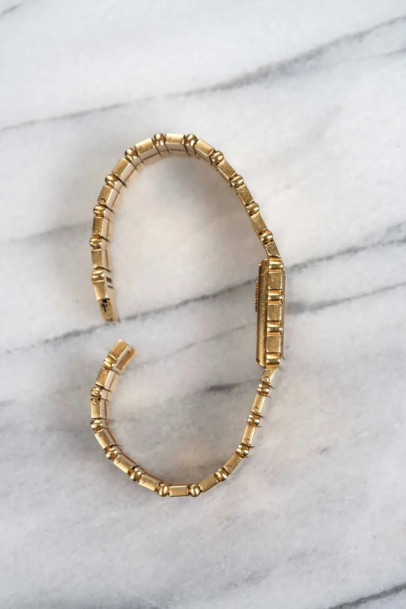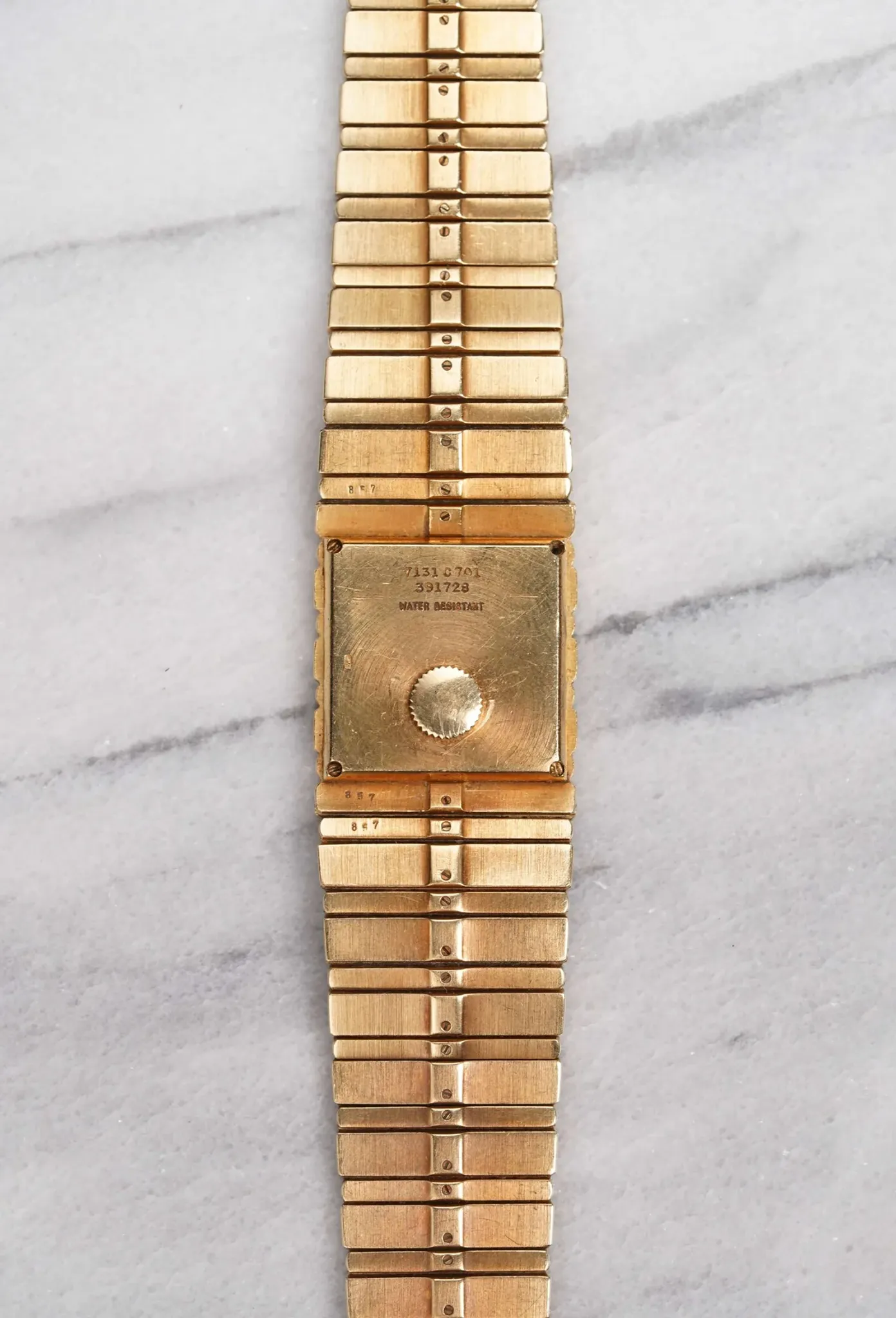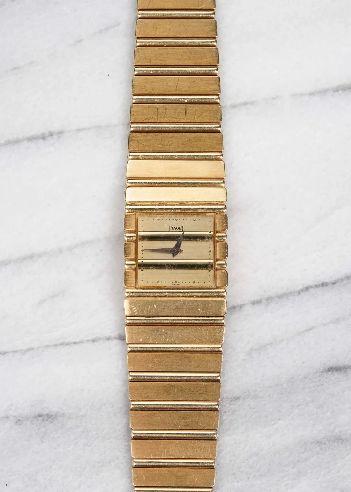 Here's a vintage Piaget Polo Cuff reference 7131 Quartz in 18K yellow gold from the 1980s. Keeps great time and is fully functional. Bracelet fits up to a 7 inch wrist. (The links have screws so they can be removed). Recently changed its battery. Gold dauphins hands. 18K gold case, bracelet, and caseback. Integrated bracelet. 25mm case. Quickset date function at 3 clock. Matching texture/ design on both the bracelet and bezel. The case, bezel, and bracelet have its far share of scratches, but it’s honest shape. Both the dial and crystal are free from any scratches or marks. Unpolished example which are quite hard to find. All parts are original including dial, movement, and caseback. Both the dial and case are in great cosmetic, untouched condition.
