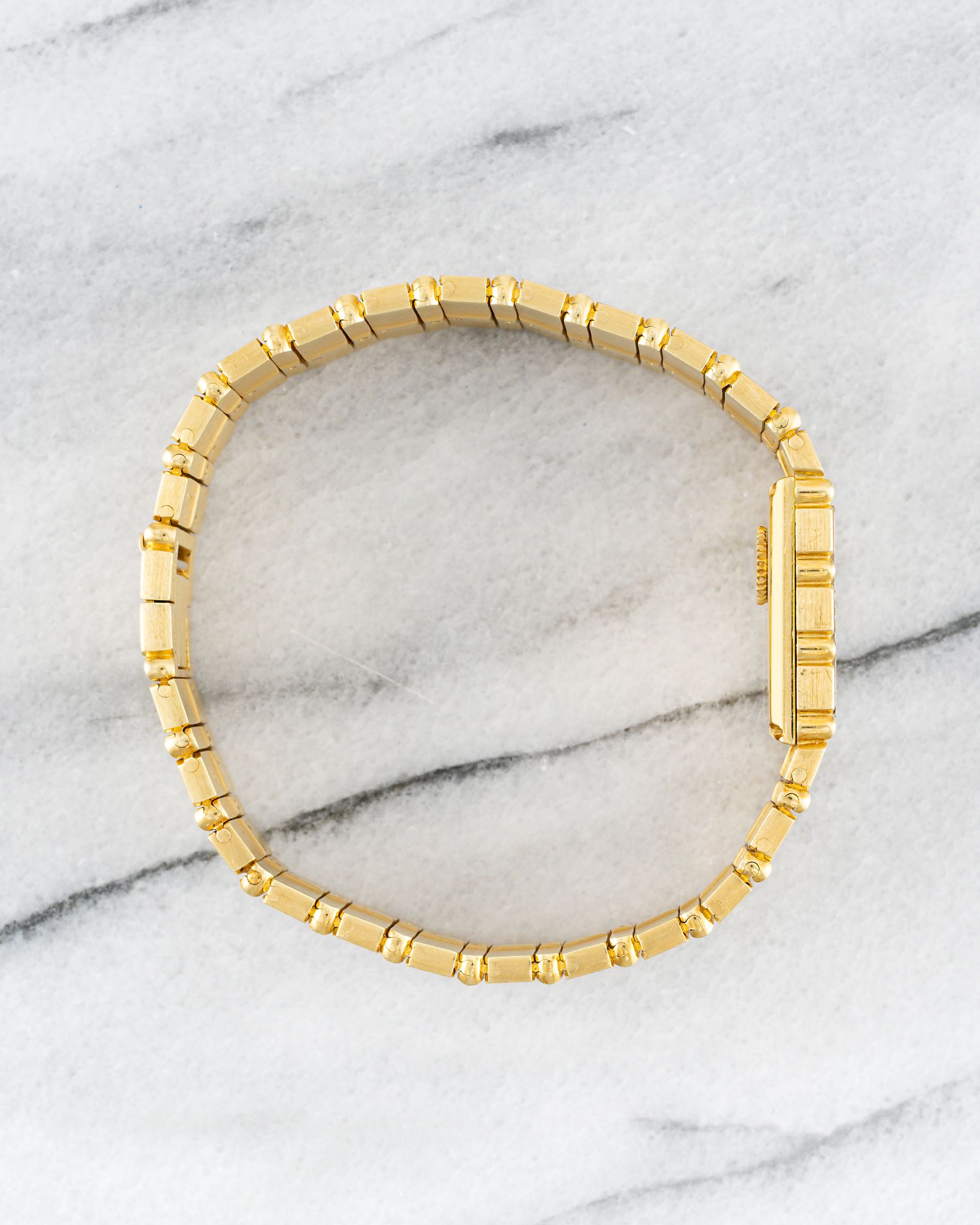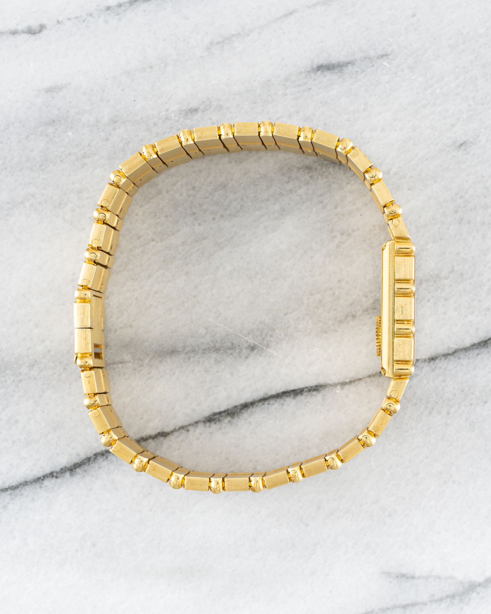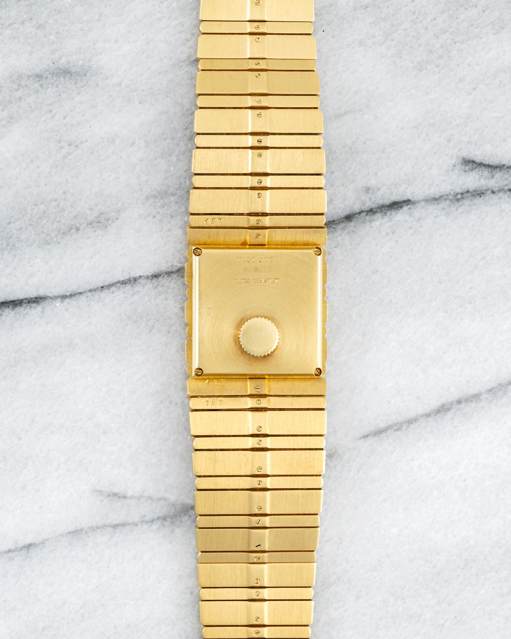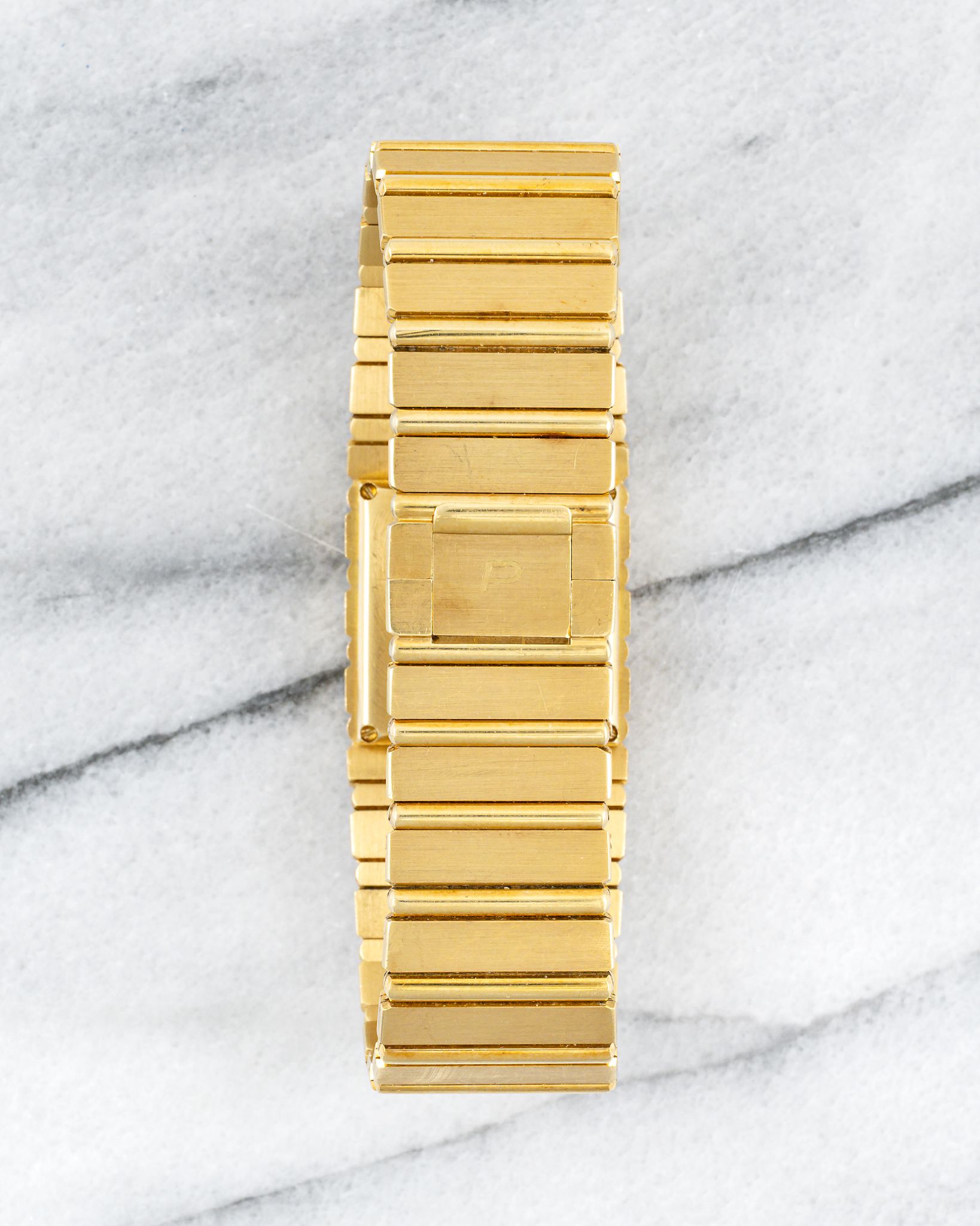 Here's a vintage Piaget Polo Cuff reference 7131 Quartz in 18K yellow gold from the 1980s. Keeps great time and is fully functional. Recently serviced. Truly unpolished example. Bracelet fits up to a 6.75 inch wrist. (The links have screws so they can be removed). Gold dauphine hands. 18K gold case, bracelet, and caseback. Integrated bracelet. 25mm case. Quickset date function at 3 clock. Matching texture/ design on both the bracelet and bezel. The case, bezel, and bracelet have its far share of scratches, but it’s honest shape. Both the dial and crystal are free from any scratches or marks. Unpolished example which are quite hard to find. All parts are original including dial, movement, and caseback. Both the dial and case are in great cosmetic, untouched condition.