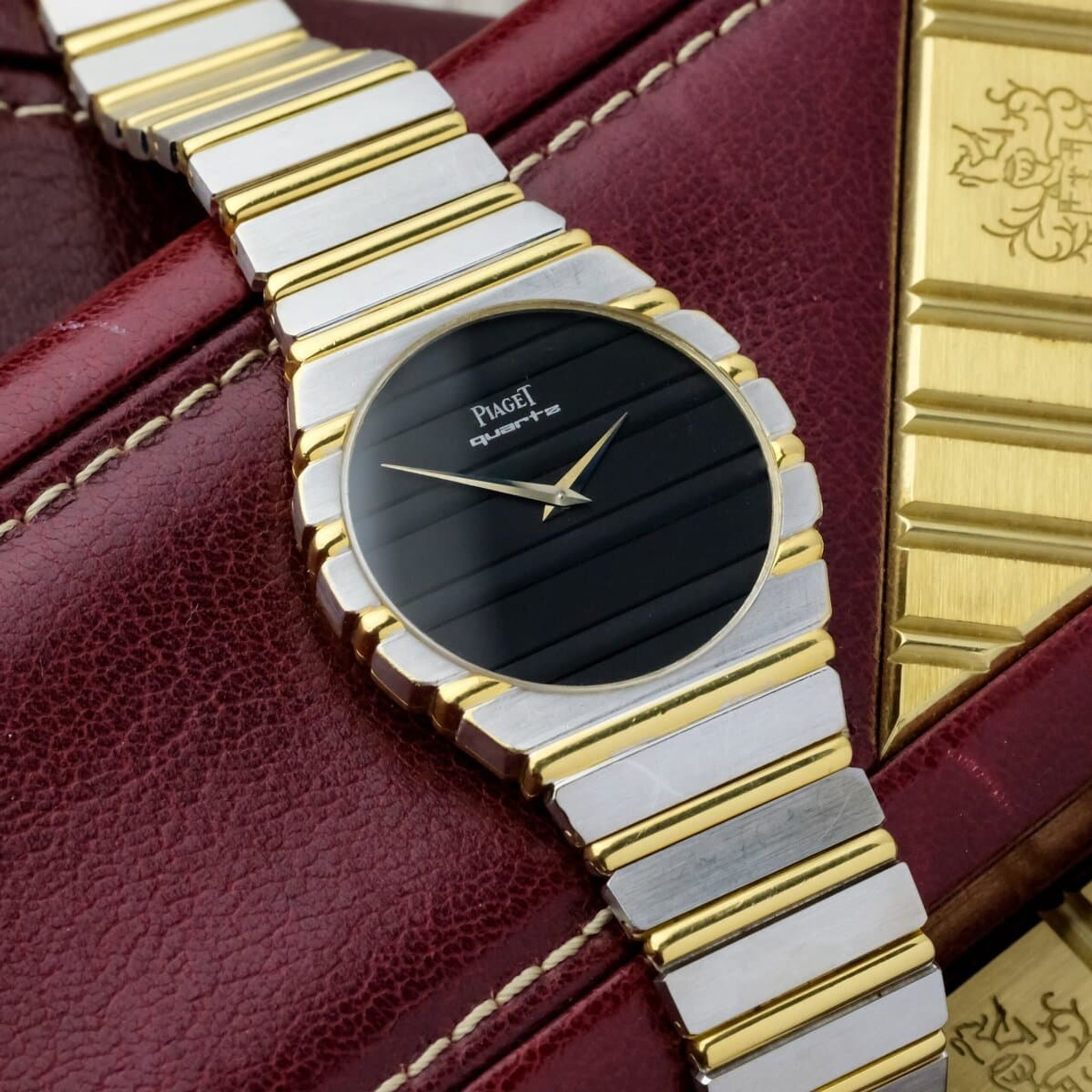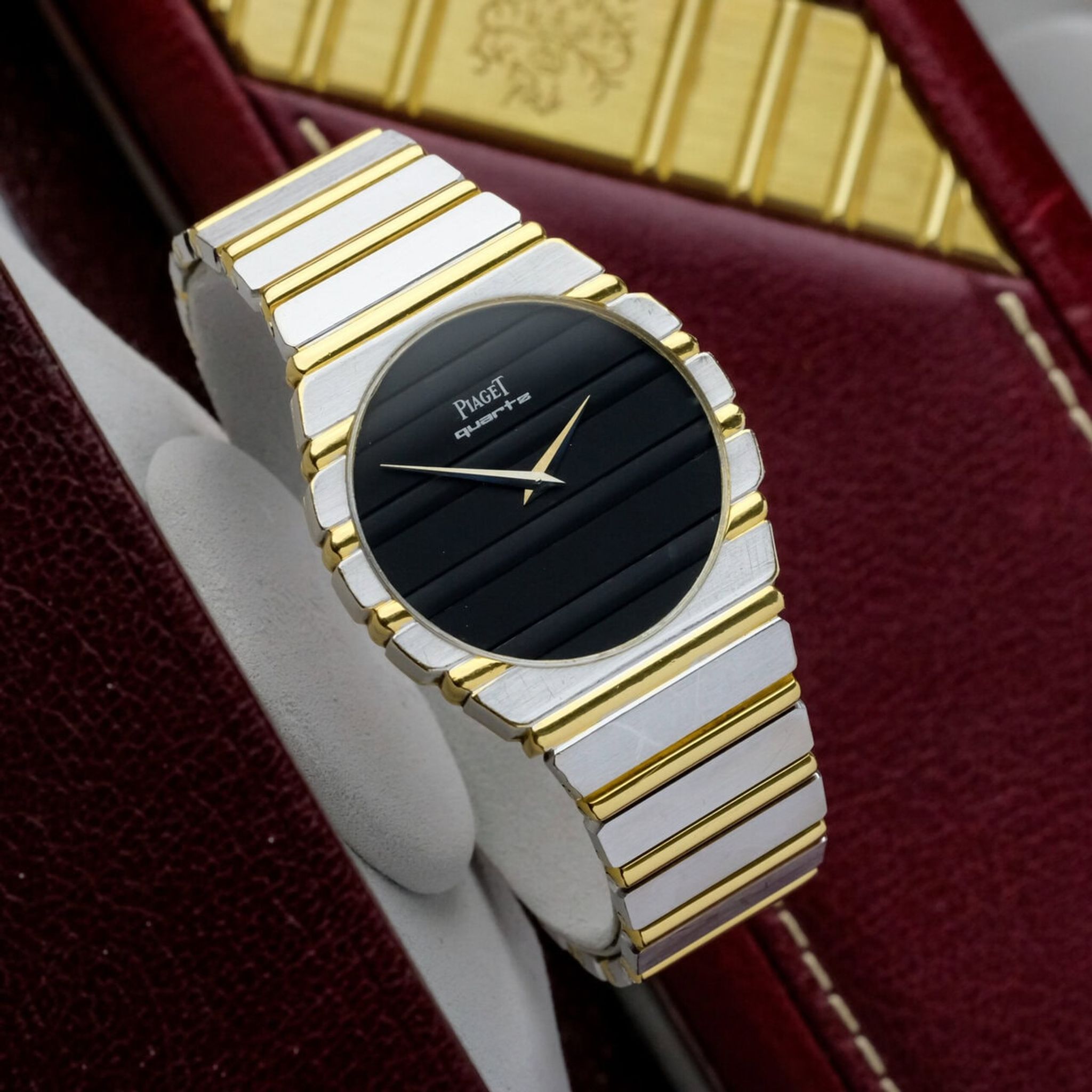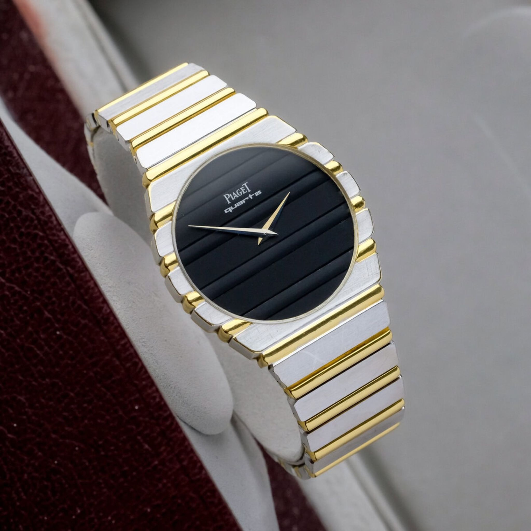 The watch is fitted with a deep black onyx dial, free of any markers, which enhances its minimalist elegance and luxurious presence. Measuring 34 millimeters, the case offers bold yet refined proportions, embodying Piaget’s mastery of precious metal watchmaking in the 1980s.
