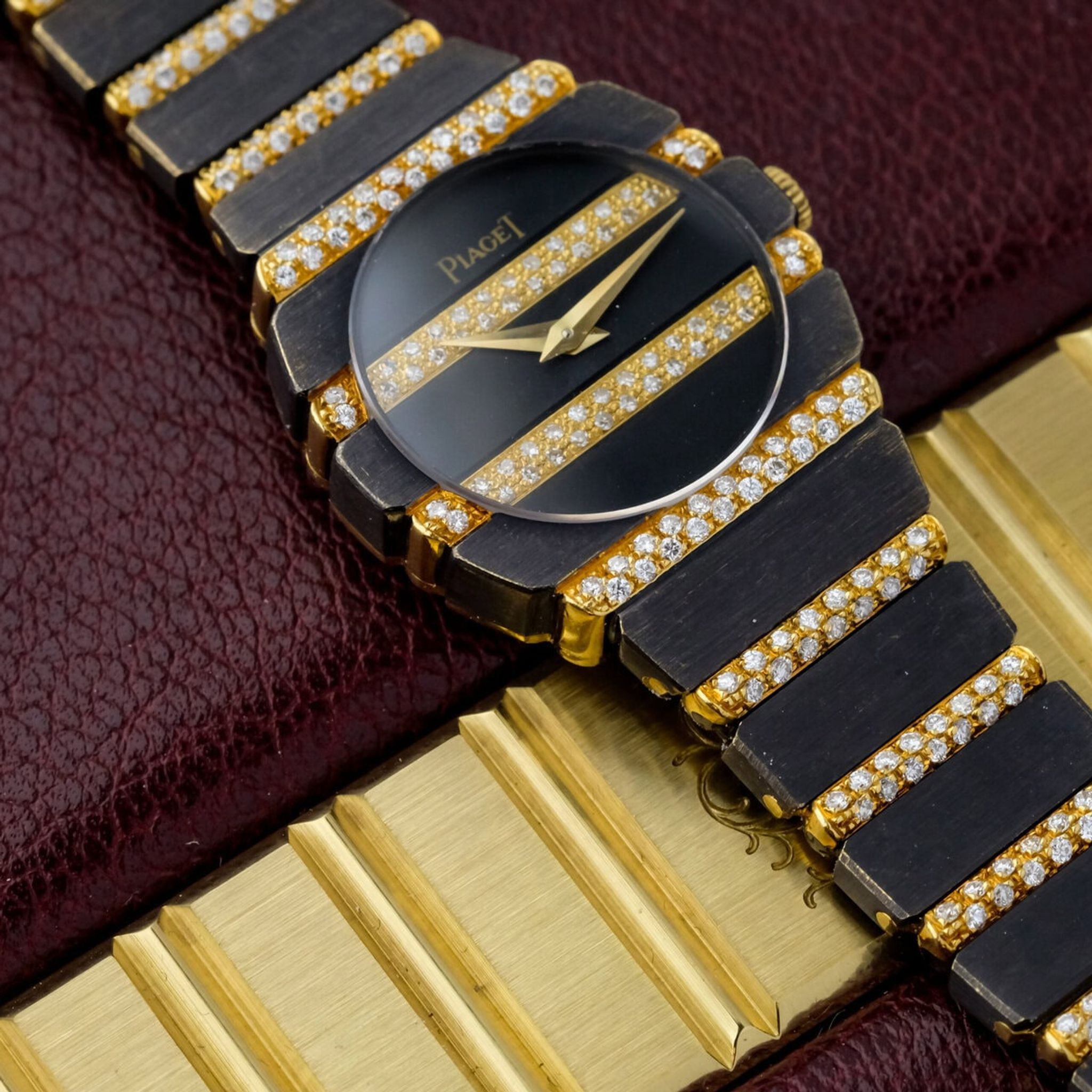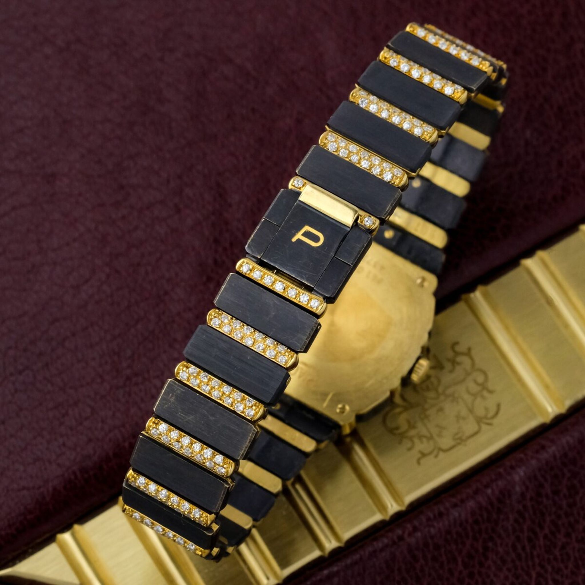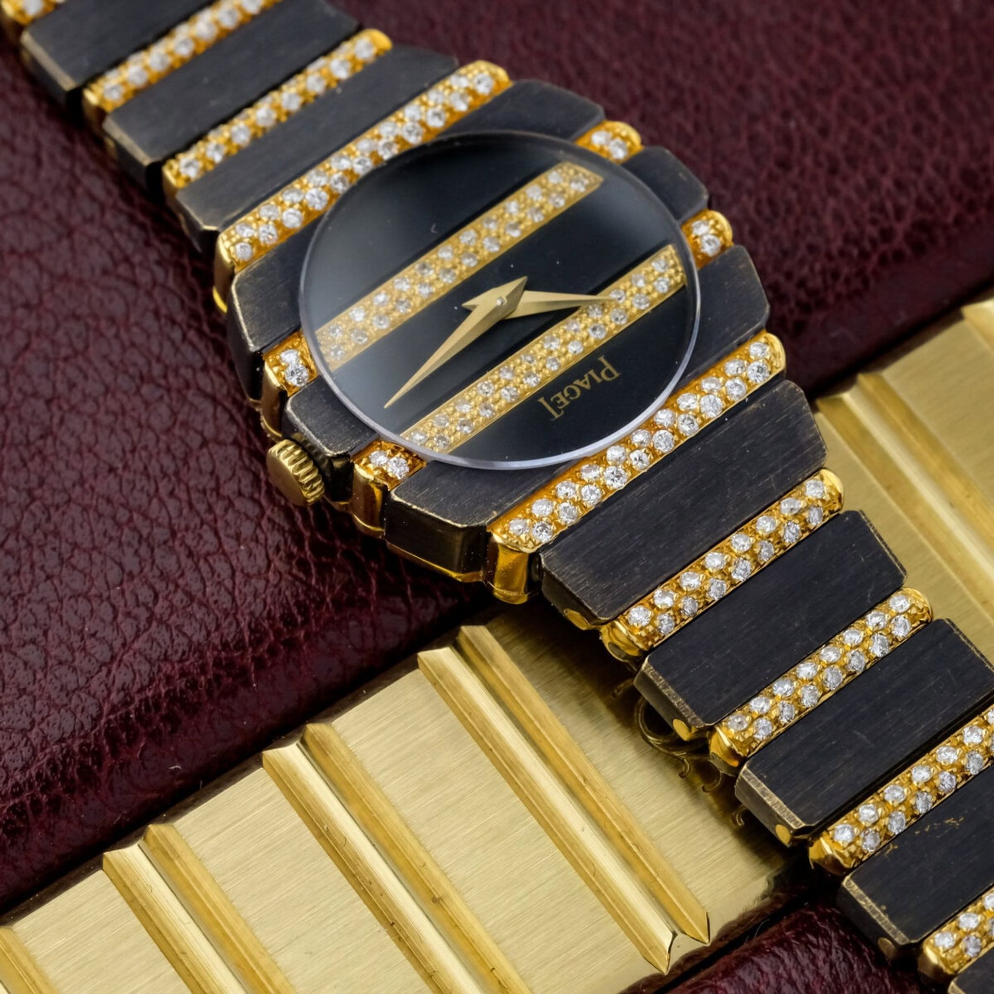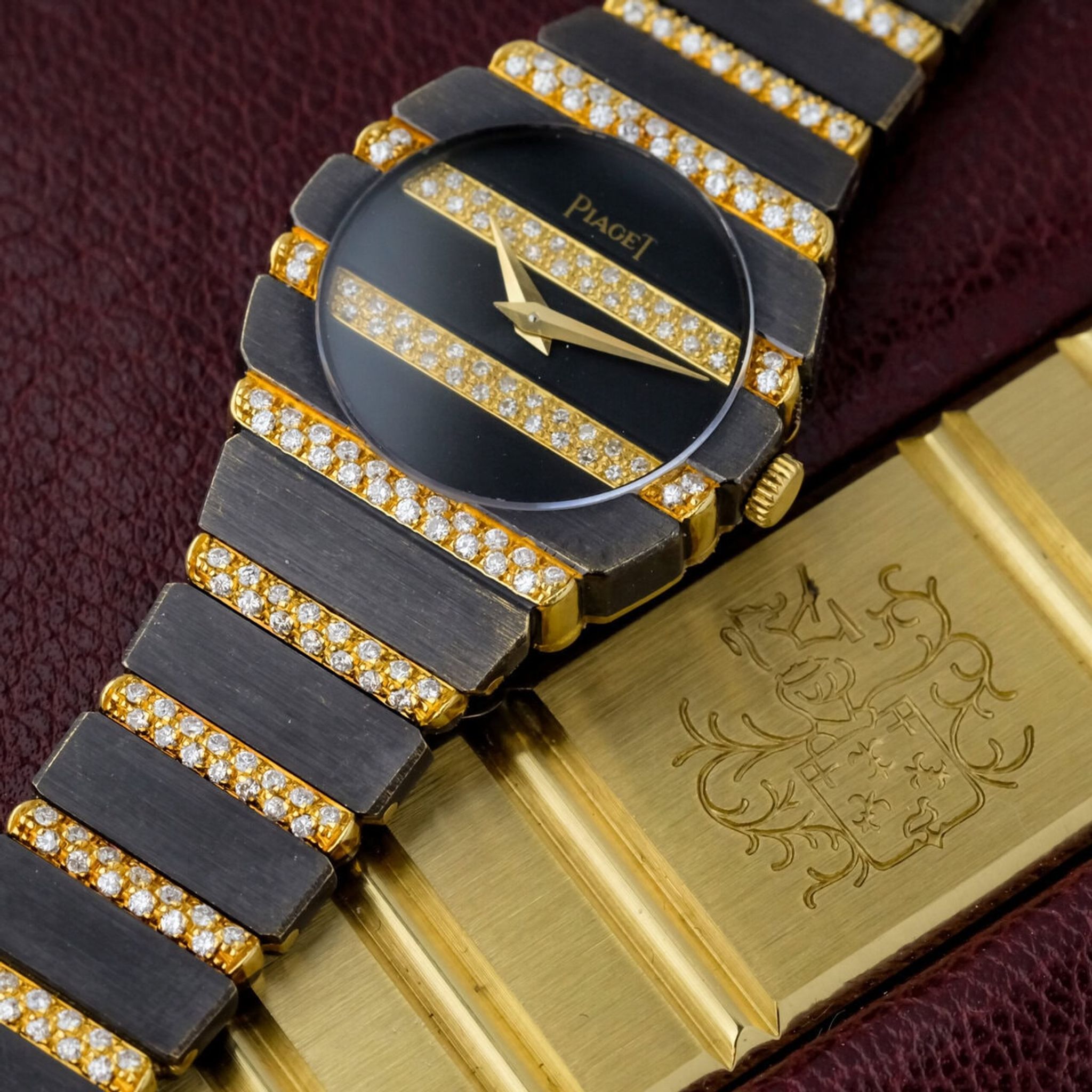 This Piaget Polo Mini PVD reference 861 C 705 is an exceptionally rare and striking interpretation of the maison’s iconic design. Crafted in 18k yellow gold and enhanced with a black PVD coating, the watch measures 23 millimeters and is lavishly set with diamonds across the bracelet, case and dial, creating a dramatic contrast between the dark finish and the brilliance of the stones.