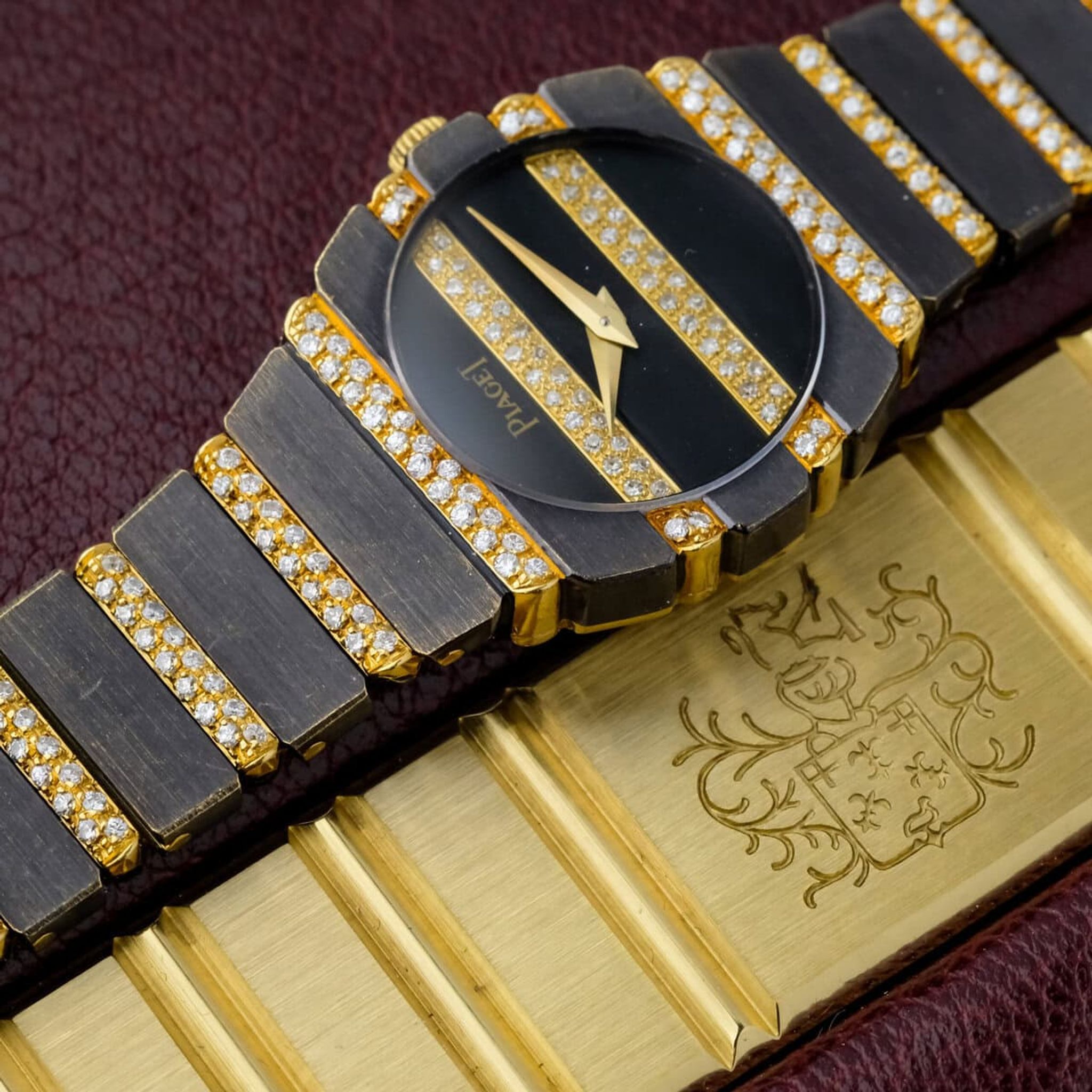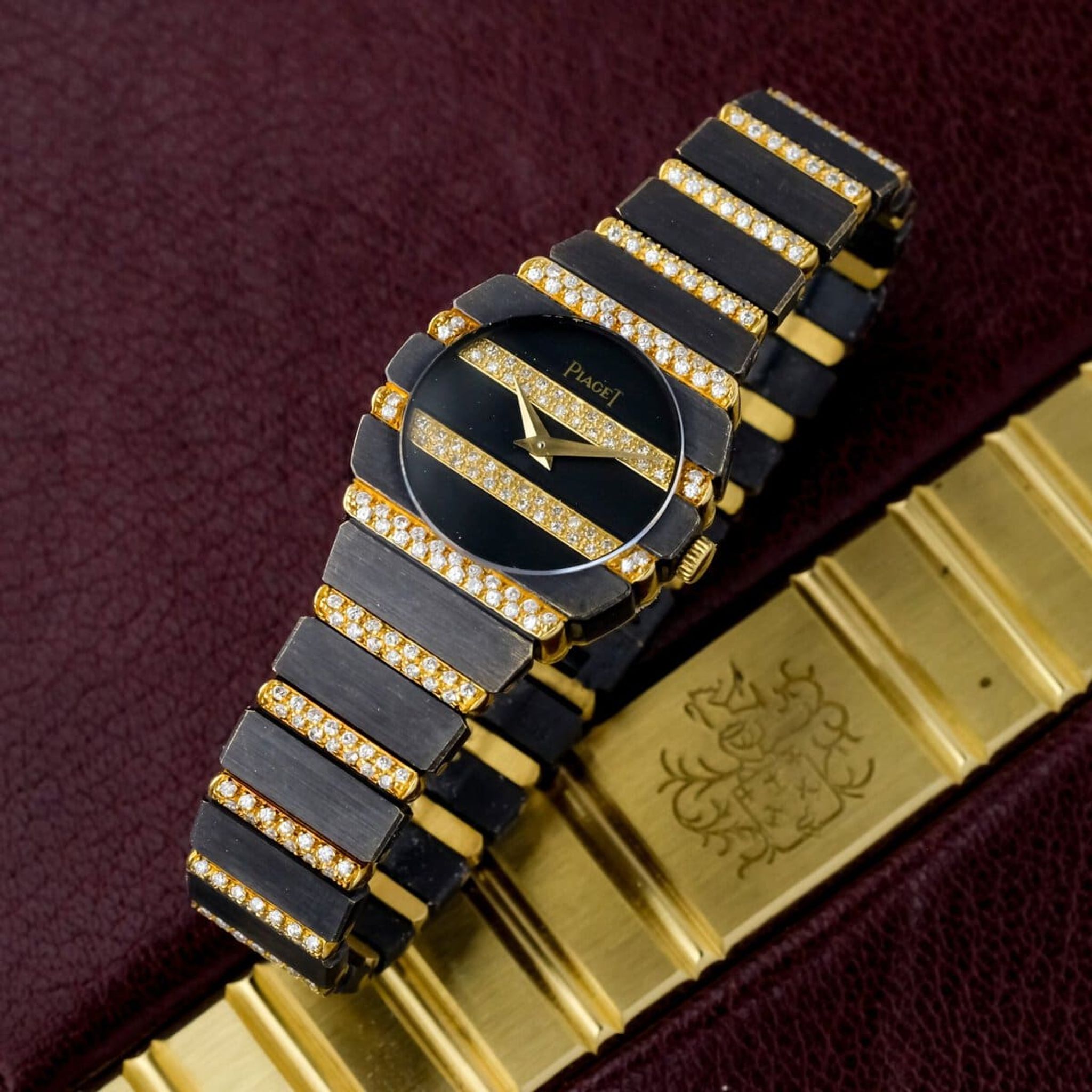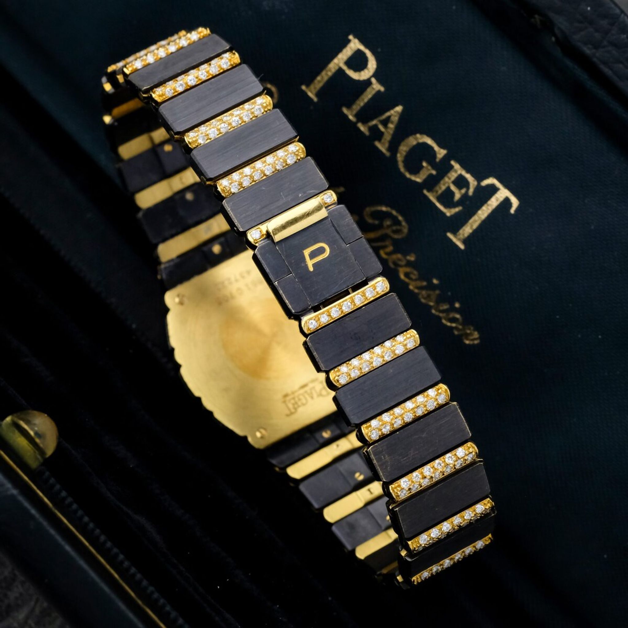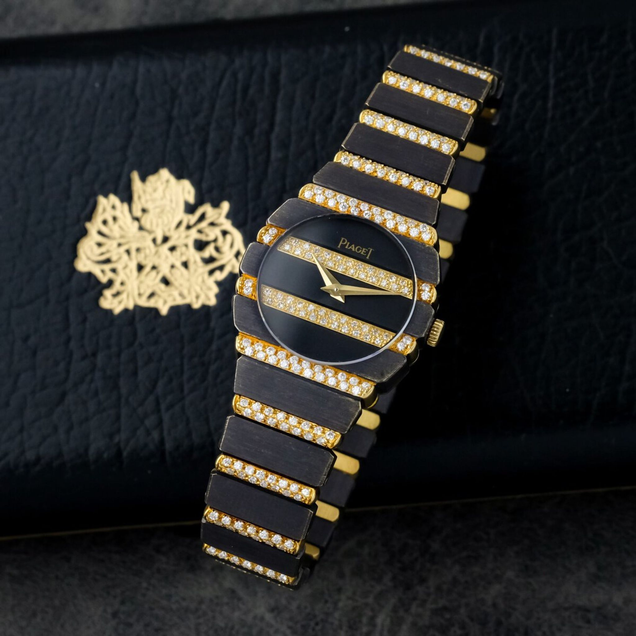 This Piaget Polo Mini PVD reference 861 C 705 is an exceptionally rare and striking interpretation of the maison’s iconic design. Crafted in 18k yellow gold and enhanced with a black PVD coating, the watch measures 23 millimeters and is lavishly set with diamonds across the bracelet, case and dial, creating a dramatic contrast between the dark finish and the brilliance of the stones.