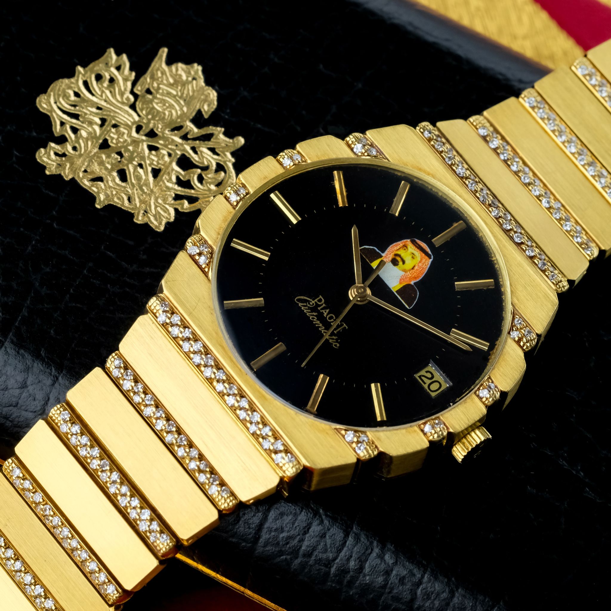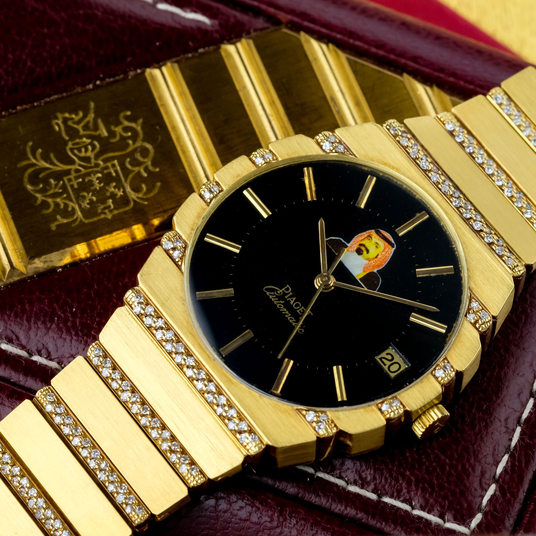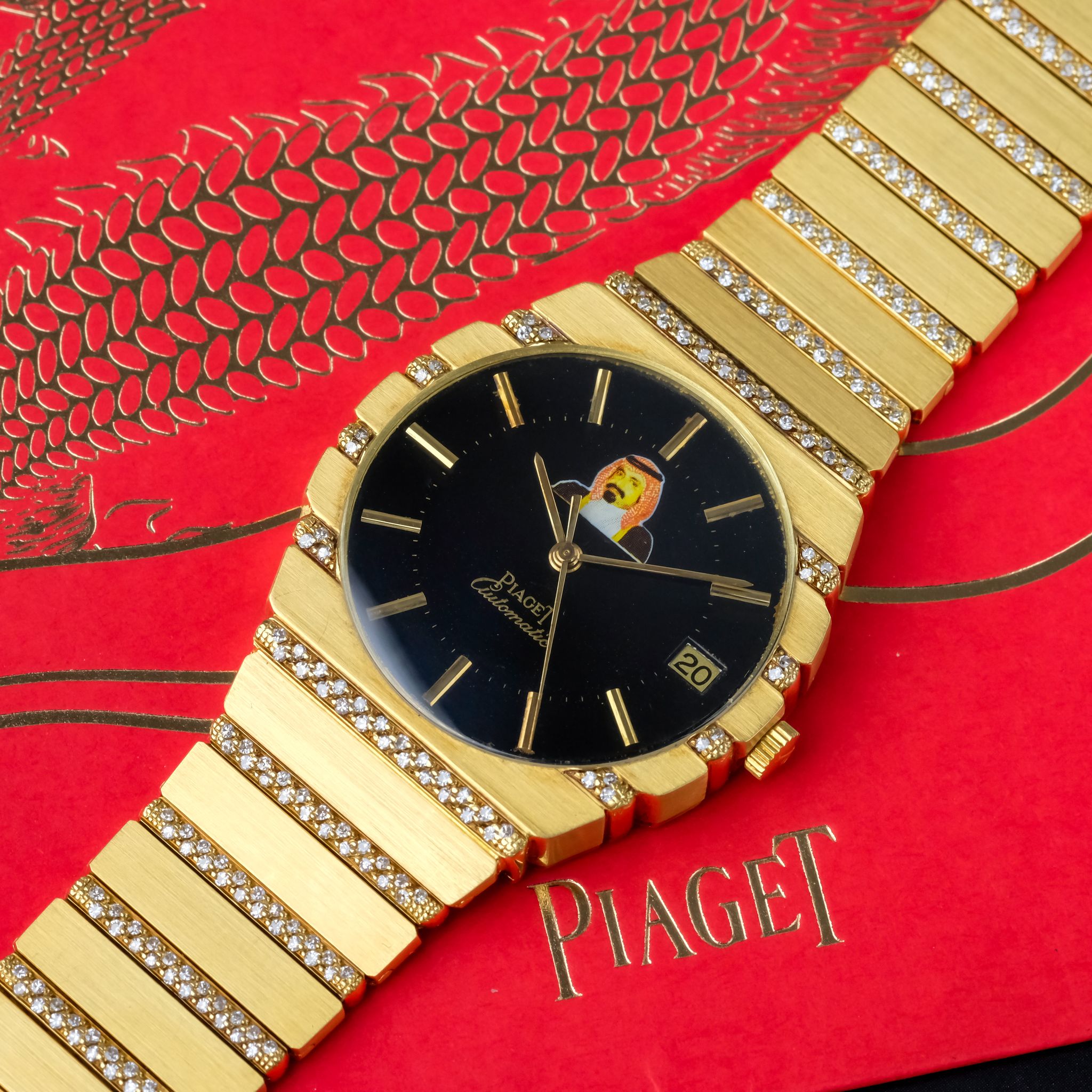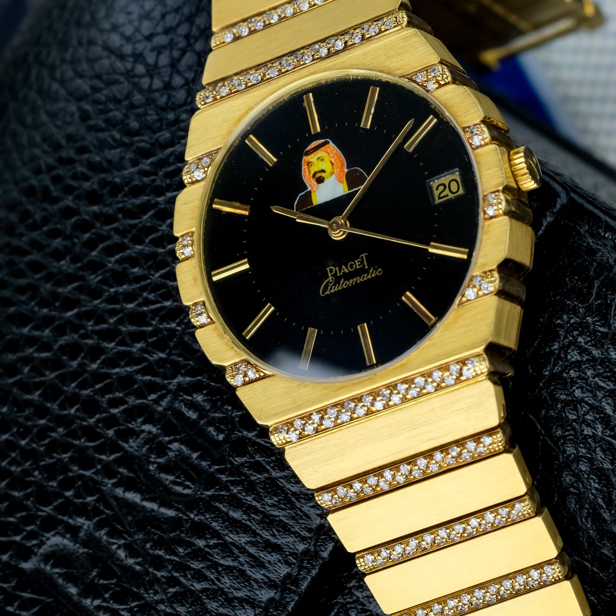 “piece unique” isn’t a term to use often.. so I’m proud to use it now: “special order” Piaget Polo “jumbo” with super rare automatic movement 13p by the former Emir of Quatar (1972-1995). Delivered in 1982 to the middle east this ref. 14661 c705 was one of only five! examples of that reference.. good enough for a royal.. it is also the only model of that reference known to feature a black dial..! *condition: the case is in very good, unpolished condition with no more but light scratches to it. The bracelet is at least as good preserved with next to no stretch to it. The dial does have some light patina looking “stardust” on the black lacquer