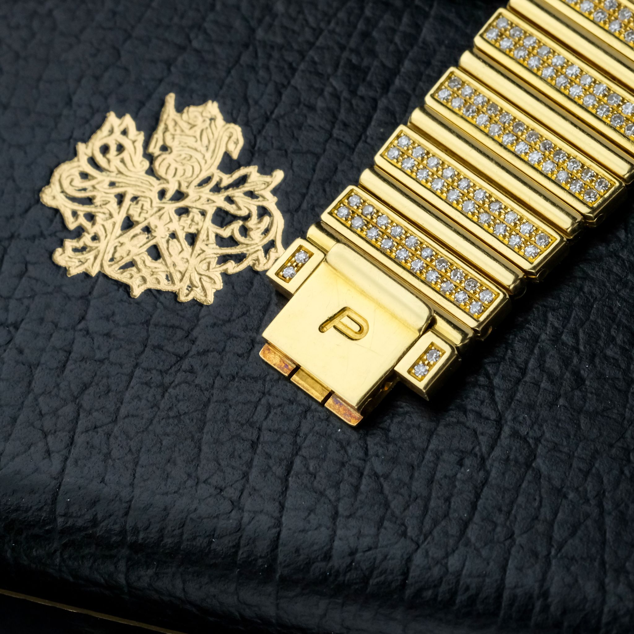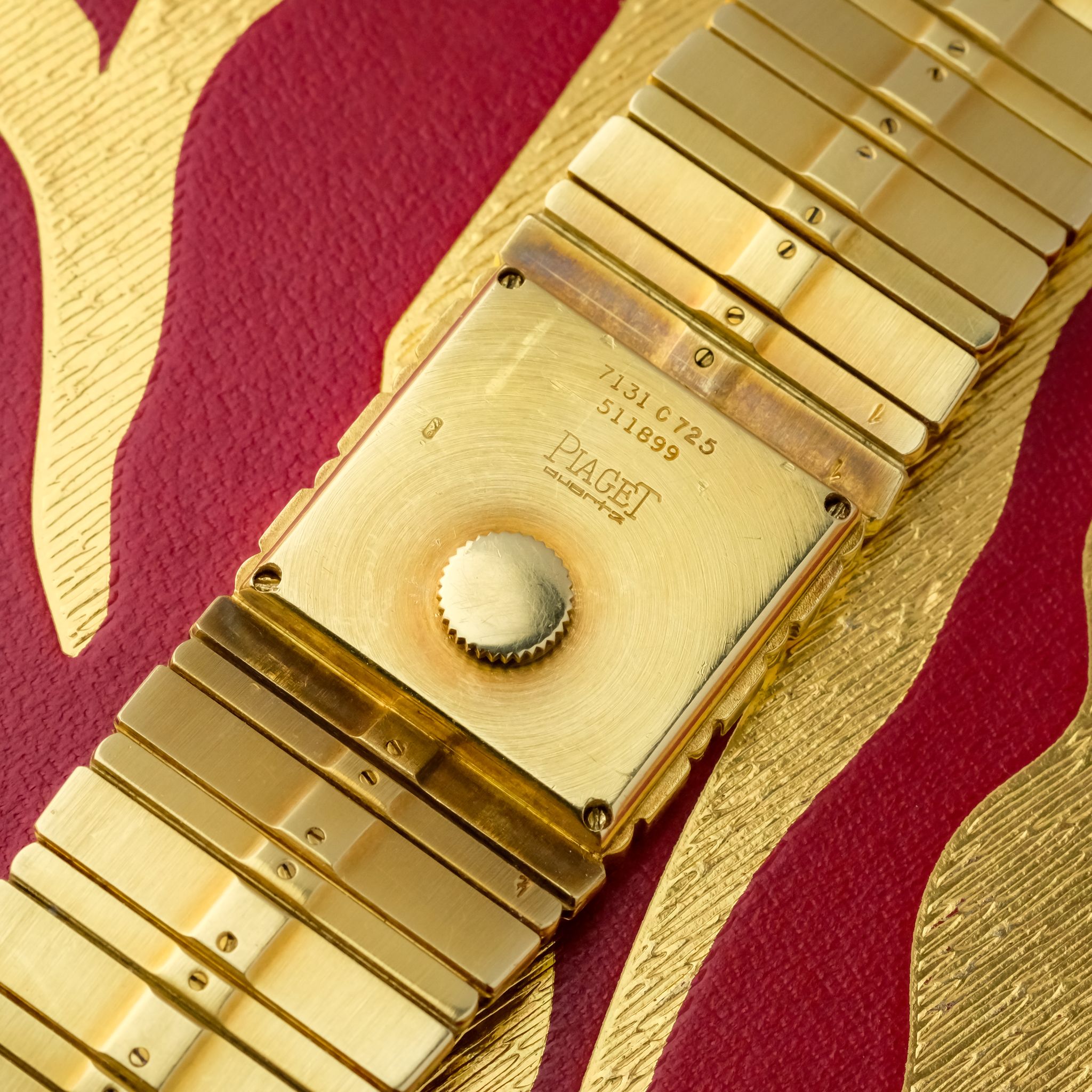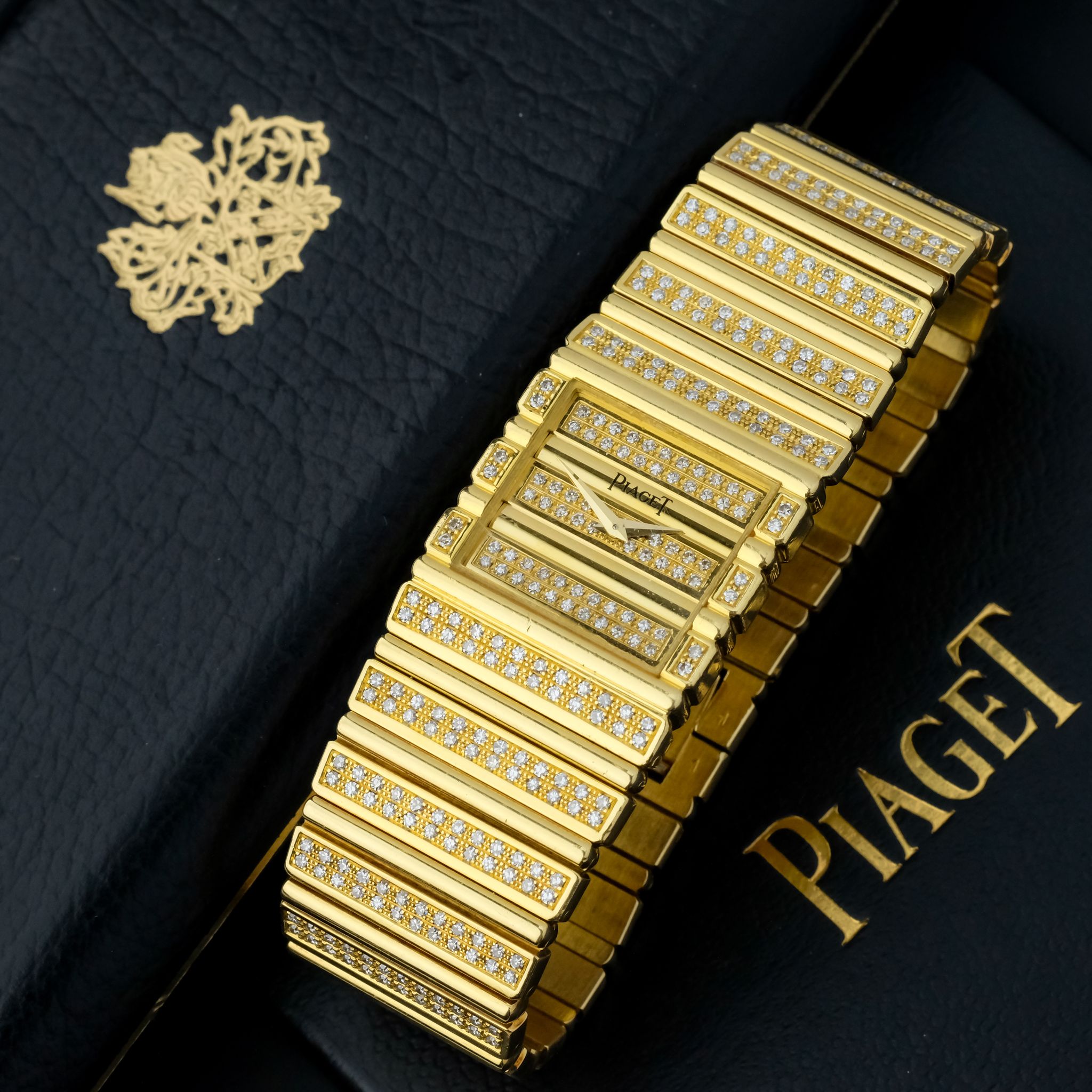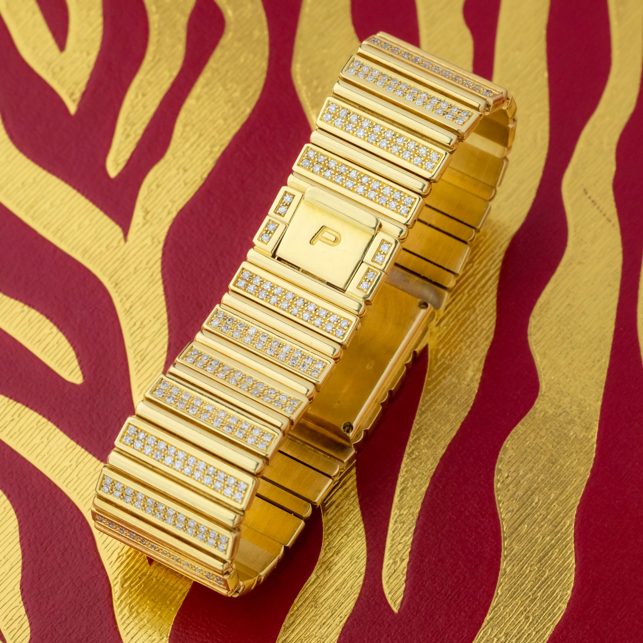 breathtaking full factory diamond set Piaget Polo “Cuff” ref. 7131 in great condition. The whole flat links of the case as well as dial have been factory set with highest great brillant cut diamonds, the factory setting is proved by the last four digits C725 of the reference number. The case is in very good condition and it appears like the whole watch has only been worn rarely.