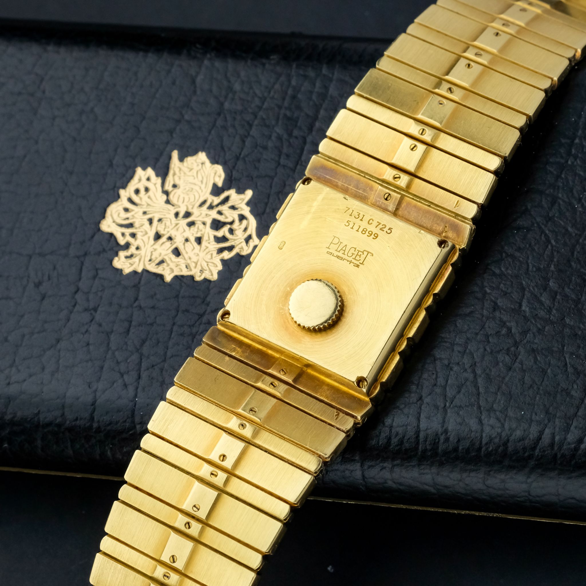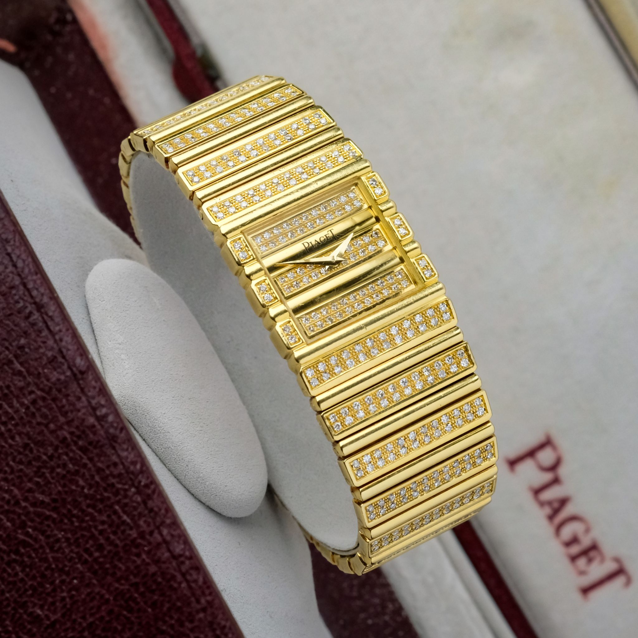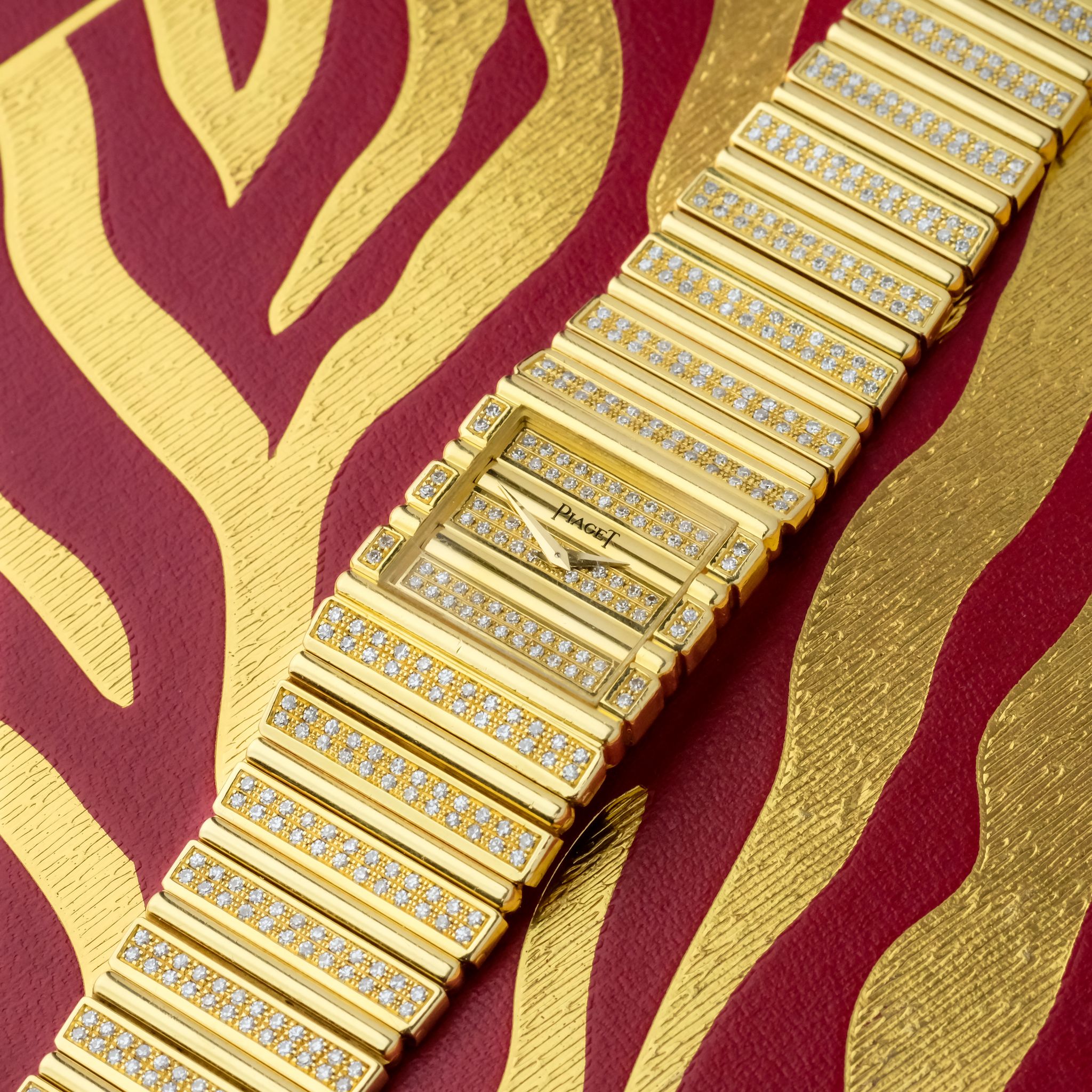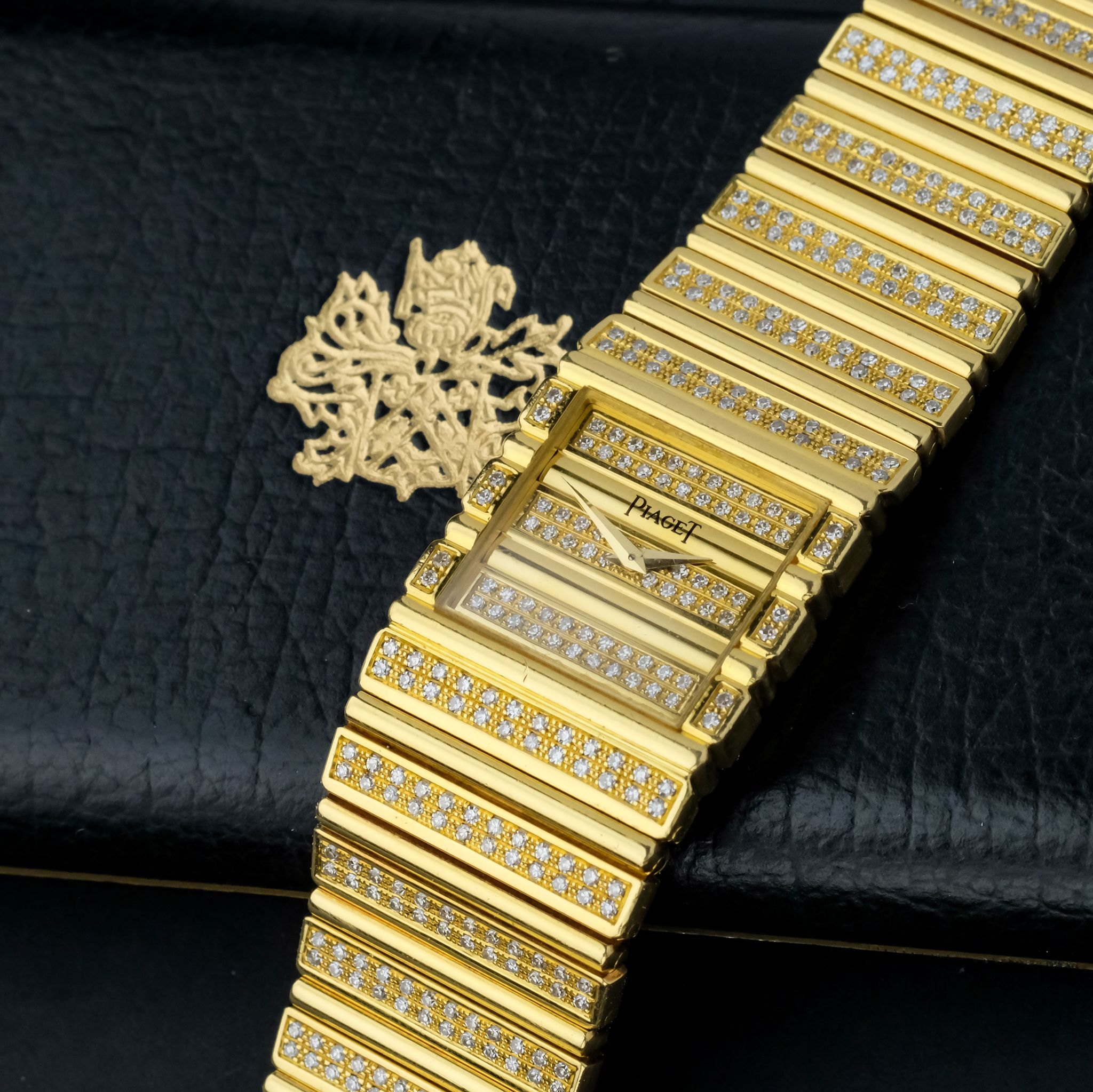 breathtaking full factory diamond set Piaget Polo “Cuff” ref. 7131 in great condition. The whole flat links of the case as well as dial have been factory set with highest great brillant cut diamonds, the factory setting is proved by the last four digits C725 of the reference number. The case is in very good condition and it appears like the whole watch has only been worn rarely.