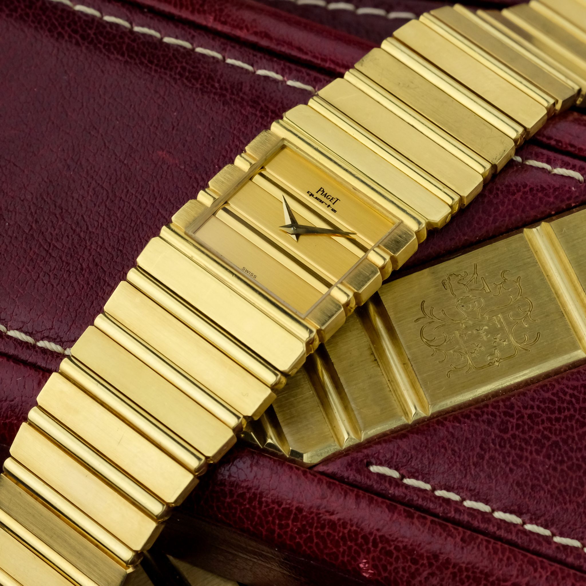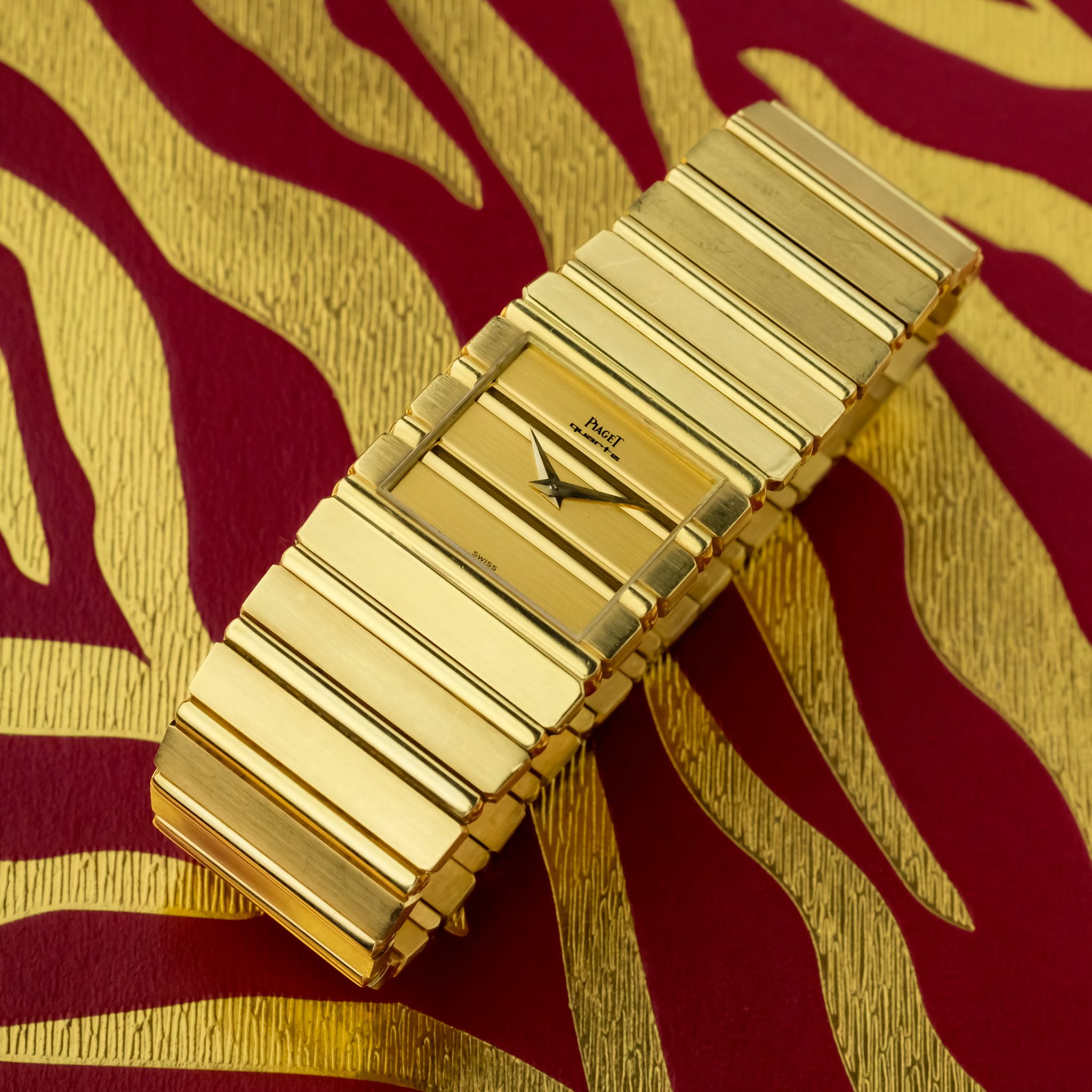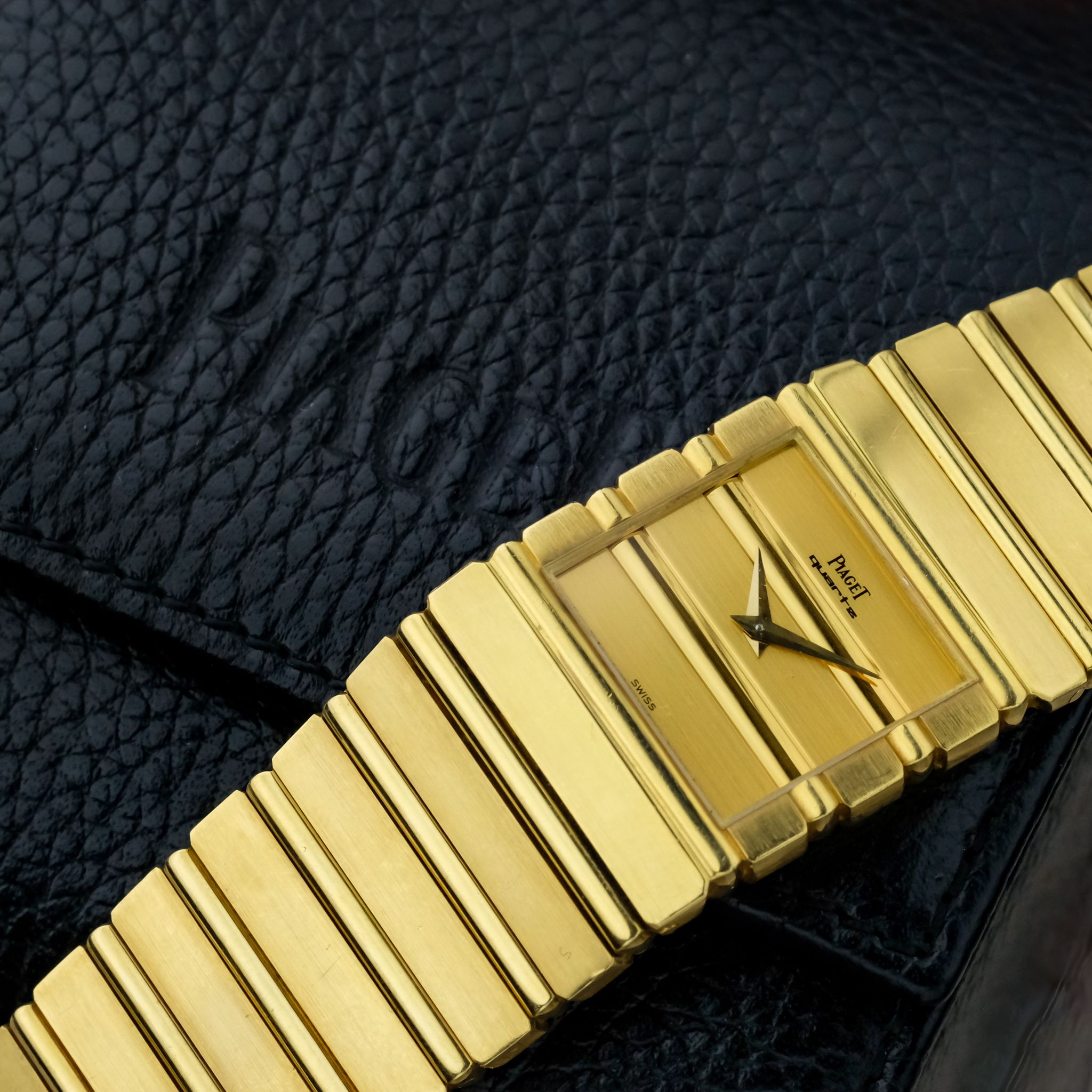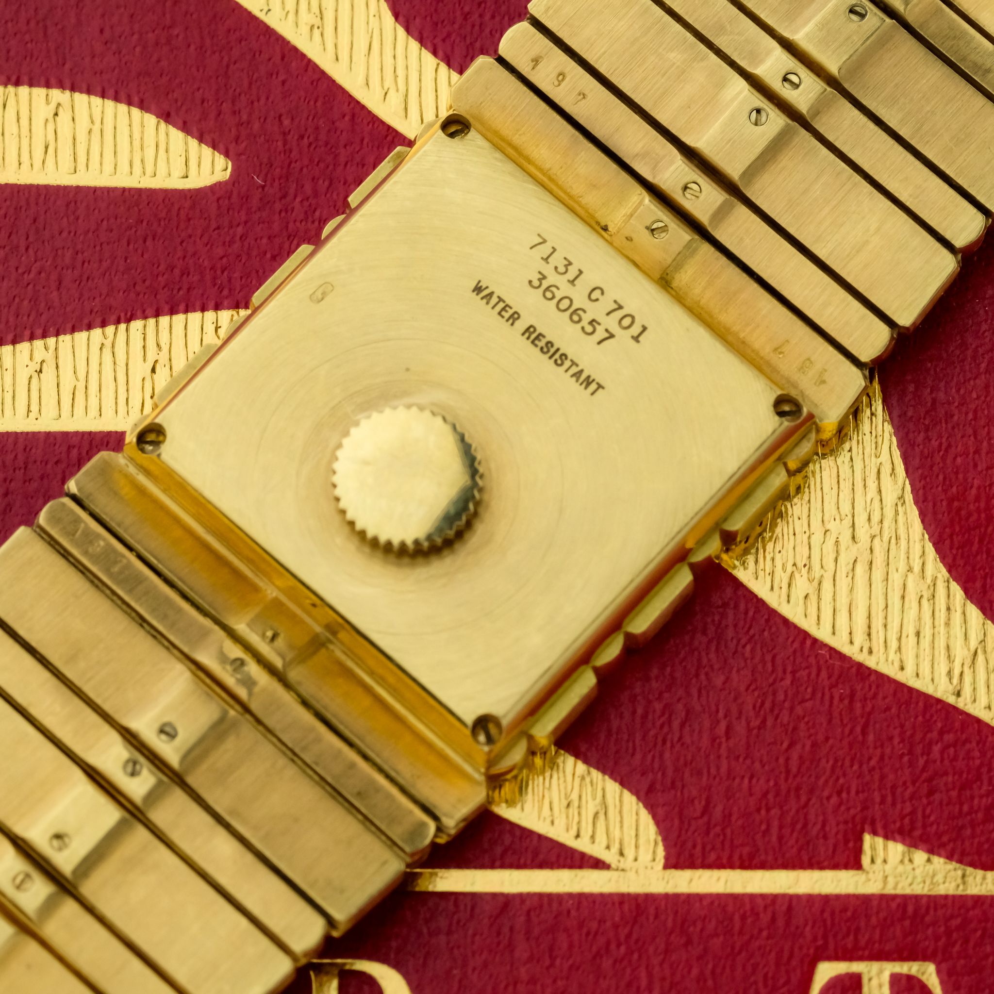 Beautiful and increasingly rare to find square Piaget Polo "cuff" ref. 7131 in good, unpolished condition and with the beloved "gadroon dial.