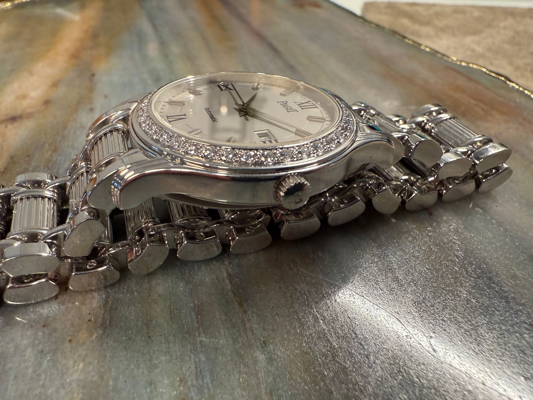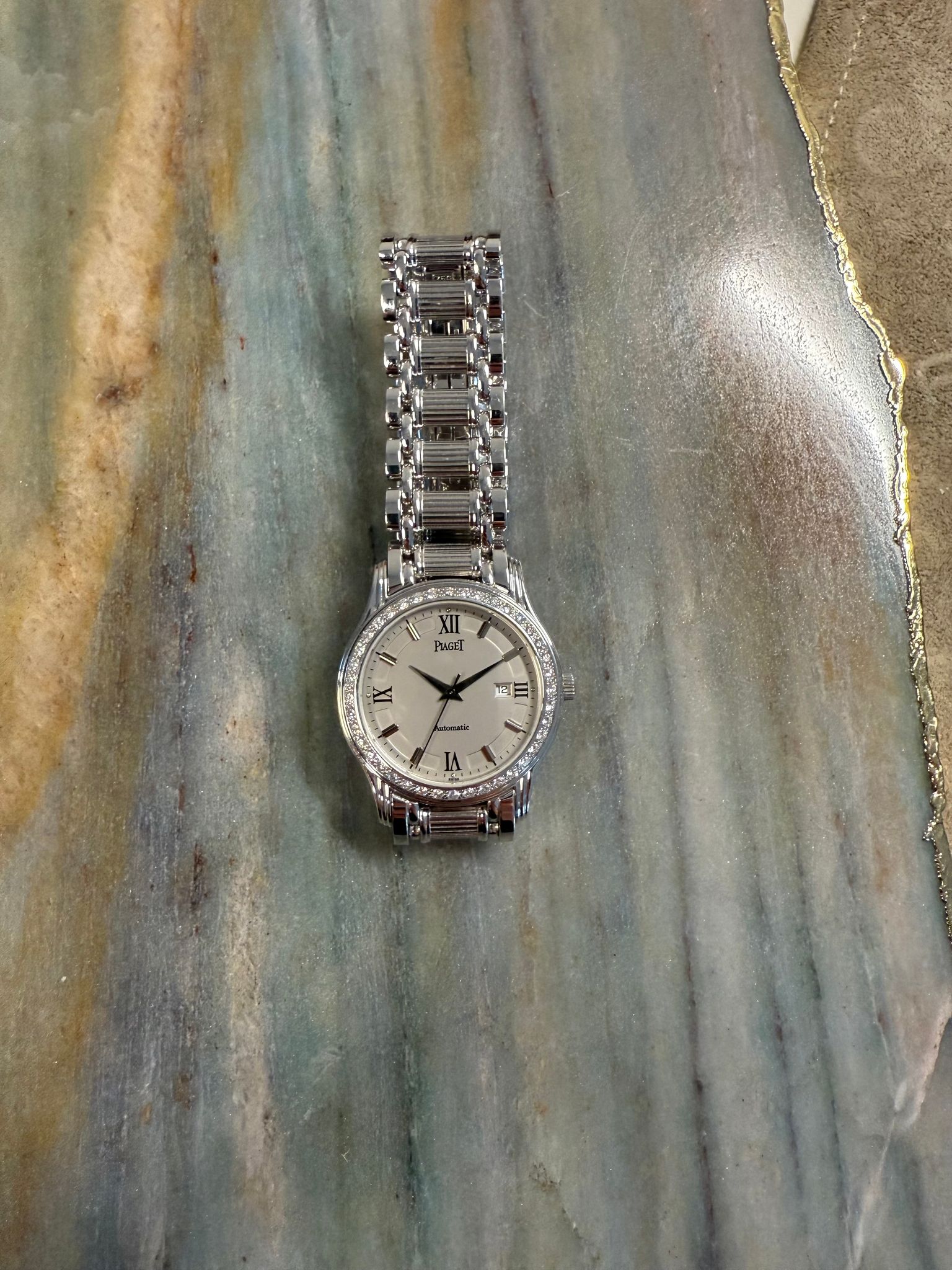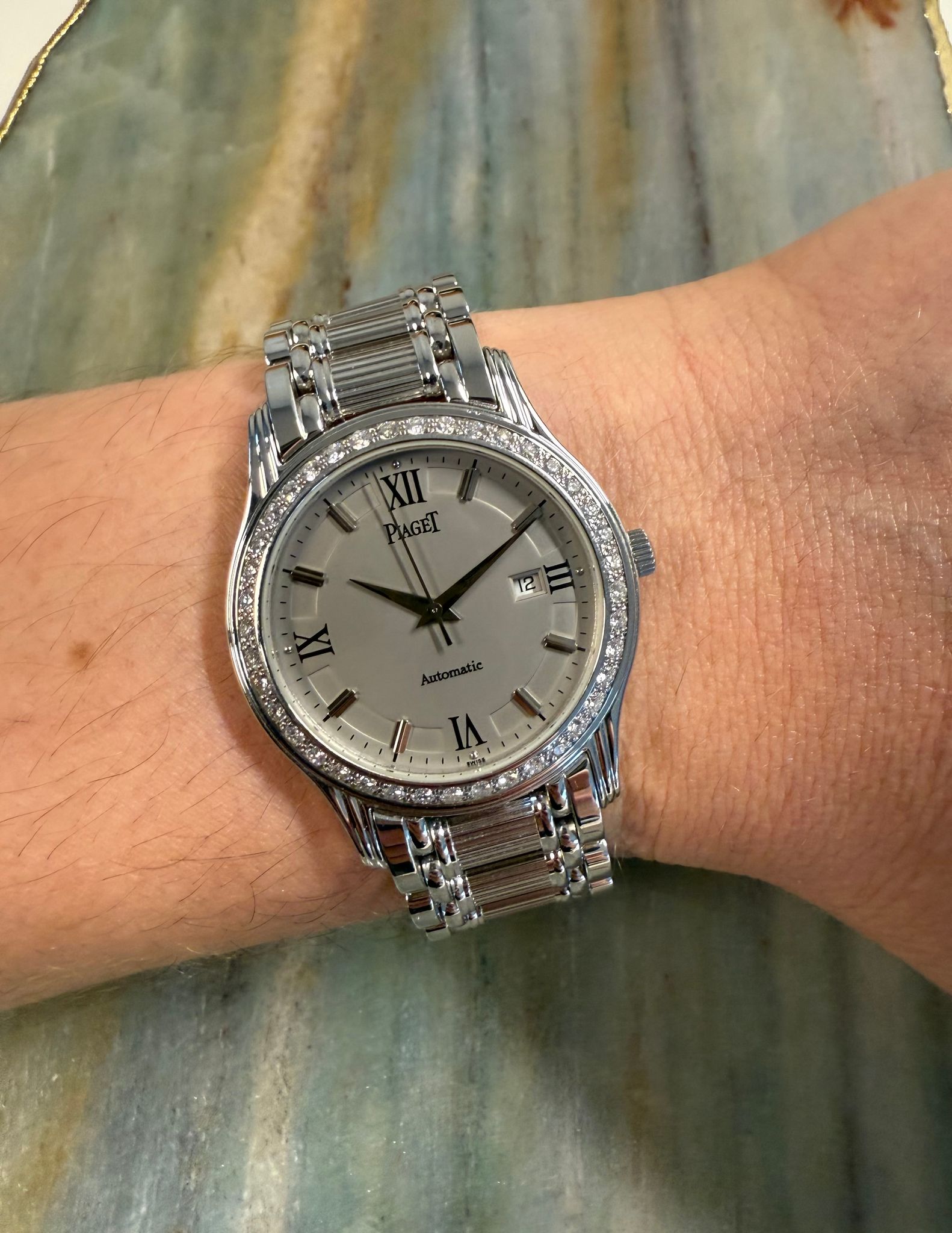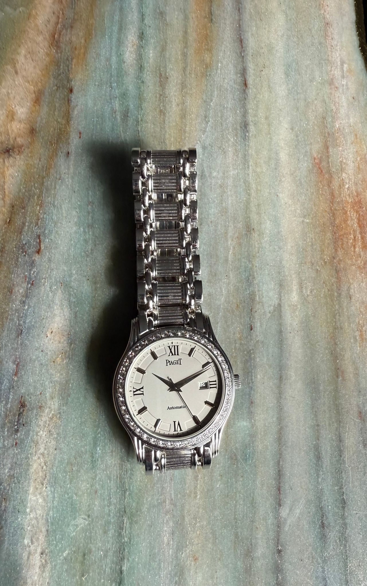 Iconic, classic, and bold. All great descriptors for this striking Piaget Polo. Over time the Polo collection experienced many alterations, tweaks and redesigns. To us, a round Polo is a wonderful choice. The size, shape and proportions make this a wonderful and comfortable watch. We adore the bracelet links design as it echos the quality of a bygone era with a modern flair. It is a work of art. The styling and proportions are perfect. It stands out. It challenges convention. It is neo-vintage from the 1990s, but feels so right today. We love the incredible diamond bezel. Includes a letter of authenticity from Veralet.