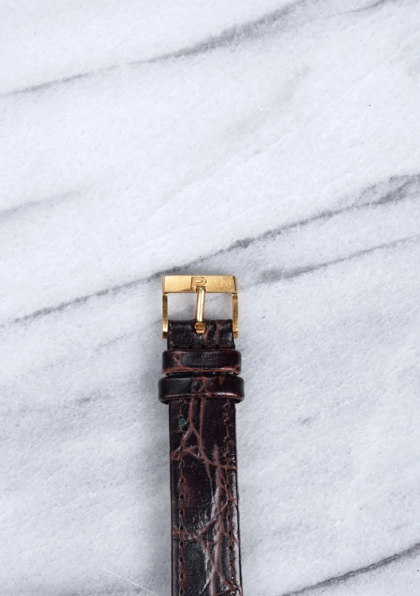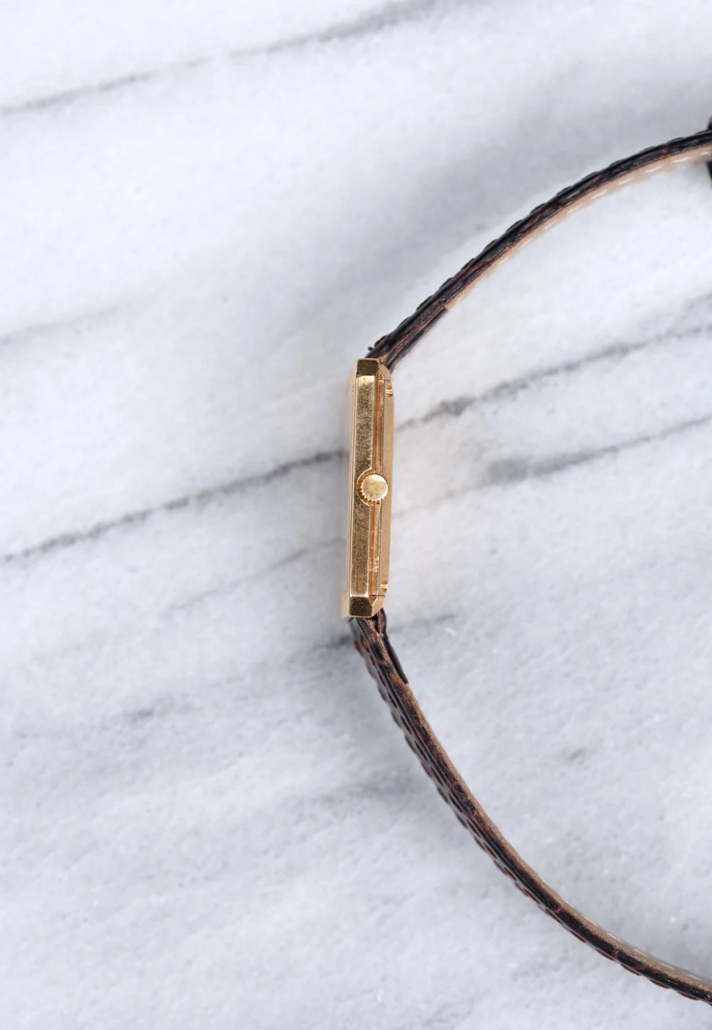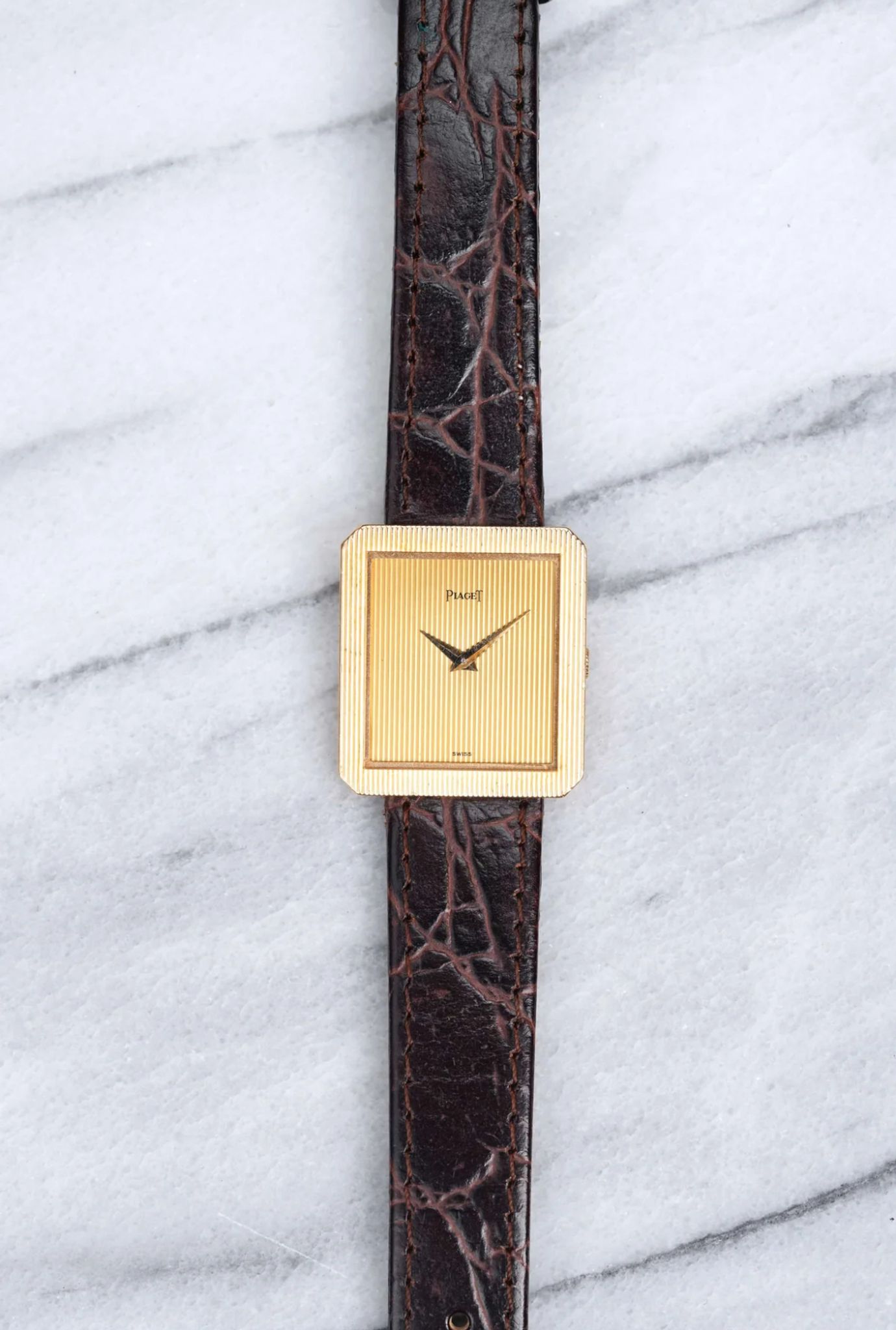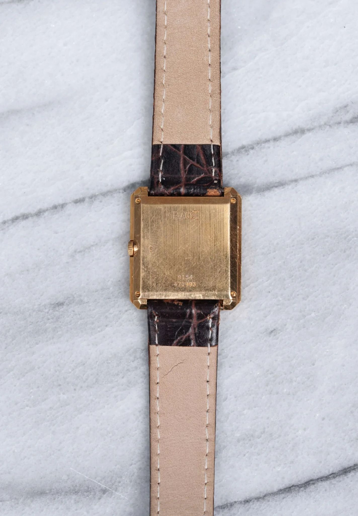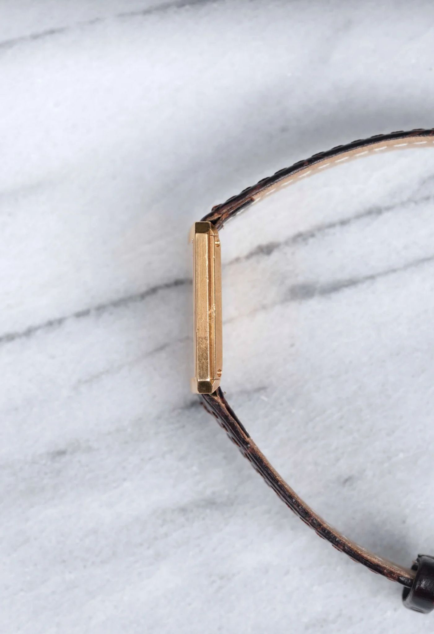 Here's a vintage Piaget tank manual wind in 18K yellow gold with a champagne tapestry dial from the late 1970s, early 1980s. Recently serviced! Keeps great time and is fully functional. Measurements include a 27x25mm tank case size and 18mm lug width. It's on an aftermarket brown leather strap with a signed solid gold buckle. Time only. Gold case and screw down caseback. Caliber 19J mechanical movement. The dial and crystal is free from any scratches or marks. All parts are original including the dial, crown, movement, and caseback. Both the dial and case are in great cosmetic, untouched condition.
