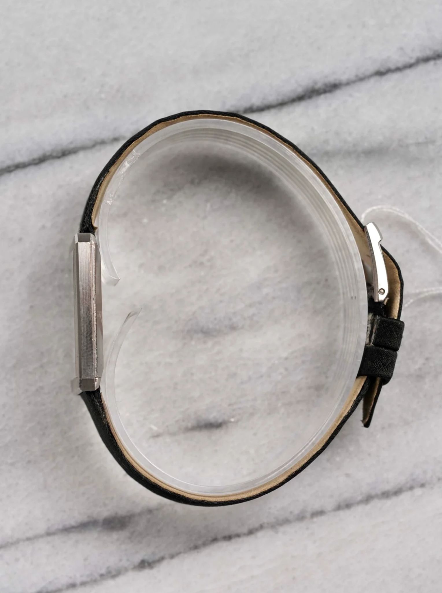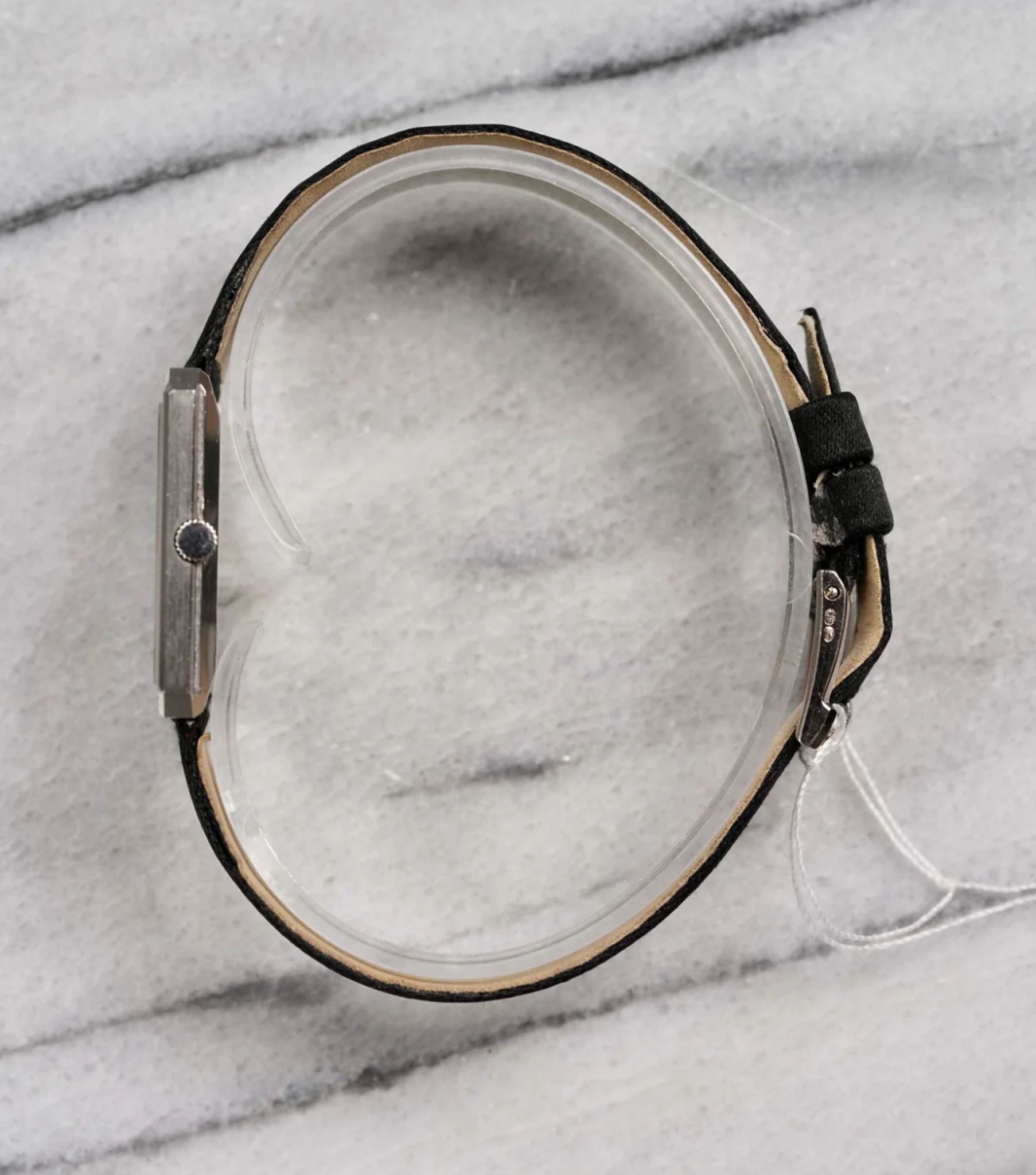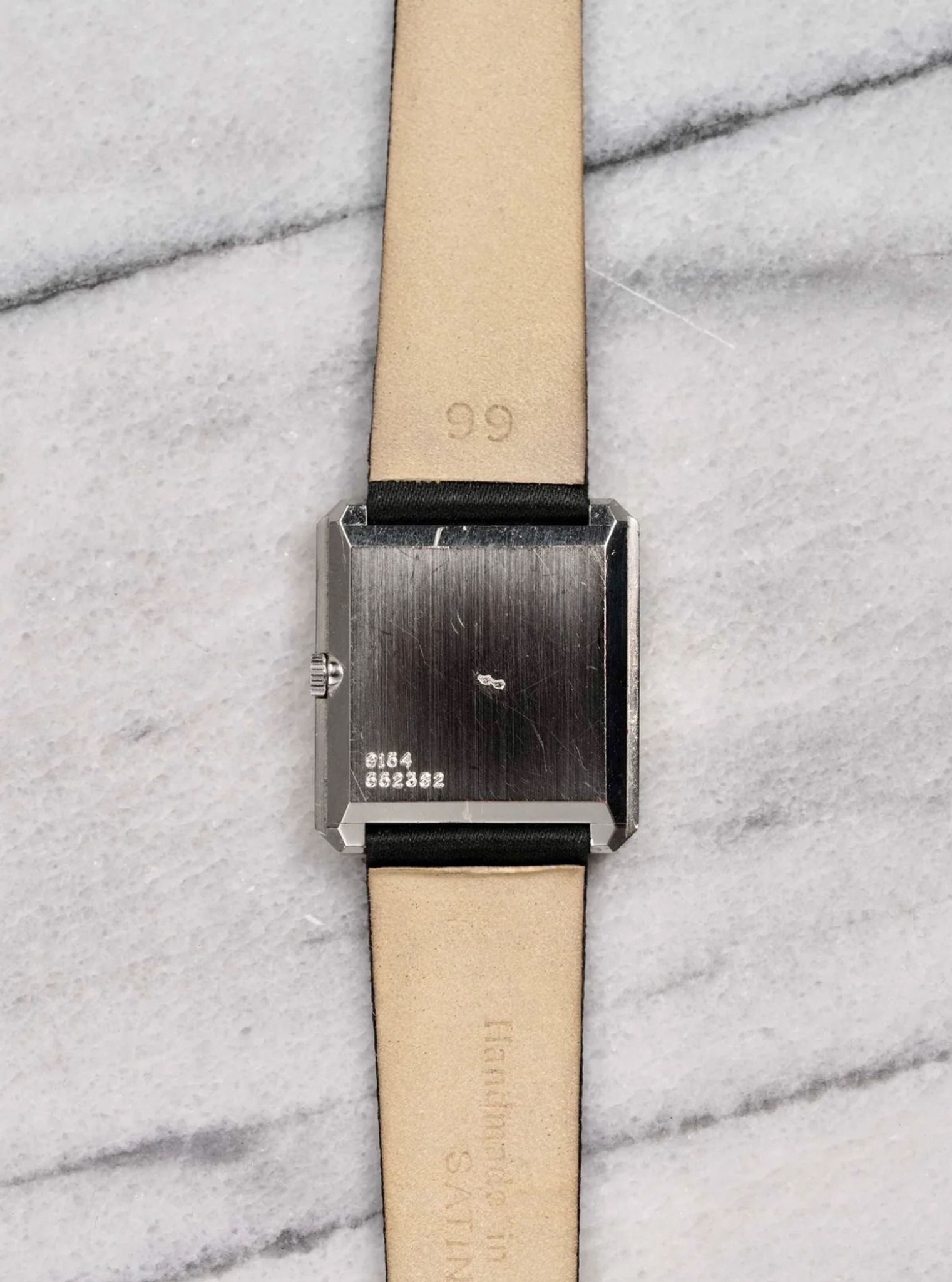 Here's a vintage Piaget tank manual wind in 18K yellow gold with a factory mother of pearl and onyx dial from the 80s. Keeps great time and is fully functional. Measurements include a 27x25mm tank case size and 18mm lug width. It's on a black suede leather strap with matching white gold buckle that compliments the watch really well. Time only. Reference 9154 with serial #:662382. Time only. Gold case and screw down caseback. Caliber 19J mechanical movement. These tanks are quite uncommon, especially with these rarer dials. The dial and crystal is free from any scratches or marks. All parts are original including the dial, crown, movement, and caseback. Both the dial and case are in great cosmetic, untouched condition.