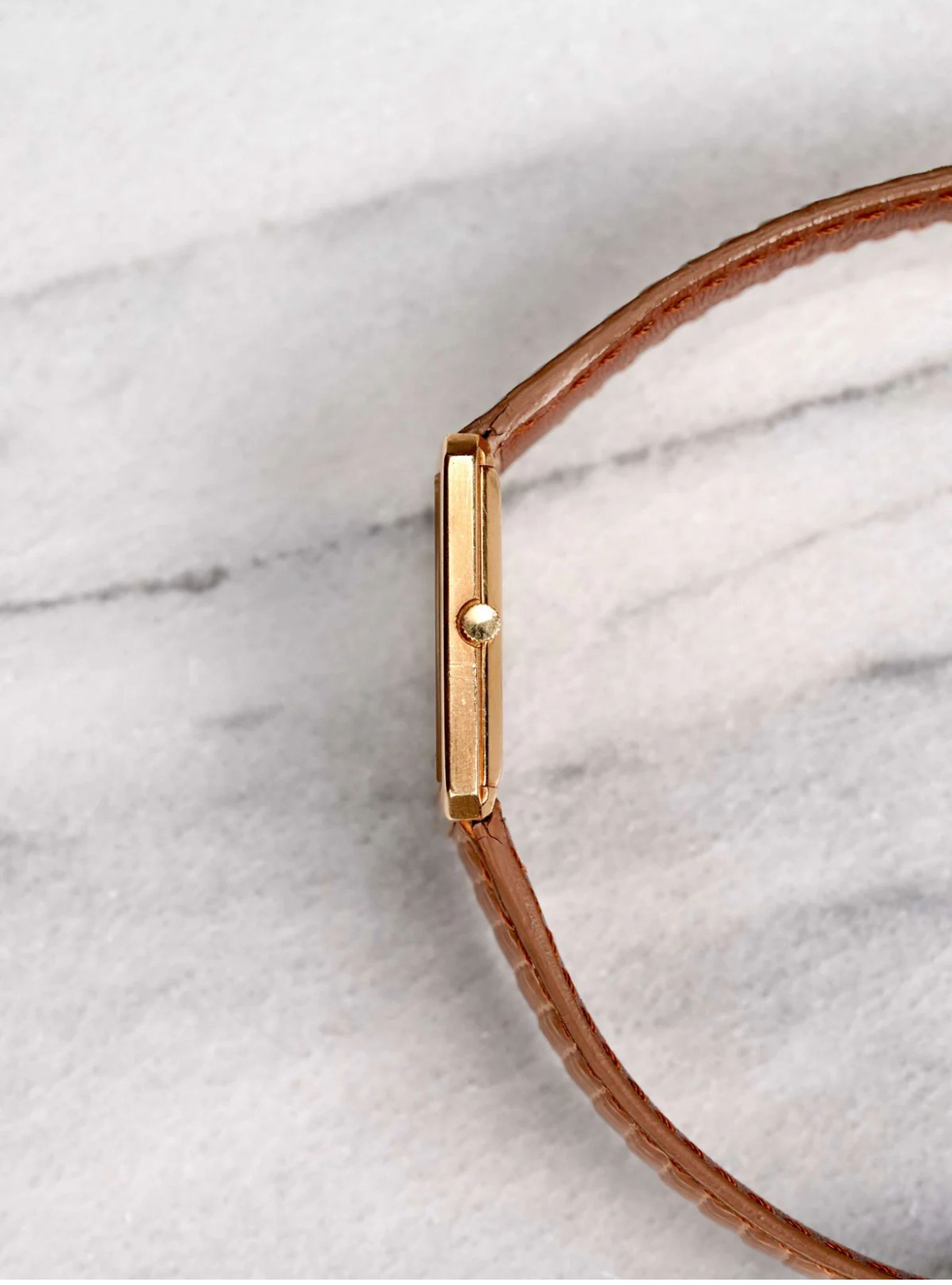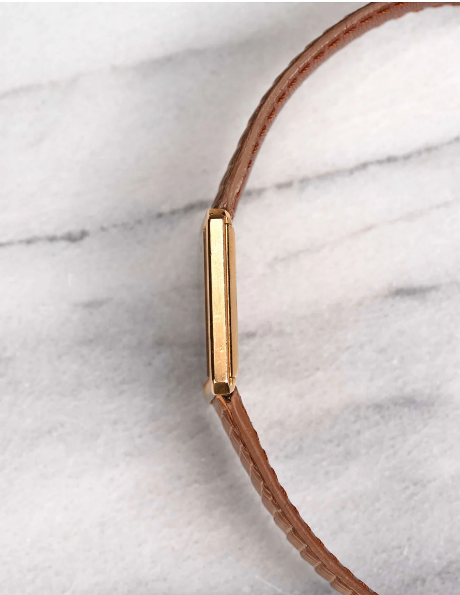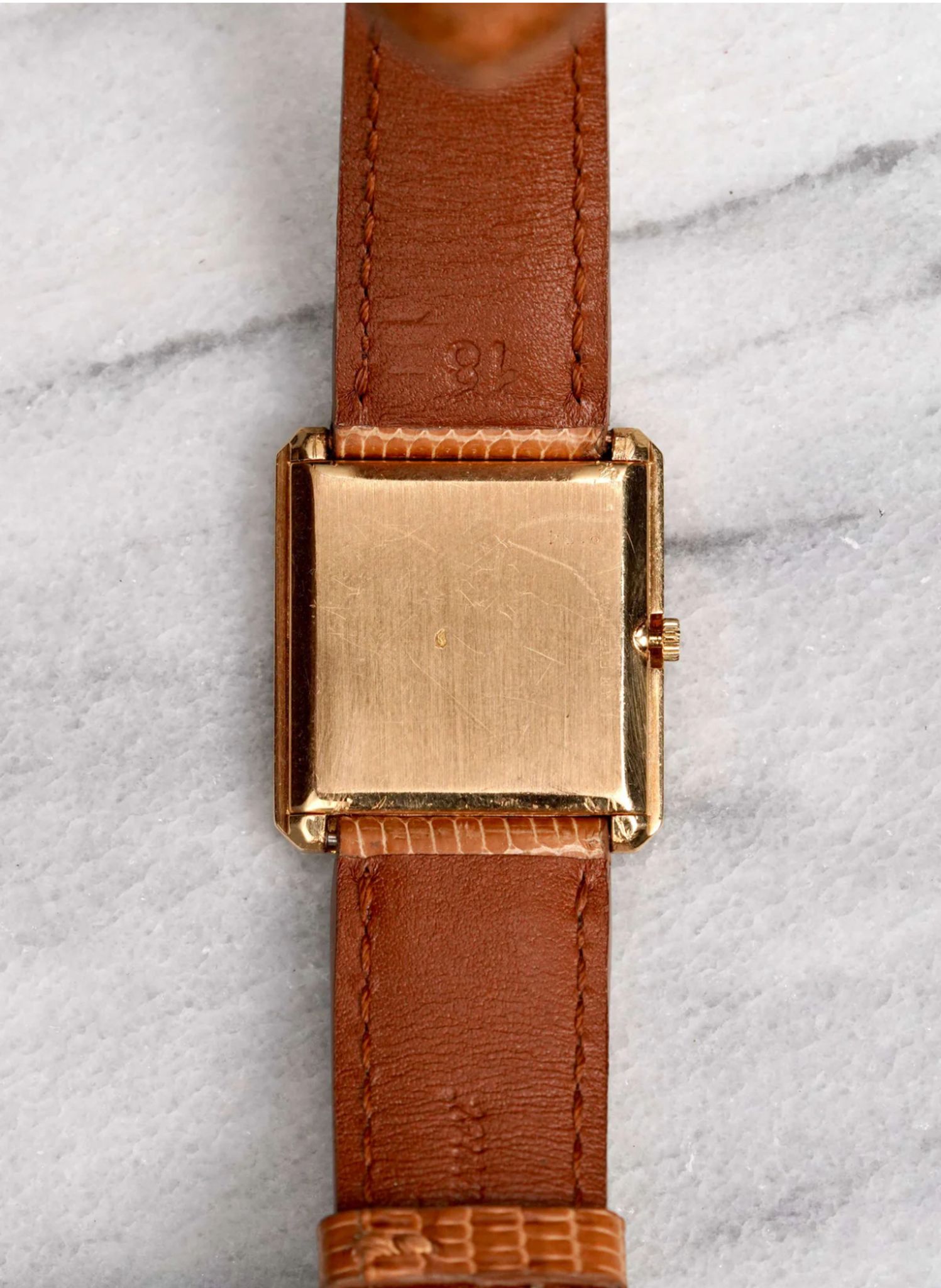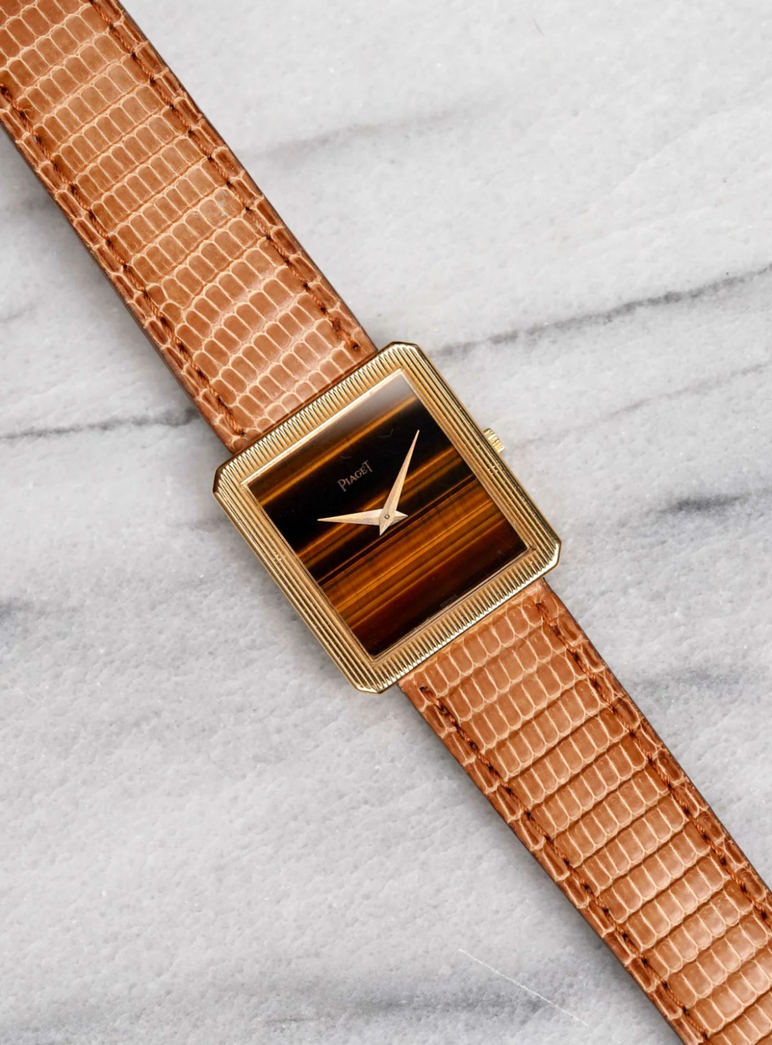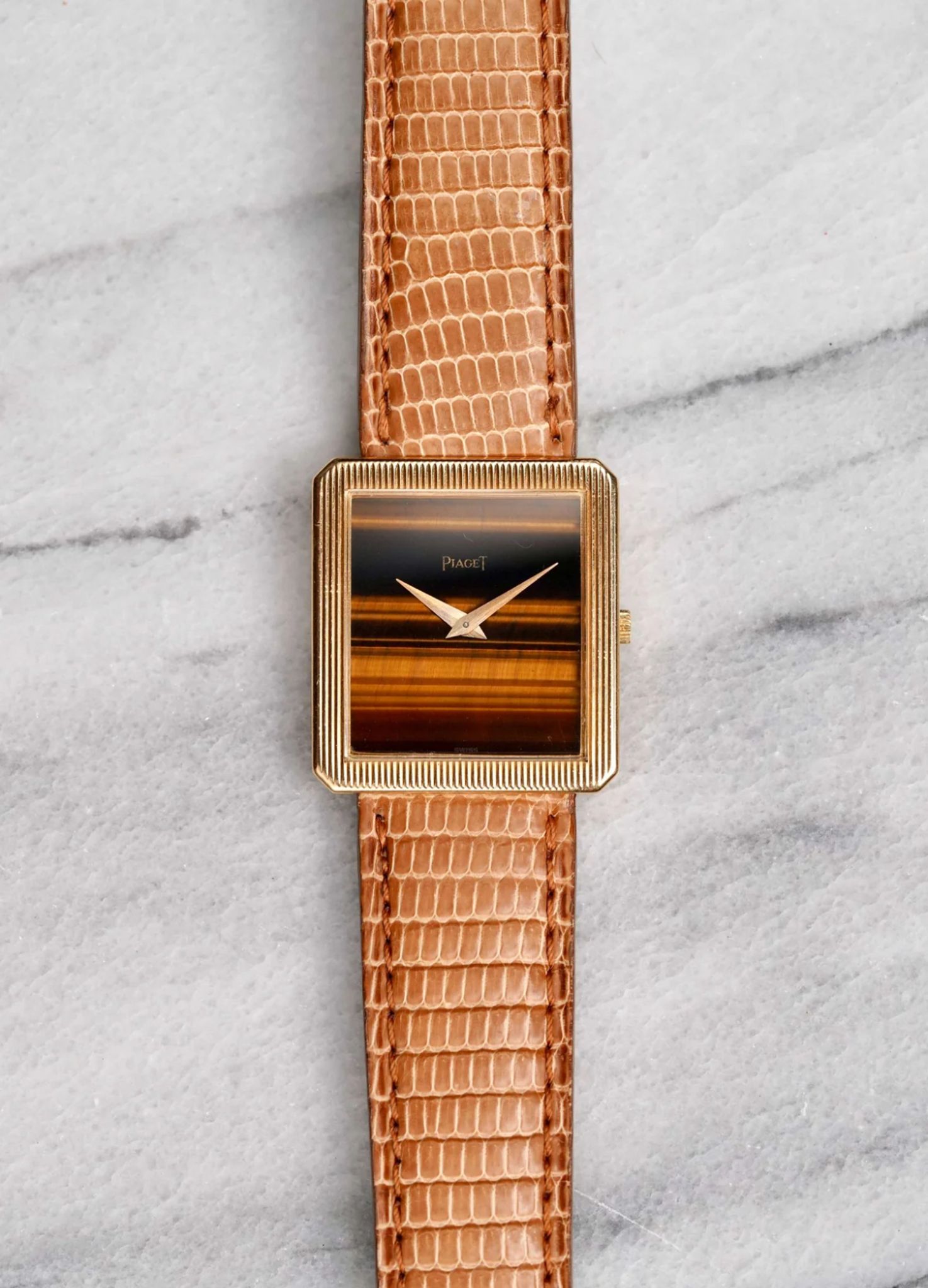 Here's a vintage Piaget tank manual wind in 18K yellow gold with a factory tiger eye dial from the late 1970s, early 1980s. Recently serviced! Keeps great time and is fully functional. Measurements include a 27x25mm tank case size and 18mm lug width. It's on an aftermarket brown lizard leather strap. Time only. Gold case and screw down caseback. Caliber 19J mechanical movement. These tanks are quite uncommon, especially with these rarer stone dials. The dial and crystal is free from any scratches or marks. All parts are original including the dial, crown, movement, and caseback. Both the dial and case are in great cosmetic, untouched condition