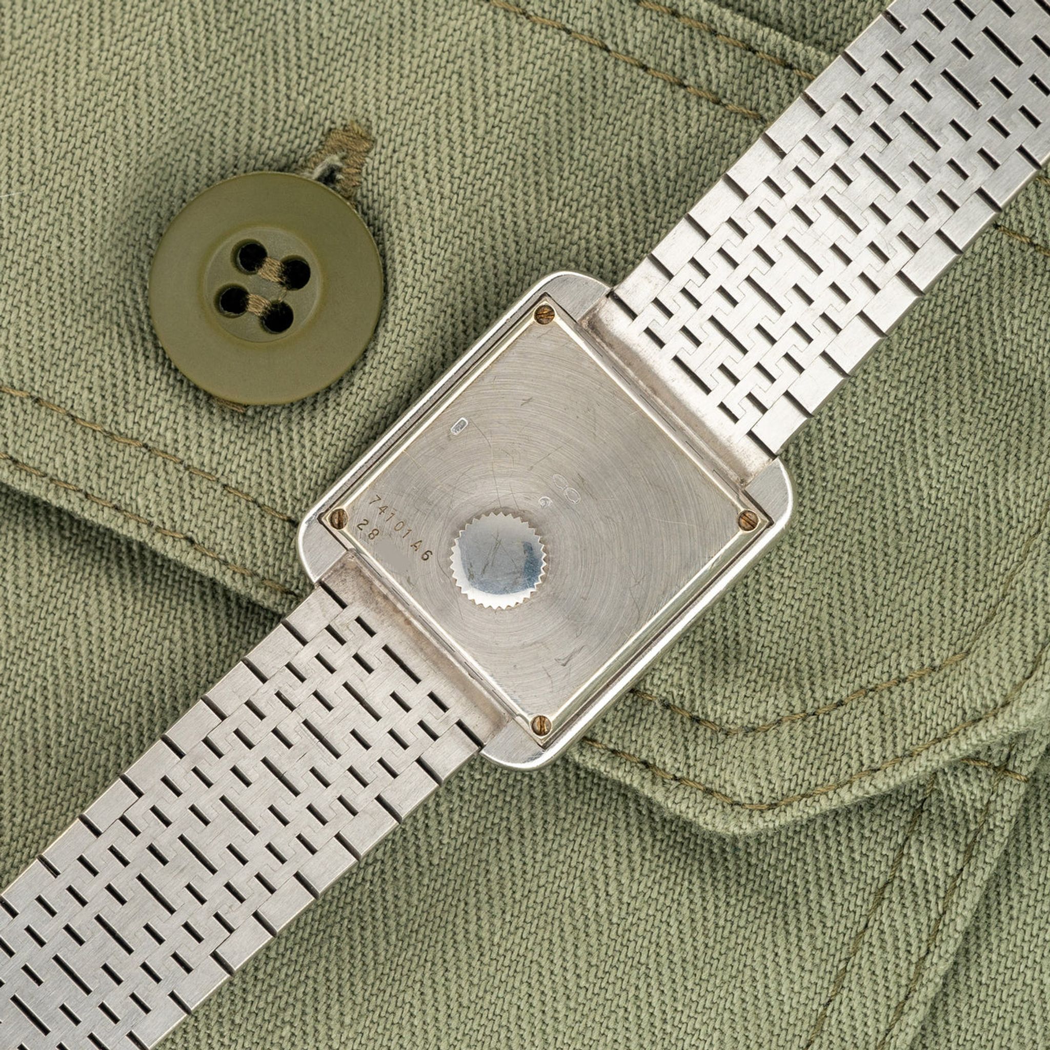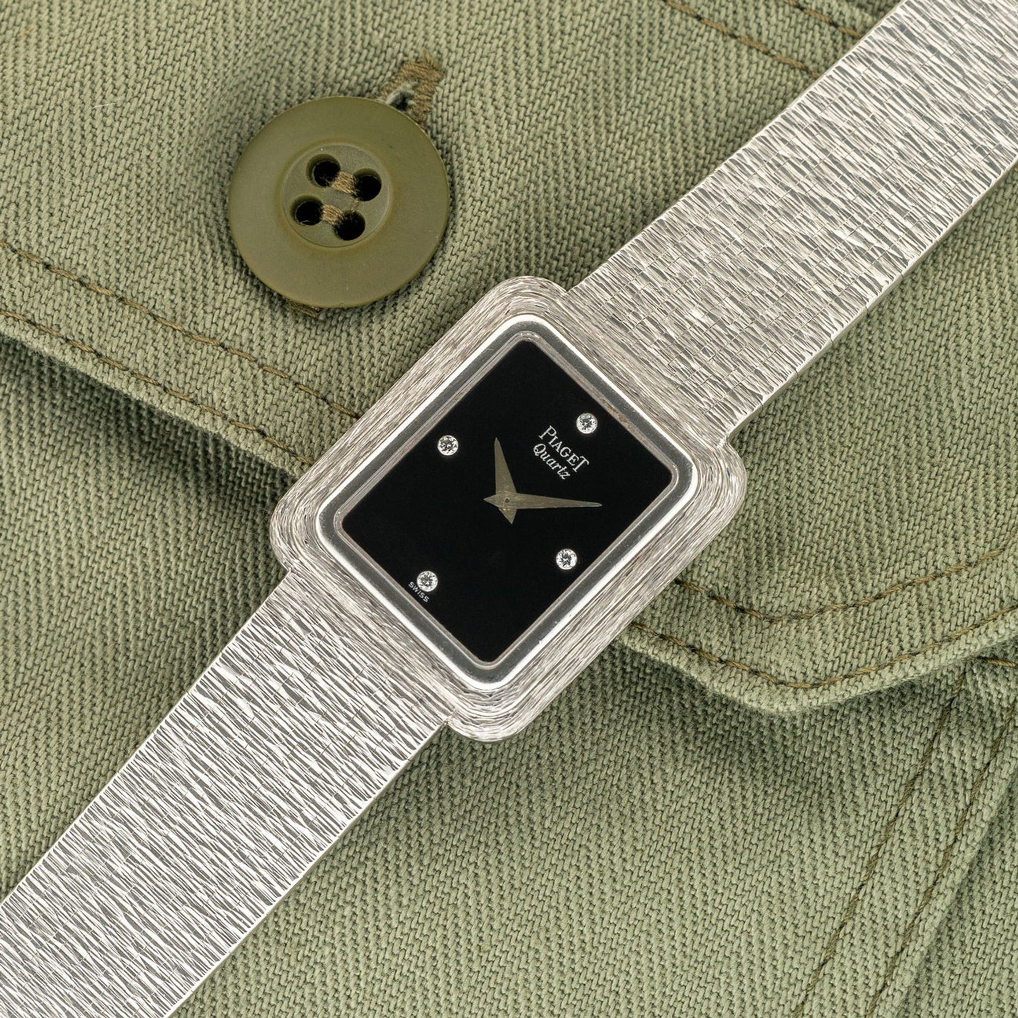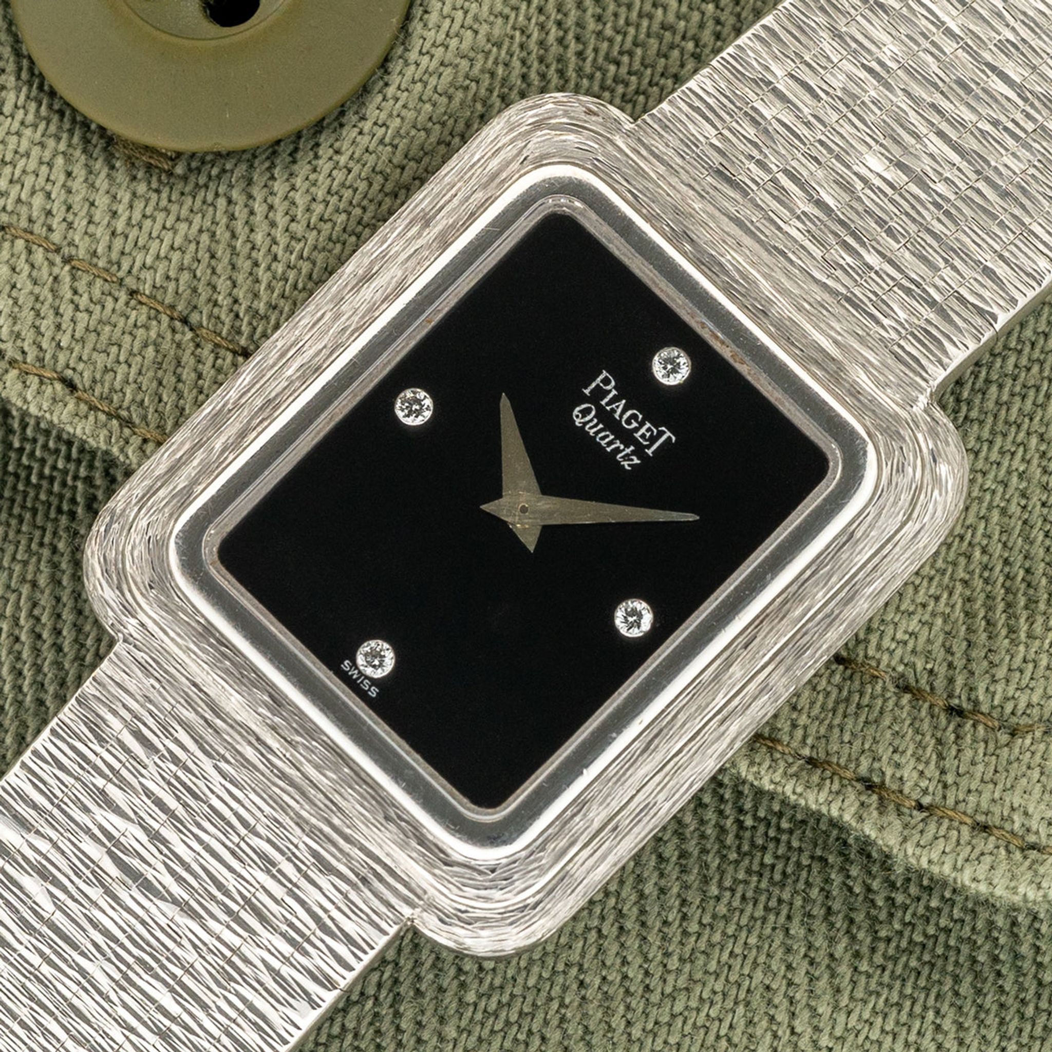 Here we have a gorgeous 18k white gold Piaget reference 74101 with circa 1980s. The case and bracelet have a "hammered" artisanal finish giving it a monochromatic appearance. The factory black onyx and diamond dial contrasts well against the case and remains in fantastic condition, without any chips or cracks. The case and bracelet are also in fantastic and untouched condition with only light signs of wear. At 25.5mm by 30mm, we believe this piece is equally well suited for anyone, male or female. If you've been looking for a unique Piaget on bracelet we believe this solid gold piece offers excellent value and look stunning on wrist.