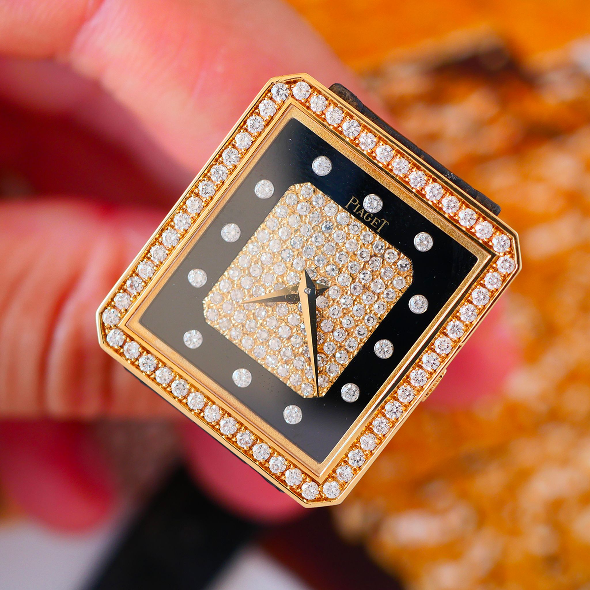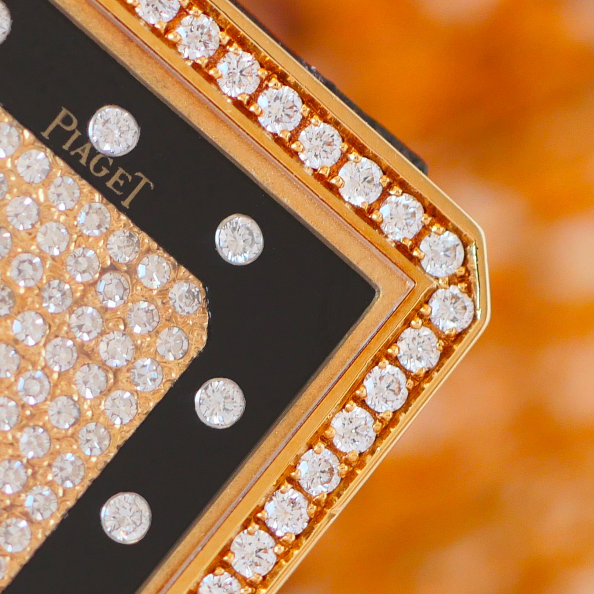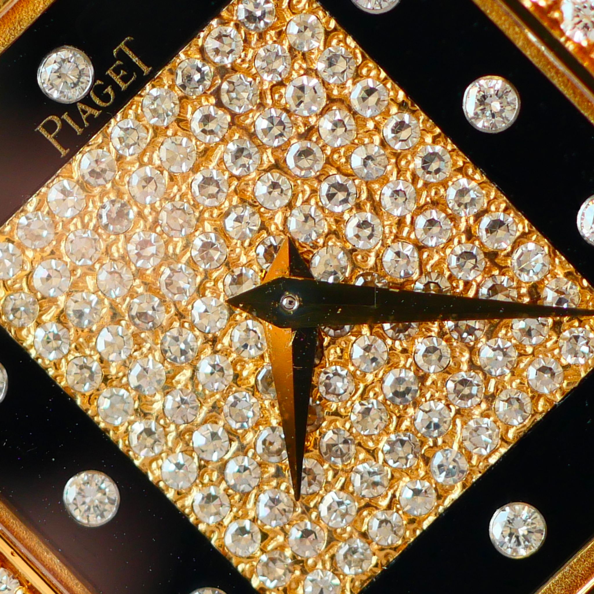If you want to go for something different from the classic Piaget Protocole, we clearly have just the thing with this one. In exceptional condition, this 18k yellow gold Piaget is a prime example of what Piaget did best in the 70s and 80s. With a diamond bezel and a diamond-paved dial framed by onyx, this configuration is simply perfect.
