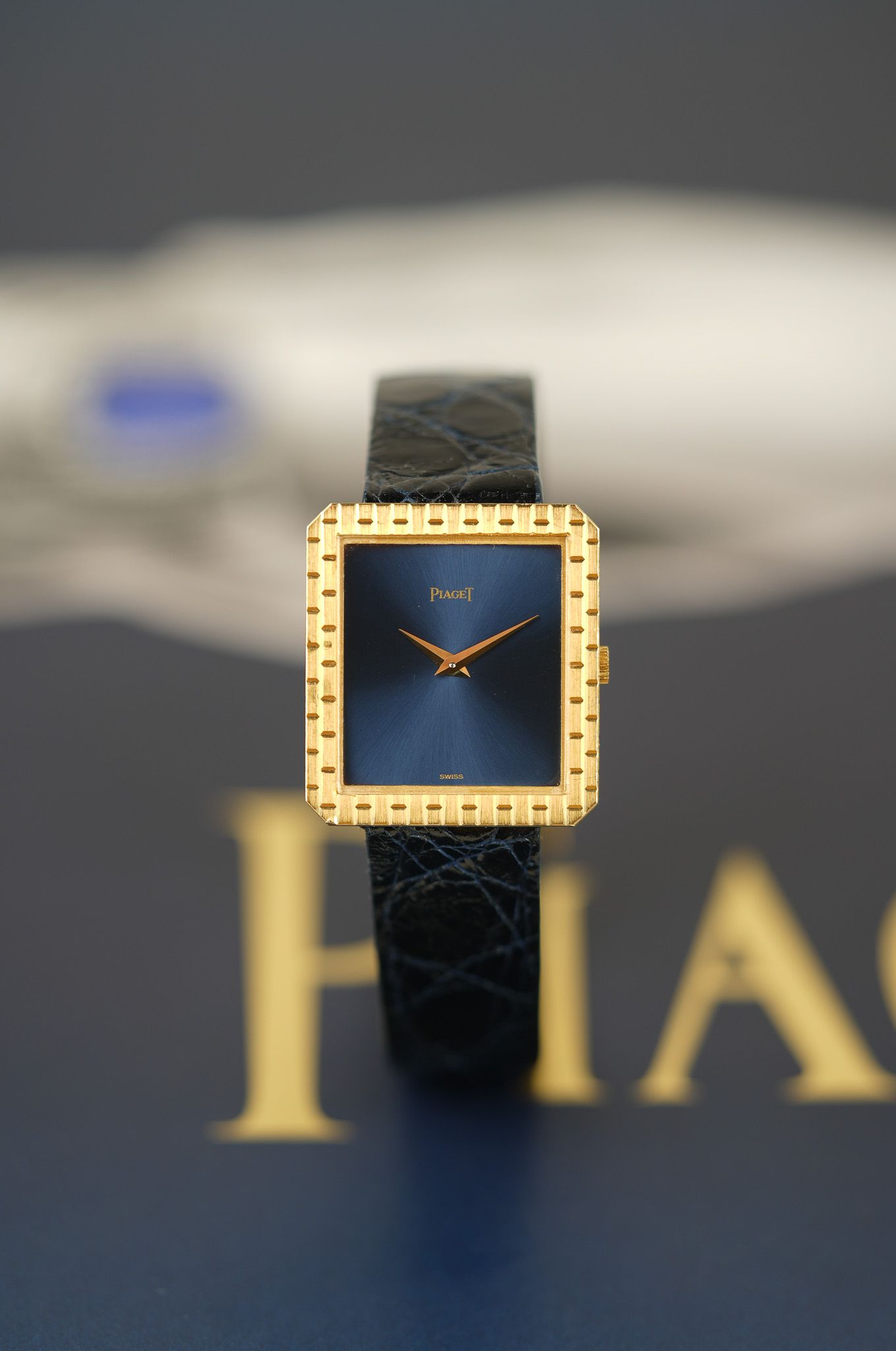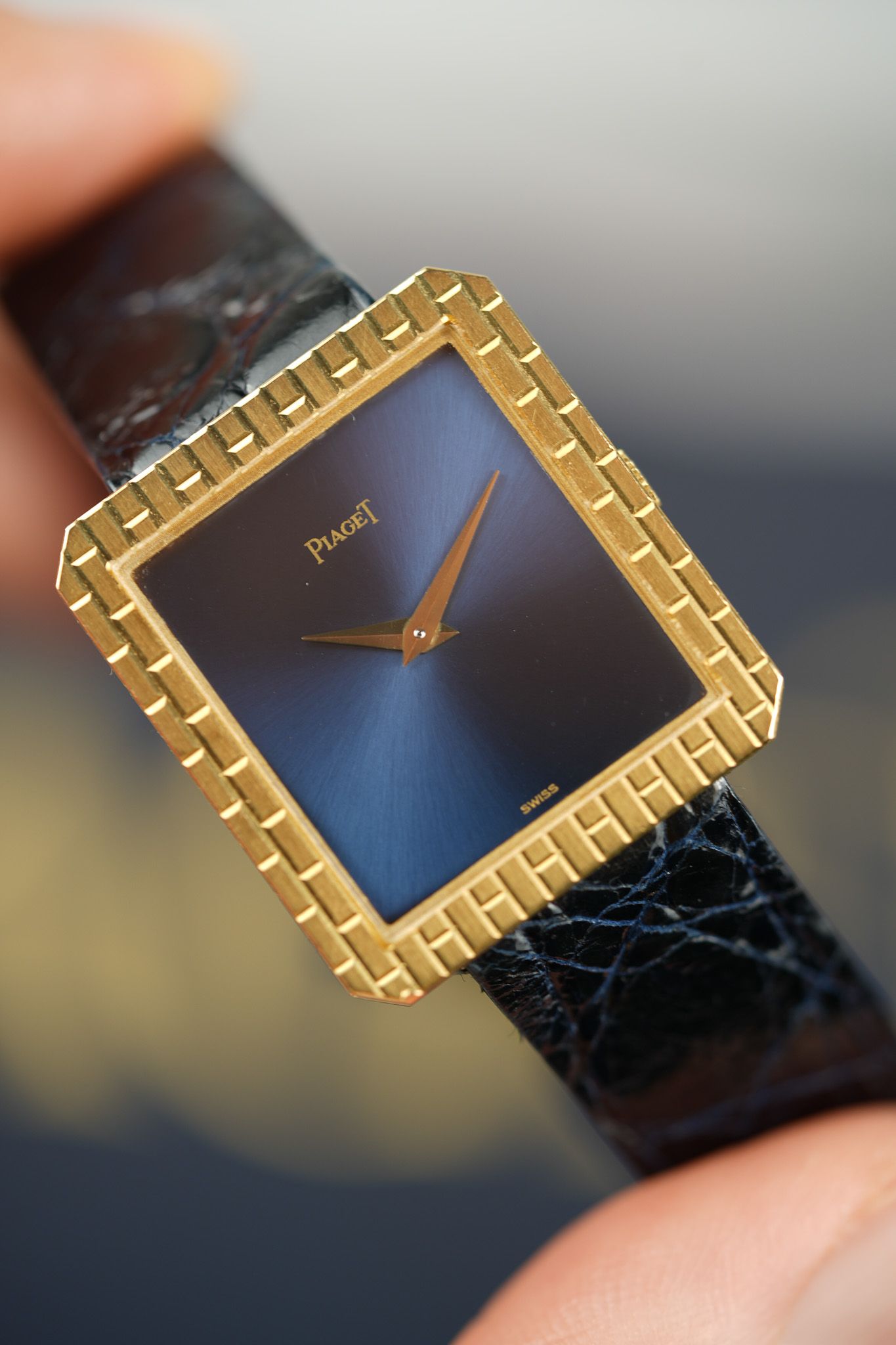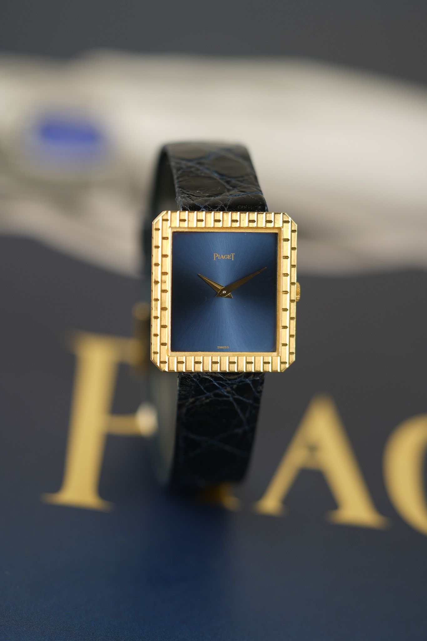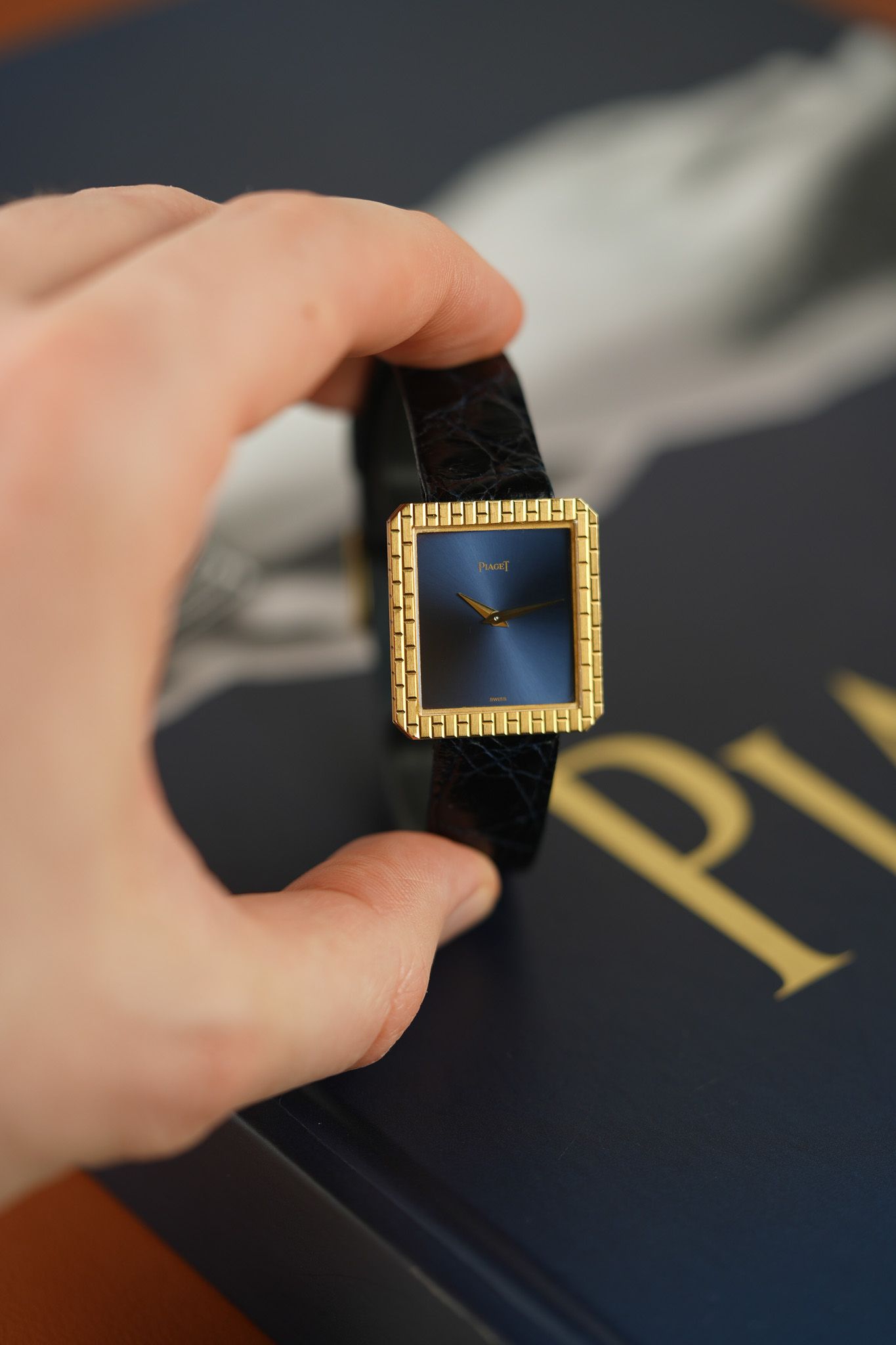 A sapphire crystal protects the dial, while a dark blue crocodile strap with an original 18K Piaget buckle ties the whole look together. The strap echoes the dial’s tones, making the watch feel cohesive and refined.