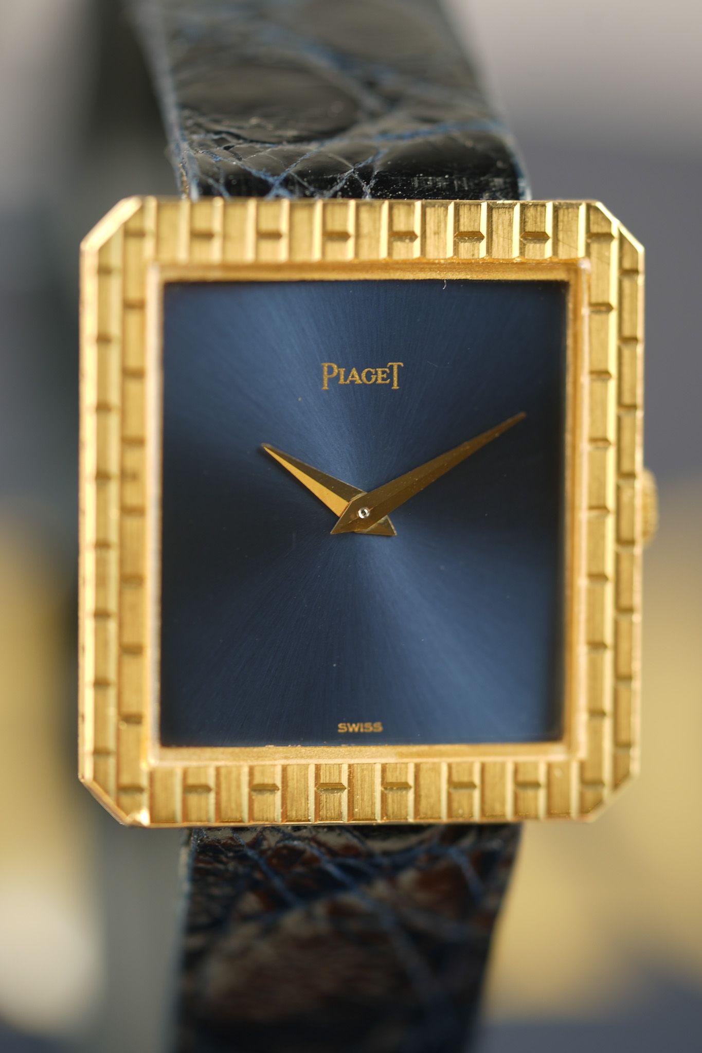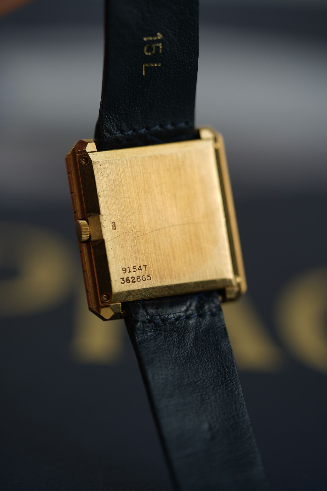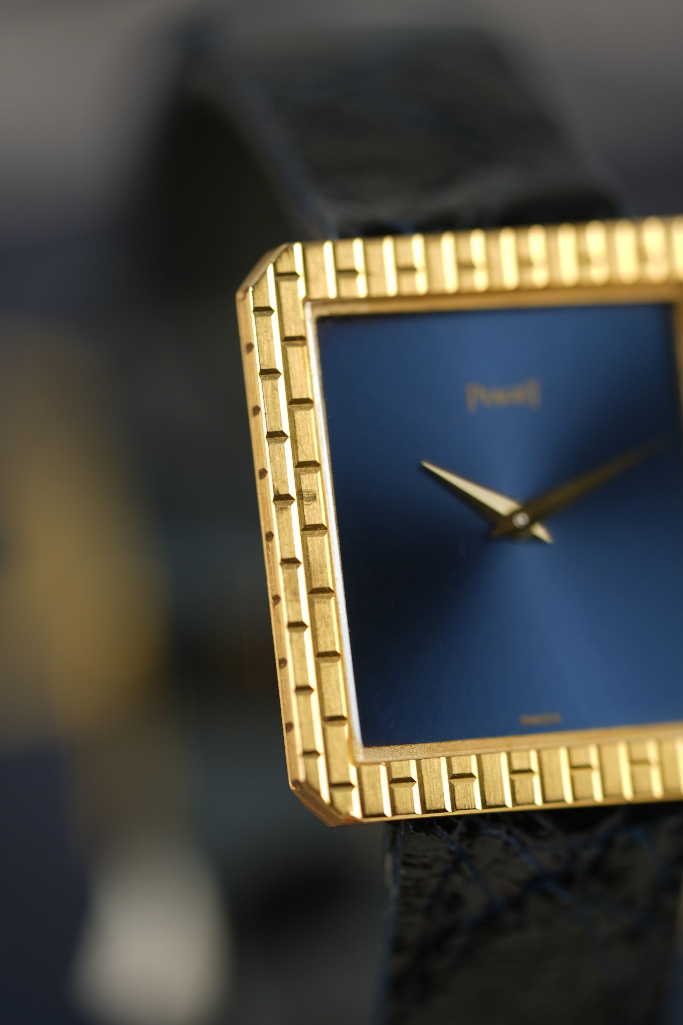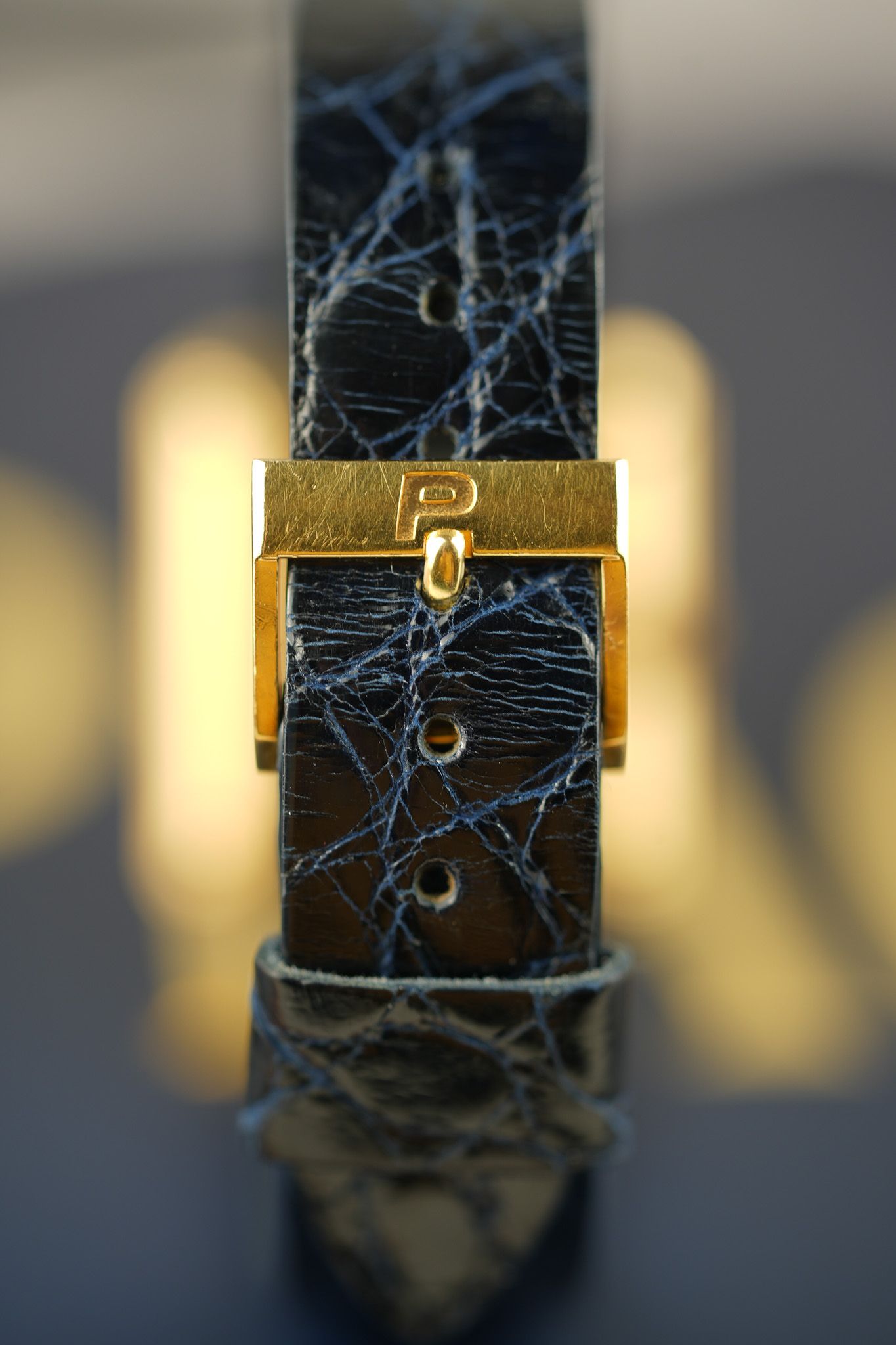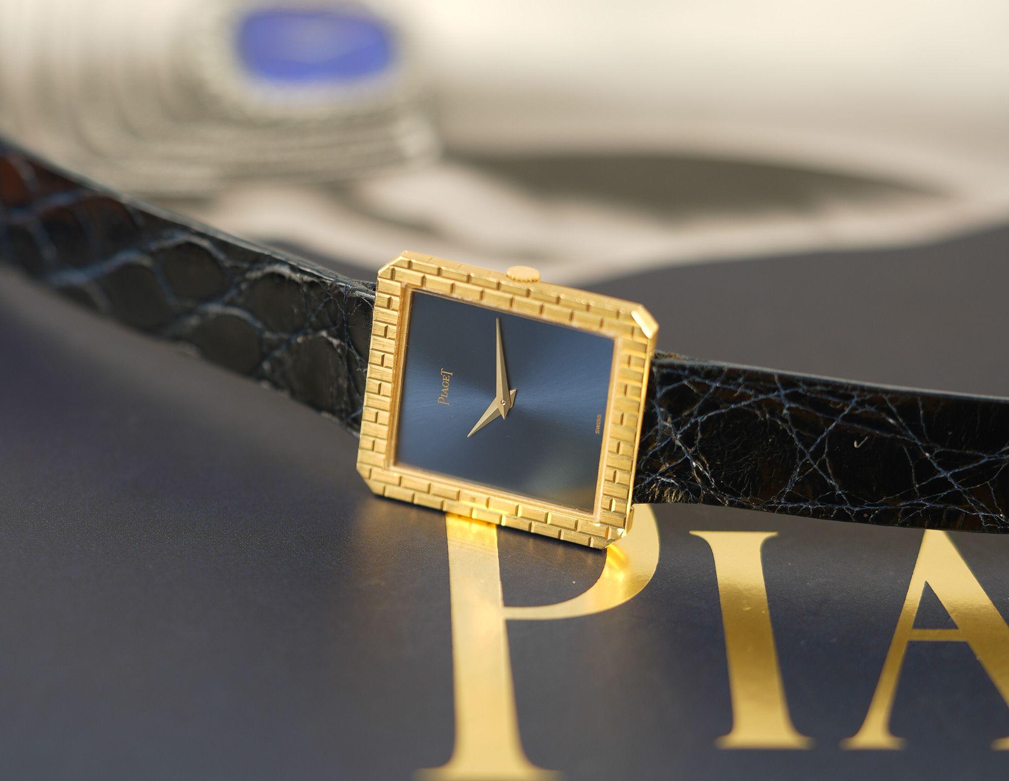 A sapphire crystal protects the dial, while a dark blue crocodile strap with an original 18K Piaget buckle ties the whole look together. The strap echoes the dial’s tones, making the watch feel cohesive and refined.