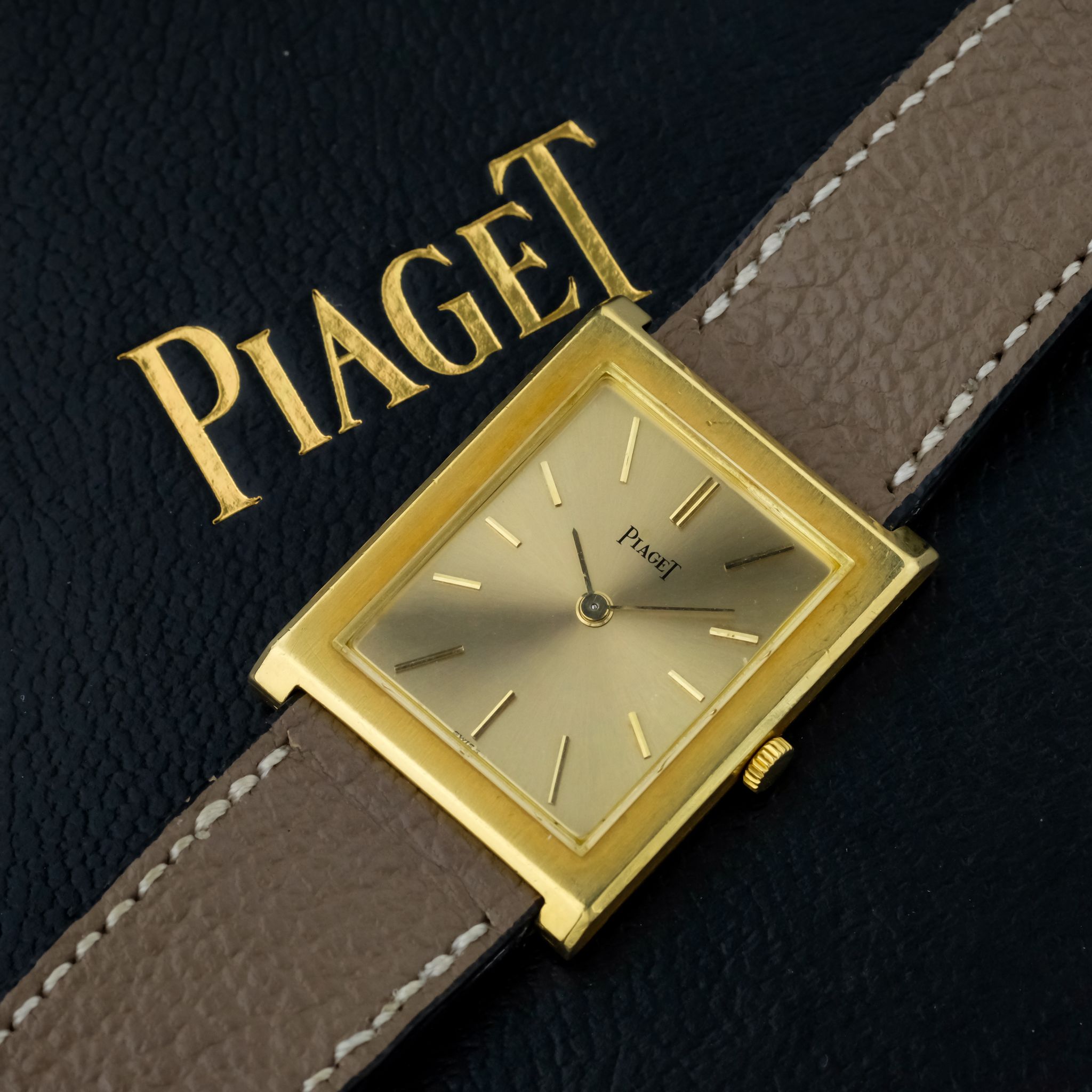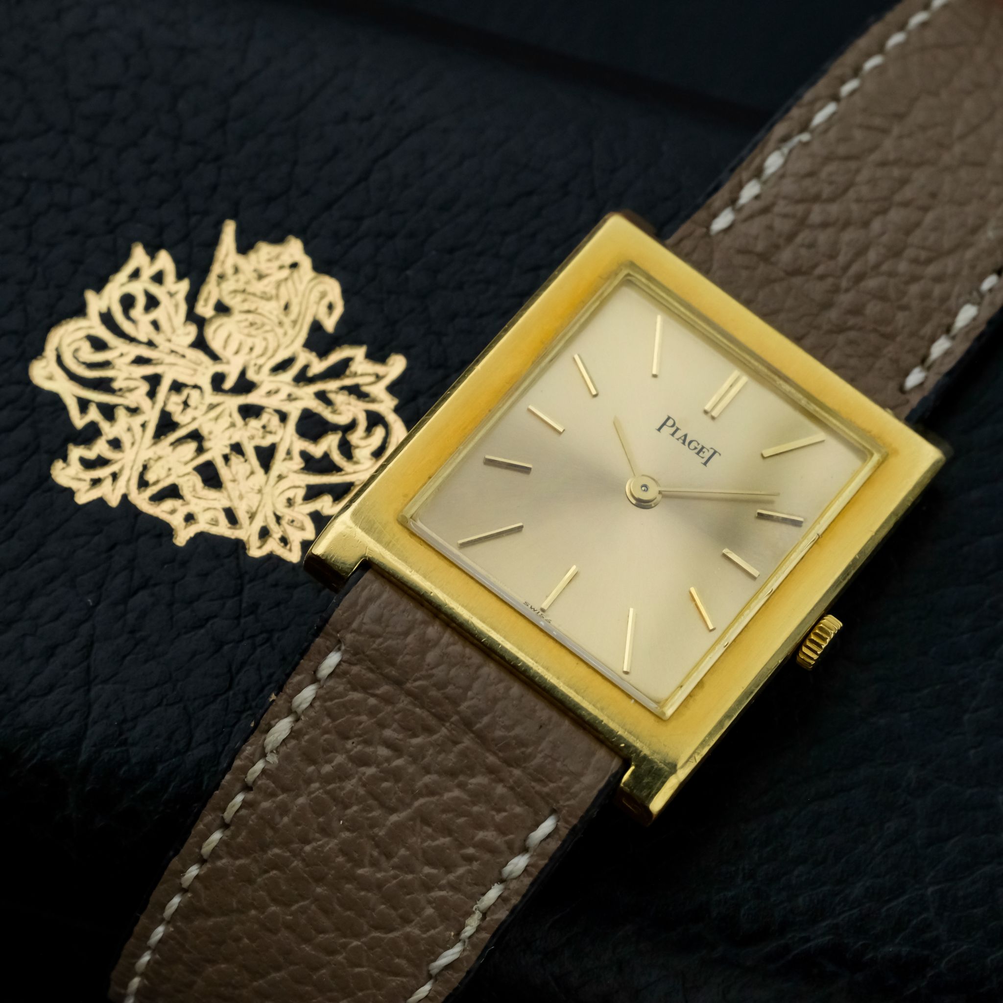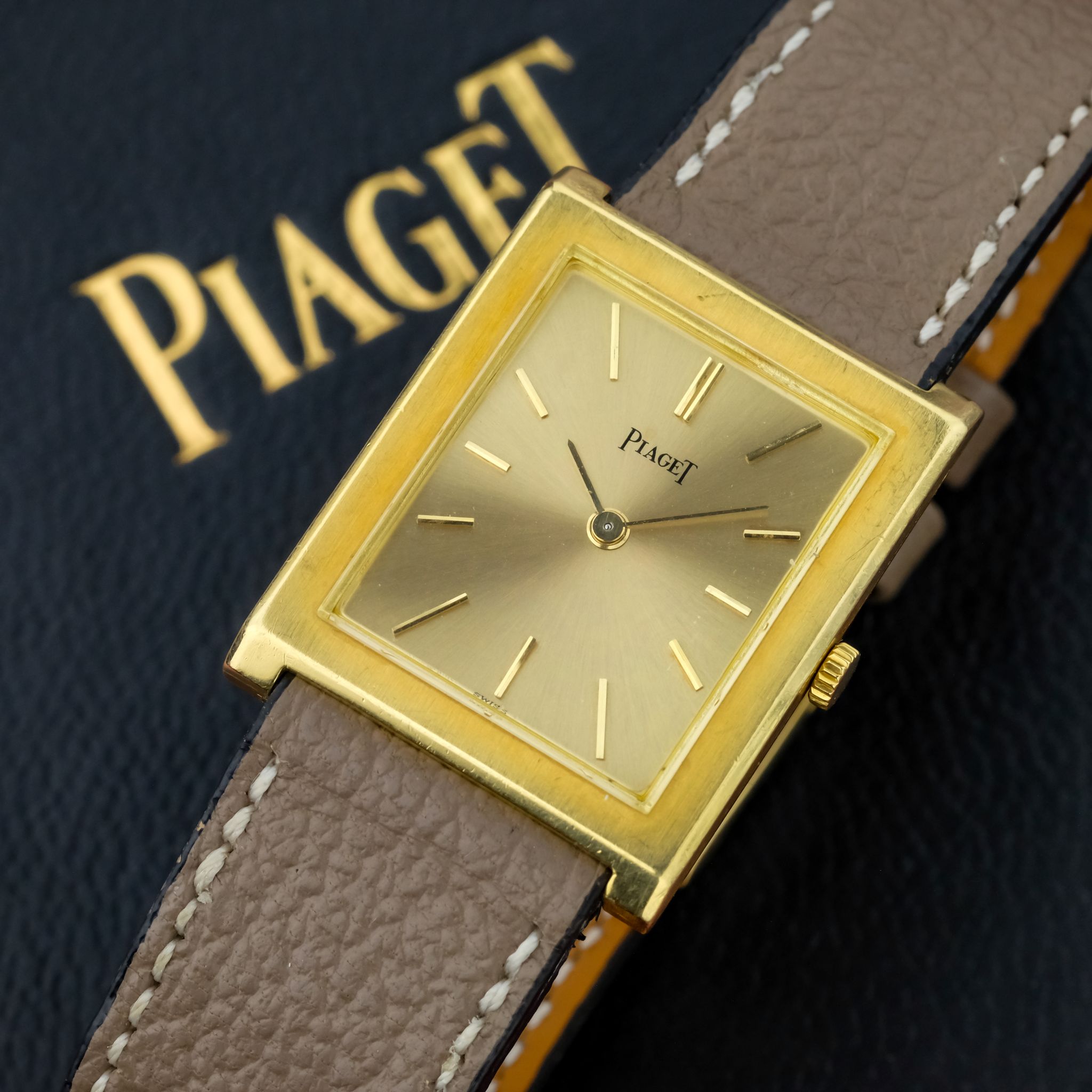 Beautiful and unpolished Piaget "Tank" style model with golden sunburst dial ref. 9653 manual wind model accompanied by the 750/ yellow gold buckle.