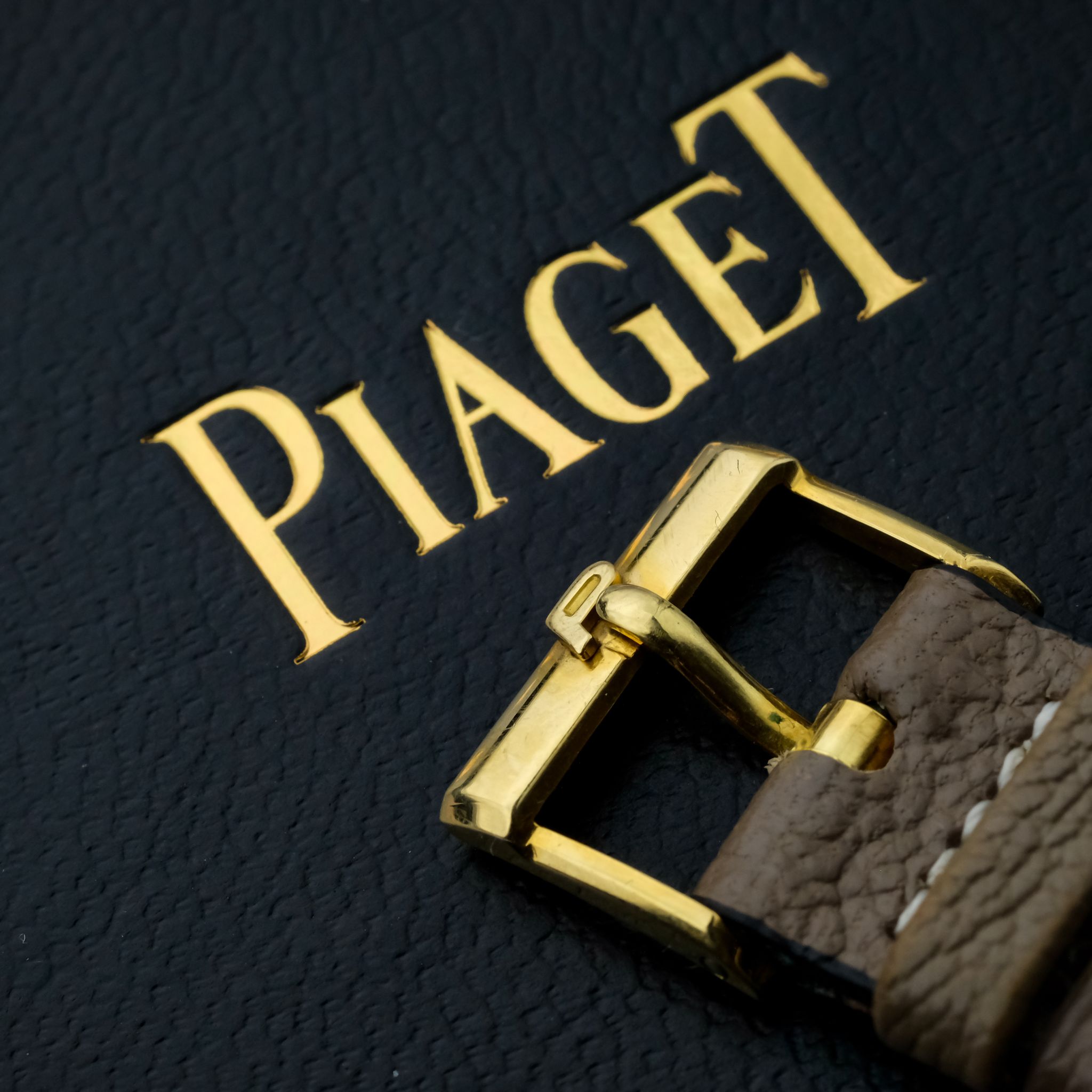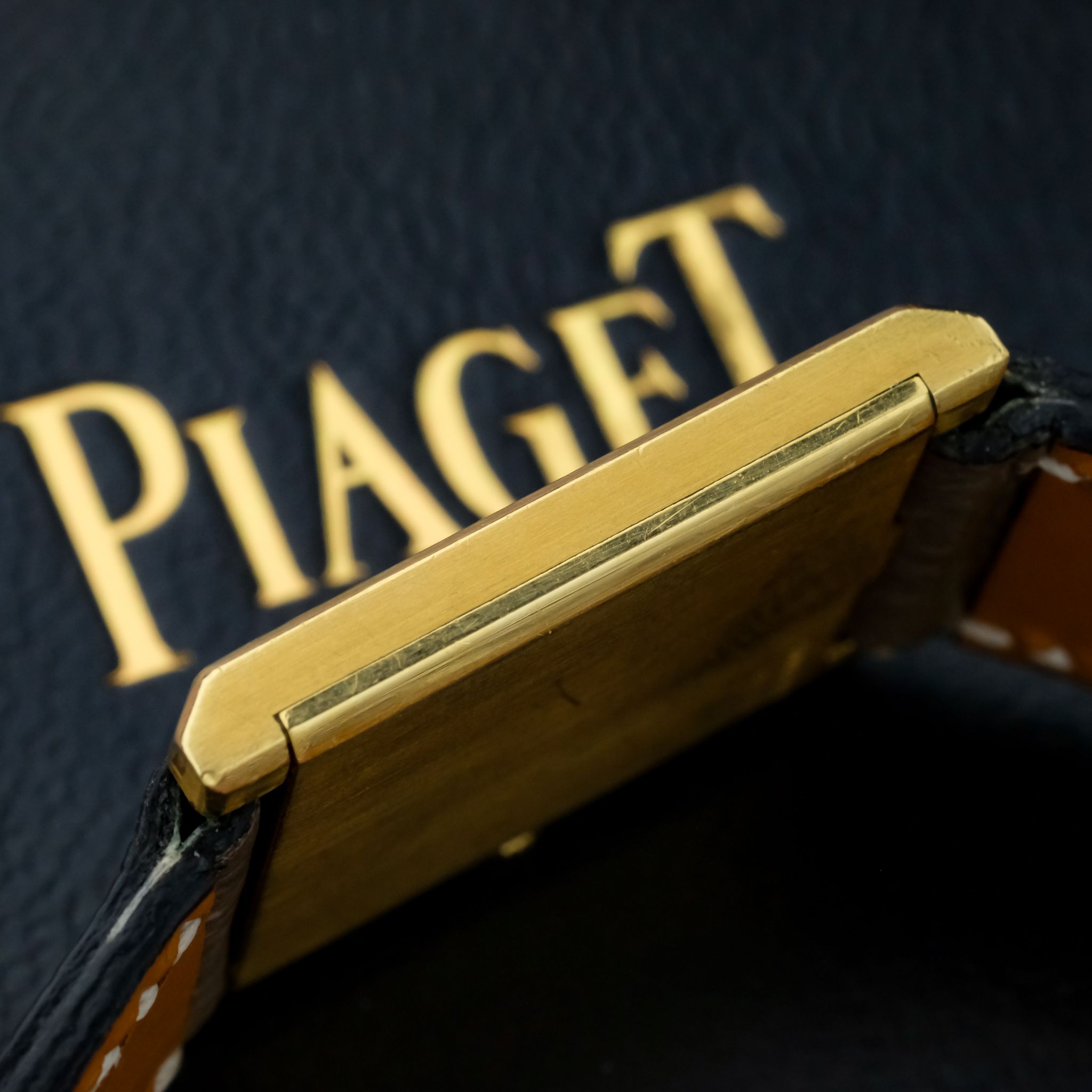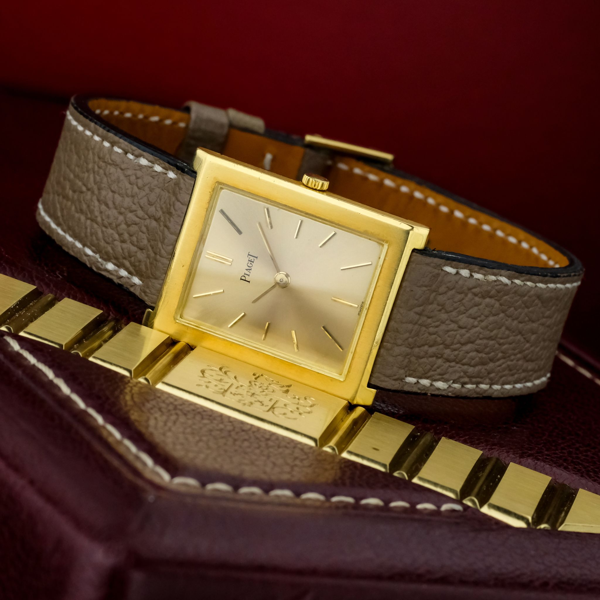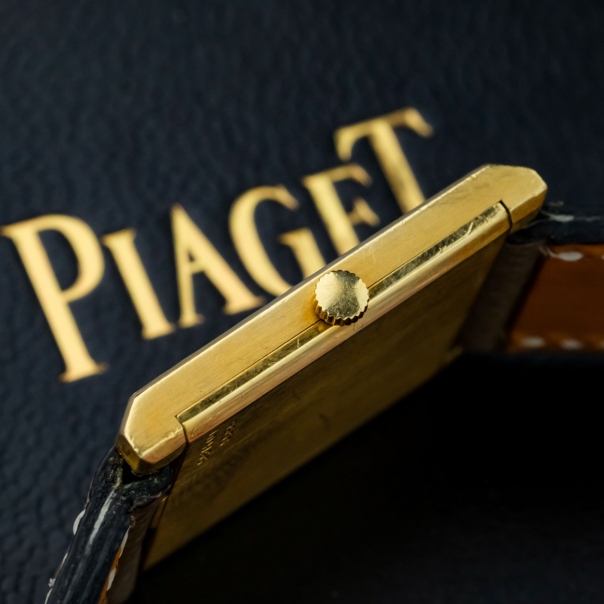 Beautiful and unpolished Piaget "Tank" style model with golden sunburst dial ref. 9653 manual wind model accompanied by the 750/ yellow gold buckle.