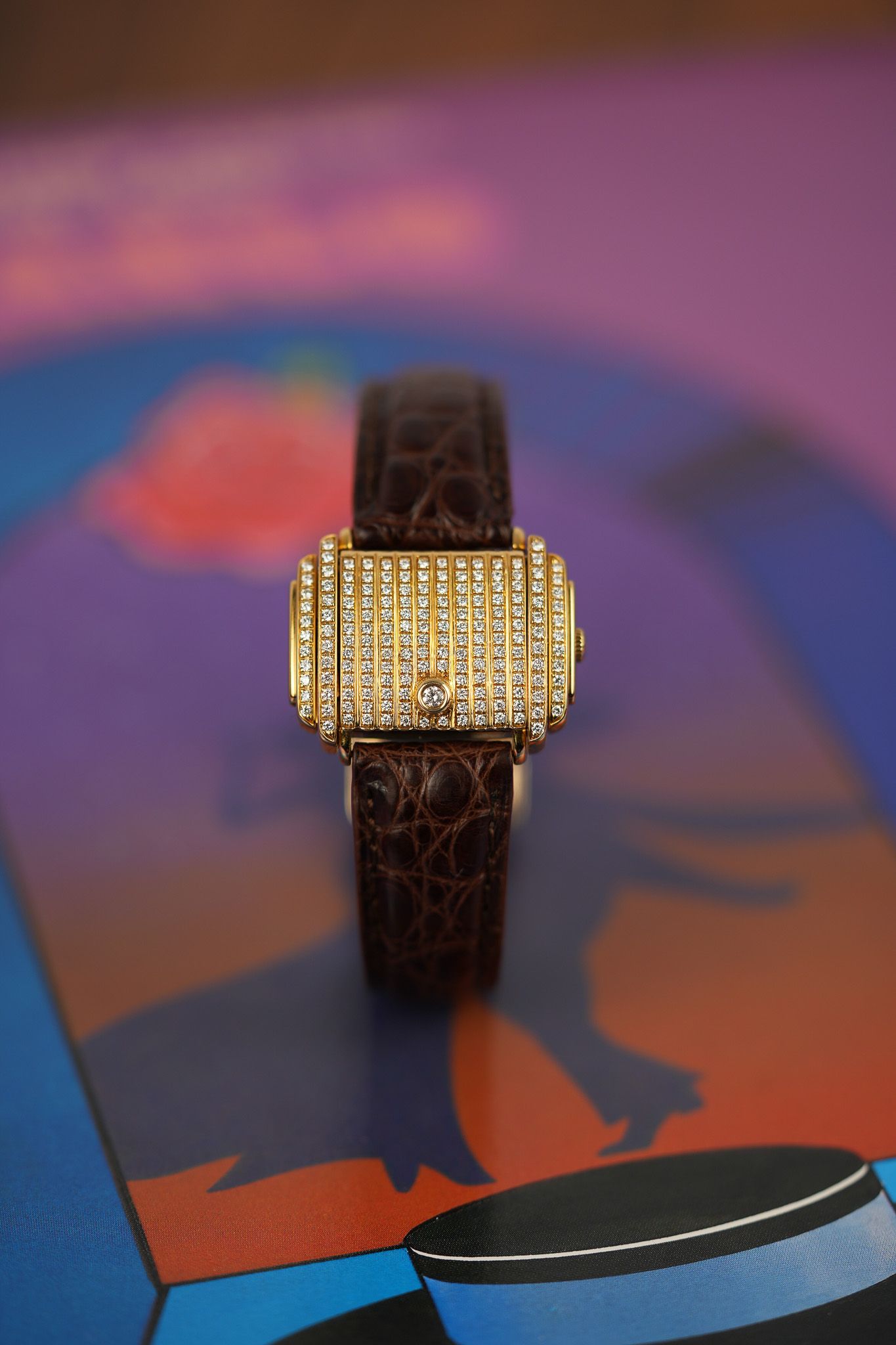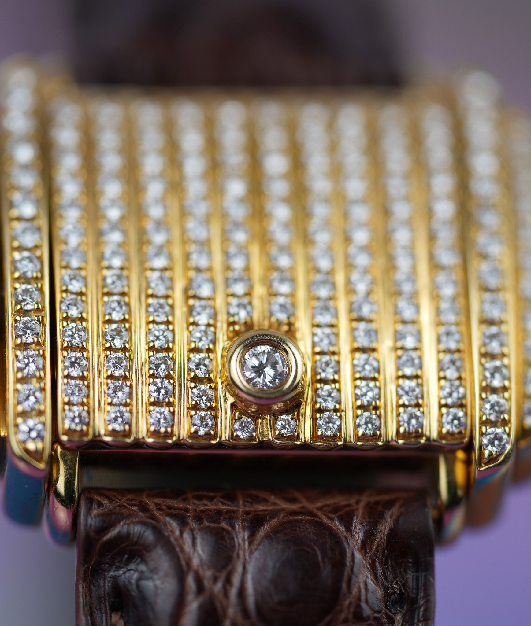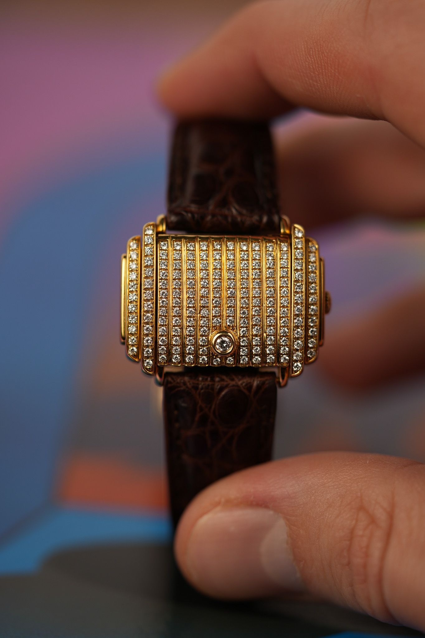Encased in 18kt yellow gold, this secret watch is designed to be hidden in plain sight. Its cover, a shimmering array of pavé diamonds, conceals the dial with an architectural, stepped motif. A single, larger diamond at the center hints at what lies beneath. Press the discreet button on the side, and the gold shutter pops open, revealing a dial that is pure understated luxury—a warm salmon tone with angled indices catching the light with every tilt of the wrist.