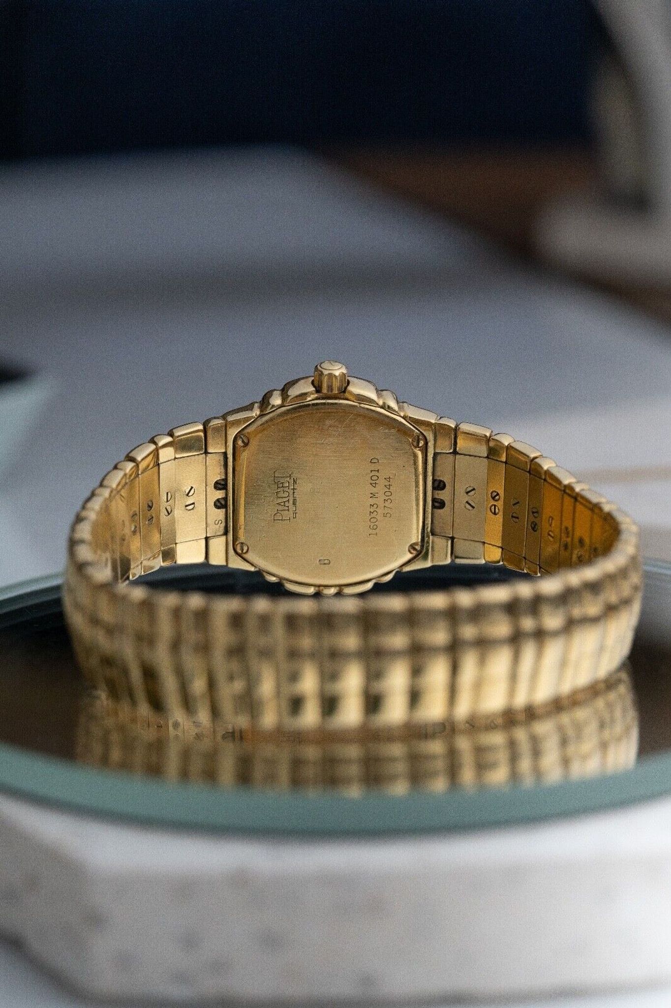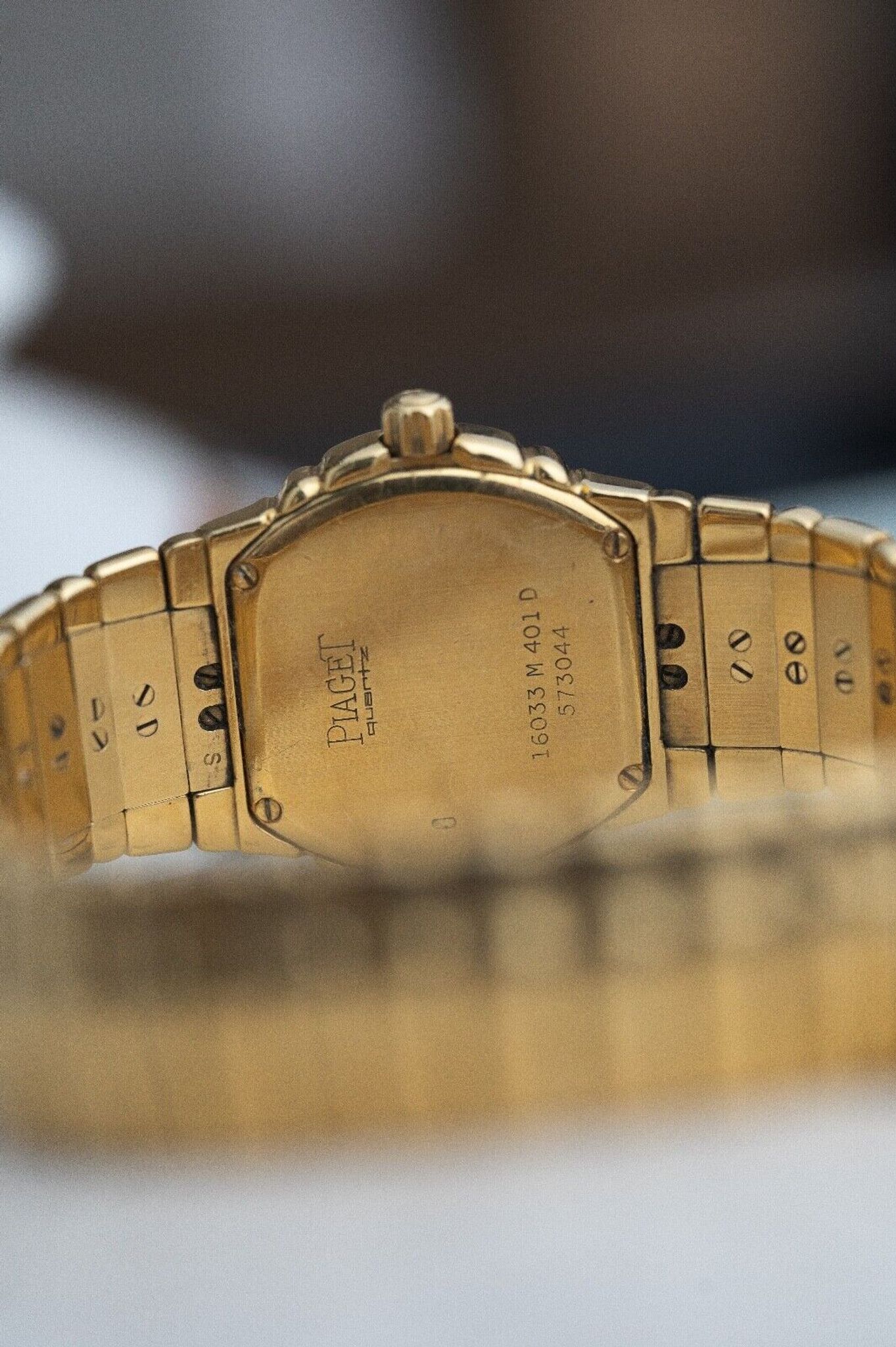 Beyond its aesthetic allure, this Piaget wristwatch boasts a solid 18k yellow gold construction, adding a touch of intrinsic value to its already impressive exterior. The inherent value of the gold not only enhances the watch's appeal as a luxurious accessory but also serves as a smart investment choice. The enduring nature of gold ensures that this timepiece retains its value over time, making it a statement piece that transcends trends and stands the test of time.